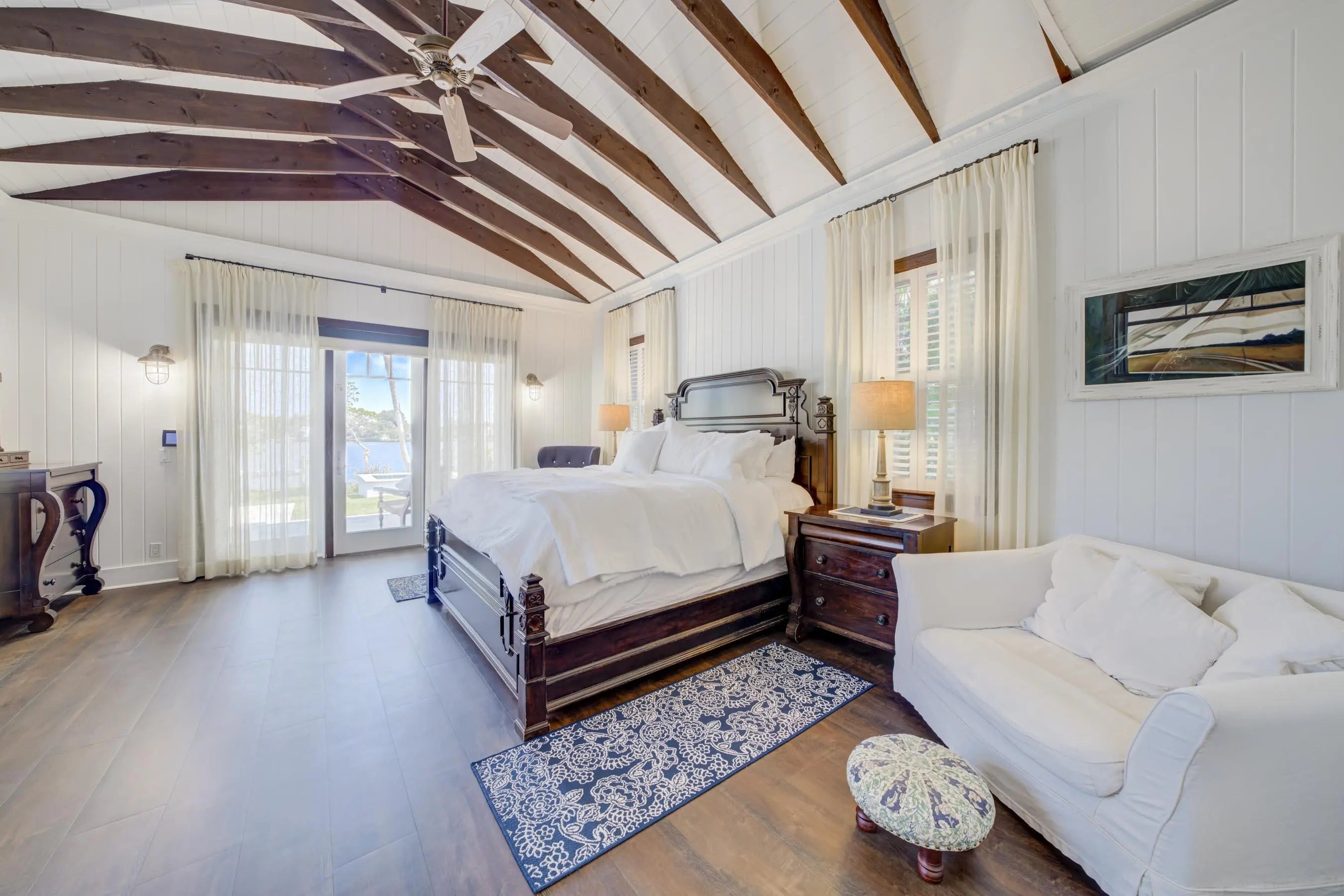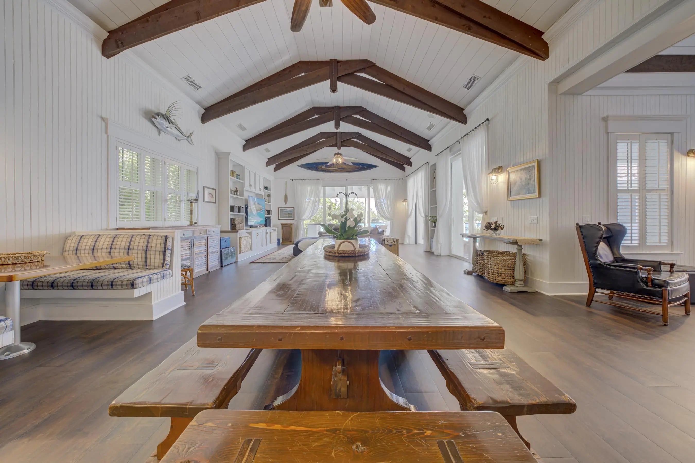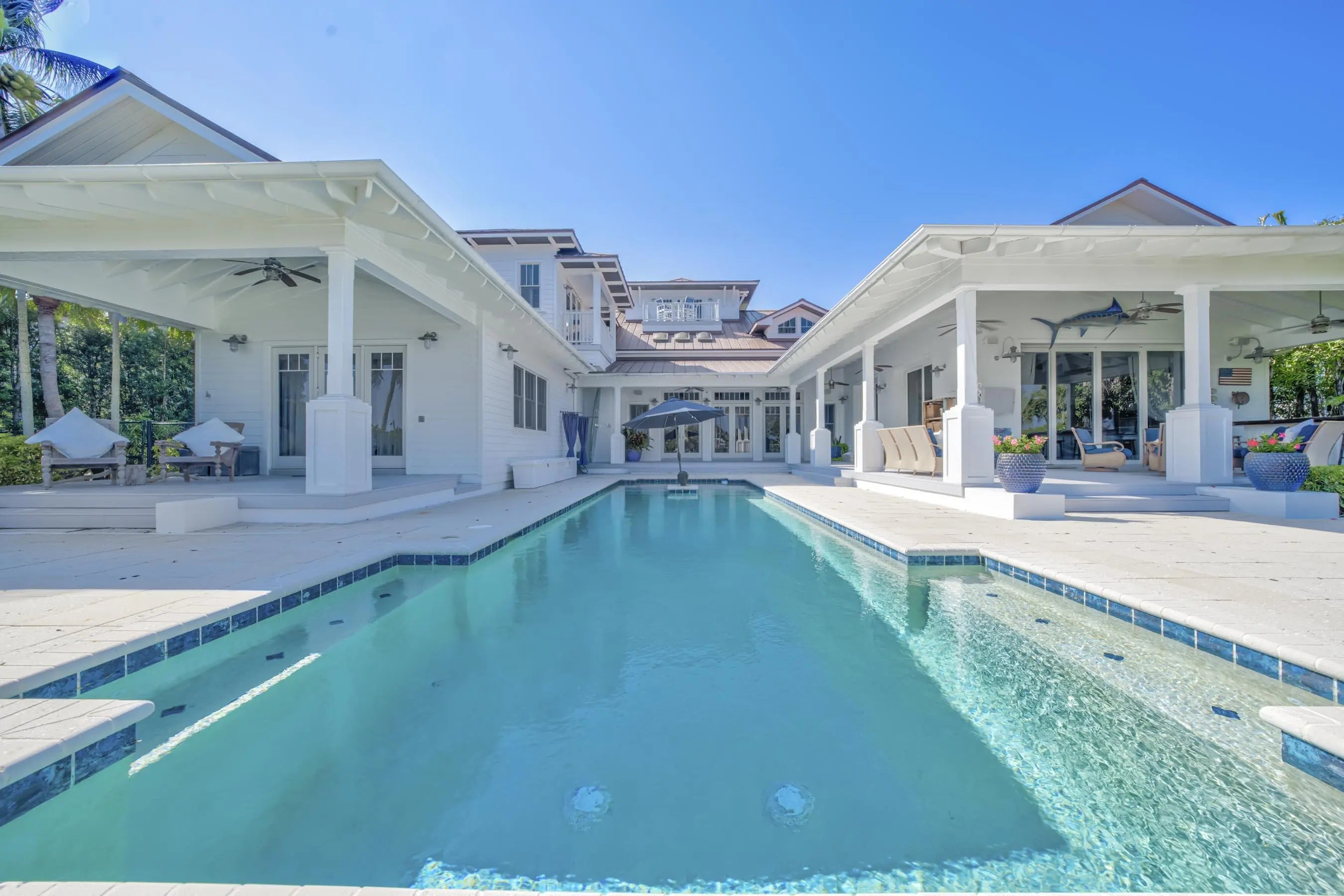 Exclusive waterfront living. Live like a pro in this luxurious waterfront home. Welcome to your dream escape! This stunning furnished home on the Loxahatchee River in picturesque Jupiter, Florida, is the epitome of coastal elegance and charm. Designed with a light and bright ambiance, this residence offers an inviting blend of sophistication and relaxation, perfect for those seeking a serene retreat. Step inside to discover elegant, coastal-inspired interiors featuring open-concept living spaces with wide panoramic 1 mile views of the sparkling river. Expansive windows flood the home with natural light, showcasing the breathtaking scenery and creating a seamless indoor-outdoor flow. The thoughtfully curated furnishings exude modern coastal charm, with soft neutral tones, natural textures, and subtle pops of seaside blues and greens. The fully equipped chef's kitchen boasts top-of-the-line appliances and ample space for entertaining, while the living and dining areas open to spacious outdoor terraces where you can soak in the tranquil river vistas. Unwind in the luxurious primary suite, complete with private, old world style back porch overlooking the river with a spa-inspired ensuite bath. Additional guest rooms provide comfort and privacy, each beautifully appointed for your guests' enjoyment. Your family and guests will spend endless hours in the nicely equipped billiard and game room. Outside, the property offers direct water access, perfect for boating, paddleboarding, or simply enjoying the peaceful setting. Lounge on the sun-drenched deck, entertain by the waterfront, or take in the evening sunset from 2 private docks, one which accommodates a vessel size up to 40 ft and 20,000 pounds with a 3 ft draw at high tide, the smaller lift holds up to 10,000 pounds and a 24-foot boat. Enjoy the sweeping views of the Loxahatchee River that extend over a mile to the Jupiter Lighthouse. Conveniently located near Jupiter's best dining, shopping, and beaches, this luxurious rental is a true gem, offering the perfect blend of relaxation and lifestyle. Nestled on nearly an acre lot, this 5-bedroom, 7-bath masterpiece offers everything you need to live, entertain, and relax in style. This 3-story Florida Cracker-style home, designed to modern specifications, boasts an end-of-point location facing SSE, ensuring refreshing summer breezes and breathtaking, mile-long views of the Loxahatchee River. Property Highlights: " Elevator for seamless access to second floor " 3rd-floor widow's walk with panoramic views " Anderson windows providing abundant natural light " Gipcrete layer between floors for added comfort and privacy " 4-car air-conditioned garage " Game room with billiards table for entertainment " Adequate space for a hitting bay in garage for the enthusiast " Complete gym with pull-up bar, treadmill, rogue bike and a rower " Putting Green " Firepit Outdoor living is redefined with ample space for enjoying the waterfront setting, all while being surrounded by the beauty of Pennock Point. This home offers the perfect balance of coastal charm and modern luxury. Schedule your private tour today and step into the lifestyle you've been dreaming of!