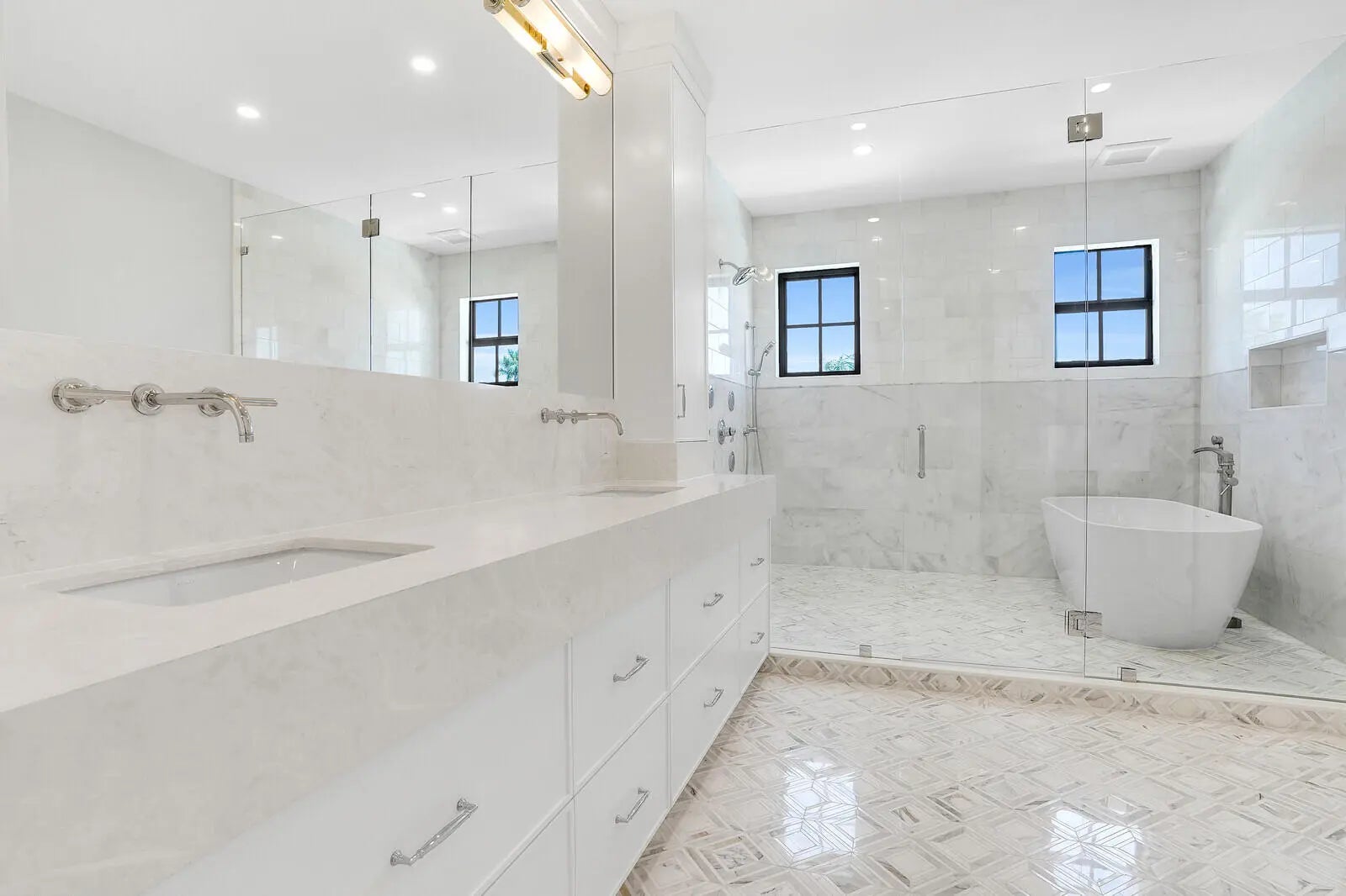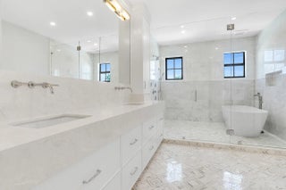 Newly completed is a stunning five bedroom main house with separate guest house with tasteful appointments. Spacious backyard with private pool area in great location.