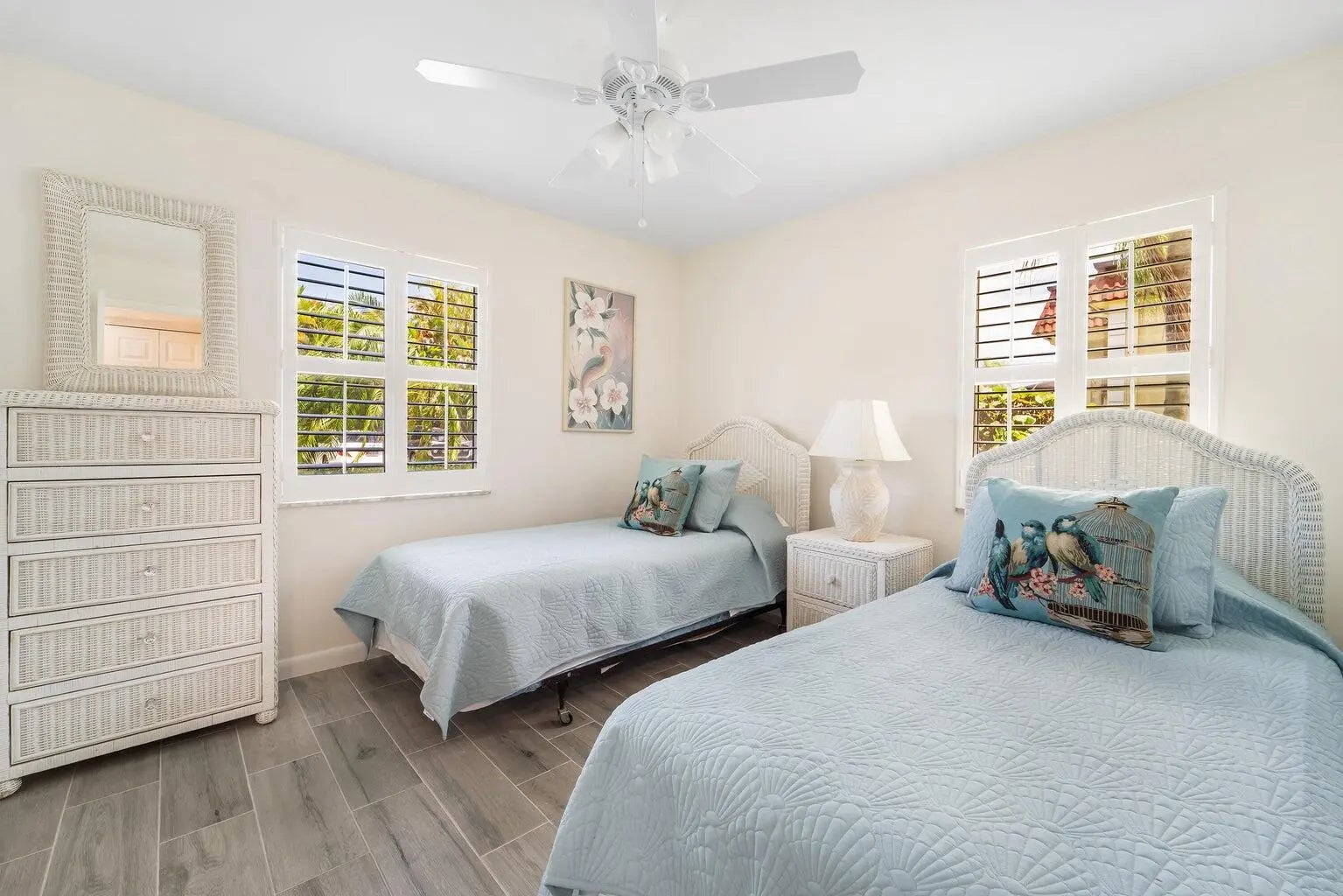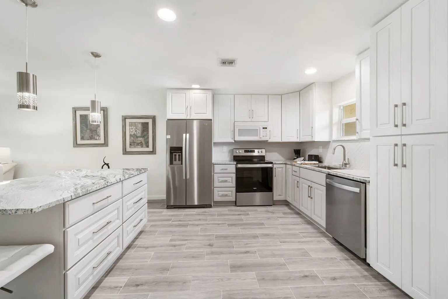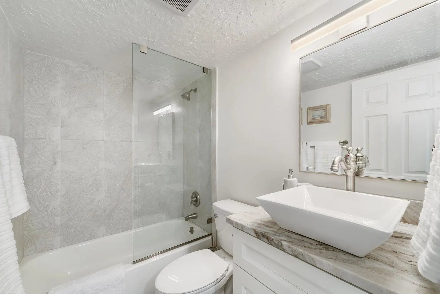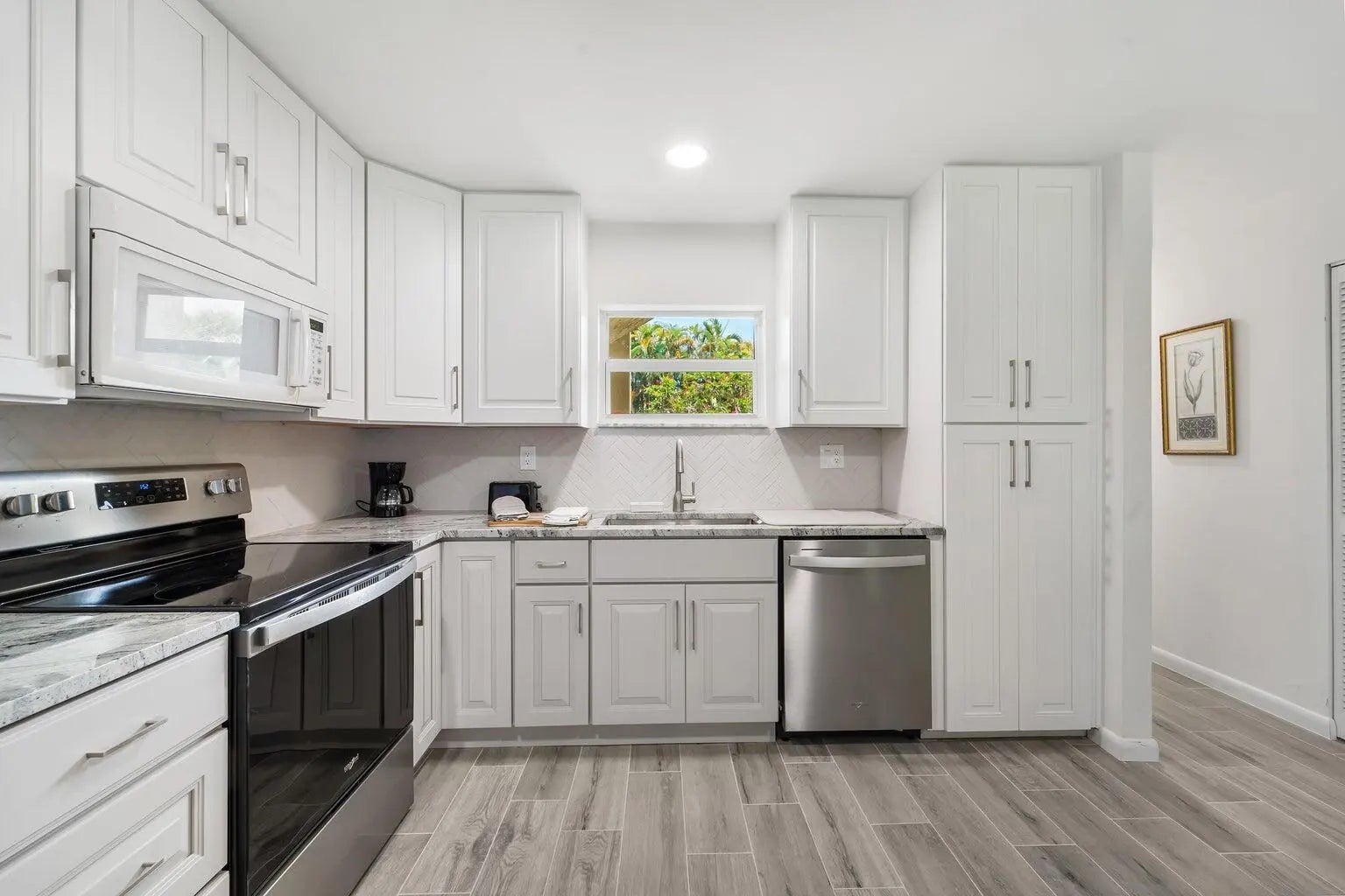This stylish, ground-floor unit puts you just a short stroll from Jupiter Beach and right next to Carlin Park's heart trail. Whether you're into morning jogs, afternoon tennis, or sunset pickleball matches, it's all right in your backyard. Water included in rent! Step inside to a freshly renovated space with sleek porcelain tile, stone countertops, stainless steel appliances, and impact windows and doors throughout. Unwind on your covered, screened lanai or kick back with high-speed WiFi and two flat screen TVs already set up for you. Comfort meets convenience in one of Jupiter's most walkable, beachside communities. Just unpack and start living.