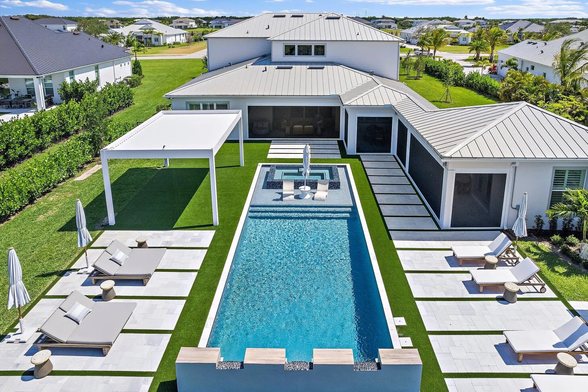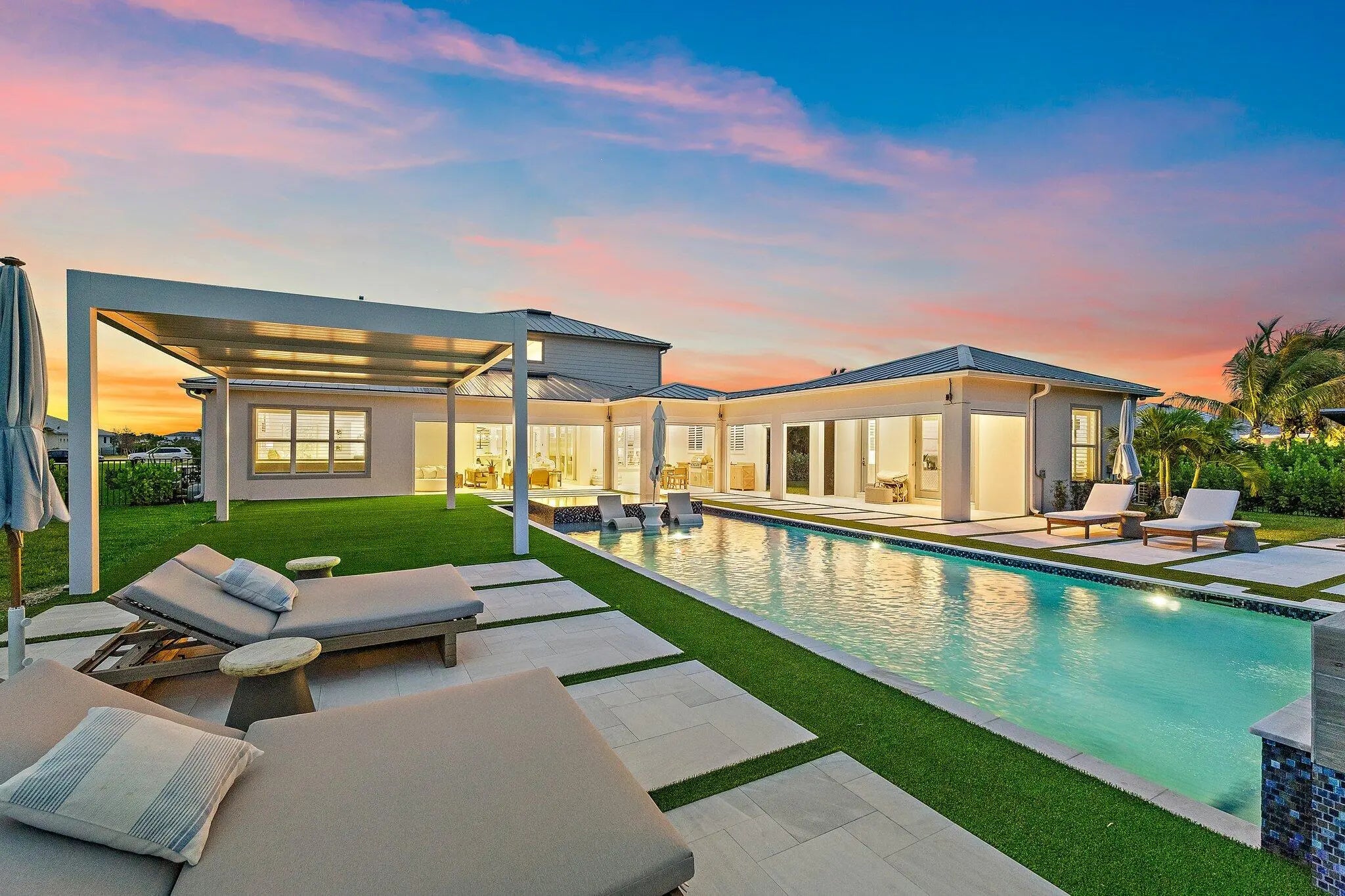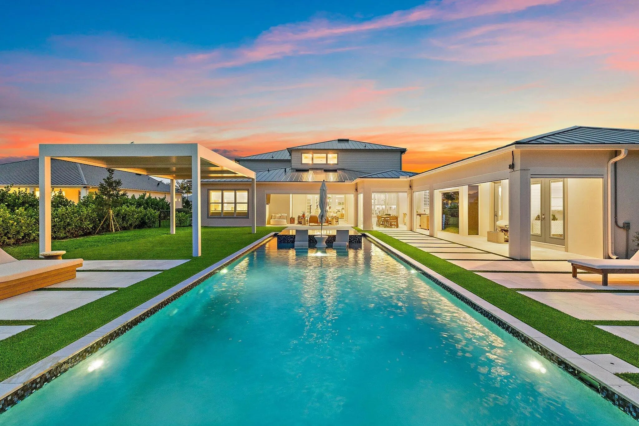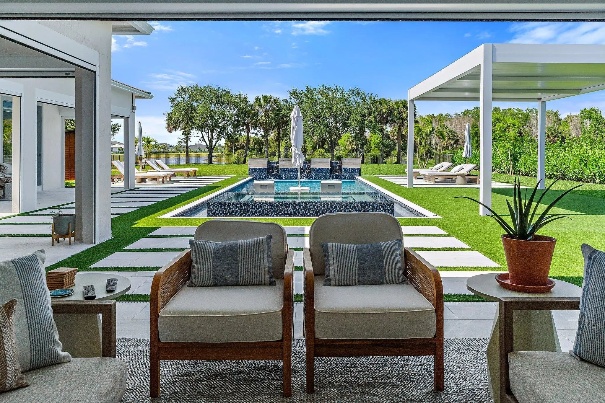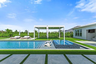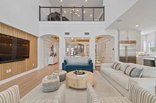 Enjoy the best of Bridgewater in this expanded ''Livingston'' model home with long water views. This seven bedroom home, the largest model offered in Bridgewater, with an office and home theater, creates multiple options of useful space with the finest in luxury appointments. The first floor has the primary suite with bath, one guest bedroom with bath, and an office in the main house, powder room, 4 car garage, and a one bedroom Casita with full bath just off the kitchen. The second floor has four additional bedrooms, a loft, media room, and three full baths. The back yard has special features like artifical turf, electic screens, a summer kitchen, pool with spa, sauna, and best of all, a custom pergola with a louvered ceiling that has slats that electronically open and close.