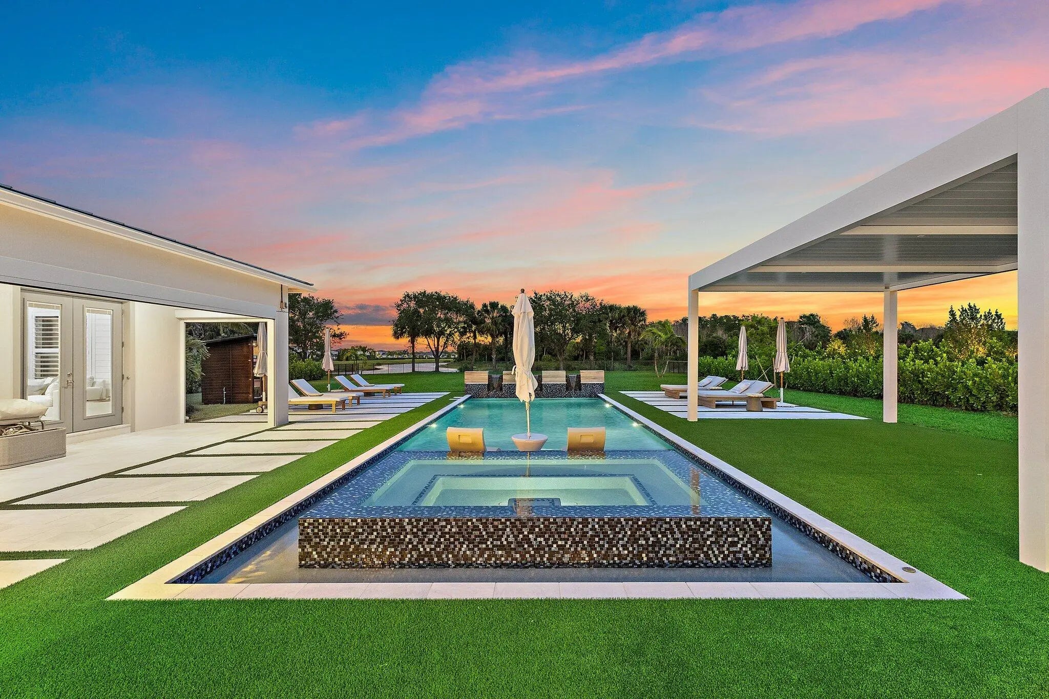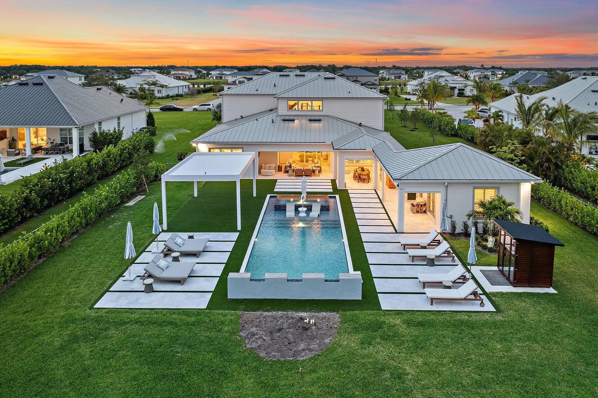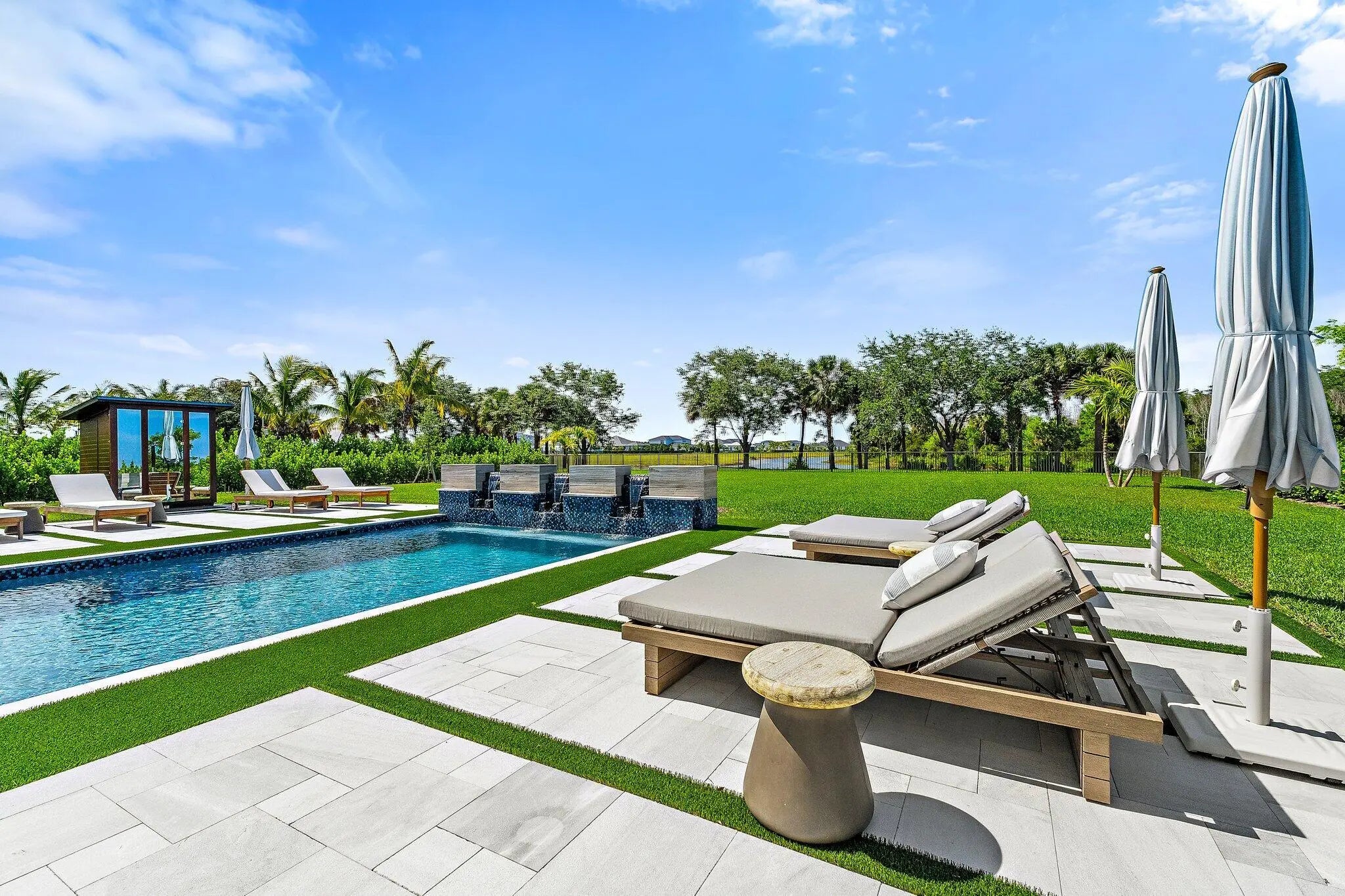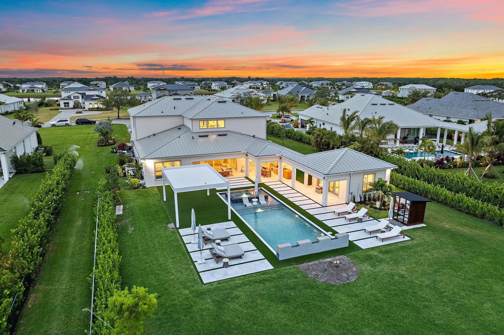 Enjoy the best of Bridgewater in this expanded ''Livingston'' model home with long water views. This seven bedroom home, the largest model offered in Bridgewater, with an office and home theater, creates multiple options of useful space with the finest in luxury appointments. The first floor has the primary suite with bath, one guest bedroom with bath, and an office in the main house, powder room, 4 car garage, and a one bedroom Casita with full bath just off the kitchen. The second floor has four additional bedrooms, a loft, media room, and three full baths. The back yard has special features like artifical turf, electic screens, a summer kitchen, pool with spa, sauna, and best of all, a custom pergola with a louvered ceiling that has slats that electronically open and close.