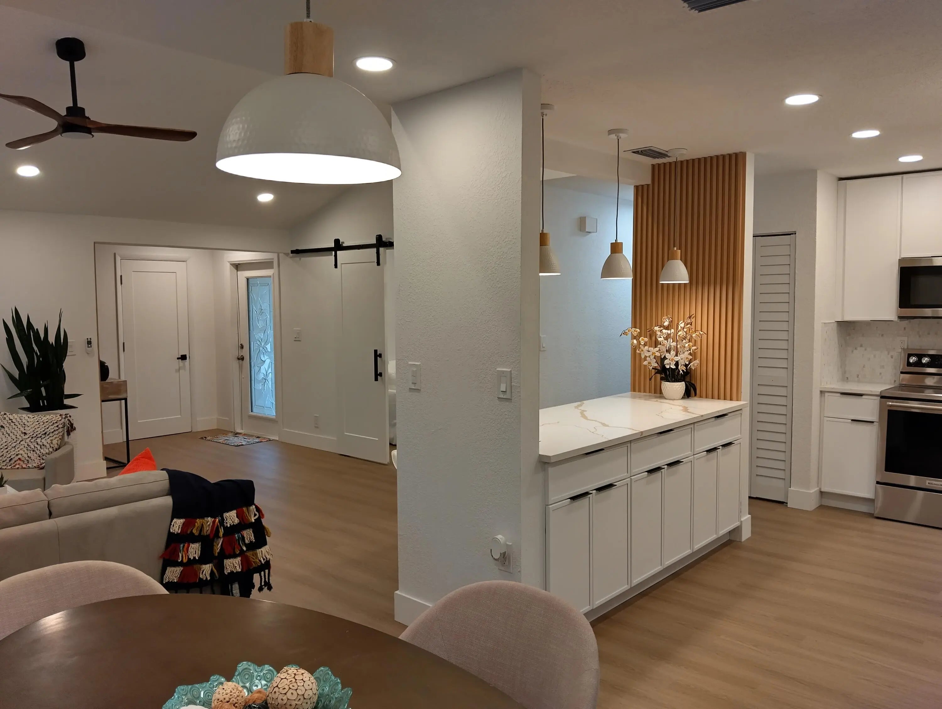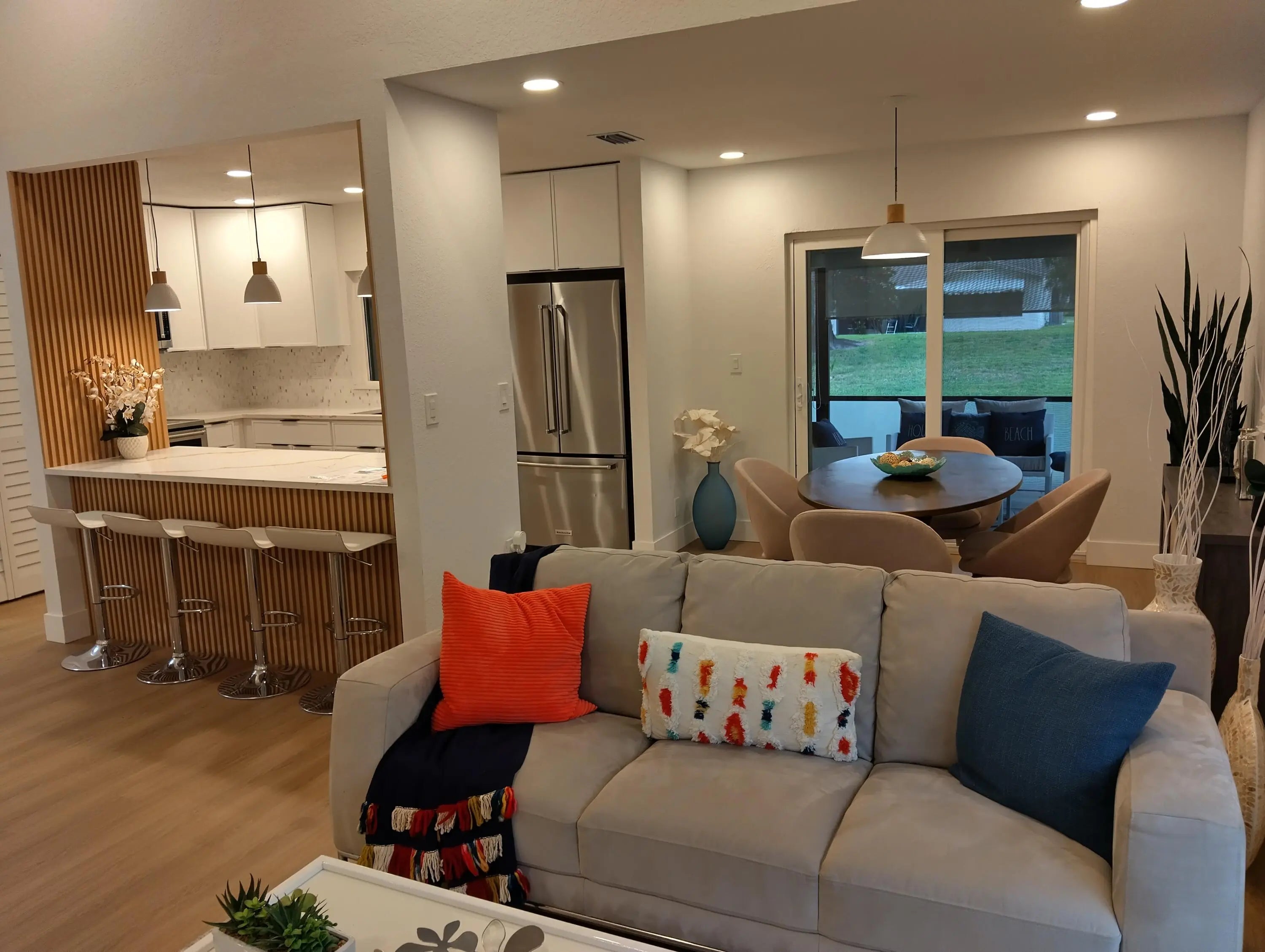 *+55 *. All is top of the line in this designer house! first the location, +8000 SFT lot on a very quiet cul de sac with well maintained houses around. Second the roof was installed in 2021, the windows were installed in 2012 with permit, including the sliders leading to a beautiful large patio. A new Trane AC system. The main living area has an open concept kitchen with Kitchen Aid appliances! A snack bar and a gorgeous white quartz counter top. Waterproof vinyl flooring looking like real wood. Recessed ceiling lights in all rooms, 3 good size bedrooms, 2 new bathrooms, one of the bedroom opens on the living area through a large barn door There is a covered patio with a peaceful nature view. A large one car garage with a washer and a dryer dedicated area completes this perfect home There is a covered patio with a peaceful nature view. A one car garage, a washer and a dryer dedicated area completes this perfect home! Sprinkler system
