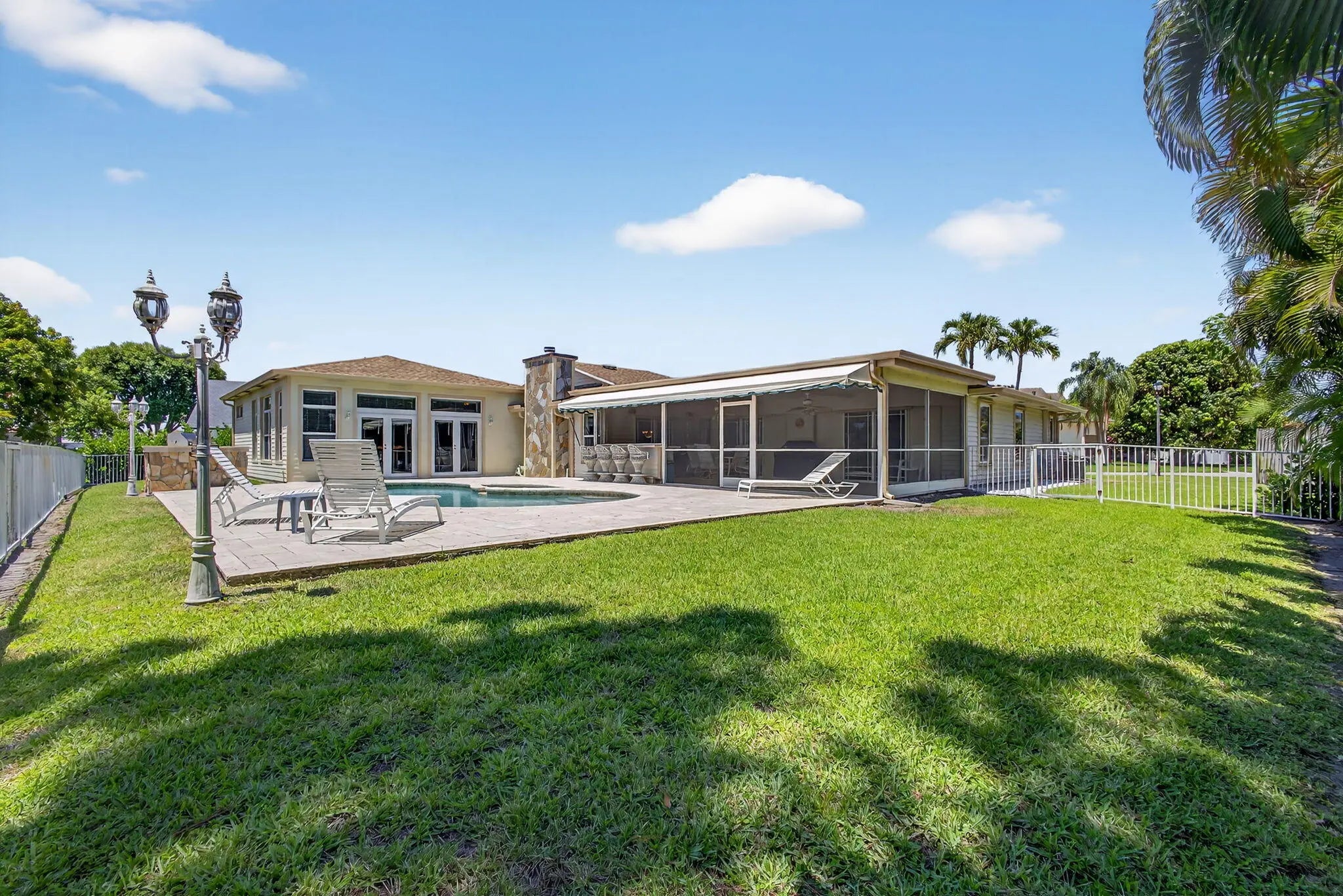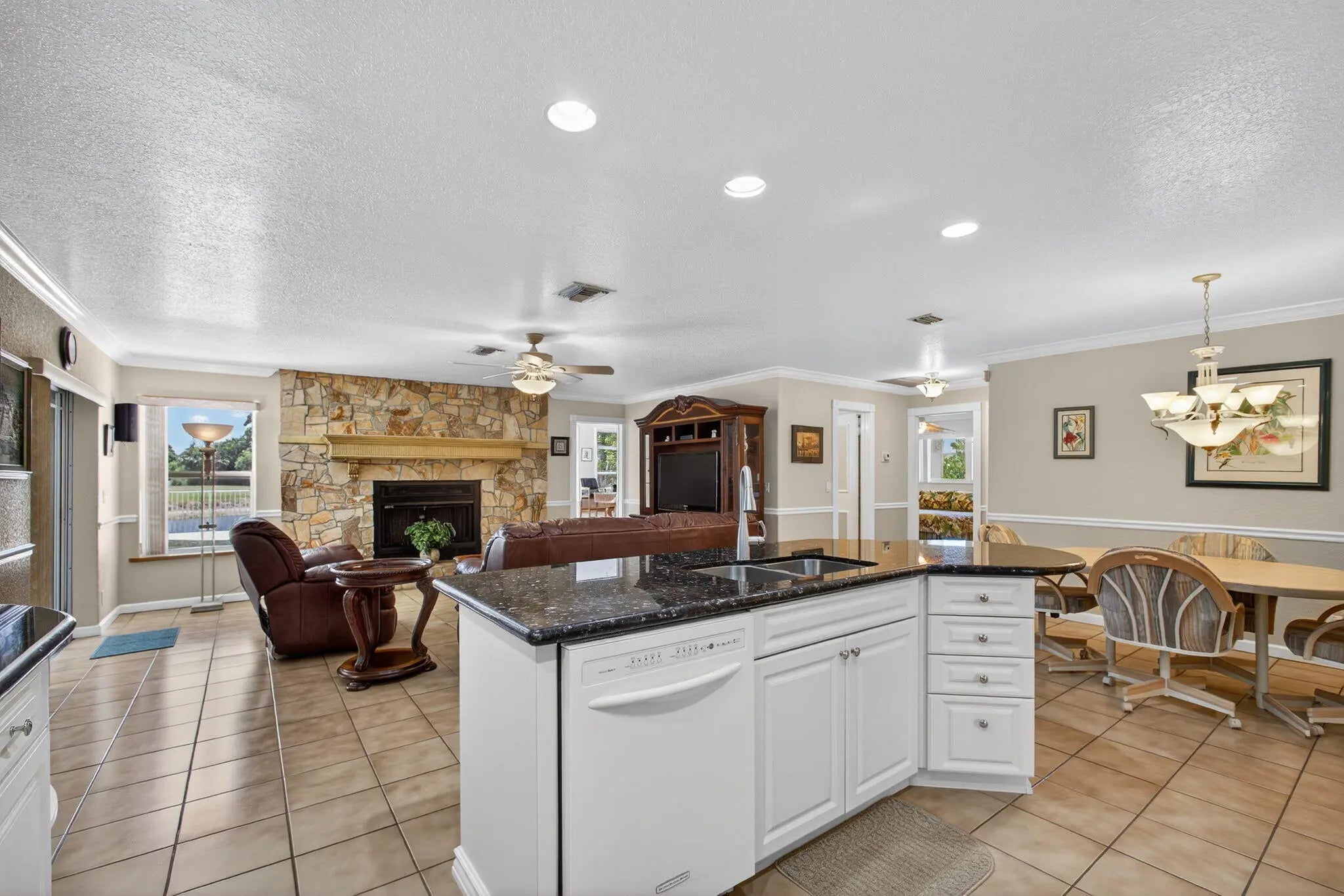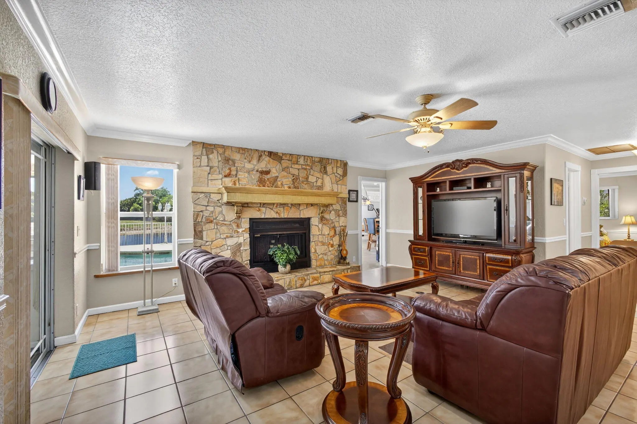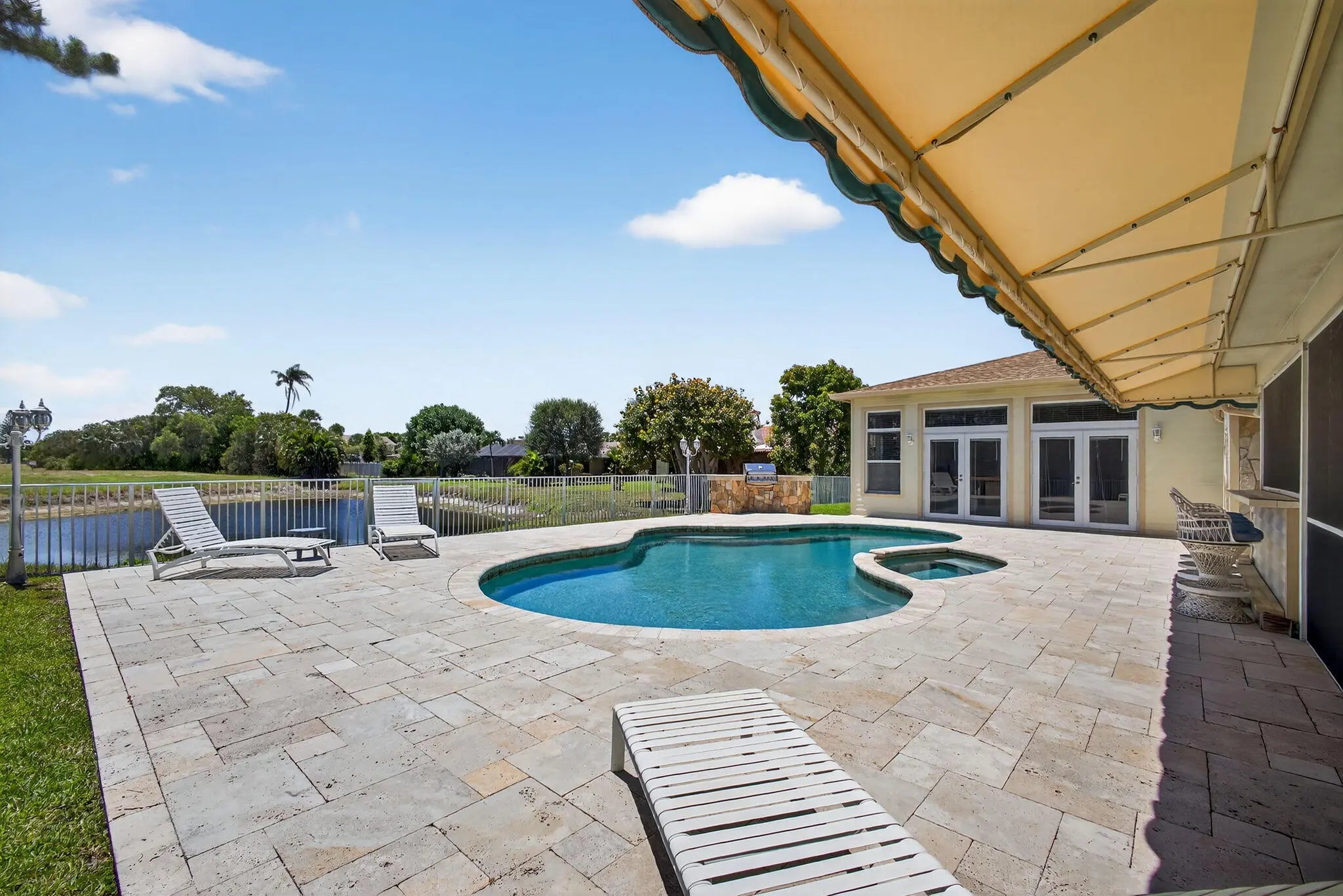 Spacious lakefront ranch home in a gated community with large, oversized rooms filled with abundant natural light The gourmet kitchen boasts granite counters and opens to a family room with a cozy fireplace. Conveniently located off the family room is a massive bonus/great room—perfect for entertaining. Enjoy serene water views, a sparkling pool, and a custom outdoor bar perfect for gatherings. Additional features include tons of large closets throughout and a circular driveway for added curb appeal. The ROOF was re-done in 2022 and the home is secure with impact windows and doors. This home has it all—comfort with space to live and entertain plus the low HOA dues make this home a rare find! CHECK OUT THE 3D WALK THRU.