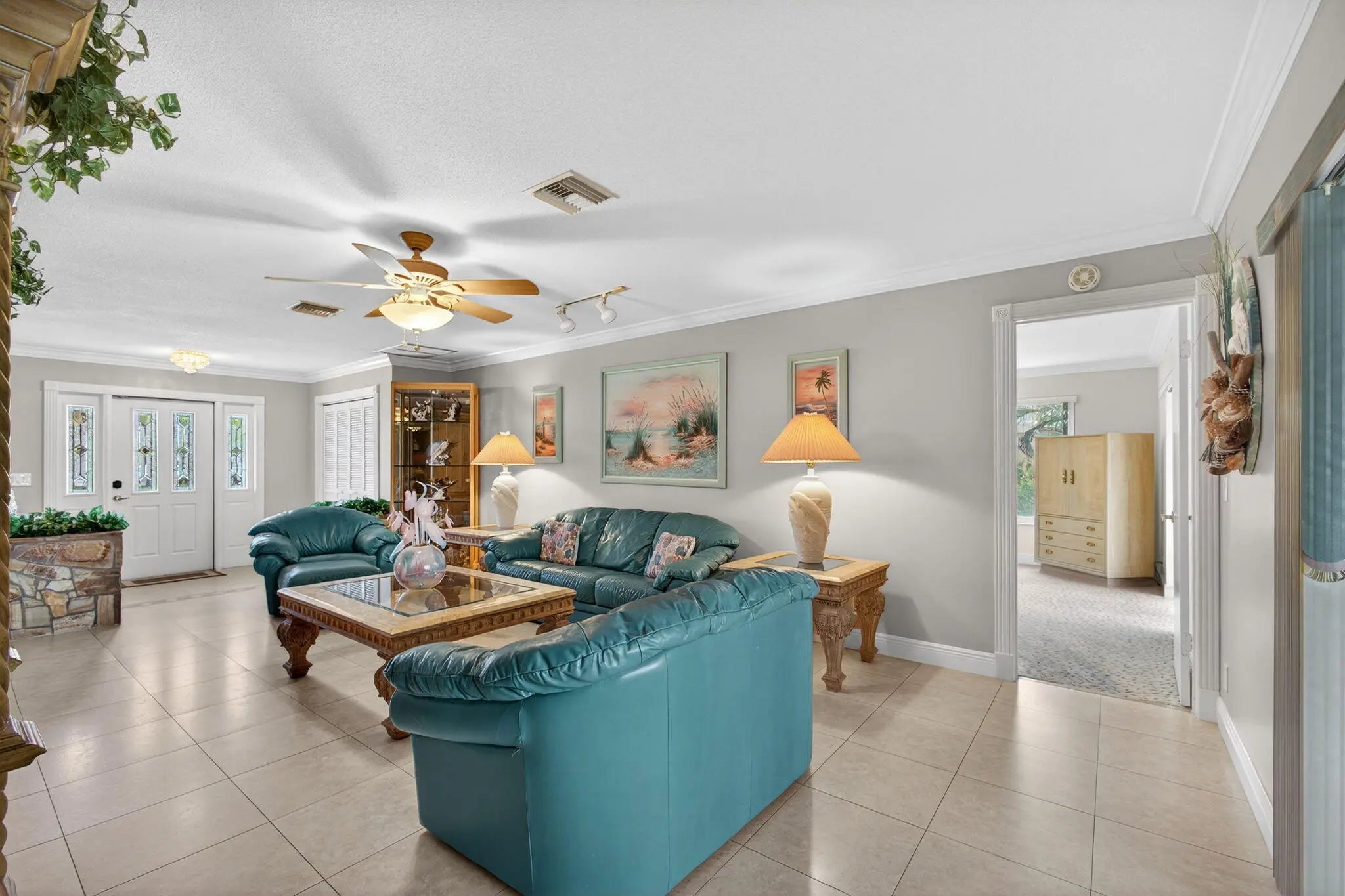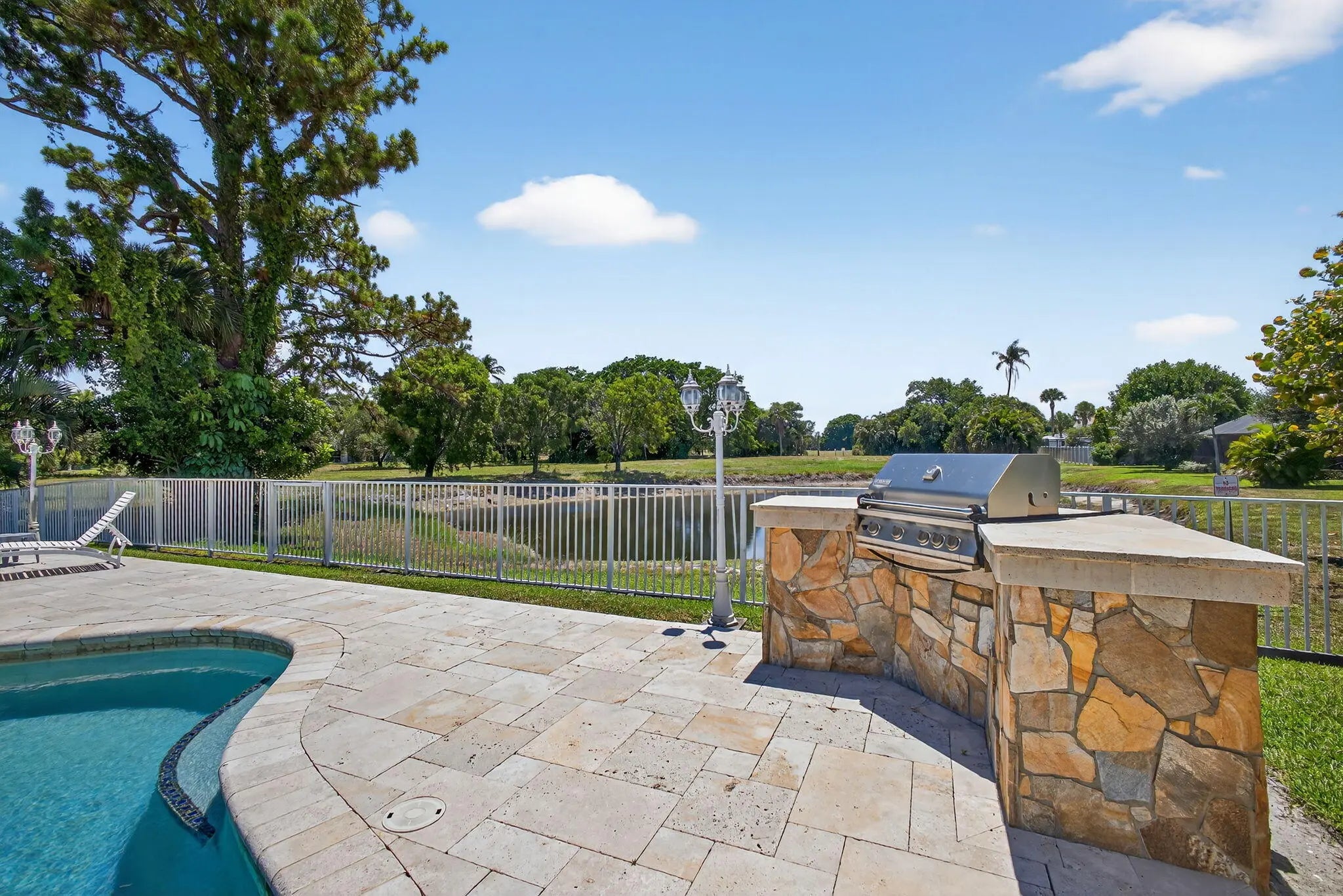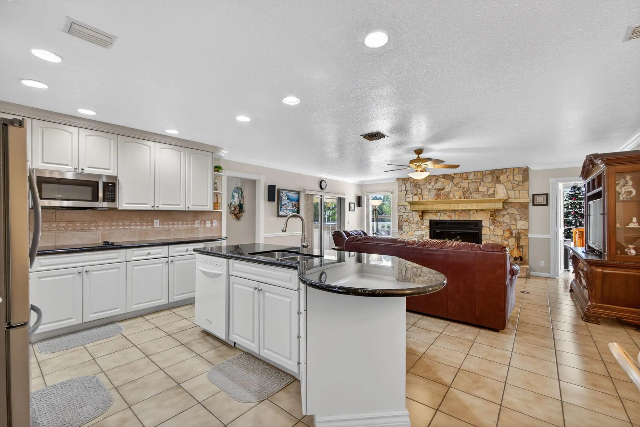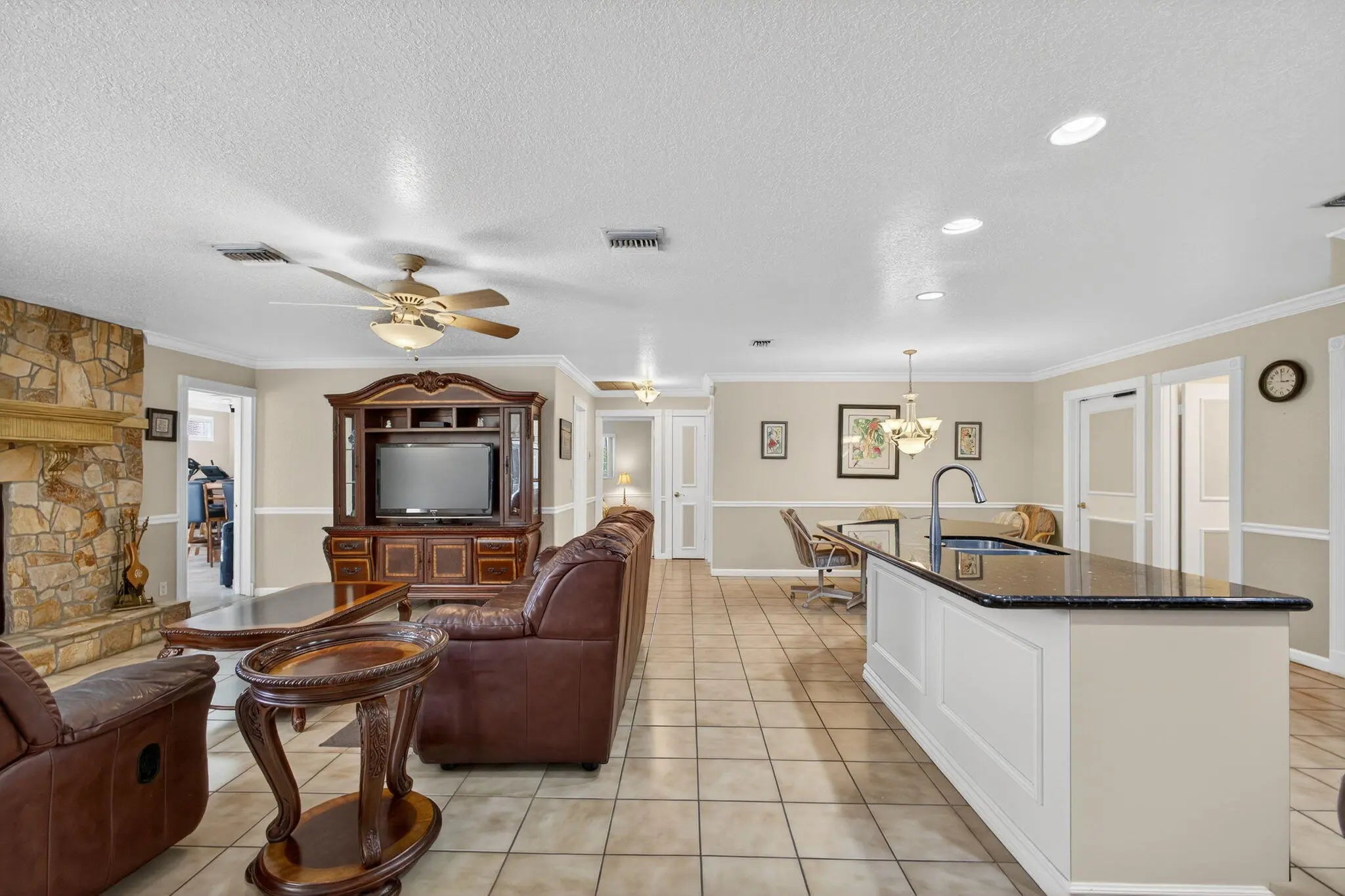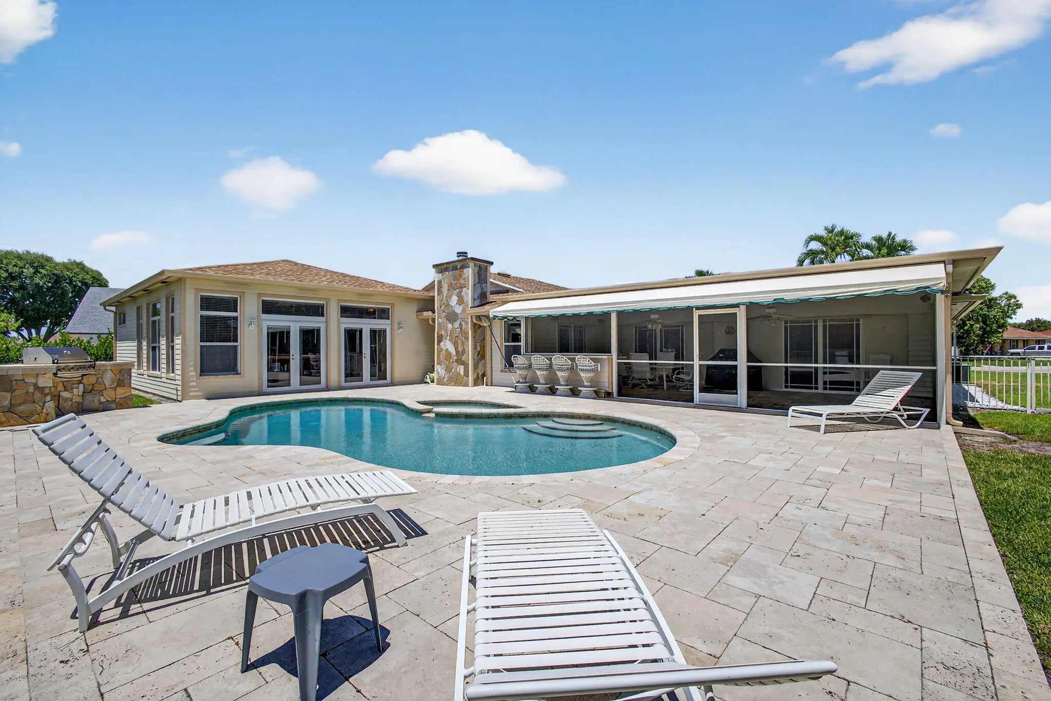Spacious lakefront ranch home in a gated community with large, oversized rooms filled with abundant natural light The gourmet kitchen boasts granite counters and opens to a family room with a cozy fireplace. Conveniently located off the family room is a massive bonus/great room—perfect for entertaining. Enjoy serene water views, a sparkling pool, and a custom outdoor bar perfect for gatherings. Additional features include tons of large closets throughout and a circular driveway for added curb appeal. The ROOF was re-done in 2022 and the home is secure with impact windows and doors. This home has it all—comfort with space to live and entertain plus the low HOA dues make this home a rare find! CHECK OUT THE 3D WALK THRU.