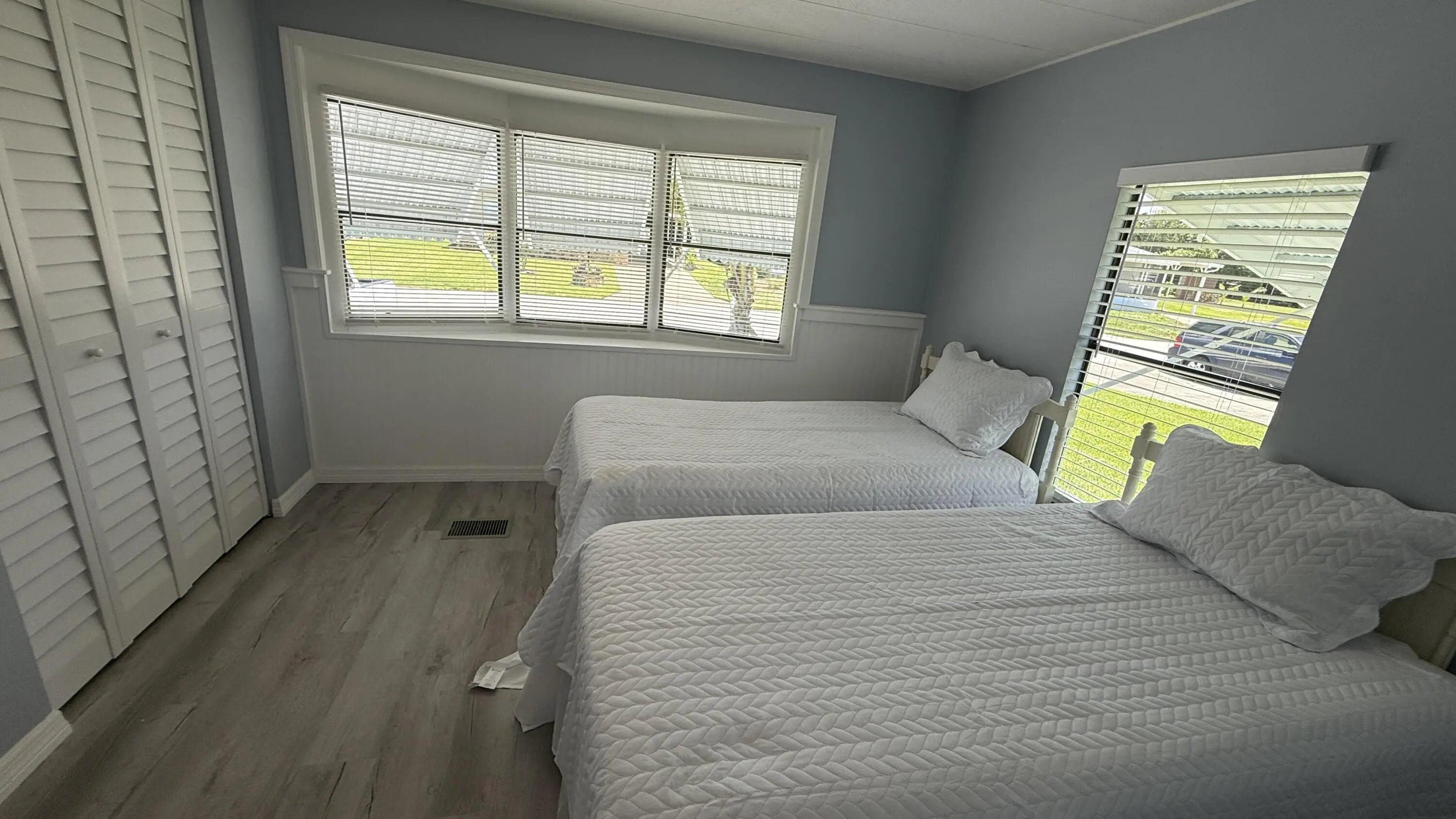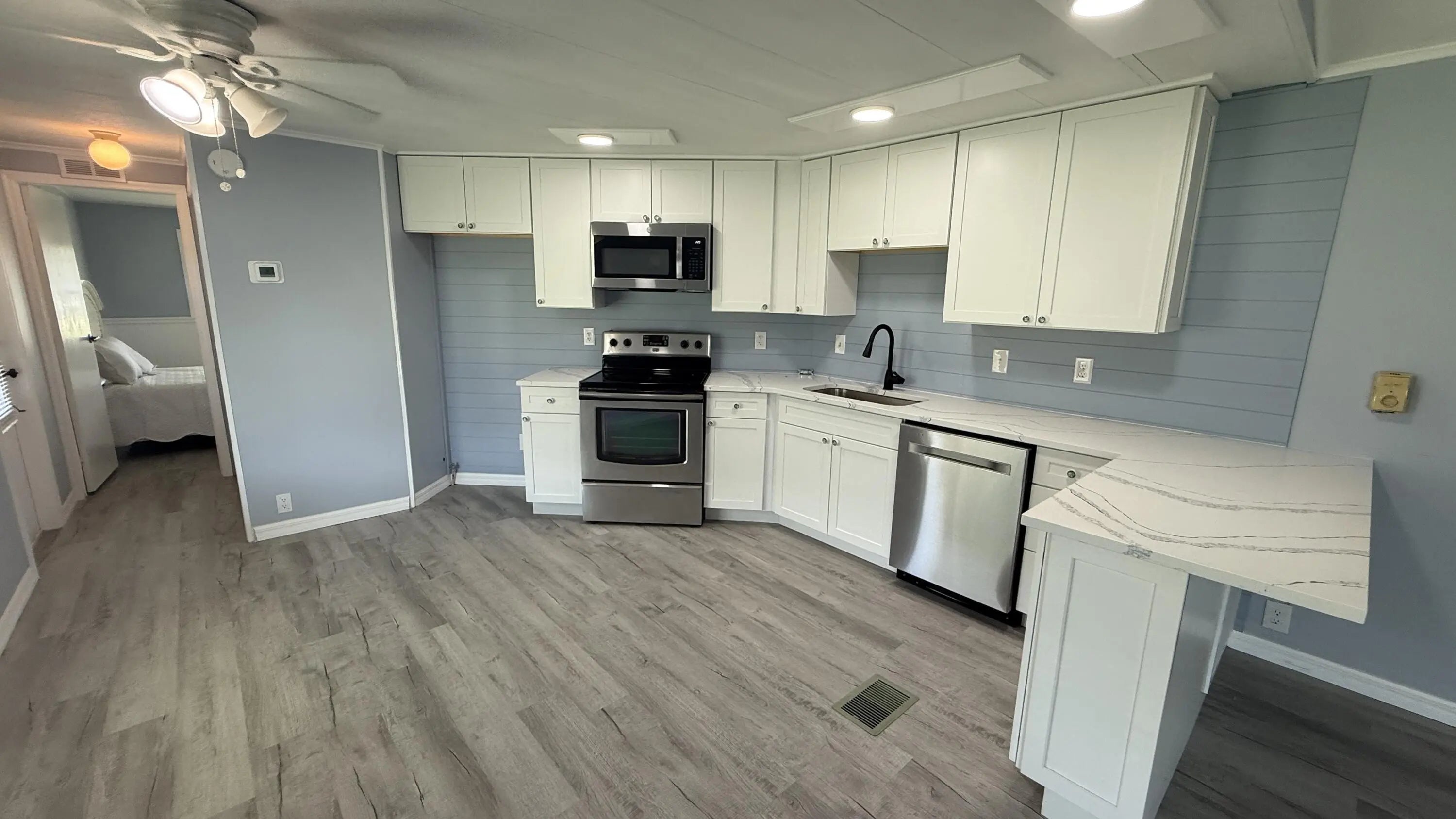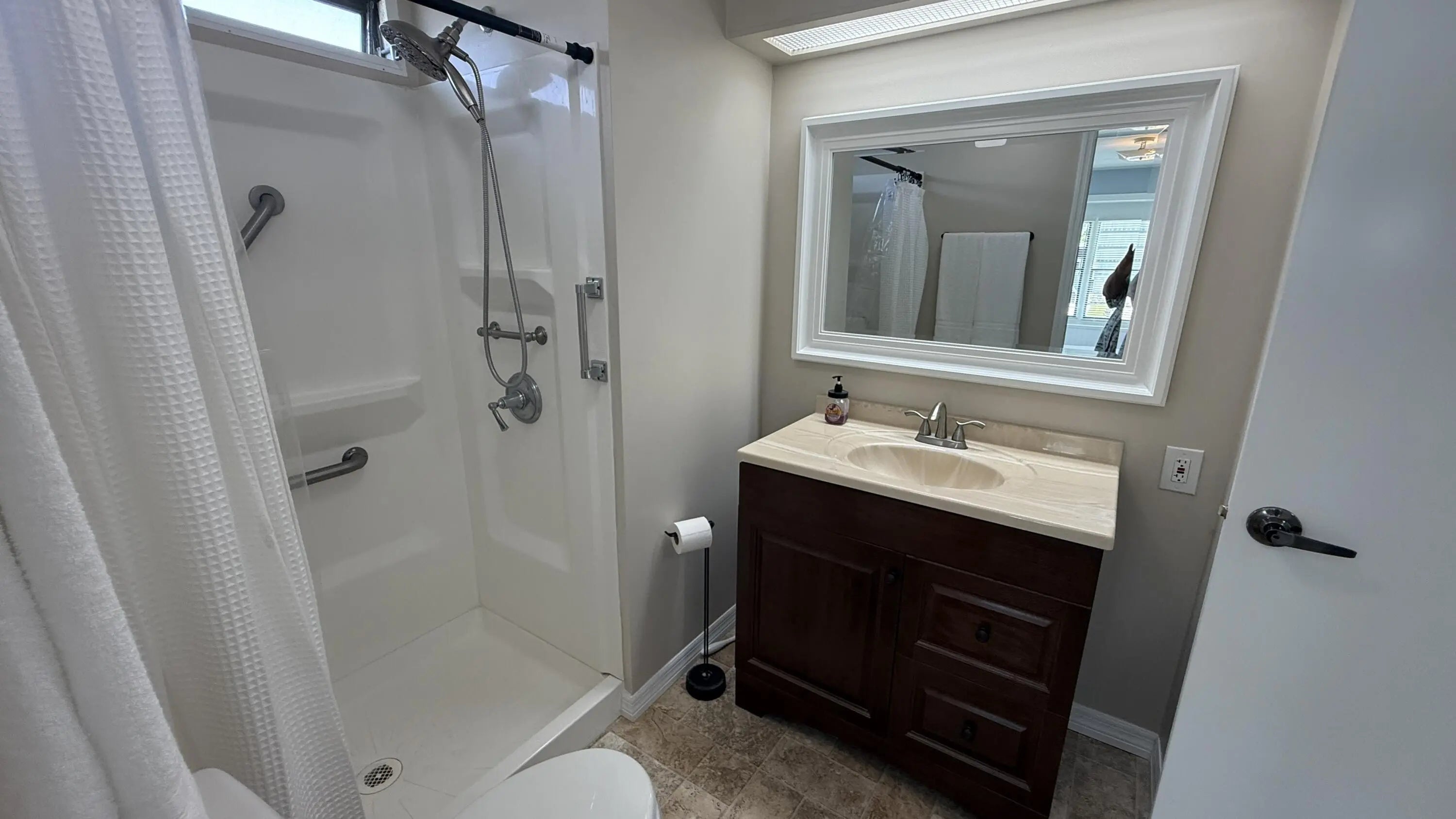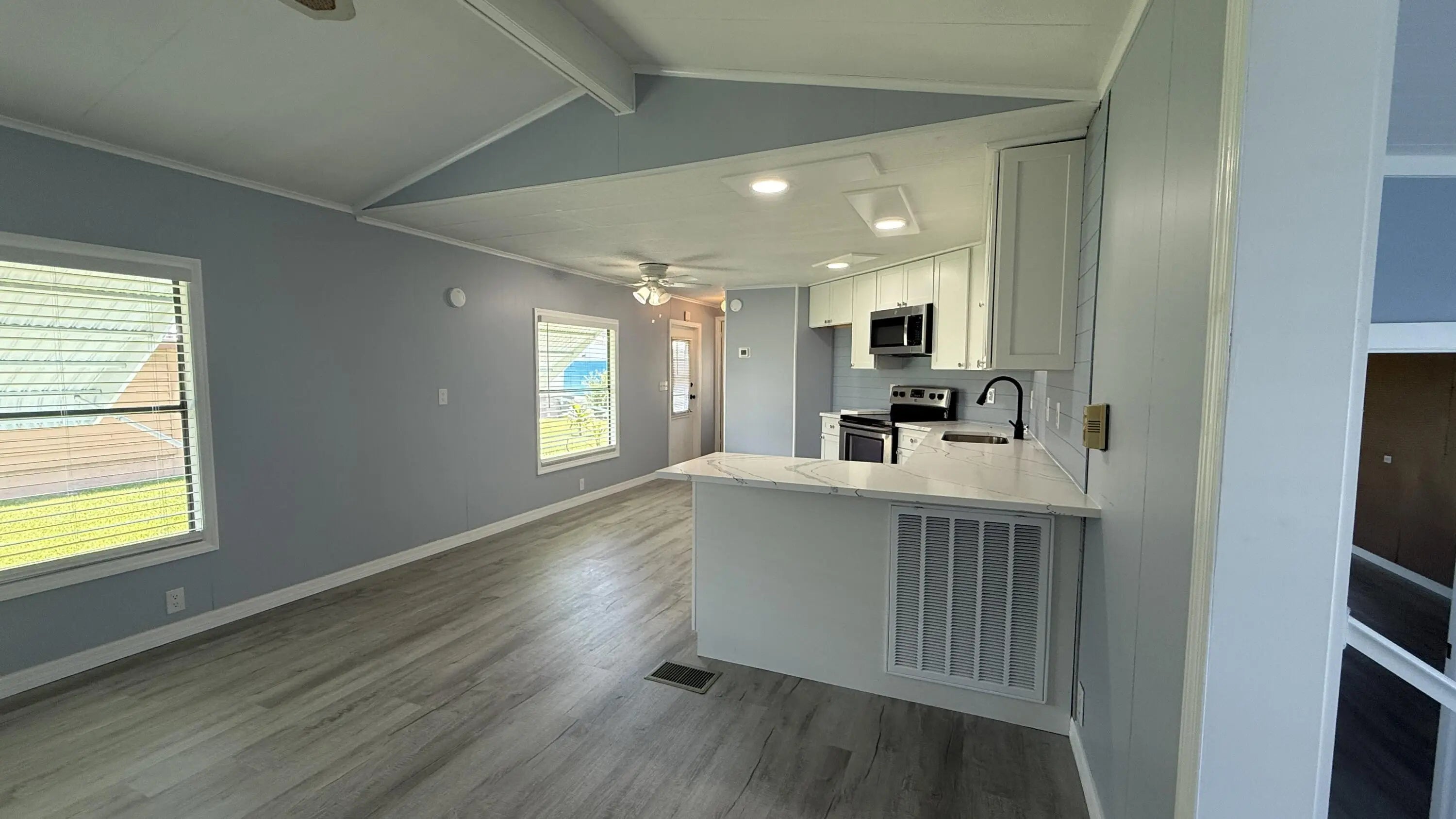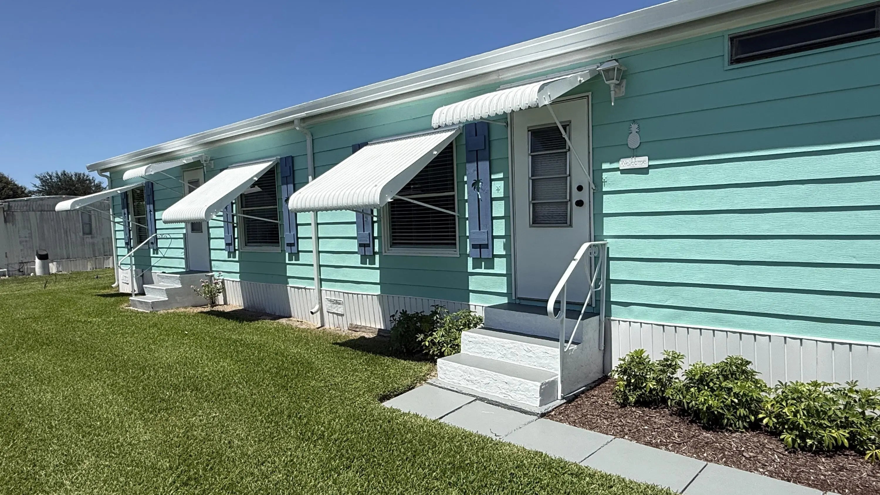 EXTREME MAKEOVER!!! Gorgeous 2 Bedrm/2 Bath Manuf home in Cambridge 55+ community in Hobe Sound. BRING YOUR BOAT/RV. All new vinyl plank flooring thruout over 3/4 inch Ply-wood subfloors. 2X4 16'' on center construction w custom tie downs. New Aluminum roof-over 2012. Electric zoned, well fed, sprinkler system, 2021 A/C. New Shaker Style bright white OPEN kitchen w quartz counters, LED lighting & stainless range, microwave & dishwasher. SPLIT Bedroom Plan. Both Bedrms have ensuite baths. You enter the home into a FL room w custom staircase to Great Room. The 10X32 Bonus/Rec room is on the same level w a pegboard wall, washer/dryer, slop sink & beer frig. Great Curb Appeal!! Cambridge is mins to Ocean Beaches, ICW Boat Ramp & shopping.. YOW OWN THE LAND - ALL PETS WELCOME. Low HOA.