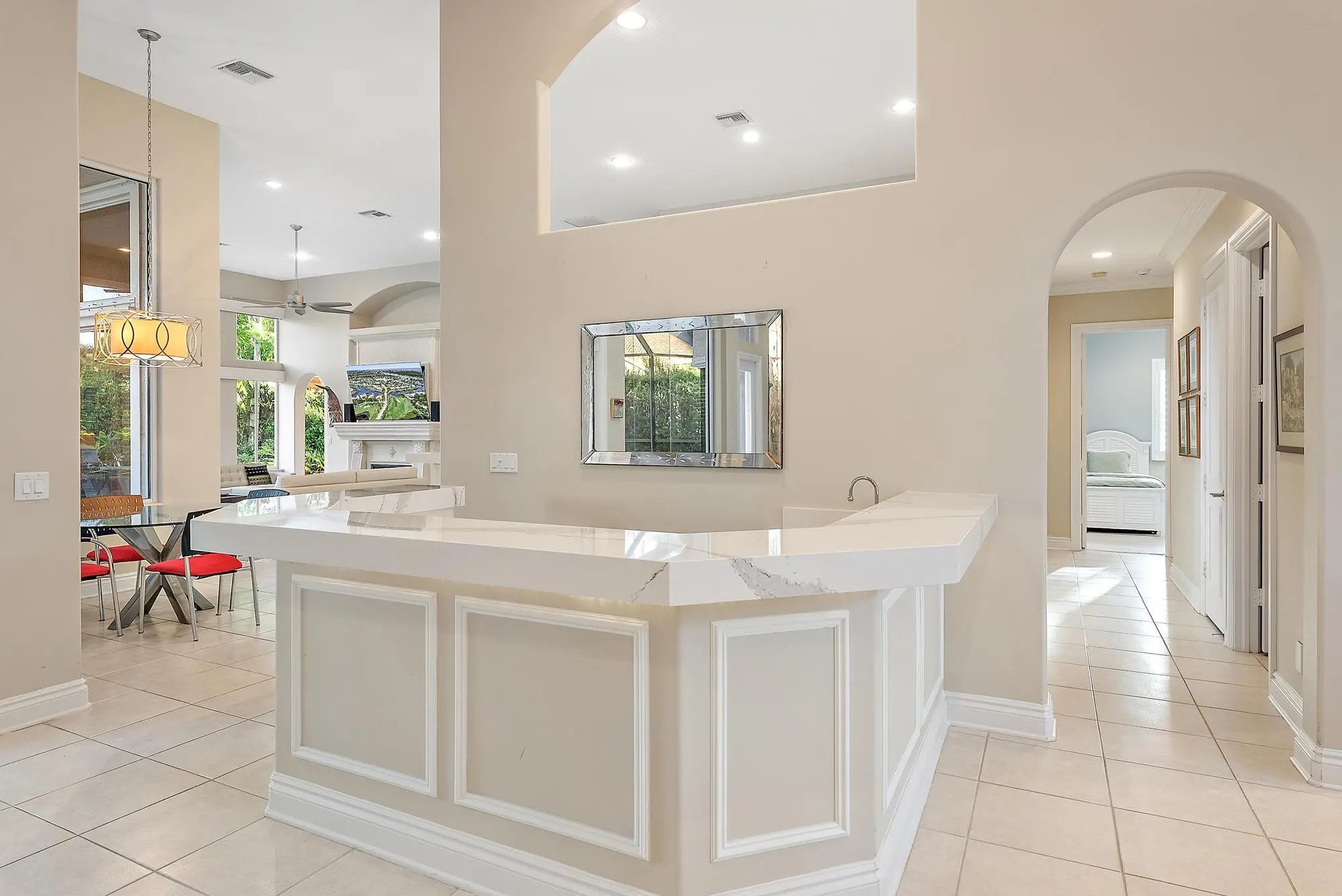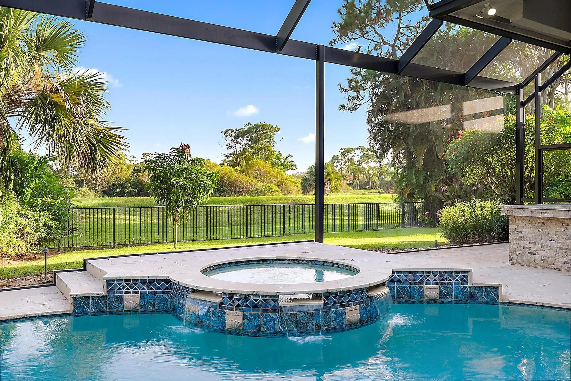 IMMEDIATE PREMIER GOLF MEMBERSHIP AVAILABLE WITH THE PURCHASE OF THIS LUXURY CUSTOM HOME. Expertly renovated and impeccably maintained, this custom estate offers over 3,900 square feet of refined living space designed for effortless comfort and elegant entertaining. Located on a lush, private lot with tranquil preserve views, this residence features a 2023 flat-tile roof and full hurricane protection with accordion shutters—making it truly move-in ready. A circular driveway welcomes you to grand double entry doors, opening to an expansive floor plan rich in architectural detail and upscale transitional finishes. The foyer impresses with soaring coffered ceilings and direct views of the oversized screened-in pool, spa, and serene outdoor living space. THREE BRAND NEW HVAC'S (2025.) Parts and Labor covered for 10 years under warranty. The spacious living room includes a custom wet bar with quartz countertops and bespoke cabinetryideal for entertaining. The chef's kitchen has been fully renovated with striking quartz countertops, including a dramatic waterfall-edge island, white cabinetry with designer hardware, and high-end stainless appliances. Features include a built-in refrigerator, gas cooktop, double ovens, wine cooler, two sinks, and an exceptionally large walk-in pantryoffering style, function, and abundant storage. This home offers 4 spacious ensuite bedrooms plus a library and a total of 4.5 baths. The luxurious primary suite is a true retreat, featuring custom built-in closets, Saturnia marble floors, engineered wood flooring, a two-level jetted tub, dual shower heads, and a brand-new glass shower enclosure. Resort-style outdoor living is elevated by a picture window-style screened enclosure that maximizes stunning preserve views. The travertine patio is both elegant and expansive, anchored by a transitional-style outdoor kitchen clad in neutral stacked stone, also featured on the adjacent wall. Fully pocketing sliding glass doors seamlessly connect indoor and outdoor spaces for year-round enjoyment. Additional highlights include: Timeless gas fireplace, Updated powder room with designer finishes, 3-car garage, Full home irrigation via private well (significant cost savings), Recently planted mango and avocado trees for fresh, homegrown produce. All of this is offered with Immediate Premier Golf Membership eligibility, making this exceptional property a rare opportunity to enjoy luxury living both inside and out. The Club at Ibis is an award-winning, Platinum Club of America that boasts a 90,000 sq. ft. clubhouse, three 18-hole Nicklaus-family Championship golf courses, five restaurants, a world-class fitness complex and spa, and incredible tennis and pickleball facility.