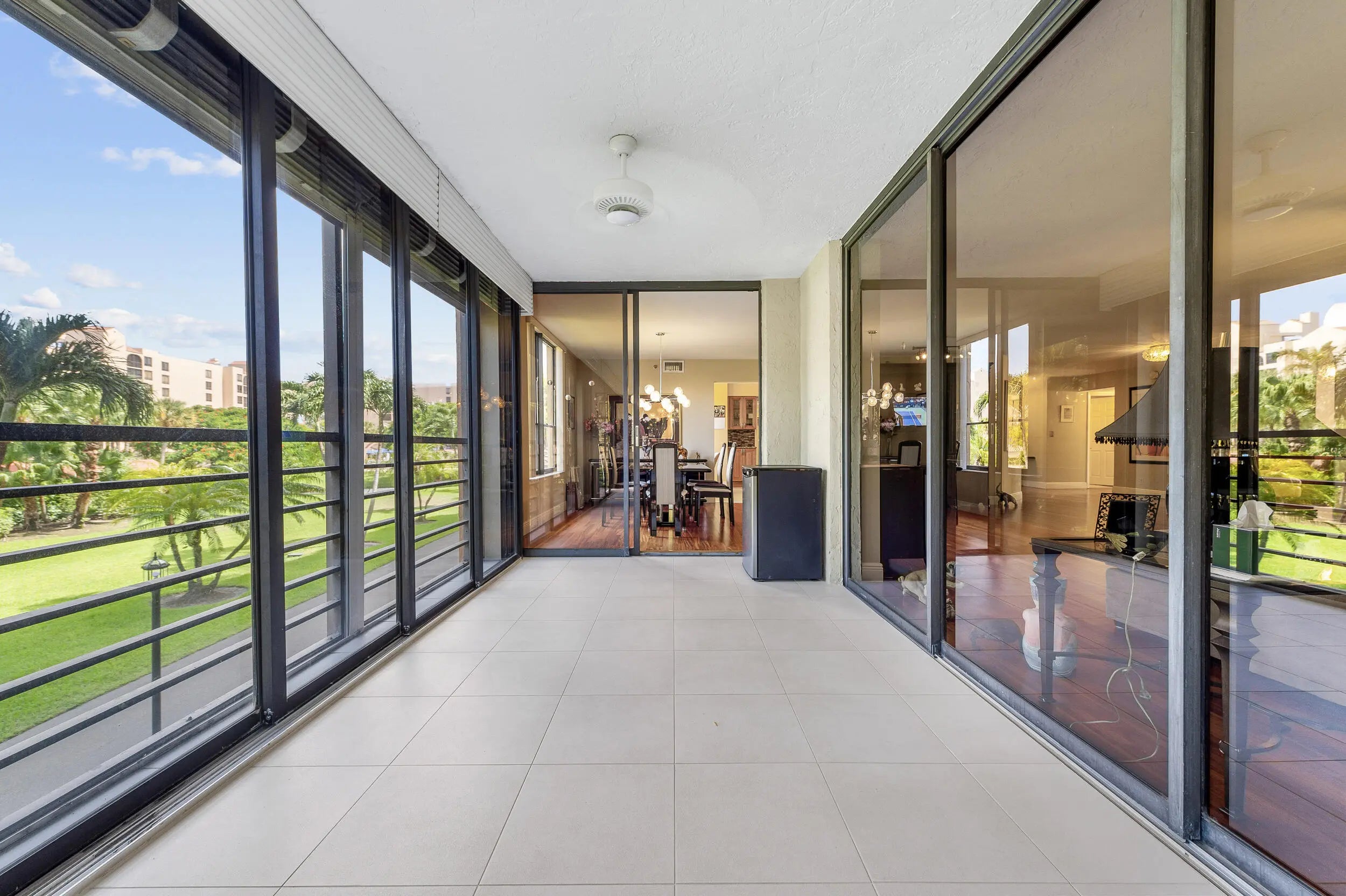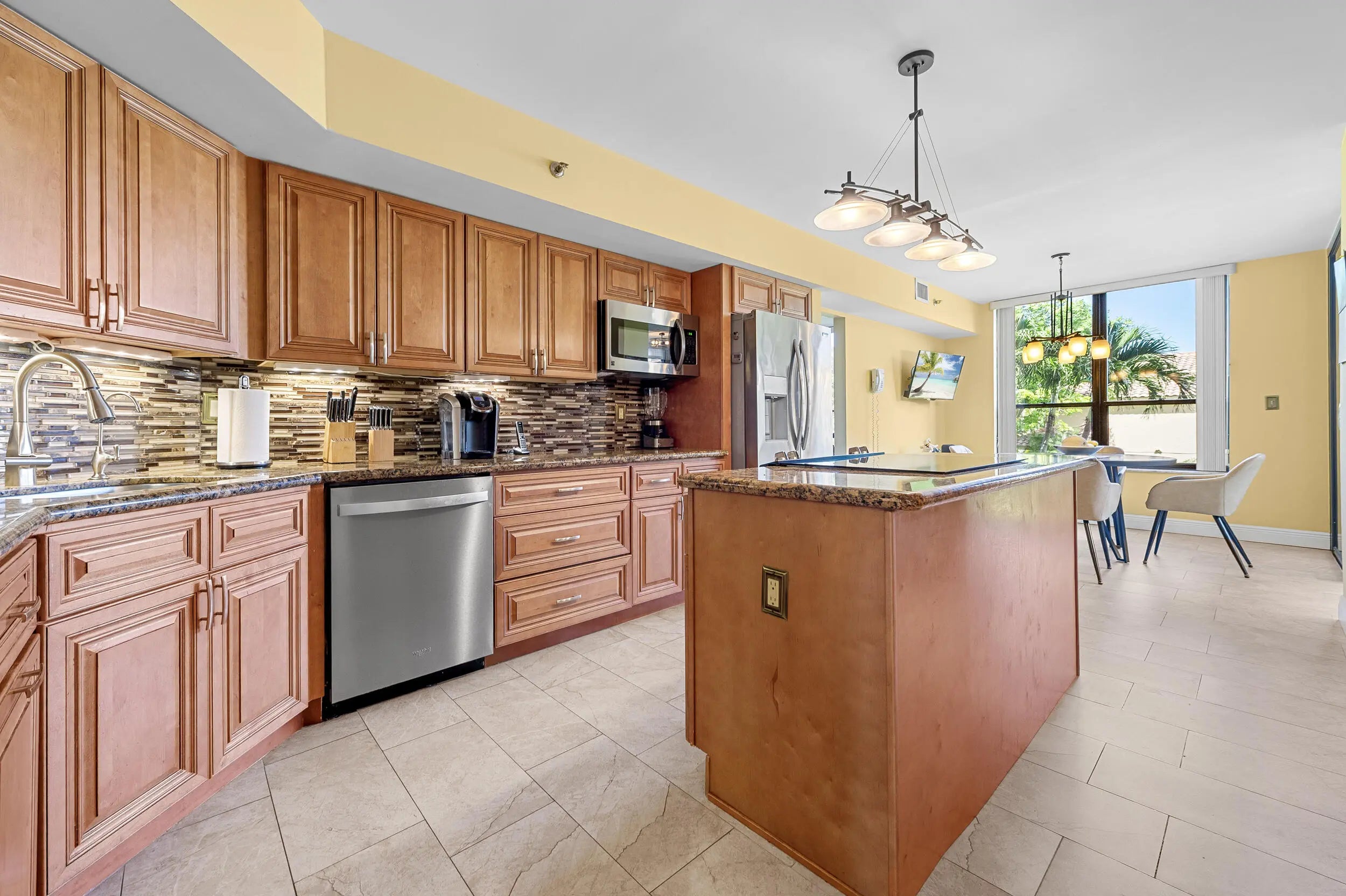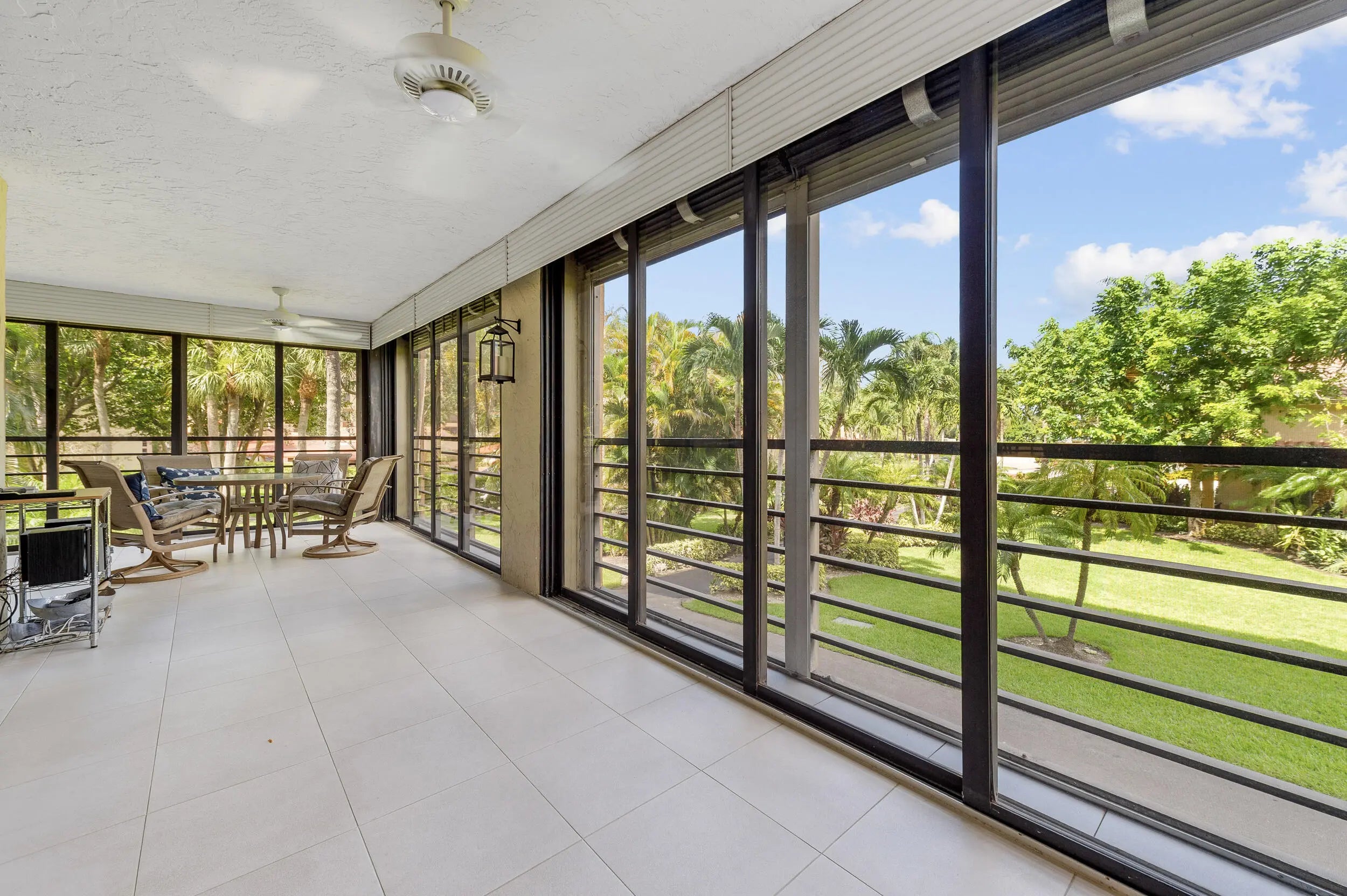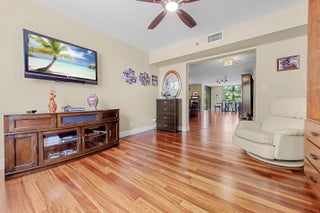 Spacious 3BR/2.5BA condo in the Promenade with the community's largest floor plan! Enjoy tropical garden views from the oversized enclosed terrace, just steps from the clubhouse and pool. Features include wood & laminate floors, smooth ceilings, and a versatile den/3rd bedroom with Murphy bed. The eat-in kitchen offers granite counters, wood cabinetry, stainless steel appliances, walk-in pantry, and pull-out drawers. Primary suite has 2 walk-in closets and an updated bath with dual sinks, vanity, soaking tub & separate shower. Upgrades include newer appliances, 2 ACs, brand-new water heater, updated baths, and laundry with utility sink. Two assigned parking spaces, extra storage, and recent building updates complete this must-see home!
