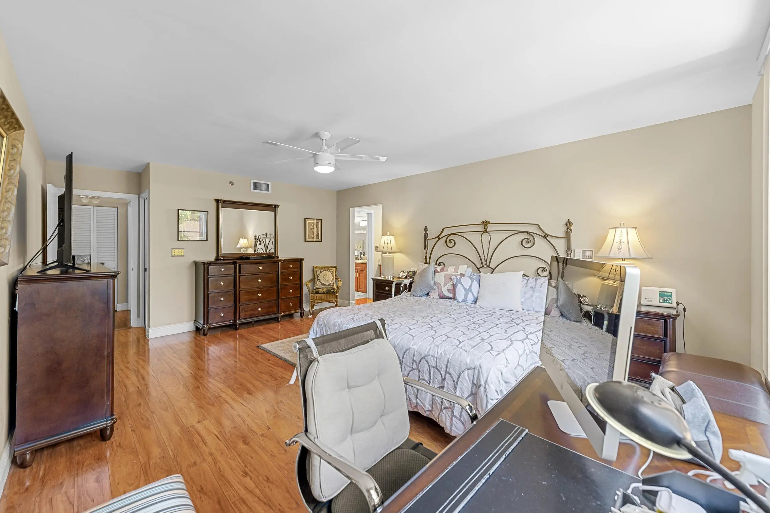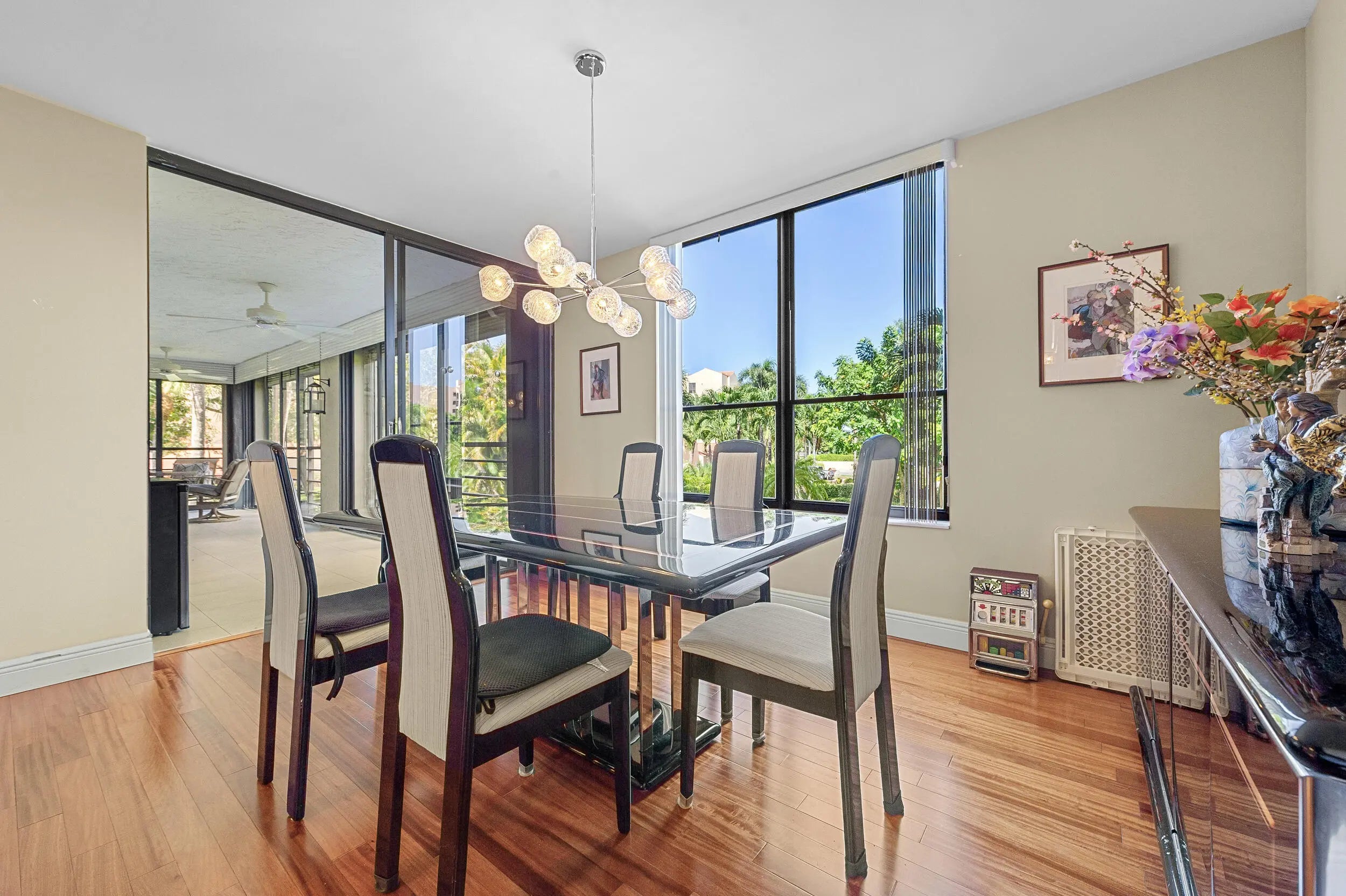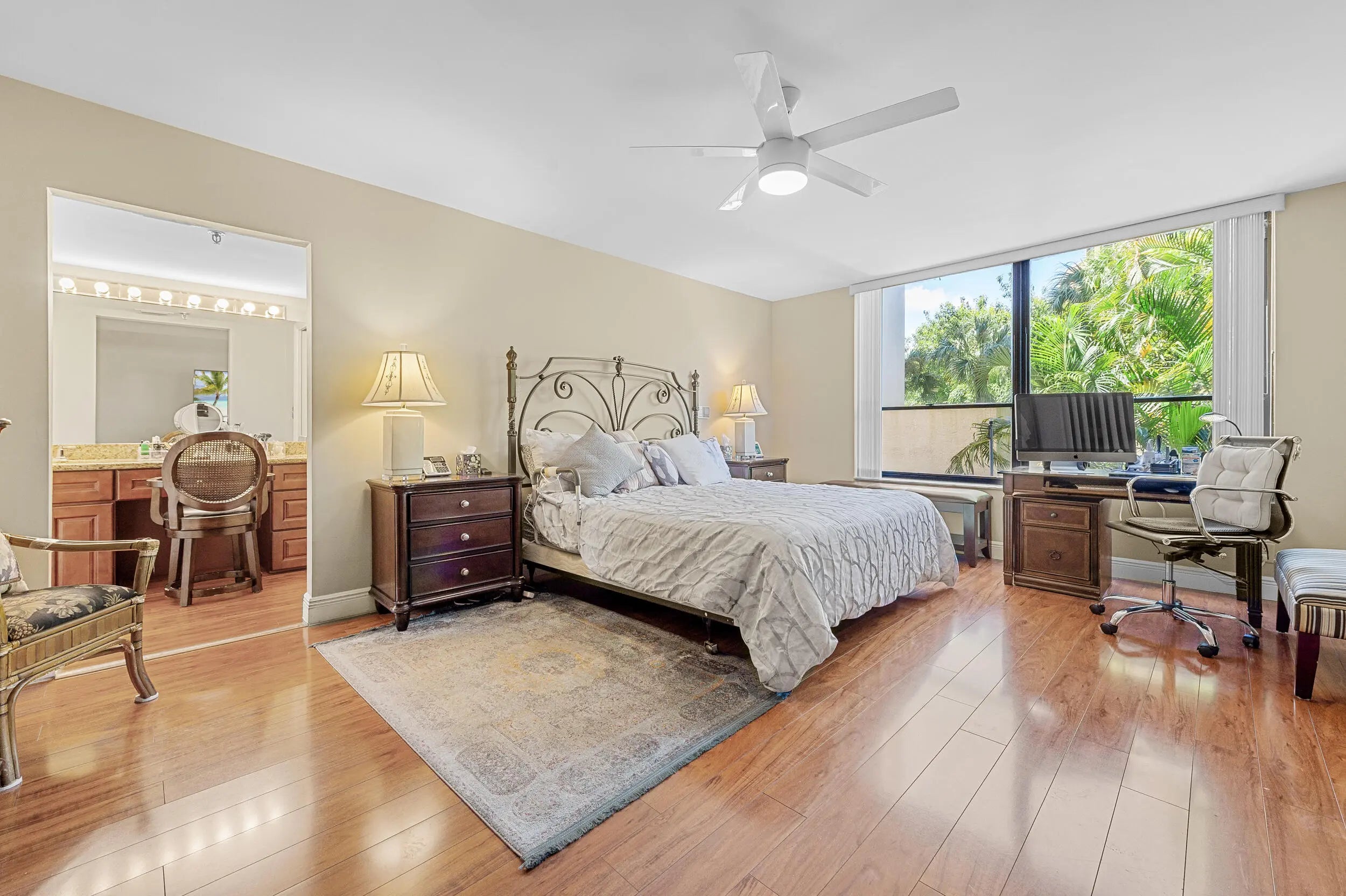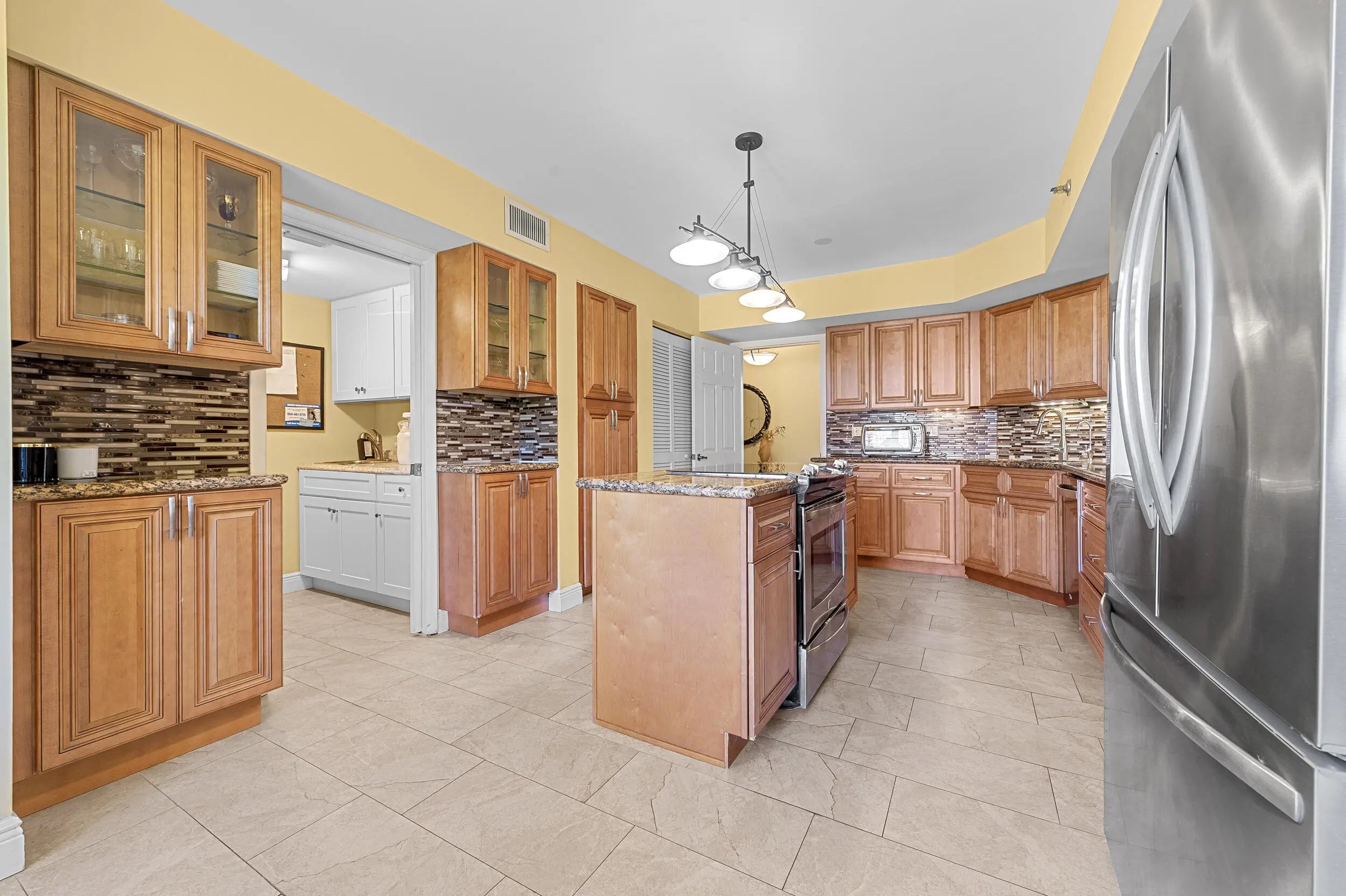 Spacious 3BR/2.5BA condo in the Promenade with the community's largest floor plan! Enjoy tropical garden views from the oversized enclosed terrace, just steps from the clubhouse and pool. Features include wood & laminate floors, smooth ceilings, and a versatile den/3rd bedroom with Murphy bed. The eat-in kitchen offers granite counters, wood cabinetry, stainless steel appliances, walk-in pantry, and pull-out drawers. Primary suite has 2 walk-in closets and an updated bath with dual sinks, vanity, soaking tub & separate shower. Upgrades include newer appliances, 2 ACs, brand-new water heater, updated baths, and laundry with utility sink. Two assigned parking spaces, extra storage, and recent building updates complete this must-see home!