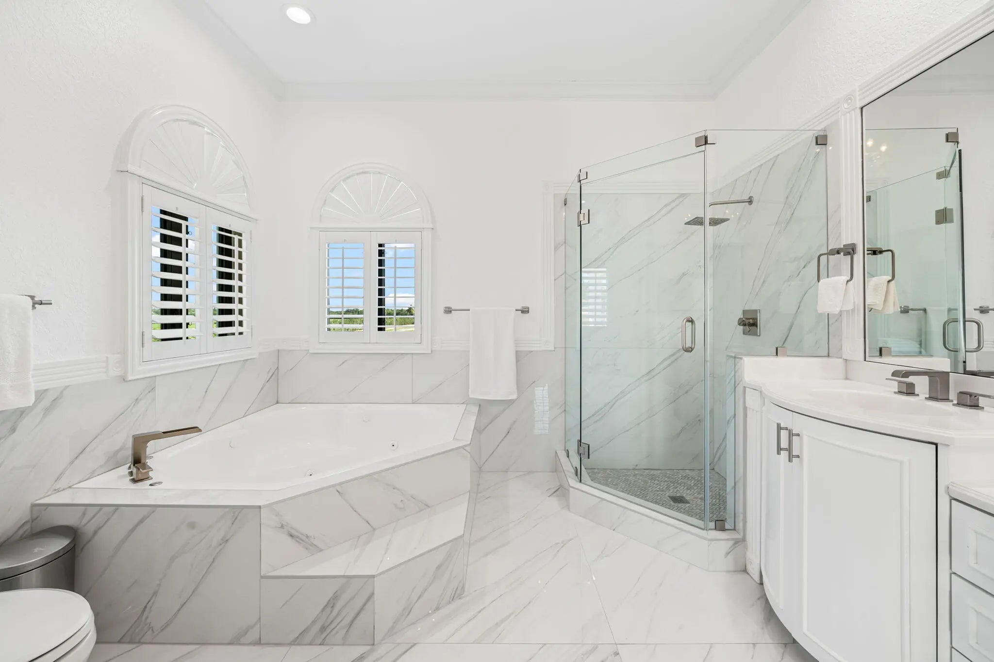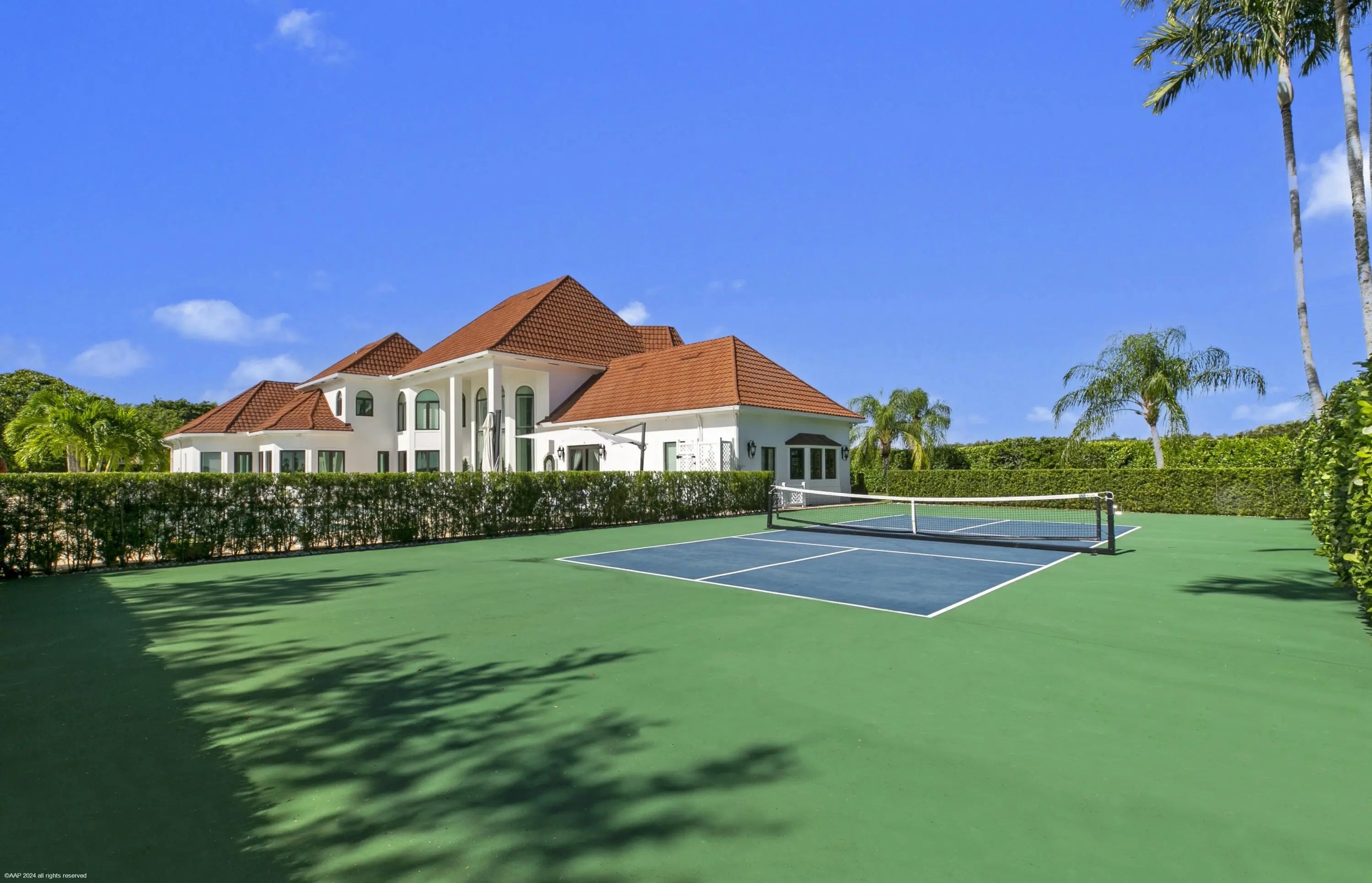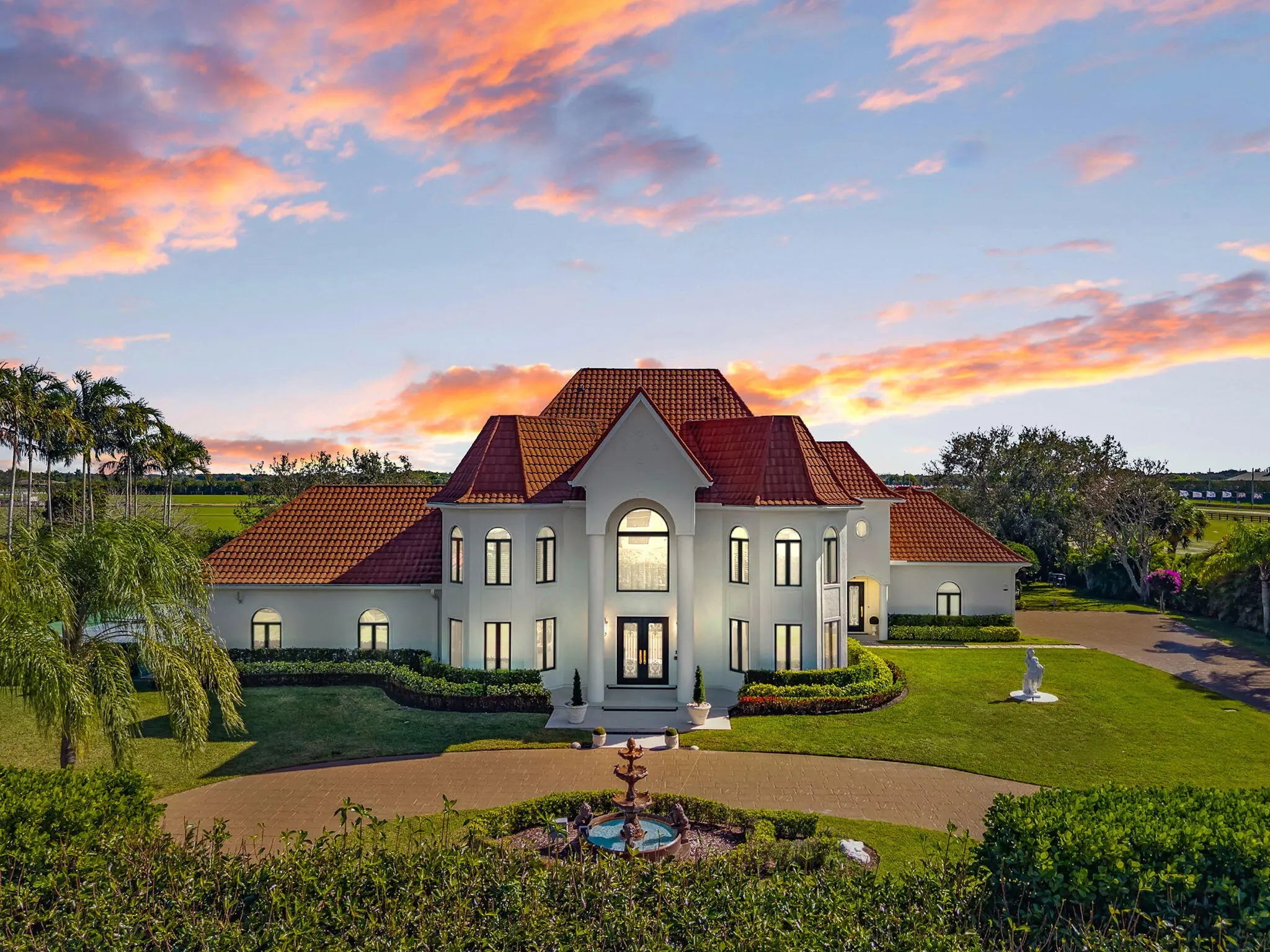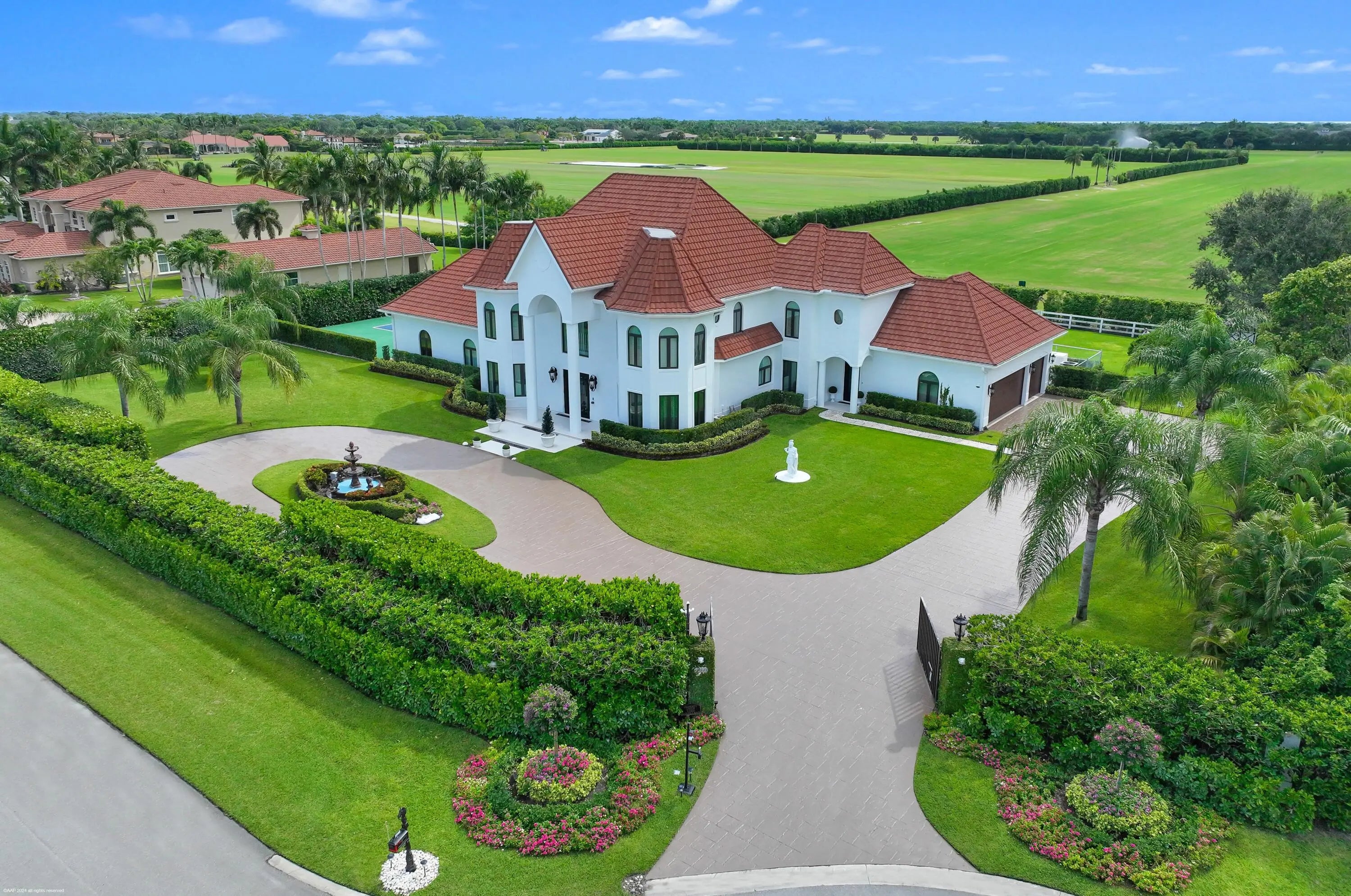 Welcome to this exquisitely designed estate in the prestigious Southfields of Palm Beach Polo gracefully positioned along 5 private polo fields. Beyond the gated entry, this turnkey five bedroom,four-and-a-half-bath residence spans 5,364 square feet and is crowned with a stone-coated metal roof-offering refined living just a short golf cart ride away from Wellington's world-class equestrian venues. The outdoor setting rivals a private resort. Lush, manicured grounds frame one of S. Florida's largest residential heated saltwater pools- an impressive 88 ft. in length -surrounded by an expansive 3,500 sqft lounging deck. A private, lighted Pickleball court invites play from dawn to dusk, while the fully equipped outdoor kitchen sets the stage for effortless evening entertaining. Inside, soaring ceilings, dramatic picture windows, and a sweeping spiral staircase create a sense of scale and elegance. The thoughtfully designed floor plan includes a dedicated office and a chef's kitchen anchored by a striking 120-inch marble waterfall island and premium Thermador appliances. Extensive upgrades elevate both comfort and peace of mind, including hurricane-impact windows and doors, five newly renovated bathrooms, custom lighting, an air conditioned 3 car garage, integrated Sonos audio, security cameras, a water leak detection system, and a whole-house Generac generator. Towering 12 foot hedges ensure privacy,and the fully irrigated grounds offer both city and well water options. An extraordinary offering that seamlessly blends luxury, privacy, and the ultimate equestrian lifestyle awaits.