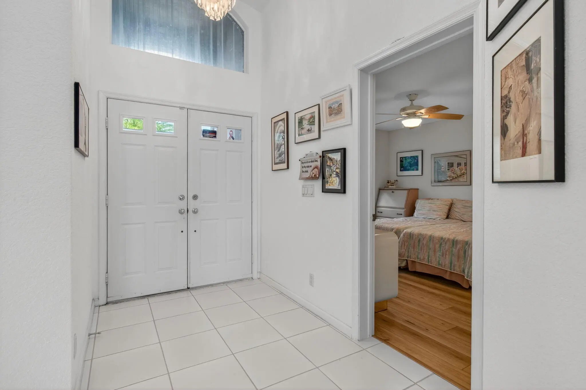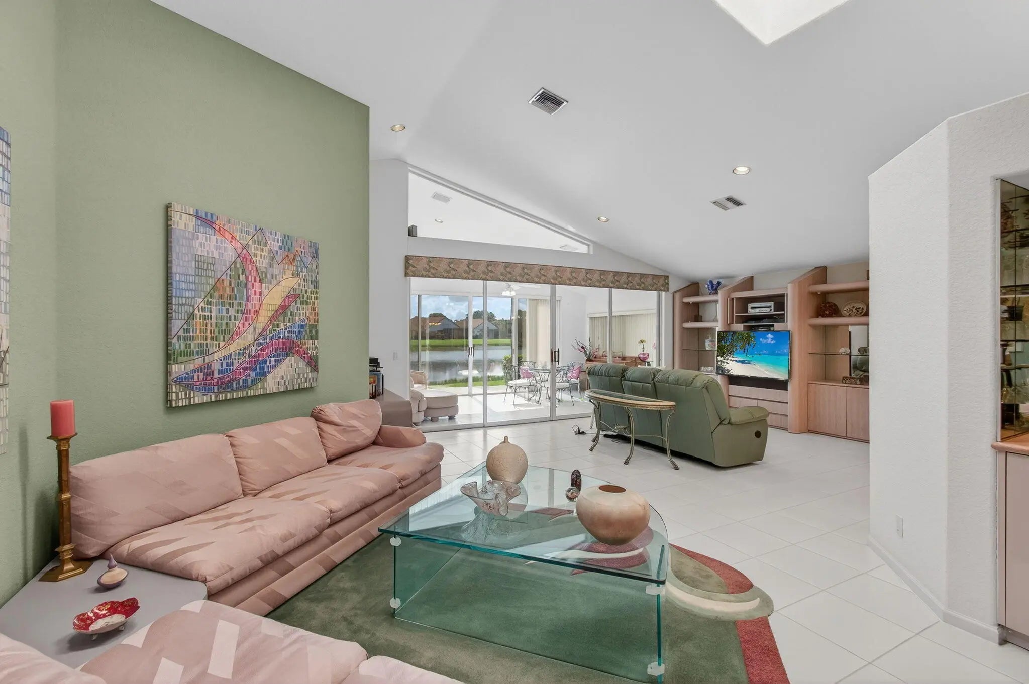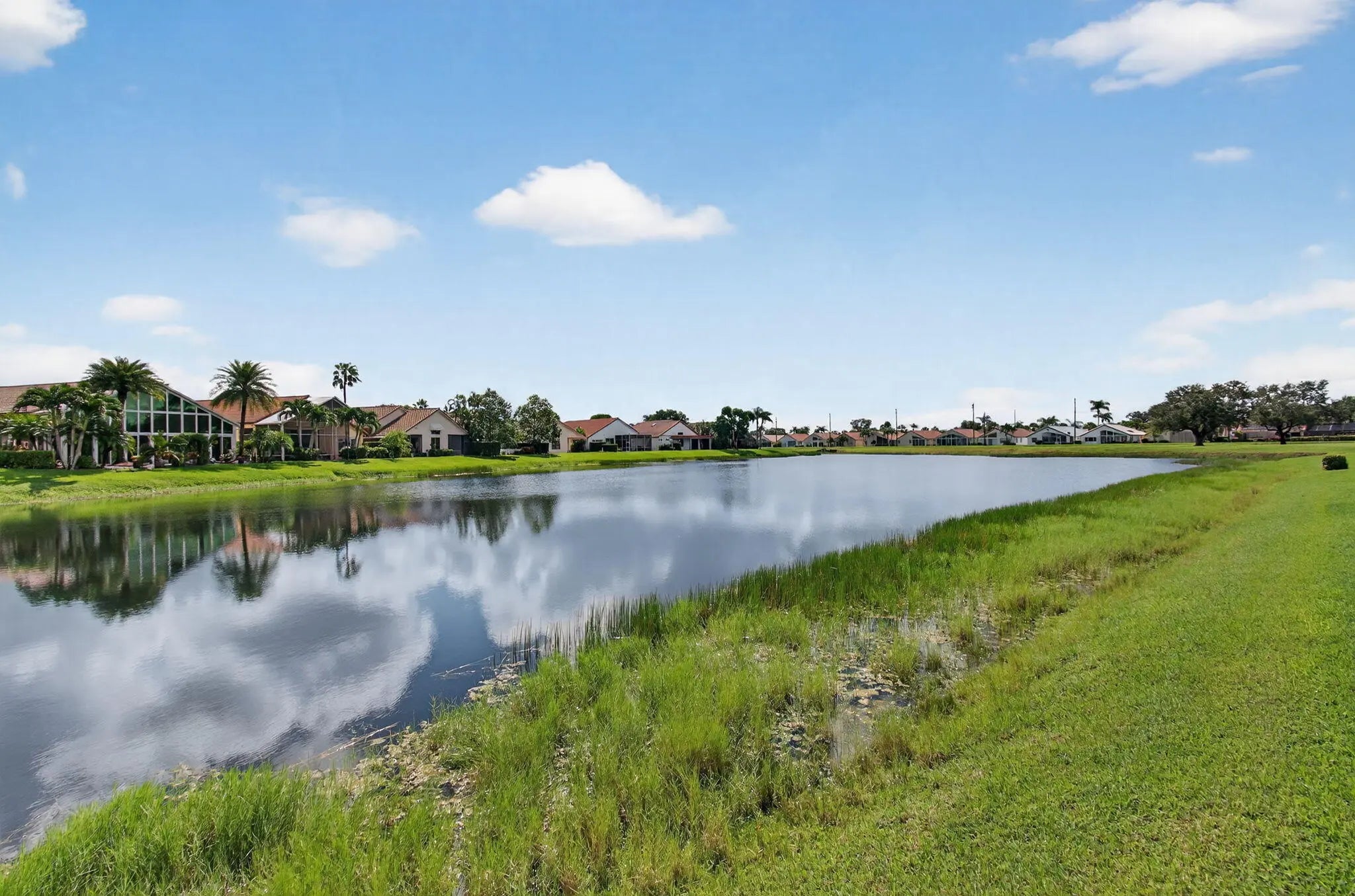 This elegant three-bedroom, three-bath home is situated on a corner lot and offers picturesque views of both water and the golf course. Updated kitchen features white shaker cabinets w/solid surface counter top plus breakfast nook. Screen enclosed side patio is ideal for outdoor dining. Large living room includes a built-in wet bar with additional storage. Formal dining room and family room are enhanced by custom built-ins. The family room opens onto a glass-enclosed Florida room equipped with air conditioning. The primary bedroom is outfitted with integrated furniture, a large walk-in closet, and a beautifully renovated ensuite bathroom boasting a spa tub, separate shower, and dual vanity. Bedroom two has an en-suite bathroom plus walk-in closet. Bedroom three is large with big walk in closet. The home is located on a culdesac with the added bonus of being a short walk to the community pool. The community features 24/7 guard gated security, annual roof and driveway cleaning, cable, lawn care and landscaping maintenance. Optional memberships are available for social and golf at the Indian Spring Country Club which features gym, resort style pool, restaurant, bar, banquet room and numerous social clubs.