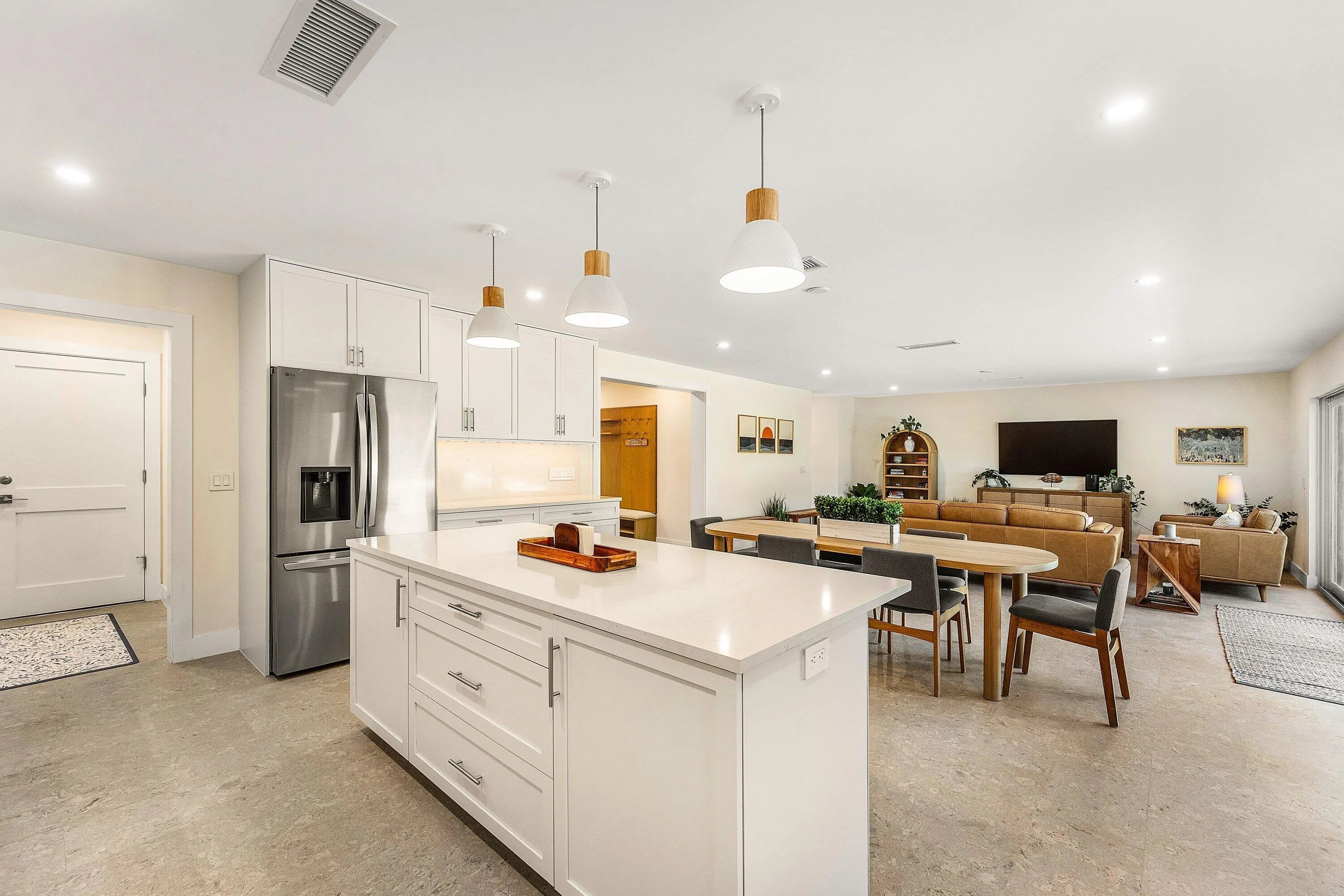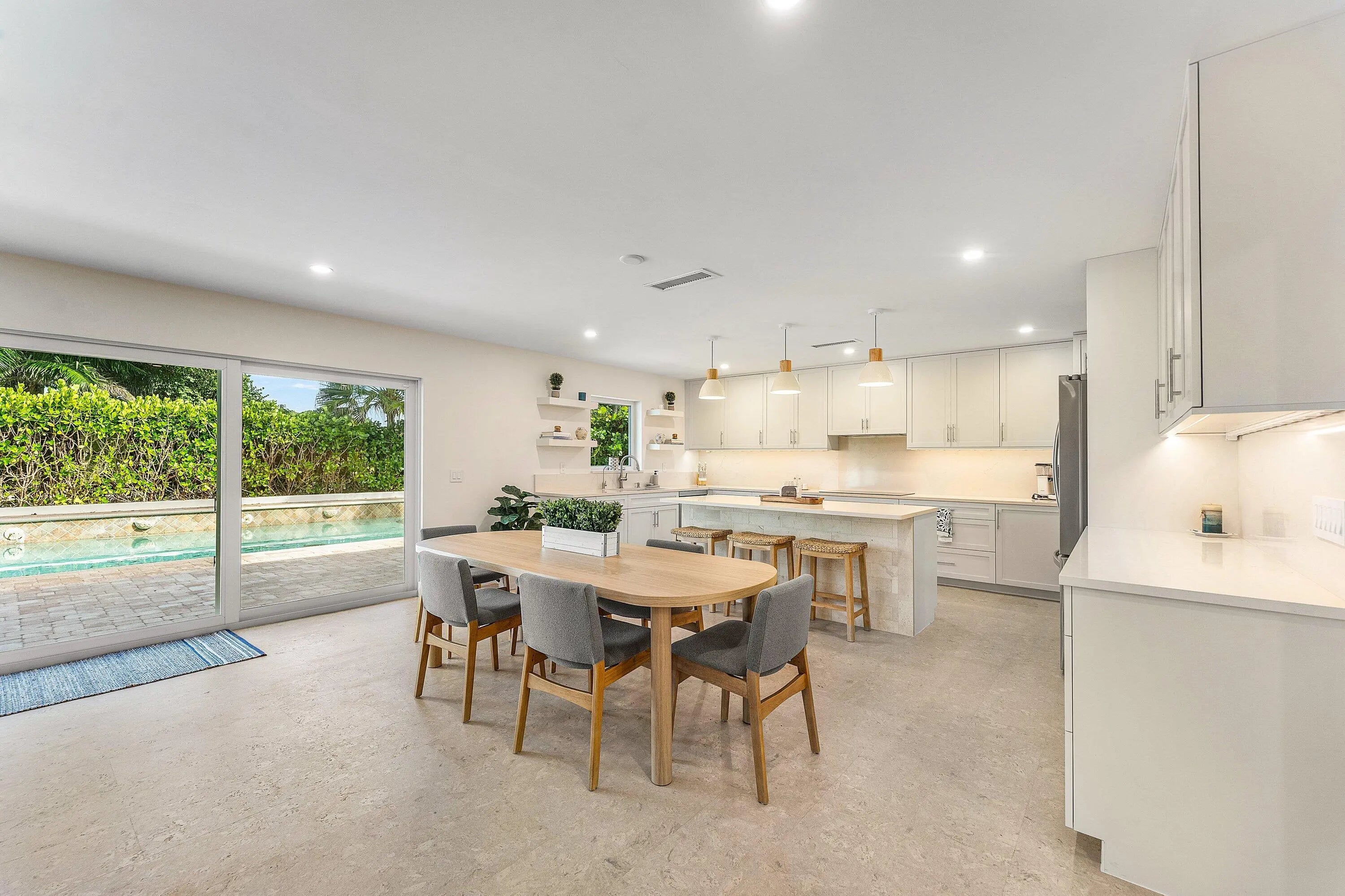 Fabulous annual rental in the highly sought-after Sun and Surf neighborhood of East Boca Raton! This charming, 100% renovated single-family home is a casual beach chic haven, just across the street from the beach and backing onto the picturesque Red Reef golf course. Never lived in, this home offers a fresh start with modern elegance. Step into a welcoming foyer that leads to an expansive living, dining, and kitchen area, all graced with new cork flooring that feels wonderful underfoot. The eat-in kitchen is a chef's delight, featuring all-new stainless steel appliances, white cabinetry, and a large island that's perfect for gatherings. This home has 3 comfortably sized bedrooms and 3.5 brand-new bathrooms. The primary suite offers a king-sized bed, the second bedroom houses a queen bed, and the third is ready for fun with bunk beds. All bedrooms have their own bathroom and plenty of closet space. There is an additional half bath in the main area. Enjoy the Florida sunshine in your private backyard oasis with a large deck and inviting pool. Impact windows and doors open to this serene outdoor space. For your convenience, the property includes a full 2-car garage stocked with bikes, ready for your coastal adventures. Walk to the beach or downtown Boca Raton from the beachside ranch home. Fully furnished and available for an unbelievable rental, this home is your perfect escape. Don't miss out on this exceptional opportunity!