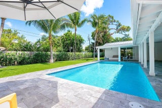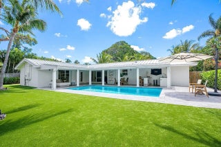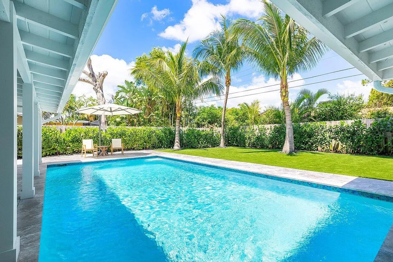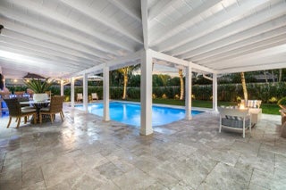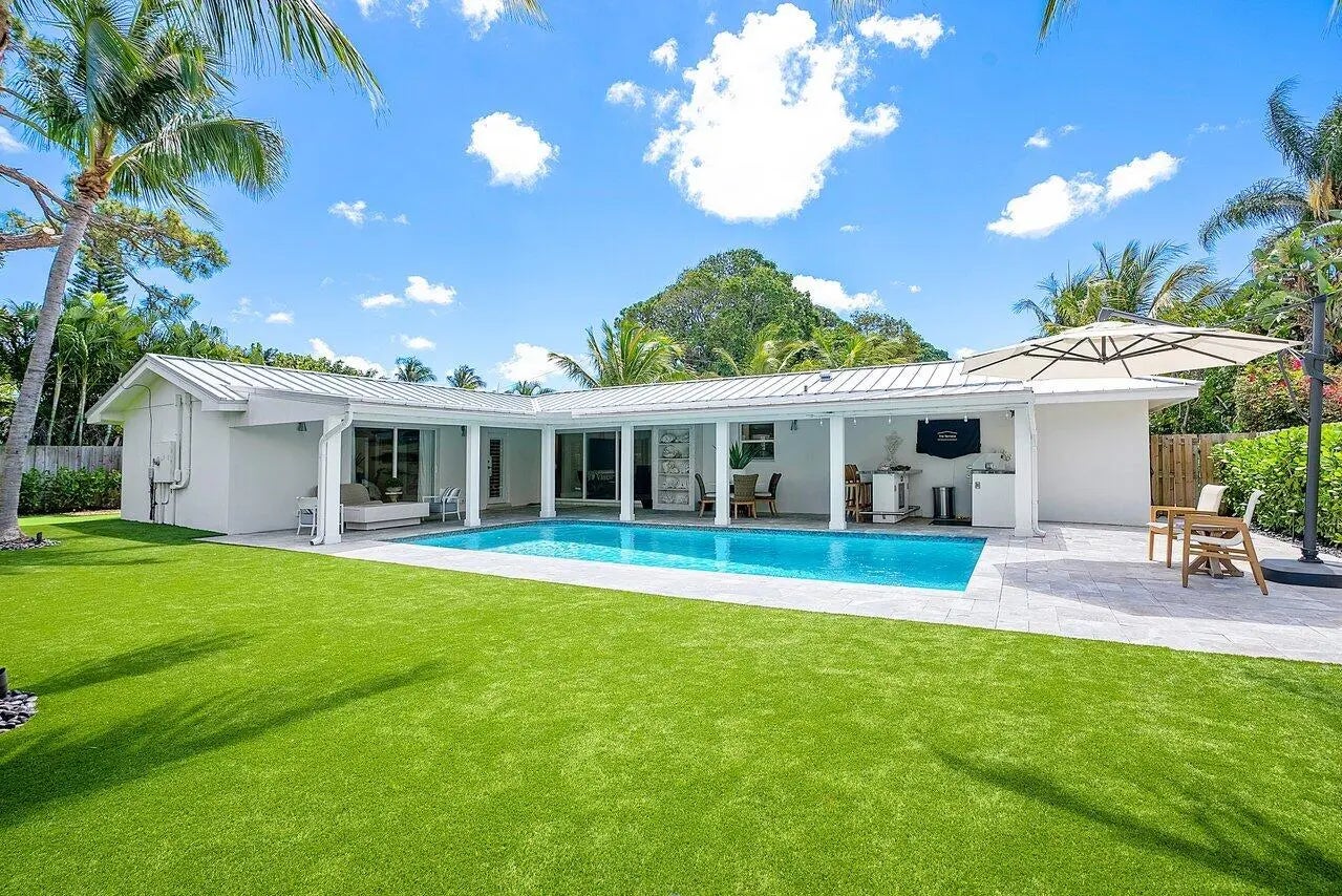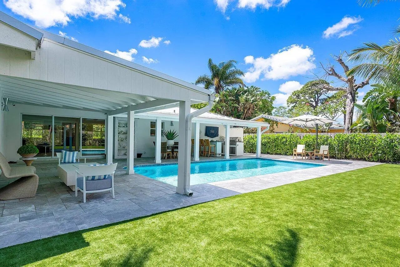 Step into luxury living at its finest with this completely renovated home in the heart of Boynton Beach. No detail has been overlooked in the transformation of this home, where modern amenities blend seamlessly with timeless elegance. From the moment you enter, you'll be greeted by the impeccable craftsmanship and attention to detail evident throughout. New electrical and plumbing (no cast iron pipes)! Step outside to discover an expansive pool area with covered loggia and summer kitchen/bar, perfect for outdoor entertaining. Custom landscaping, complete with landscape lighting and security cameras, enhances the curb appeal and security of the property. Practice your putting skills on the backyard putting green. Inside, the beautifully renovated kitchen boasts a center island with bar seating, quartz counters, and stainless steel appliances from KitchenAid and Bosch. Admire the restored terrazzo floors and the solid walnut front door with a triple locking system, providing both durability and elegance. Plantation shutters provide privacy and elegance to the hurricane impact-resistant glass windows and doors. Custom-made exterior lighting in the front and back of the home adds a touch of sophistication. Ample parking is provided by the circular driveway, while the new air conditioning and tankless water heater ensure year-round comfort and efficiency. Built-out closets and garage storage provide ample space for organization. Additional upgrades include a new irrigation system and pool pump, as well as renovated bathrooms showcasing luxury and style.