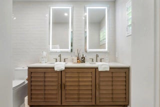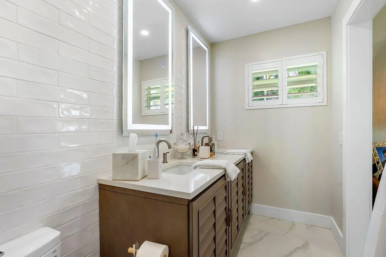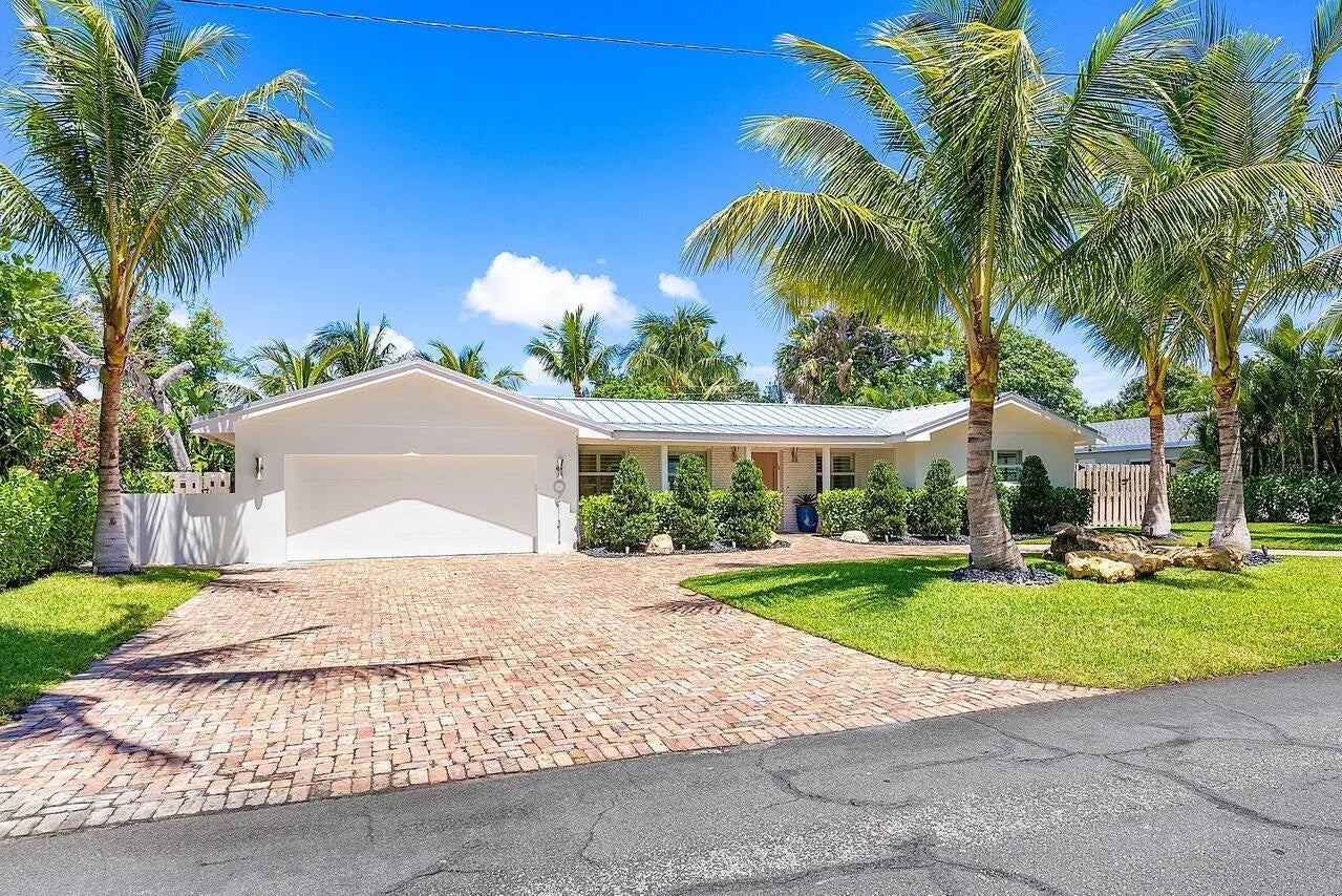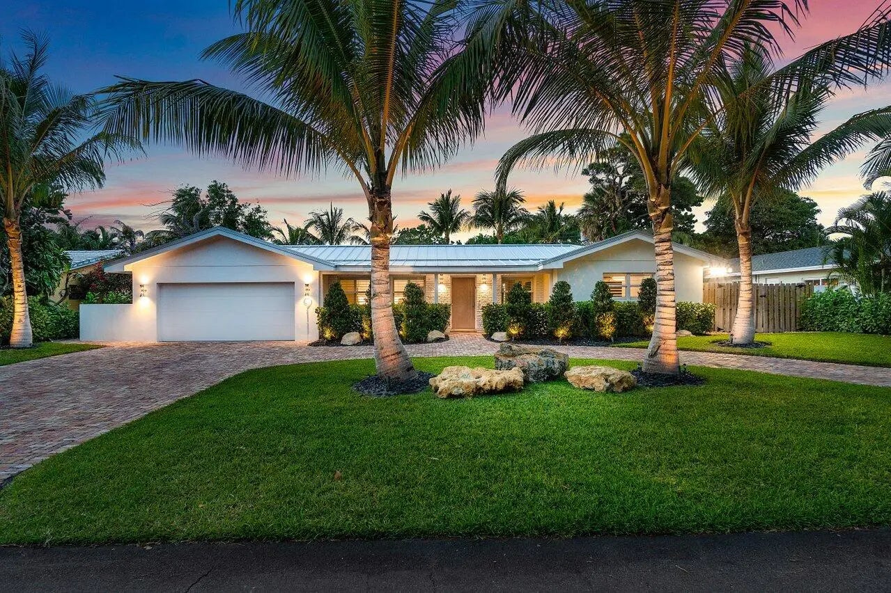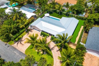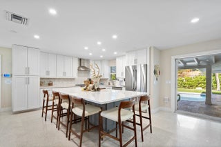 Step into luxury living at its finest with this completely renovated home in the heart of Boynton Beach. No detail has been overlooked in the transformation of this home, where modern amenities blend seamlessly with timeless elegance. From the moment you enter, you'll be greeted by the impeccable craftsmanship and attention to detail evident throughout. New electrical and plumbing (no cast iron pipes)! Step outside to discover an expansive pool area with covered loggia and summer kitchen/bar, perfect for outdoor entertaining. Custom landscaping, complete with landscape lighting and security cameras, enhances the curb appeal and security of the property. Practice your putting skills on the backyard putting green. Inside, the beautifully renovated kitchen boasts a center island with bar seating, quartz counters, and stainless steel appliances from KitchenAid and Bosch. Admire the restored terrazzo floors and the solid walnut front door with a triple locking system, providing both durability and elegance. Plantation shutters provide privacy and elegance to the hurricane impact-resistant glass windows and doors. Custom-made exterior lighting in the front and back of the home adds a touch of sophistication. Ample parking is provided by the circular driveway, while the new air conditioning and tankless water heater ensure year-round comfort and efficiency. Built-out closets and garage storage provide ample space for organization. Additional upgrades include a new irrigation system and pool pump, as well as renovated bathrooms showcasing luxury and style.
