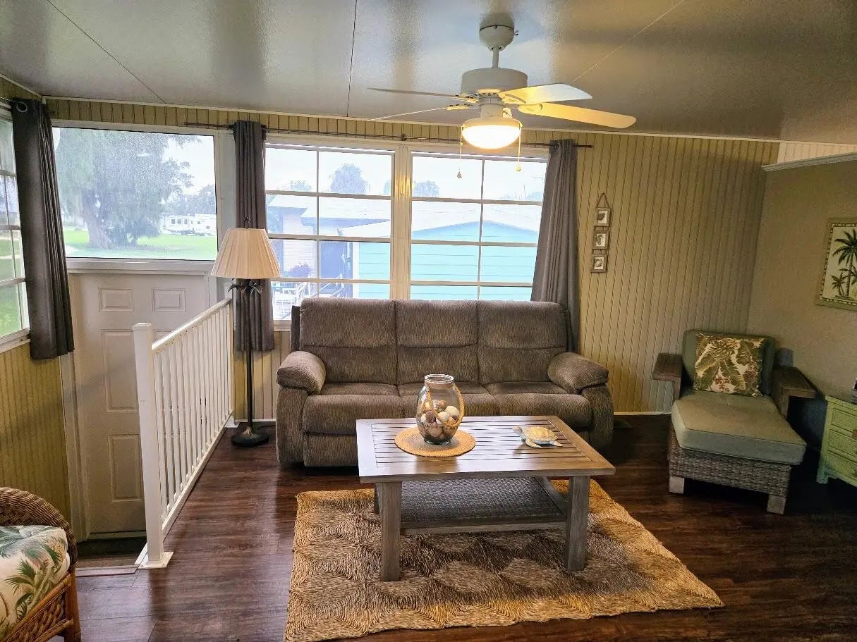 BLUE CYPRESS GOLF & RV RESORT: Meticulous 2014 home offers 1 bd 1 ba w/908 sf & 3,031 total sf. Living Room features large windows overlooking golf course, impact entry door and ceiling fan. Kitchen has newer appliances, including DW. Bdrm features built-in storage & ceiling fan. Walk-in shower. Bonus room can be used for office, craft or 2nd bdrm. Temporary wall can be removed to add addtl living space. Indoor W/D. 8x10 shed provides addtl storage/workshop. Slab walk way & pavers allow for outdoor living space. Perfect location for golfers and boating enthusiasts. Dock space & boat ramp available providing access to Lake Okeechobee. Community offers newer pickleball court, clubhouse, shuffleboard court & pool. This home has been exquisitely decorated and comes furnished.