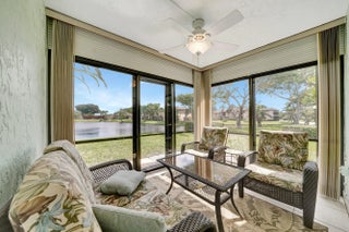 Enjoy stunning lake views from this bright first-floor corner unit with a glass-enclosed patio. Benefit from convenient assigned parking, quick pool access, accordion shutters for protection, & the ability to BBQ outdoors. Inside, find granite countertops, lightly used appliances, updated flooring, crown molding, & a stacked washer/dryer. Live securely in Boca Lago's gated, non-mandatory country club 55+ community near shopping & major roads. Plus, a brand-new air conditioner was installed in October 2025 & new roof 2025. Don't miss the chance to live in comfort and style with spectacular views!