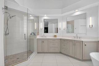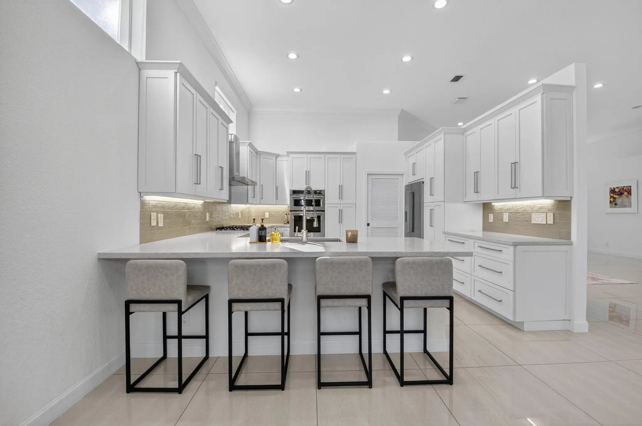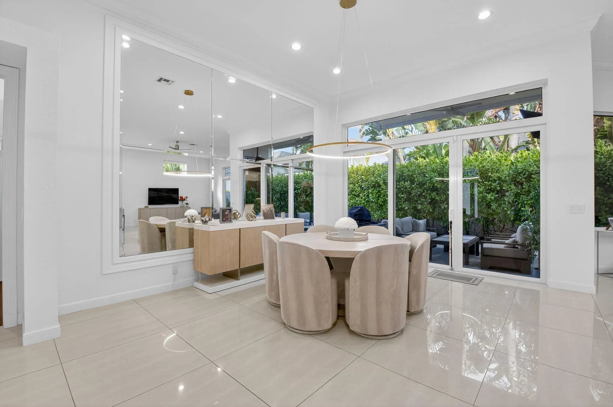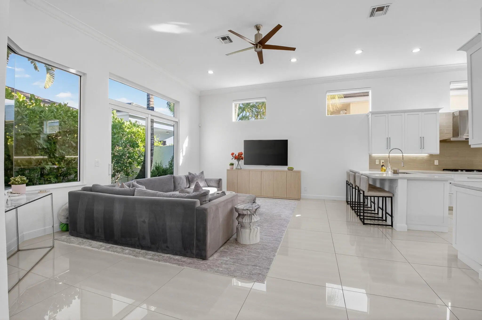 Bright and welcoming, this newly updated open-concept home offers a perfect balance of natural light and modern finishes. The backyard is ideal for relaxing or entertaining. A guest room includes a private ensuite bath, while the third bedroom features elegant built-ins and beautiful bay windows that fill the space with warmth. The kitchen is sleek and functional, showcasing white cabinetry, Quartz countertops, ample storage, and high-end stainless steel appliances. The primary suite is spacious and serene, featuring hardwood floors, plantation shutters with a backyard view, and a newly renovated bath with a freestanding tub, glass-enclosed shower, and Quartz-topped vanities.