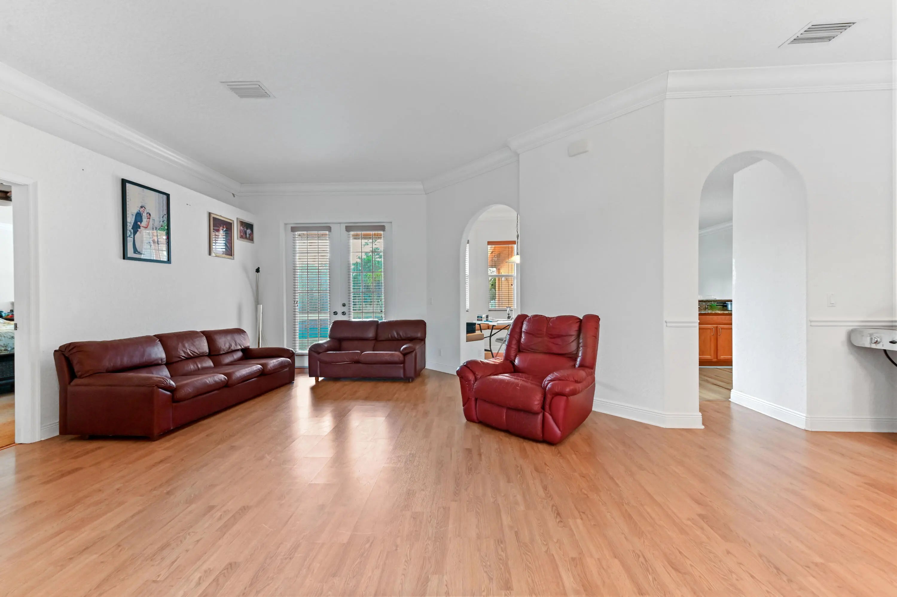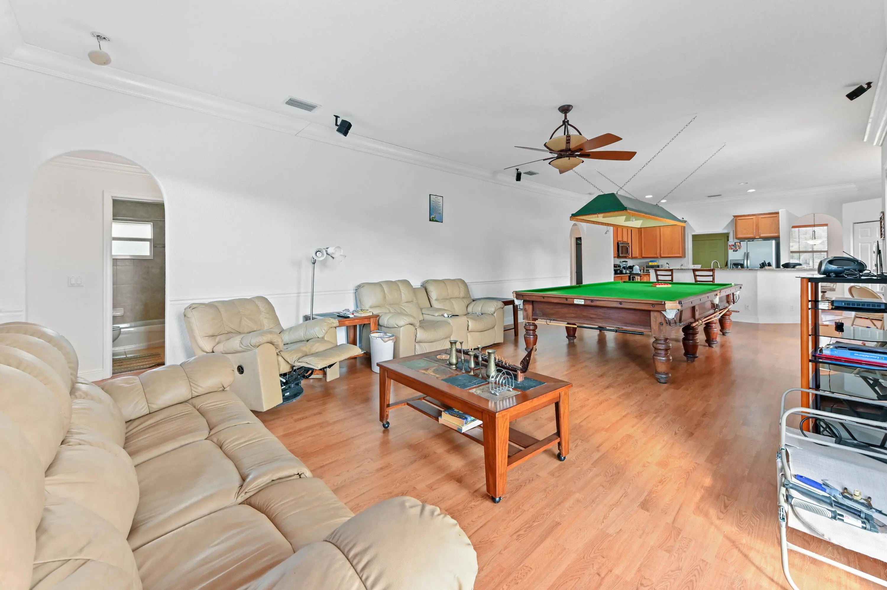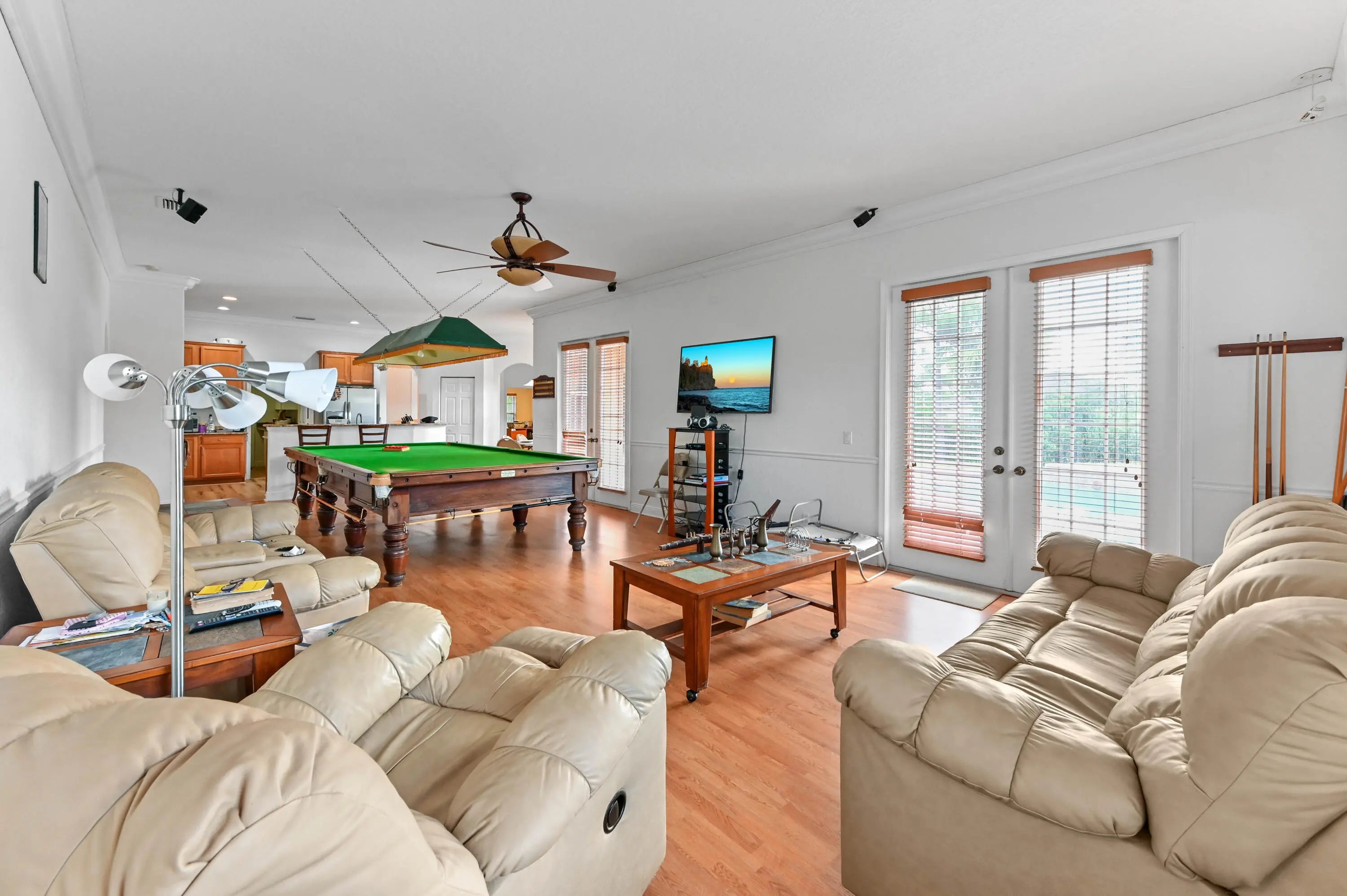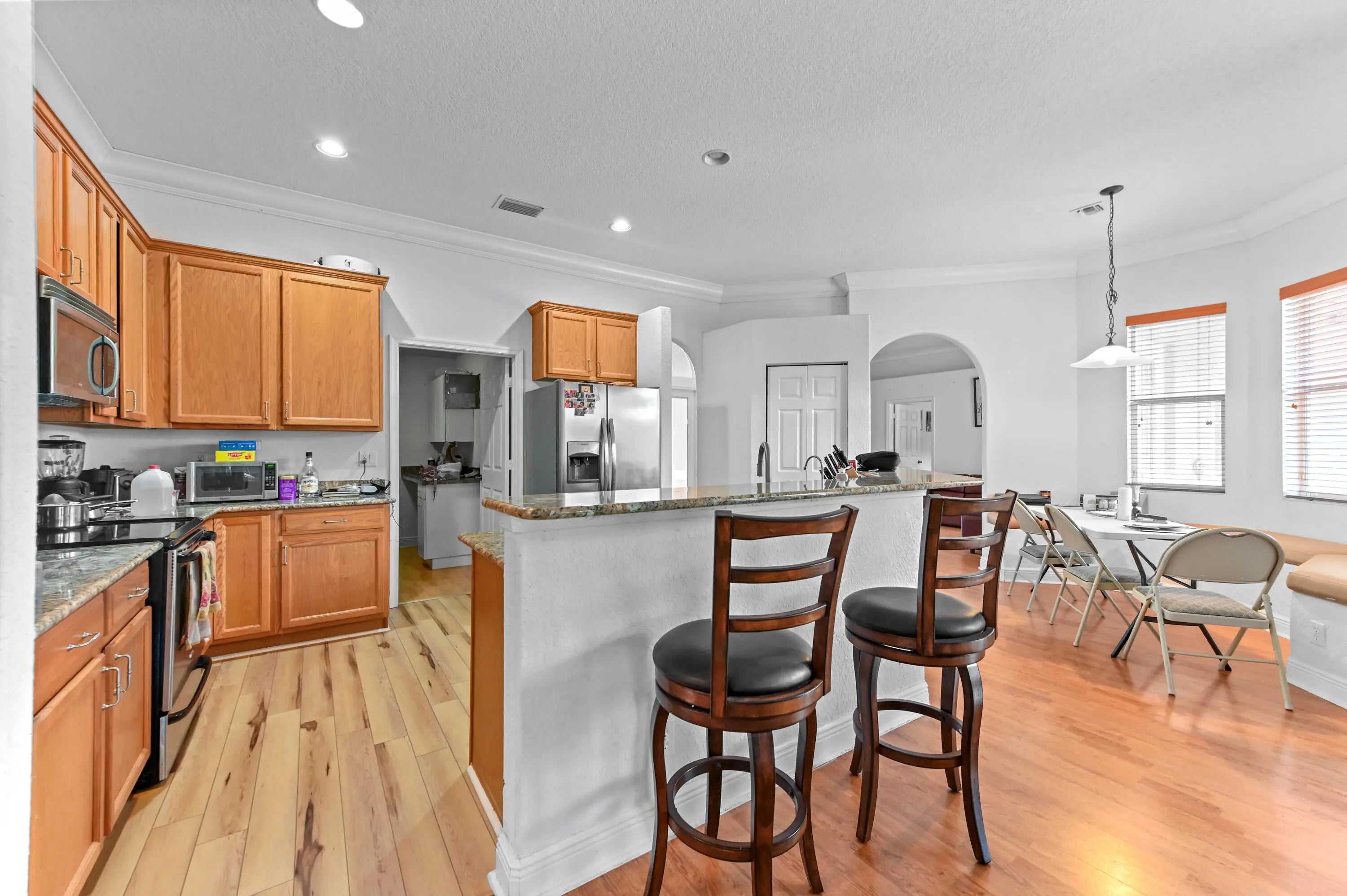 Prepare to be amazed by this truly stunning and feature-rich ranch home, perfectly situated on a fully fenced 1.25-acre canal-front lot in a highly desirable Acreage location. This magnificent property was designed for luxury and comfort, featuring five bedrooms and three baths, all meticulously planned. Step inside to discover a spacious and elegant interior boasting designer features, including knockdown textured walls and ceilings and stylish wood laminate flooring throughout the main areas. The home offers both formal living and dining spaces, complemented by a truly huge family room perfect for large gatherings. The heart of the home is the gourmet kitchen, which features granite counters and a suite of designer appliances. The masterful layout includes a highly sought-after three-way split bedroom plan, ideal for privacy or accommodating an in-law suite. The deluxe master suite is a true sanctuary, boasting a beautiful tray ceiling, an elegant gorgeous bath, and convenient His and Hers closets. Functionality is paramount, with a side-entry garage and a spacious utility room complete with a folding area and laundry tub. This great home is located just minutes from fine shopping, dining and much more!