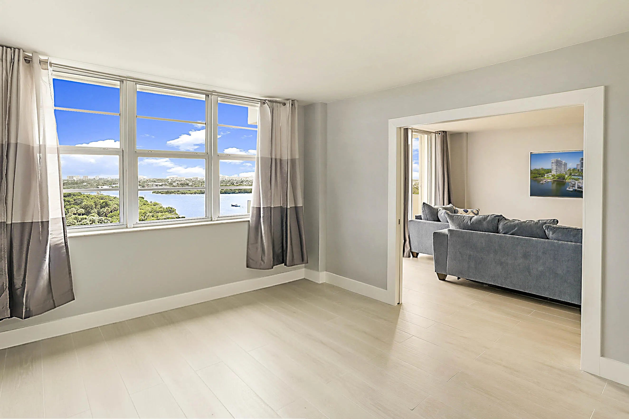 Multi million dollar views from this beautiful one bedrooms condo facing South. This unit has been updated with an open modern kitchen, seating under the bar area, spacious dining and living area. The bedrooms has stylish glass doors for privacy, with a walk in closet and remodeled primary bathrooms. You will admire the views from all the rooms in this condo. This condo sits only steps away from an exclusive private beach gate with outdoor shower, on the magnificent sparkling Atlantic Ocean!!! Boca Towers has recently been remodeled & mechanically updated. Lifestyle amenities include a new lobby, two fitness centers, his & her saunas, community kitchen, and elegant lounge for private parties and entertaining. Additional amenities are library, pool table, ping pong table, game and card rooms, storage for bikes, kayaks, & surfboards. Boat slips are available to rent.There is a 24-hour front desk attendant. The vast pool, and beautifully shaded al fresco picnic area are facing the Intracoastal with views of boats passing by and breathtaking sunsets. Outdoor pleasures include a chef's double grilling station with ambient lighting for evening entertainment. Boat dockage is available for guests to arrive by boat. Close to five star restaurants, great high end stores, golf courses and airports. Concrete restoration and painting has been completed. This unit can be leased seasonally or annually. No smoking and no pets. There is no washer and dryer in the unit, community laundry room on each floor. Concrete restoration work has been completed