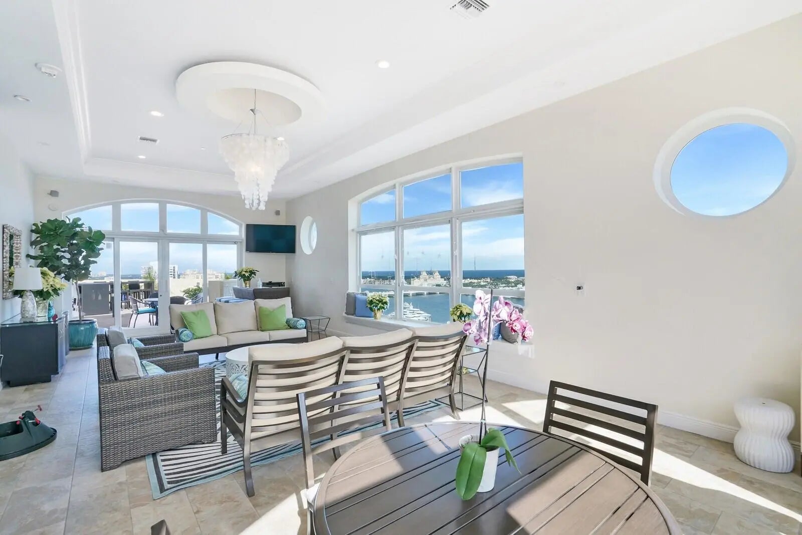 Furnished 2 bedroom 2.5 bath in a Class A Building. 10 ft ceilings, crown molding, che's kitchen with cherry cabinets, granite and stainless steel appliances. Private elevator. Foyer, garden terrace w/whirpool spa, fitness center, club room, 24 hr concierge, valet parking. This property boasts a tropical roof pool & gardens. Sky lounge. Stunning views of Intracoastal each to the ocean & Palm Beach.