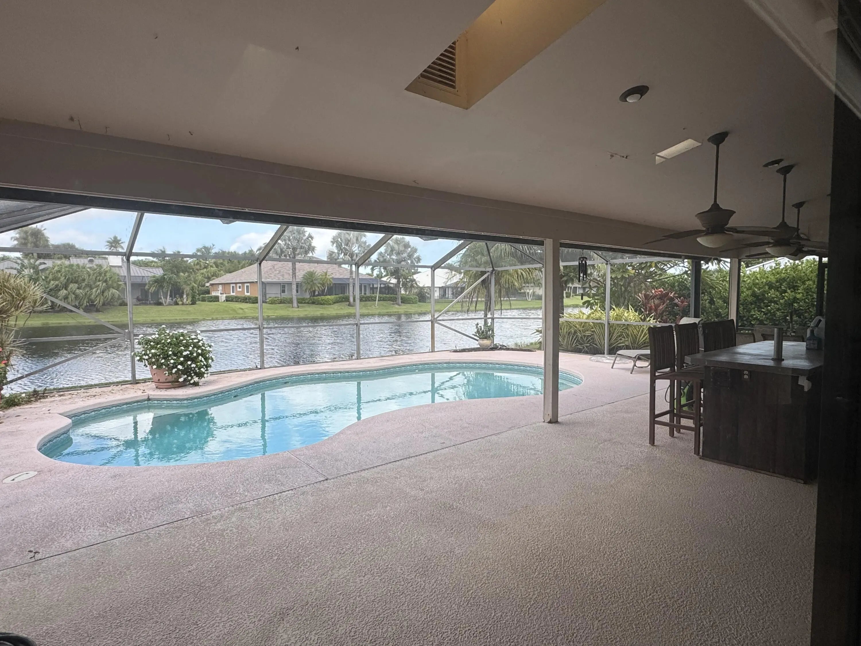 Welcome to this 3-bedroom, 2-bath home featuring a 2-car garage, deeded dock, screened-in pool, and serene lake views. The open, updated kitchen flows seamlessly into the dining and family rooms, enhanced by vaulted ceilings and skylights for an airy, light-filled feel. The spacious master suite offers a separate shower, relaxing soaking tub, and dual vanities. Perfect for entertaining or unwinding by the pool in your private oasis. Roof replaced 2023. Furniture is negotiable—move right in and start enjoying Florida living at its finest. Hurry, come see this beauty today—she won't last!