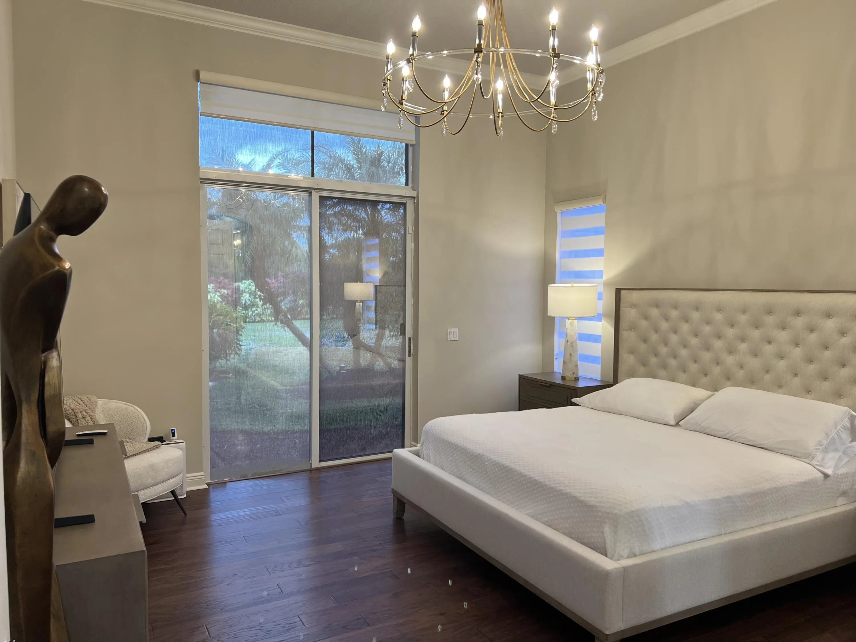 Exquisite 2 Bdrm. + Den, home features 12-foot ceilings w/crown molding, elegant wood floors, and porcelain tile. The gourmet kitchen boasts stainless-steel double oven with convection, induction glass cook-top, wine cooler. Recent updates include interior and exterior paint, electric & manual window treatments, recess lighting, chandeliers and ceiling fans, door hardware and screened-in patio. The 760 sq. ft. garage has epoxy flooring. The premium lot offers stunning golf views and ample space for a custom pool. The non-mandatory club has been newly remodeled. The back of the home offers breathtaking views of the golf course. Additionally, the house is equipped with partial accordion and electric hurricane shutters.