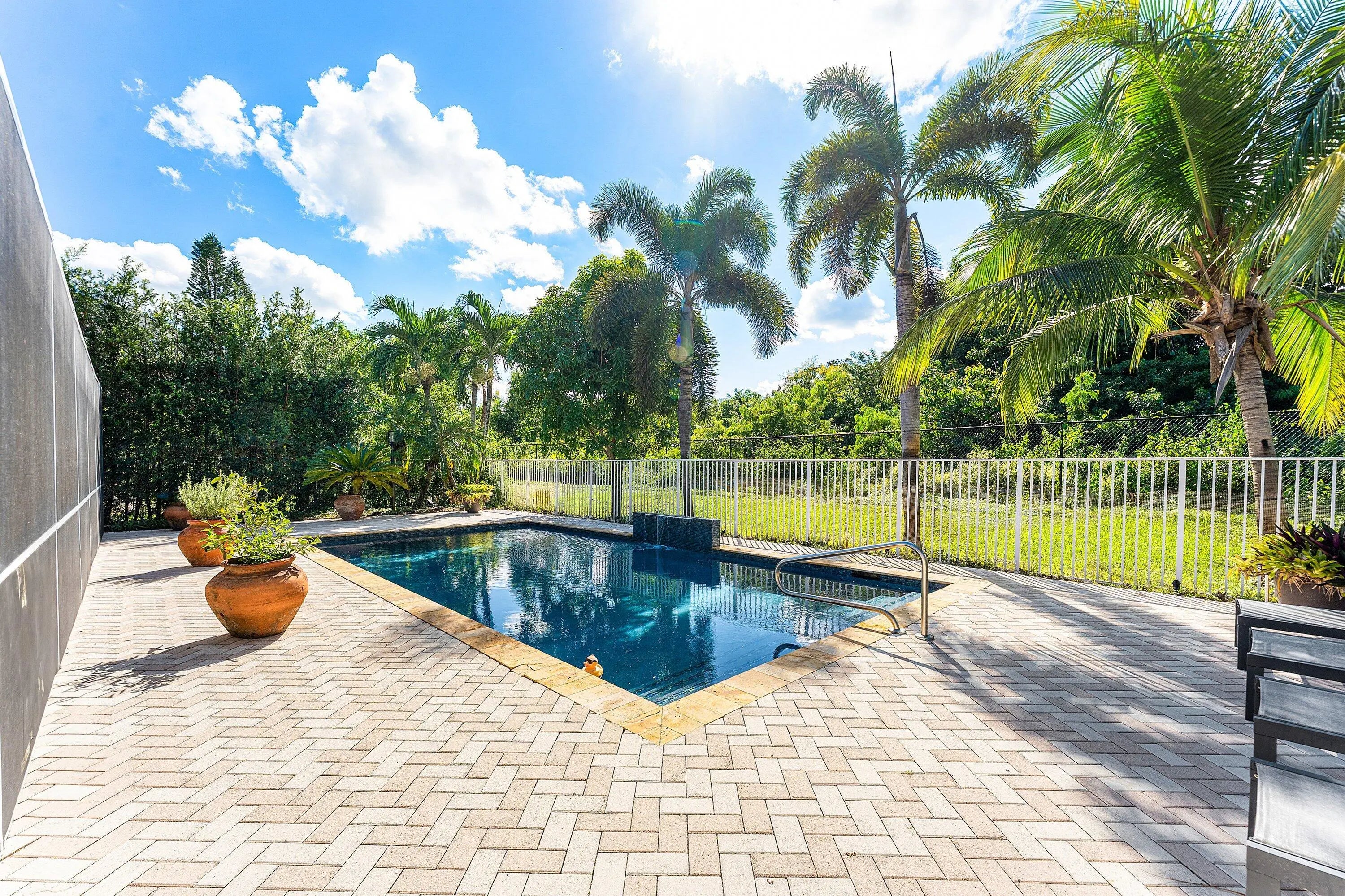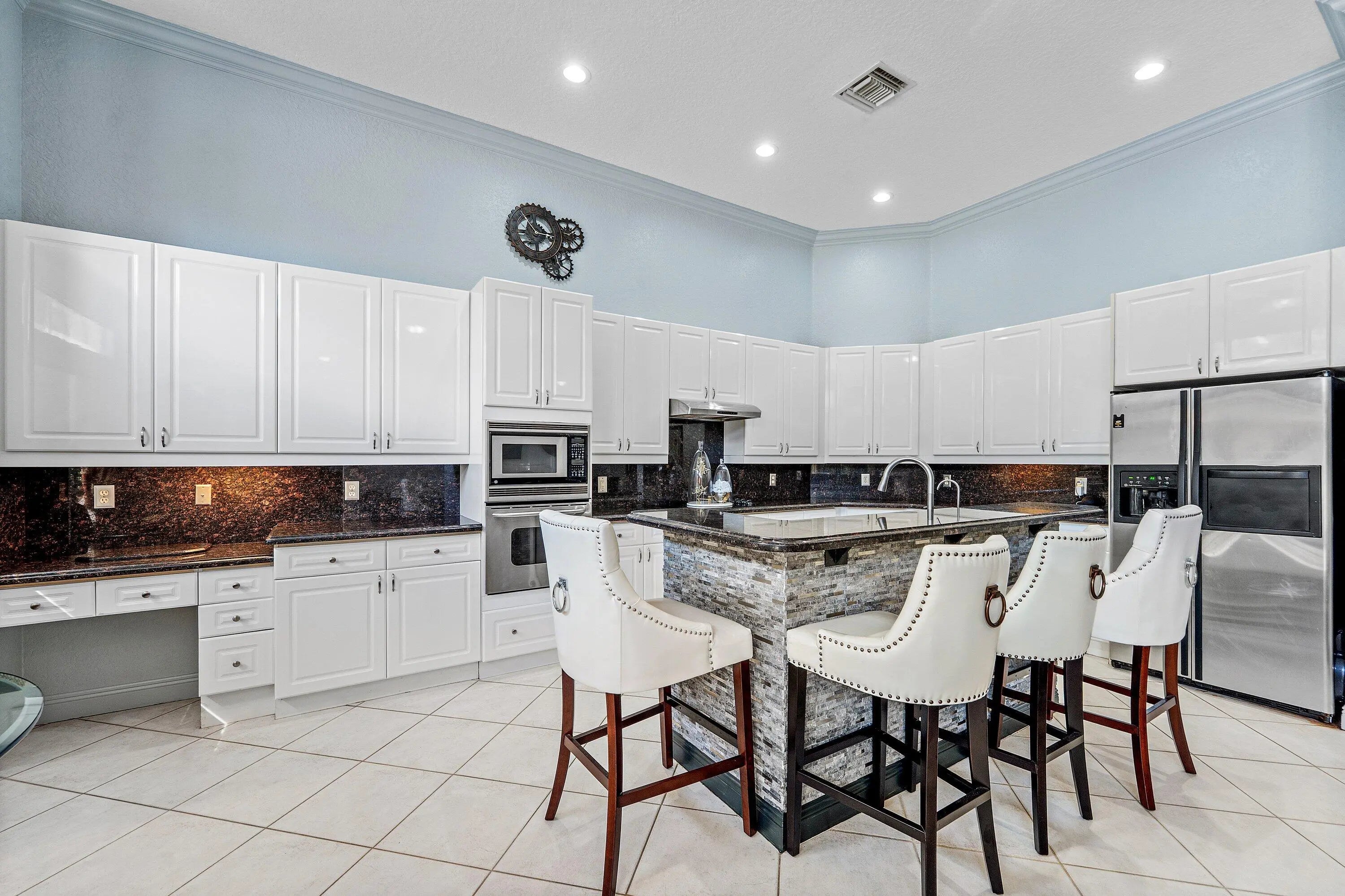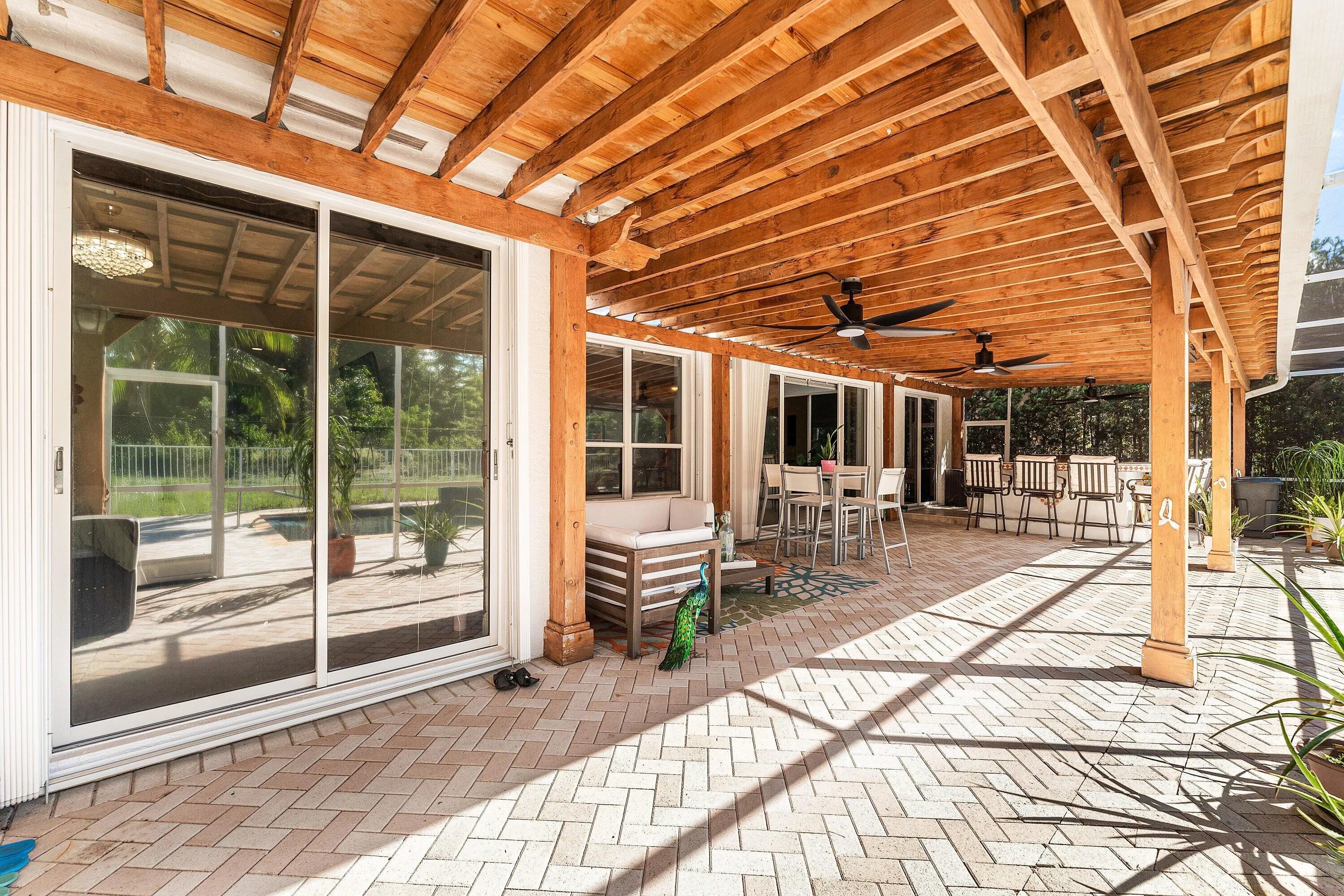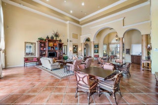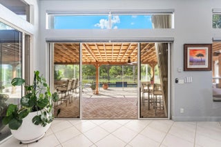 Rare exceptional single-story estate with private pool and yard. Unique entertainers paradise had an add'l 400sf of space added to the floor plan and includes a full cabana bath to the pool area. Total of 4 bedrooms, 4.5 bathrooms, 2 kitchens, 3-car garage! Added space currently used as a gourmet kitchen, can easily be converted to any use such as a large guest room. Enormous pergola covered patio with built-in bar can be turned into full summer kitchen experience. Roof 2022, water heater 2023, color changing landscape lighting 2023, pool resurface 2020, HVAC 2020, saltwater heated pool, central vacuum, well-water irrigation, whole-house water filtration system w/reverse osmosis, outdoor sound system, recessed speakers, intercom system. Solar system installed 2022; avg electric bill $30! Hurricane impact garage door installed 2023. Complete Accordion hurricane shutters & partial impact sliders. Mostly tile floors. HOA includes cable and internet.