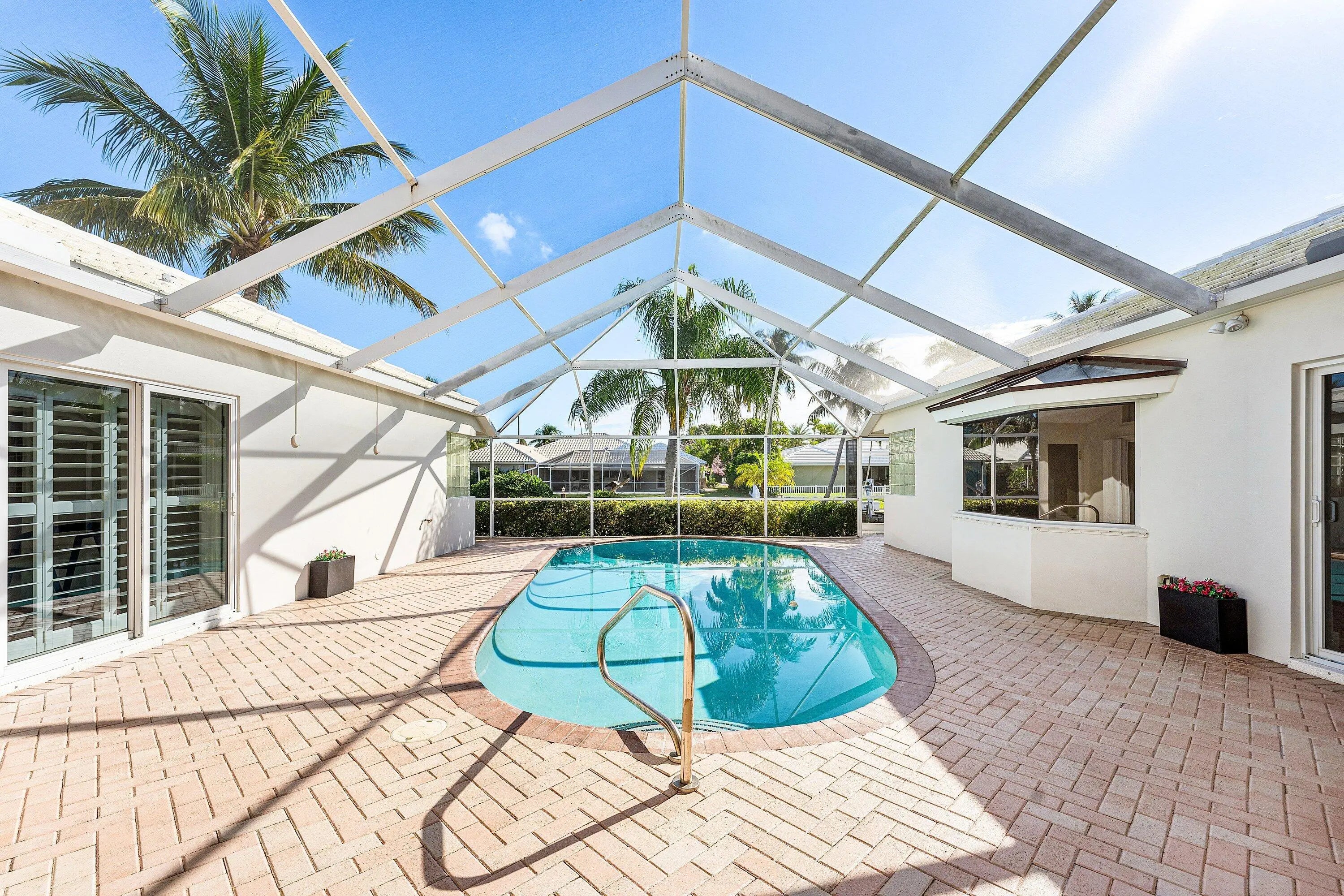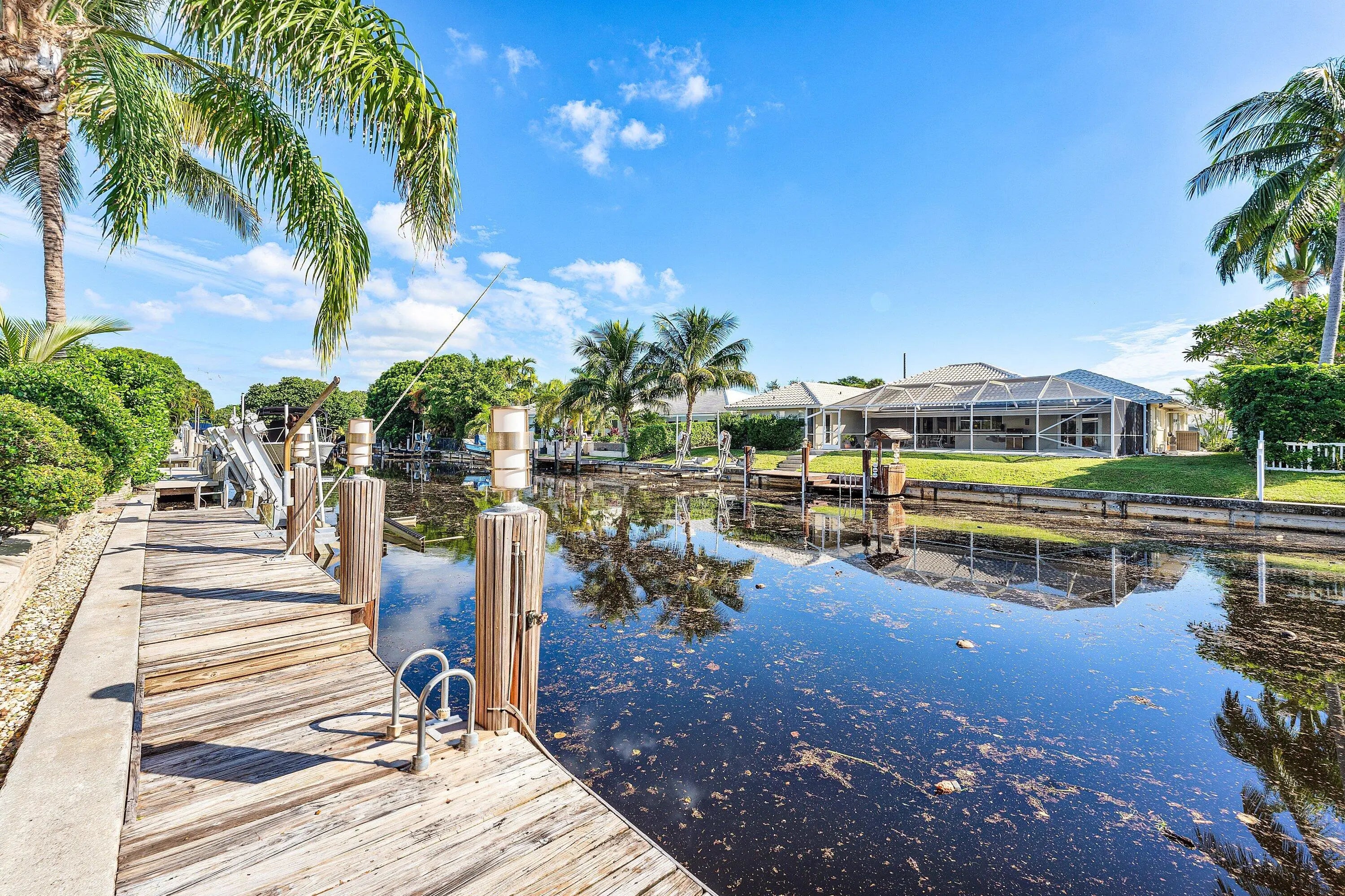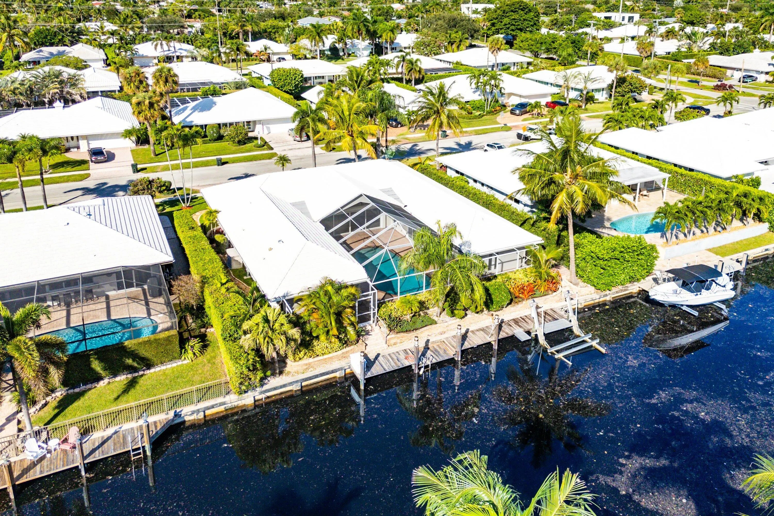 A rare, newly renovated sought-after Camino Gardens waterfront residence with 85± ft of frontage and ocean access. Features include a new kitchen and baths, sleek marble floors, vaulted-ceiling living room, contemporary chef's kitchen with island and casual dining, plus a versatile office/guest suite/gym. The primary suite offers pool access, a spa bath with freestanding tub, curbless shower, and custom closet. Two guest bedrooms have walk-ins. Outdoor living shines with a screened lanai, saltwater pool, and dock with lift and dual ramps. Additional perks: Wi-Fi irrigation, 2-bay garage with EV charger, and newer roof. Ideally close to Mizner Park, dining, beaches, and A-rated schools. A rare newly renovated sought-after Camino Gardens Waterfront Residence sitting on 85+/- feet of waterfrontage. It features new kitchen, new bathrooms, natural travertine floors, and recessed lighting throughout, creating a luxurious ambiance. This residence boasts an open and expansive living room with a vaulted ceiling facing the pool. Adjacent is the gourmet kitchen featuring contemporary kitchen and a chef's island with a casual dining area. An office next to the kitchen can be used as a multi-function room, a guest bedroom/office/gym, etc. The luxurious primary suite has a triple slider and an enlarged bathroom, standing tub, curbless walk-in shower with a designer closet. In addition, there are two guest bedrooms with walk-in closets. The resort-like pool with lanai is screened. Other amenities include Wi-Fi irrigation, 2-bay garage with high-speed electric car charger outlet inside garage, newly updated saltwater pool, new AC, a dock with a boat lift equipped with dual walking ramps, and a 2019 roof. Ideally situated close to Boca Raton's Mizner Park, offering world-class shopping, dining, Boca's pristine beaches, and an A rated school district. Shown by appointments only.