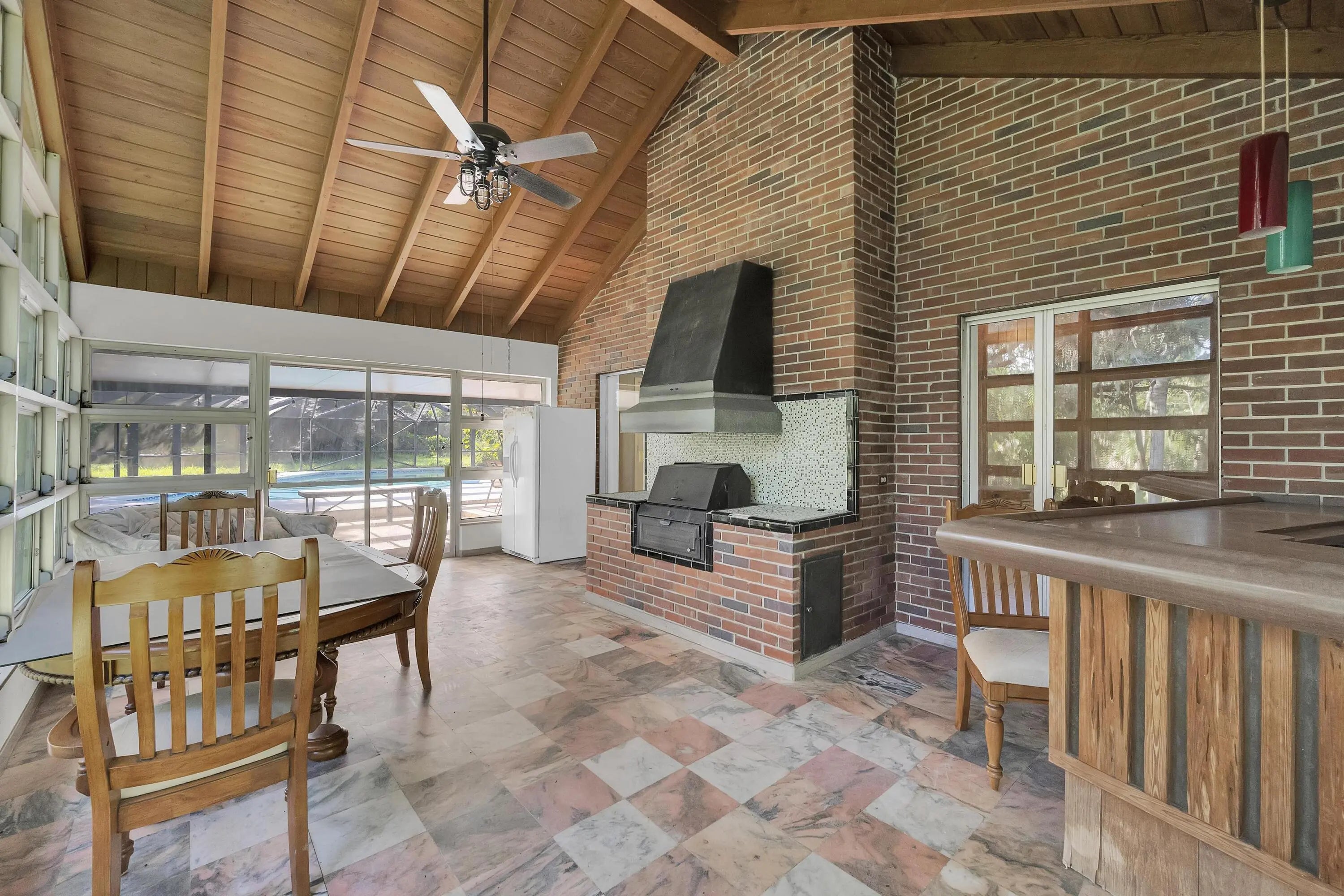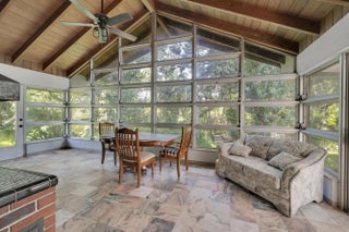 13.7-acre Old Florida property featuring a 3-bedroom, 3-bath CBS pool home, a separate in-law suite rented independently, and a Quonset hut rented separately on site. The main home offers a metal roof, tile flooring, spacious living areas, and multiple flex rooms for office, storage, or hobby use. The kitchen includes abundant cabinetry, stainless steel appliances, and a passthrough to the dining area. Vaulted wood ceilings, exposed beams, and a wood-burning fireplace highlight the living room. An enclosed Florida room overlooks the screened pool and lush surroundings. Exterior features include a covered patio, mature trees, and expansive yard space. Located east of I-95 with privacy and convenient access to shopping and major routes.