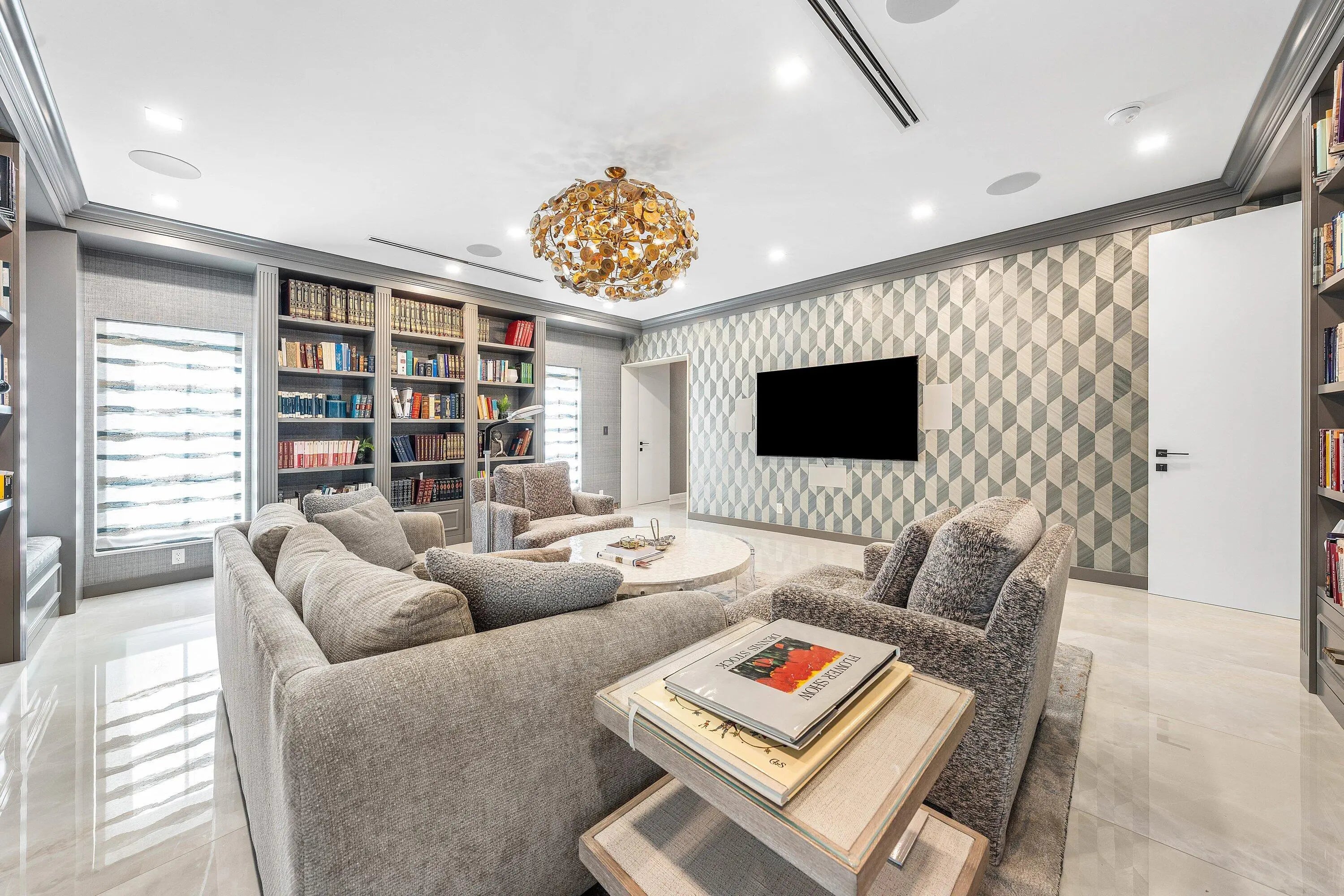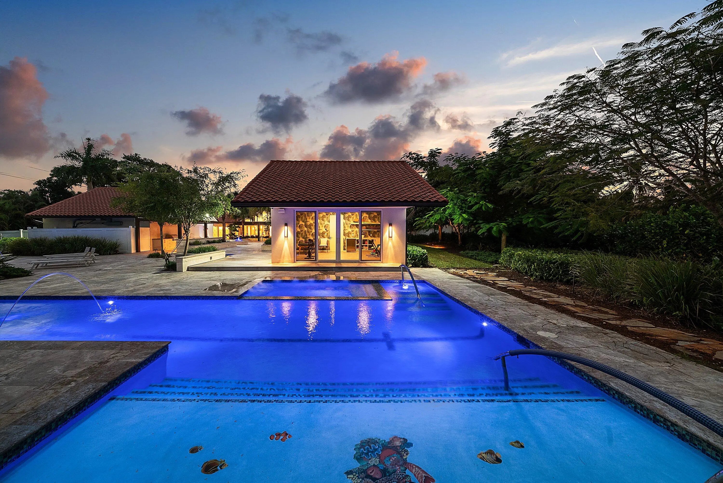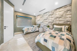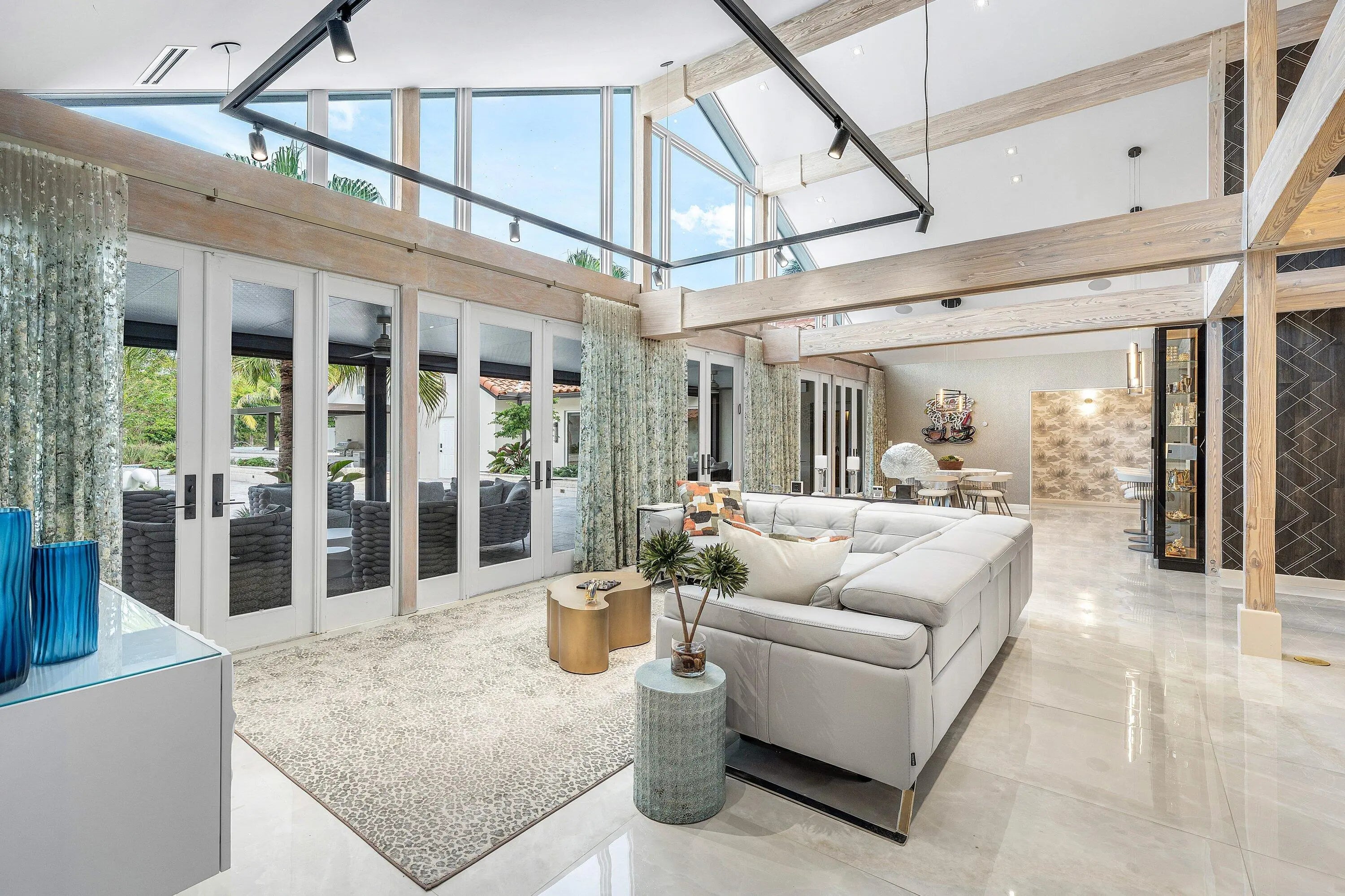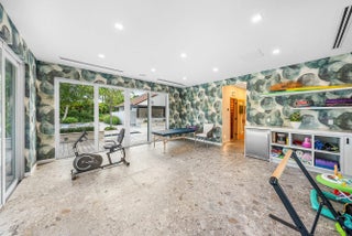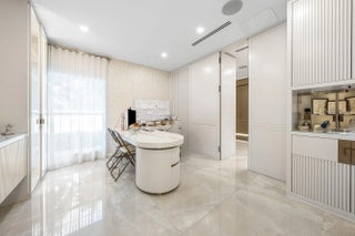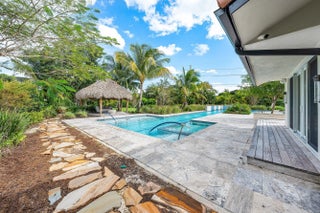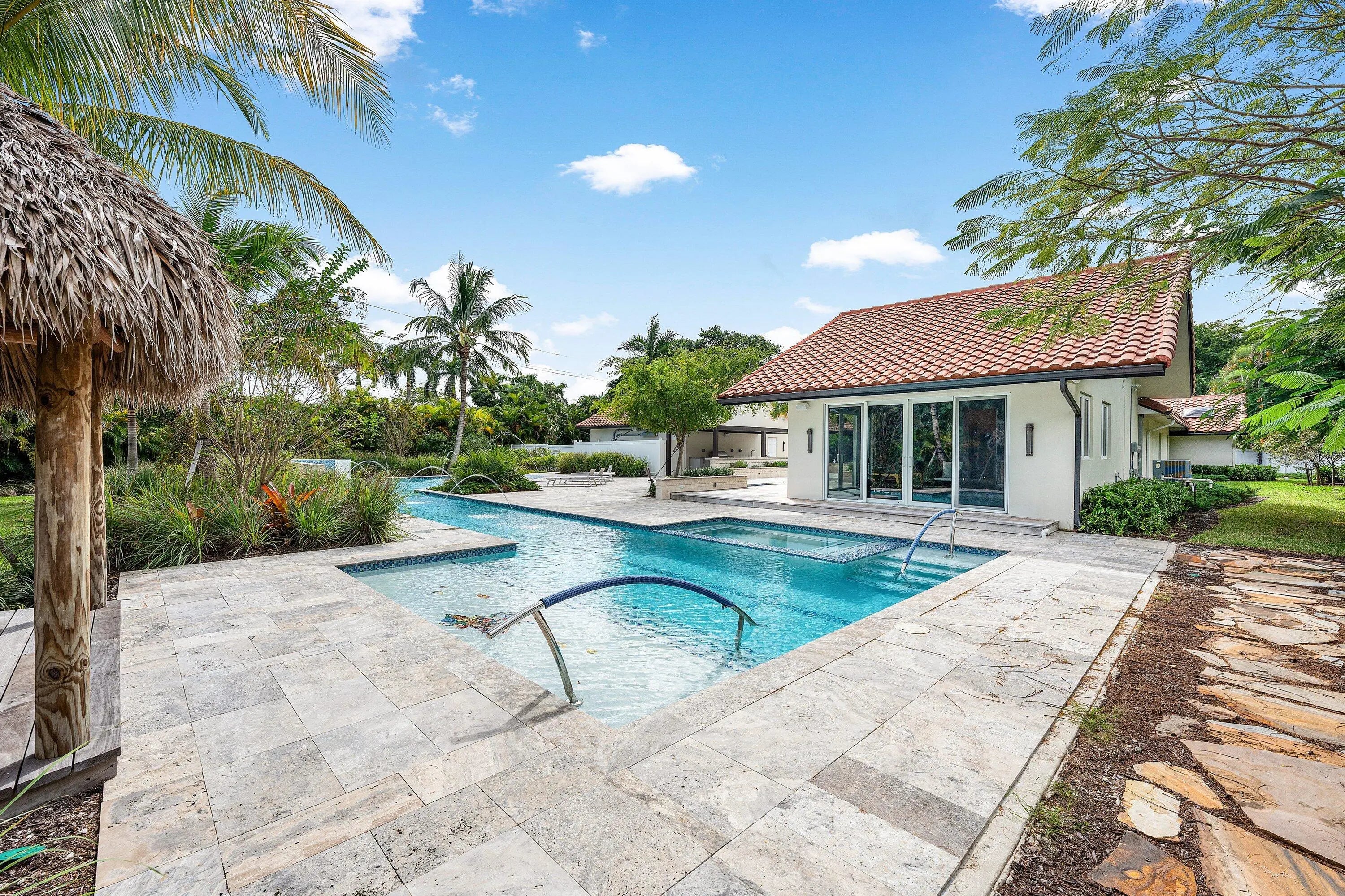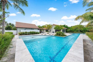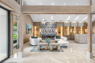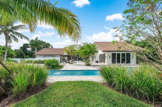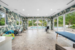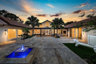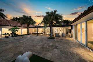 Contemporary Boca Raton Masterpiece with private 82-foot Olympic-like Heated Saltwater Pool and Spa and Impressive Decorative Stone Courtyard with Waterfall Features Throughout. A Tiki-Hut lounge-area and massive backyard complete the property. Welcome to a realm of unparalleled luxury at 6641 Giralda Circle in central Boca, a stunning 5-bedroom, 6.5-bathroom newly renovated and expanded from 2022-2023 on an incredible 1.55 acre lot with the finest craftsmanship and imported finishes throughout. Sleek lines and bespoke European finishes permeate every inch of this captivating single-story, 5,990-square-foot under-air residence with 8,146 total square-feet. Ornate A-frame ceiling details add a unique warm grandeur with custom wood and stone wall coverings that infuse warmth and style into the living spaces. The home was designed for grand entertaining - a bar with its own fridge, sink and ice machine, expansive flow between indoor and outdoor areas, and an open layout that can easily accommodate over 100 guests in comfort and style. A stunning statement, the 8-foot-tall pivot front-entry door, locally crafted from steel and glass to provide a grand yet minimalist entrance enhancing security and peace of mind. An airy foyer with sublime exposed architectural, white-washed wood-beams provides an awe-inspiring living area with volume vaulted ceilings, breathtaking decorative walls with a linear fireplace, additional cabinetry space, full bar complete with chandeliers. The open kitchen and dining area flows onto a private outdoor space overlooking the courtyard, waterfalls, and pool. Elegant and expansive, designed for both relaxation and entertainment. The kitchen was crafted entirely in Porcelain, both the countertops and backsplash are heat-resistant, non-porous, and virtually indestructible. The surfaces are elegant yet highly functional - a combination of sleek Italian design and bulletproof durability. The kitchen has an eat-in peninsula, custom Italian cabinetry, and high-end appliances such as Wolf and Sub-zero. Every surface flows effortlessly, with the design emphasizing minimalism, precision, and harmony between function and form. All kitchen and service-area appliances are top-tier European brands, fully integrated into the cabinetry creating a completely streamlined and sophisticated look to maintain a sleek aesthetic. The adjacent media or club room has gorgeous finished walls, a flat-screen TV and open cabinet shelving for the library touch. The library and all closets throughout the home were custom fabricated in the United States designed and detailed by J.Mark Interiors for both visual impact and long-term performance. Art and decor was personally curated by J. MARK Interiors, sourced from international galleries and bespoke artisans to create a layered, collected feel - refined yet deeply personal. All window treatments are custom-made by J.Mark workrooms, with fabrics flown in from Italy. The designs combine functionality with soft elegance, enhancing the home's architectural lines. The closets and the living and dining millwork were custom-made in Portugal, where artisanal woodworking traditions meet modern precision. Every piece was handcrafted, finished to perfection, and shipped to the U.S. exclusively for this residence. Every fabric and wall covering in the home was imported from Romo Fabrics and Wallpapers in Italy, known for their couture-quality textures and exceptional craftsmanship. Each selection was made to enhance the mood of the space, using rich weaves, silks, and refined patterns that bring warmth and depth to every room. The main office walls are finished in genuine mother-of-pearl, individually hand-applied to catch the light and create a subtle, iridescent glow - a true statement of sophistication. The oversized primary suite features a large encompassing open walk-in closet complete with multiple safes for His and Hers. Impressive Master bedroom facing the courtyard includes a retractable flat-screen television that opens from the ceiling. Full His and Her bathrooms, each one with its own identity and design. Her bathroom features a smart toilet and a tiled ceiling, bringing spa-like refinement into everyday living. The master bathroom is graced with warm and soothing stone accents, and a two-person walk-in shower. All secondary bedrooms have ample closet space and full en-suite bathrooms with Italian cabinetry. Each vanity was custom-made locally, designed to complement the architectural language of the house, with precise attention to proportion and material detailing. Every fixture and surface was selected for both comfort and style. The lighting program combines architectural lighting from Italy with carefully curated decorative pieces. The balance of function and ambience was a key design element - every fixture was chosen for both its beauty and quality of light. Custom solid-core doors, locally made in the United States, selected for soundproofing, proportion, and a clean, substantial feel. Porcelain tile floors throughout for a clean aesthetic, durability, and practicality that require no polishing or maintenance and maintains its finish indefinitely. The tones and layout were selected to create a seamless, timeless foundation throughout the home. The cedar closet constructed entirely of solid cedar, provides natural preservation and a rich, warm scent - both functional and beautifully luxurious. Large laundry room with a washer and dryer, sink-tub for convenience and additional storage space. Home has a complete Vitrea Smart Home system with glass plates, each one customized to the specific light point for effortless access and control. It's an ultra-modern, luxury-grade automation system that manages lighting, HVAC, and shading with precision and elegance; residents have seamless remote control of mood adjustable cove lighting, security alarm system, pool and spa, and audio-visual systems through two in-wall touch-screen pads. Full Cat 6 wiri