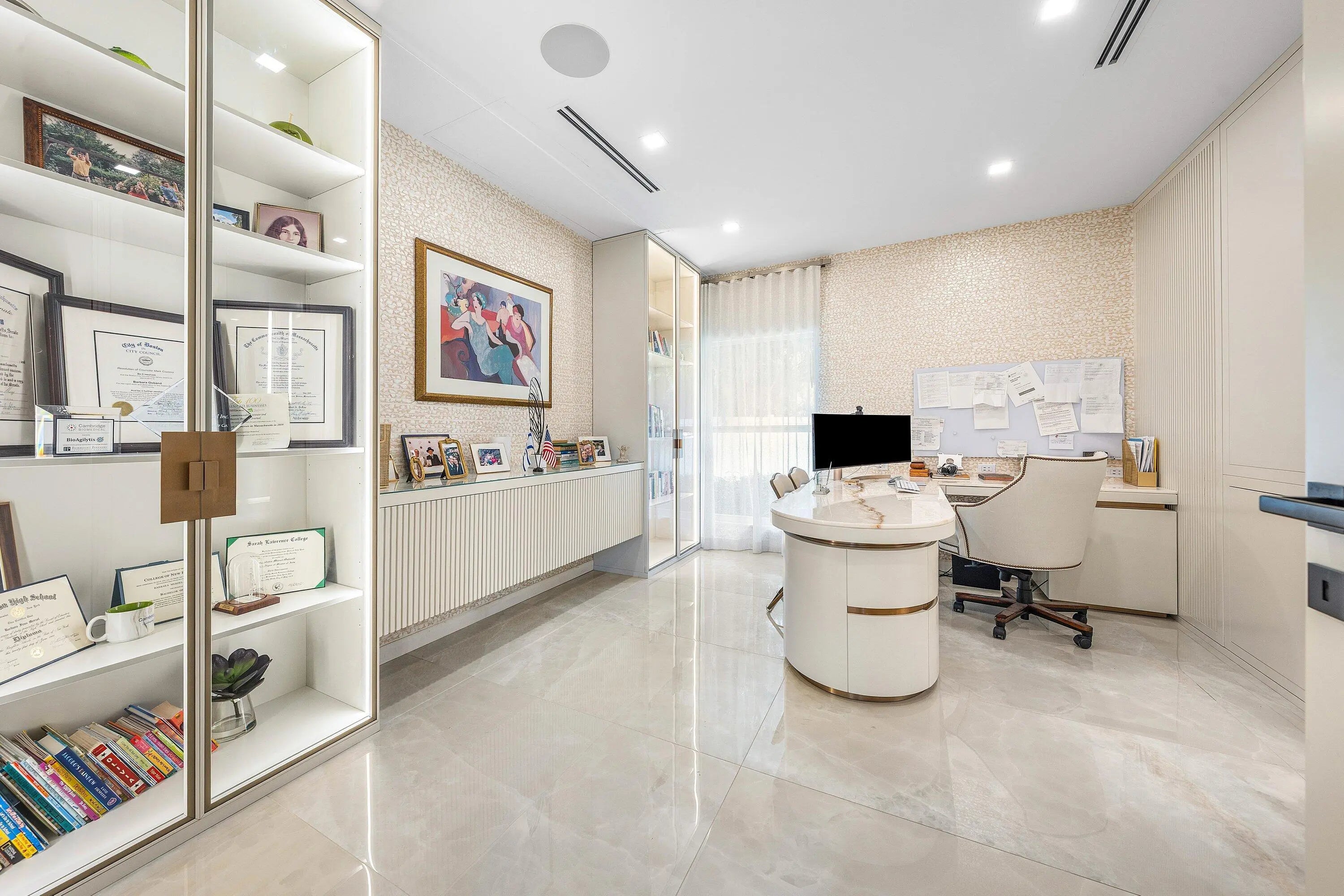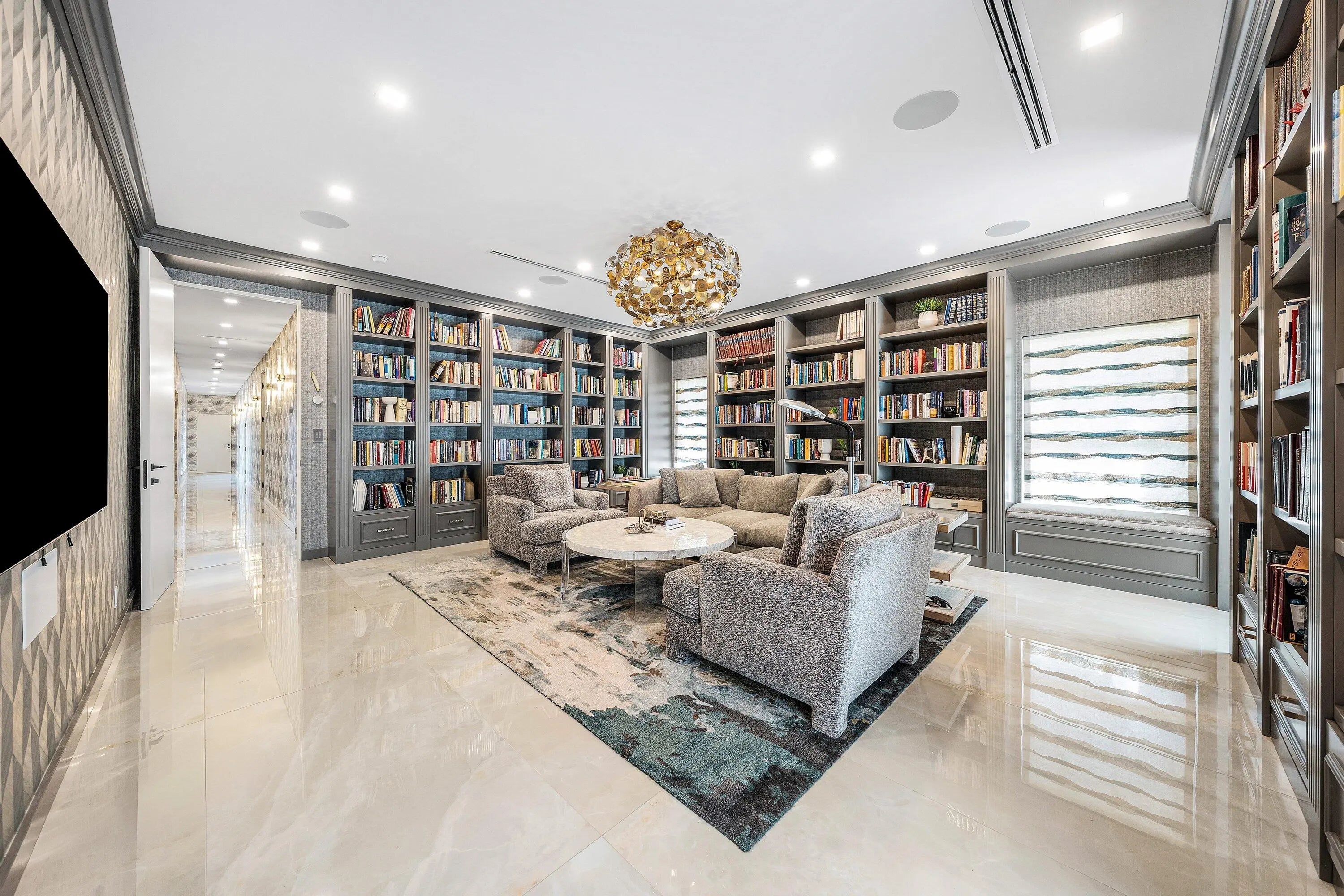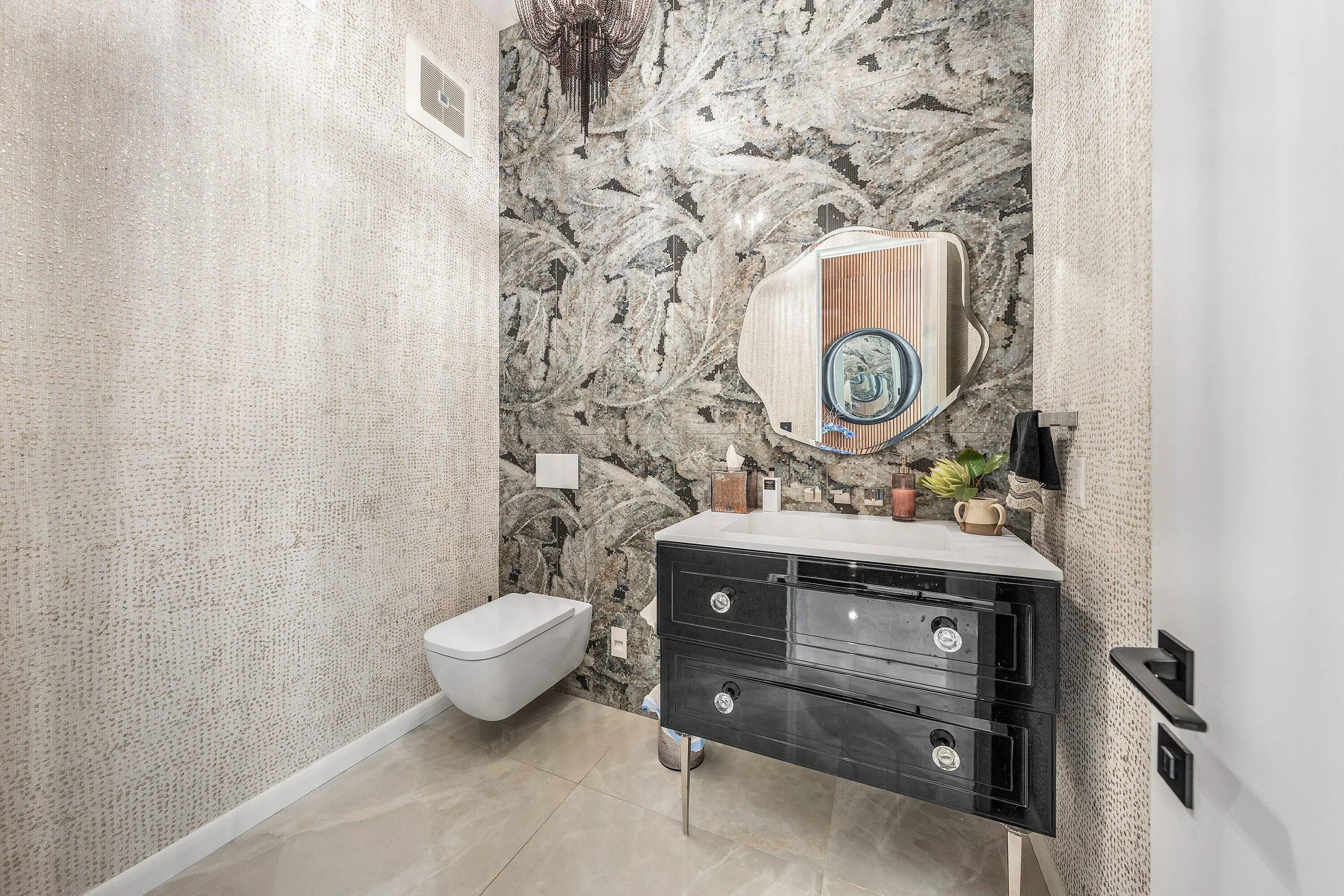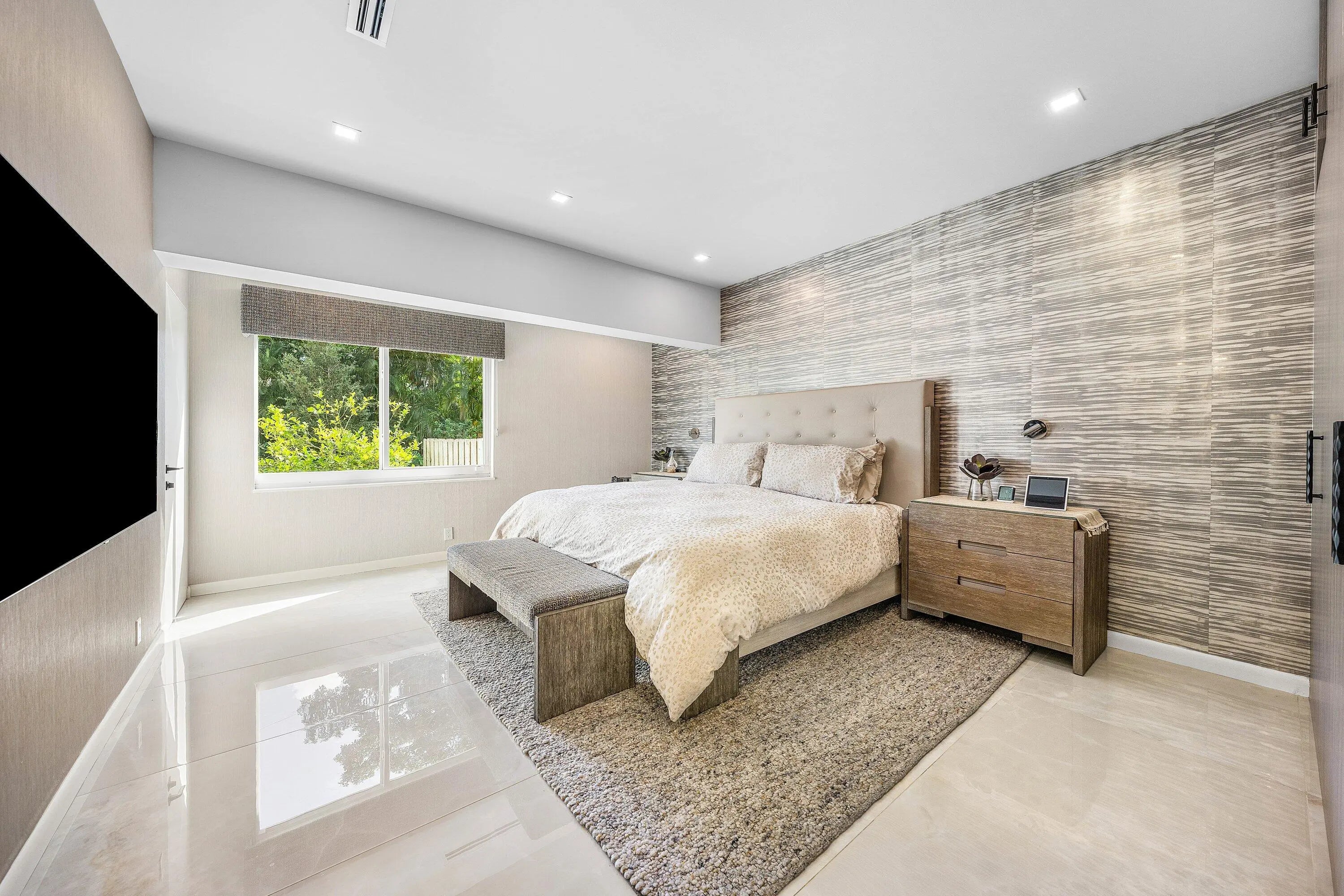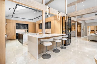 Contemporary Boca Raton Masterpiece with private 82-foot Olympic-like Heated Saltwater Pool and Spa and Impressive Decorative Stone Courtyard with Waterfall Features Throughout. A Tiki-Hut lounge-area and massive backyard complete the property. Welcome to a realm of unparalleled luxury at 6641 Giralda Circle in central Boca, a stunning 5-bedroom, 6.5-bathroom newly renovated and expanded from 2022-2023 on an incredible 1.55 acre lot with the finest craftsmanship and imported finishes throughout. Sleek lines and bespoke European finishes permeate every inch of this captivating single-story, 5,990-square-foot under-air residence with 8,146 total square-feet. Ornate A-frame ceiling details add a unique warm grandeur with custom wood and stone wall coverings that infuse warmth and style into the living spaces. The home was designed for grand entertaining - a bar with its own fridge, sink and ice machine, expansive flow between indoor and outdoor areas, and an open layout that can easily accommodate over 100 guests in comfort and style. A stunning statement, the 8-foot-tall pivot front-entry door, locally crafted from steel and glass to provide a grand yet minimalist entrance enhancing security and peace of mind. An airy foyer with sublime exposed architectural, white-washed wood-beams provides an awe-inspiring living area with volume vaulted ceilings, breathtaking decorative walls with a linear fireplace, additional cabinetry space, full bar complete with chandeliers. The open kitchen and dining area flows onto a private outdoor space overlooking the courtyard, waterfalls, and pool. Elegant and expansive, designed for both relaxation and entertainment. The kitchen was crafted entirely in Porcelain, both the countertops and backsplash are heat-resistant, non-porous, and virtually indestructible. The surfaces are elegant yet highly functional - a combination of sleek Italian design and bulletproof durability. The kitchen has an eat-in peninsula, custom Italian cabinetry, and high-end appliances such as Wolf and Sub-zero. Every surface flows effortlessly, with the design emphasizing minimalism, precision, and harmony between function and form. All kitchen and service-area appliances are top-tier European brands, fully integrated into the cabinetry creating a completely streamlined and sophisticated look to maintain a sleek aesthetic. The adjacent media or club room has gorgeous finished walls, a flat-screen TV and open cabinet shelving for the library touch. The library and all closets throughout the home were custom fabricated in the United States designed and detailed by J.Mark Interiors for both visual impact and long-term performance. Art and decor was personally curated by J. MARK Interiors, sourced from international galleries and bespoke artisans to create a layered, collected feel - refined yet deeply personal. All window treatments are custom-made by J.Mark workrooms, with fabrics flown in from Italy. The designs combine functionality with soft elegance, enhancing the home's architectural lines. The closets and the living and dining millwork were custom-made in Portugal, where artisanal woodworking traditions meet modern precision. Every piece was handcrafted, finished to perfection, and shipped to the U.S. exclusively for this residence. Every fabric and wall covering in the home was imported from Romo Fabrics and Wallpapers in Italy, known for their couture-quality textures and exceptional craftsmanship. Each selection was made to enhance the mood of the space, using rich weaves, silks, and refined patterns that bring warmth and depth to every room. The main office walls are finished in genuine mother-of-pearl, individually hand-applied to catch the light and create a subtle, iridescent glow - a true statement of sophistication. The oversized primary suite features a large encompassing open walk-in closet complete with multiple safes for His and Hers. Impressive Master bedroom facing the courtyard includes a retractable flat-screen television that opens from the ceiling. Full His and Her bathrooms, each one with its own identity and design. Her bathroom features a smart toilet and a tiled ceiling, bringing spa-like refinement into everyday living. The master bathroom is graced with warm and soothing stone accents, and a two-person walk-in shower. All secondary bedrooms have ample closet space and full en-suite bathrooms with Italian cabinetry. Each vanity was custom-made locally, designed to complement the architectural language of the house, with precise attention to proportion and material detailing. Every fixture and surface was selected for both comfort and style. The lighting program combines architectural lighting from Italy with carefully curated decorative pieces. The balance of function and ambience was a key design element - every fixture was chosen for both its beauty and quality of light. Custom solid-core doors, locally made in the United States, selected for soundproofing, proportion, and a clean, substantial feel. Porcelain tile floors throughout for a clean aesthetic, durability, and practicality that require no polishing or maintenance and maintains its finish indefinitely. The tones and layout were selected to create a seamless, timeless foundation throughout the home. The cedar closet constructed entirely of solid cedar, provides natural preservation and a rich, warm scent - both functional and beautifully luxurious. Large laundry room with a washer and dryer, sink-tub for convenience and additional storage space. Home has a complete Vitrea Smart Home system with glass plates, each one customized to the specific light point for effortless access and control. It's an ultra-modern, luxury-grade automation system that manages lighting, HVAC, and shading with precision and elegance; residents have seamless remote control of mood adjustable cove lighting, security alarm system, pool and spa, and audio-visual systems through two in-wall touch-screen pads. Full Cat 6 wiri
