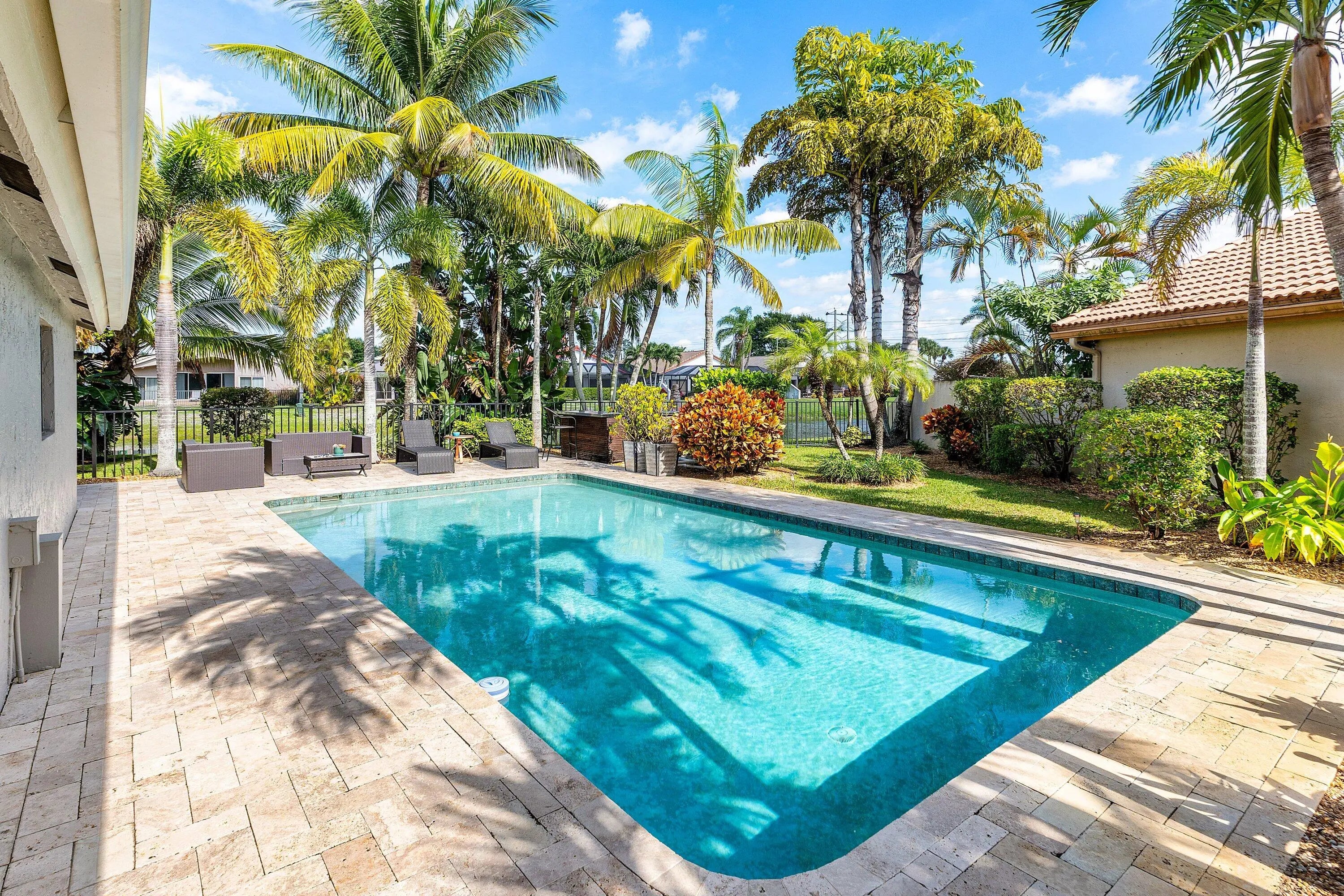 Rare opportunity to own one of the prime patio lots in Boca Woods, approximately 30% larger than most Patio homes located on the premier point of the cul-de-sac. The den is easily converted to a 3rd bedroom. This unique property features a fenced, resort-style backyard with lush landscape and beautiful palms, offering complete privacy and a true tropical escape. Enjoy expansive lake views and watch them Tee off on partial golf views. Boca Woods boasts one of the best hole-to-home ratios for golfers, providing easy access and exceptional playability. There is NO WAITING list for golf! ''The Woods'' course was recently redesigned by Rees Jones, and ''The Lakes'' course is equally beautiful—challenging or forgiving, depending on how you choose to play it. The Fitness/Spa/PT Center, completed just three years ago, is state-of-the-art, offering trainers, classes, Pilates reformers, and multiple studio programs. The clubhouse features two restaurants, bars, card rooms, and game rooms for endless social enjoyment. Golfers will love the top-tier practice facility with Top Tracer on the driving range, excellent clinics, a highly regarded professional staff, and plenty of opportunities to find games with players at your level. Racquet sports are exceptional, featuring 4 pickleball courts and 7 Har-Tru tennis courts, all supported by professional instruction, inter-club play, and a full calendar of social events. This property blends privacy, views, amenities, and an unmatched golf lifestyle truly one of Boca Woods' finest offerings.