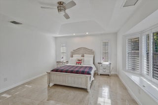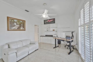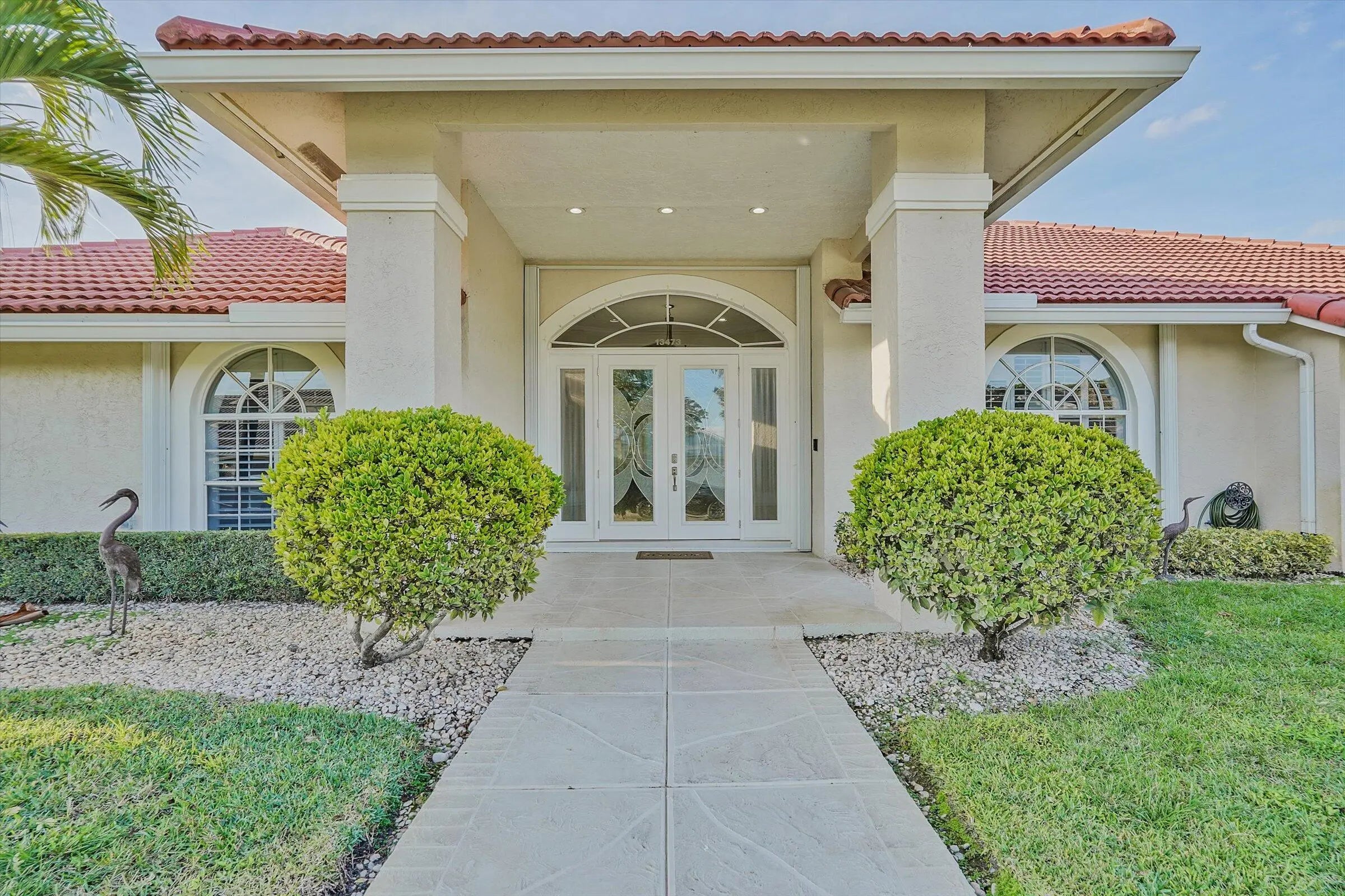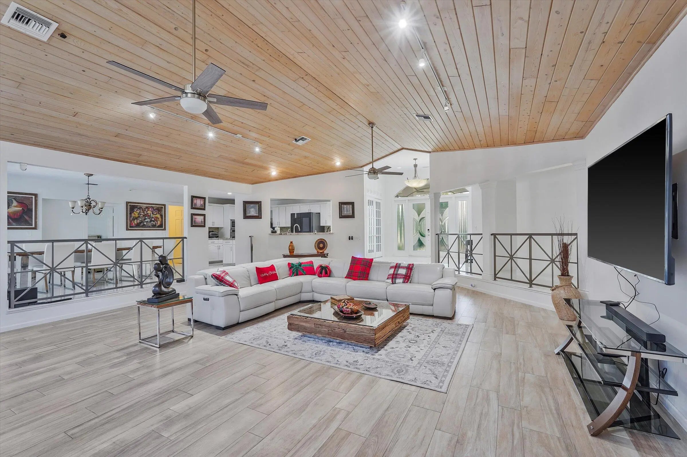 NO HOA! Beautifully upgraded custom home built for entertaining on a private 1/3-acre lot. Clay tile roof replaced in 2019, professionally inspected and maintained by ShakeMasters. Upgraded entrance doors and driveway lead to a double-door foyer opening into a spectacular 27×25 great room featuring knotty pine vaulted ceilings, clerestory windows, motorized blinds, and faux wood shutters throughout the home. Pocket sliding glass doors create an impressive 16-foot opening to the custom resort-style 20×40 pool, recently upgraded with new plaster, a saltwater system, and solar pool heater, all enclosed by a screened patio. Lush landscaping, fencing, and full accordion hurricane shutters provide privacy and peace of mind. The kitchen is designed for both function and style, featuring quality wood cabinetry, gorgeous granite countertops, a convertible island with mounted range hood, and updated finishes. New flooring throughout the entrance, hallways, kitchen, dining room, and laundry room (2024) complements the home's modern aesthetic, along with fresh interior paint (2024). The home offers fully updated bathrooms, including a third bathroom remodeled in 2024, upgraded guest bath, and custom closets in all bedrooms. Additional improvements include garage flooring, new HE AC units, and a new water heater. French doors off the foyer open to a 16×14 den, ideal for a home office or flex space. Located in a highly desirable community, just a short walk to a beautiful lakefront park with picnic areas, playground, swings, and lake access, and zoned for A-rated schools.