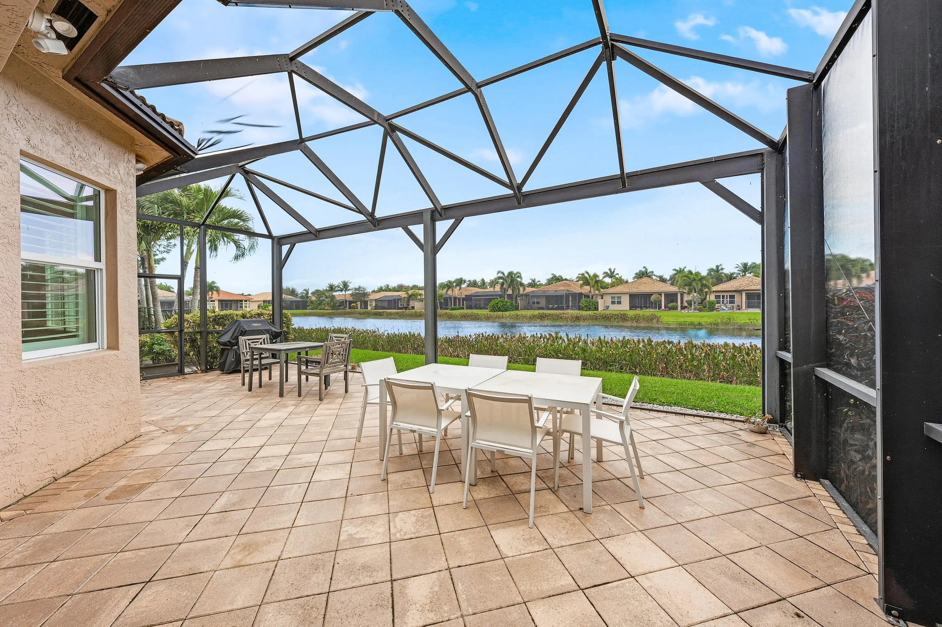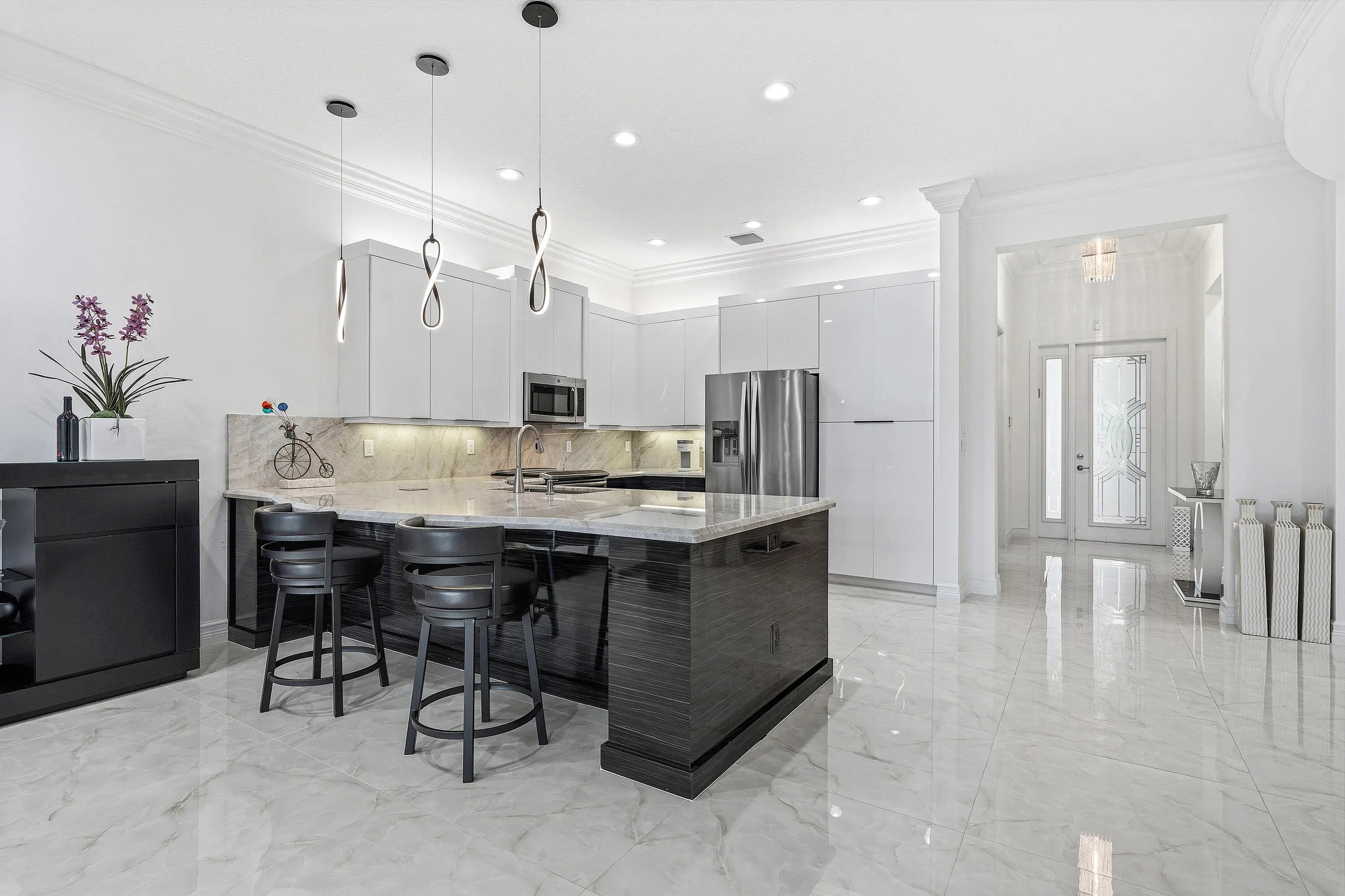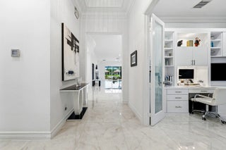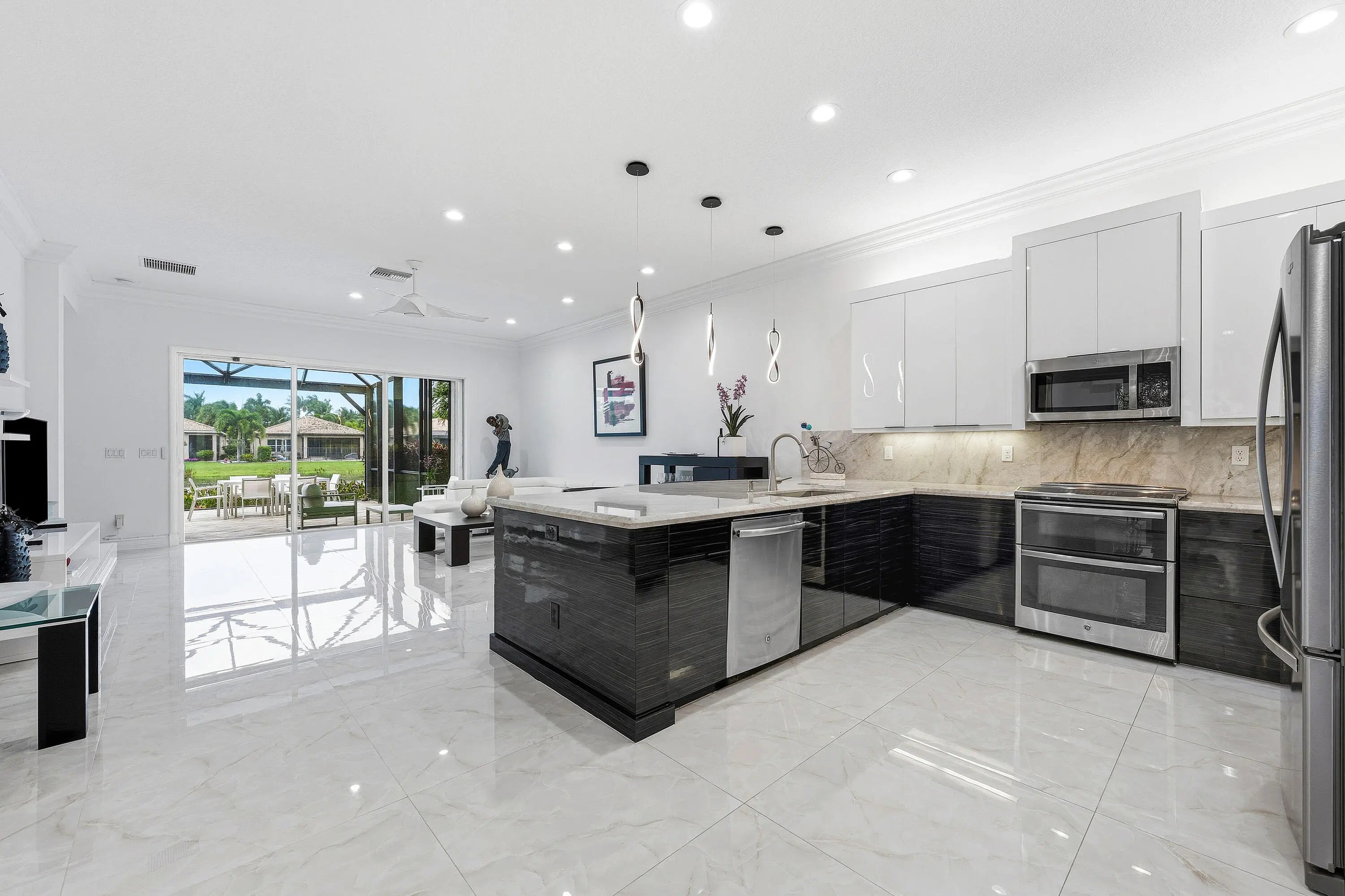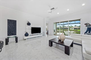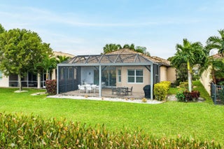 This beautifully appointed home (2/2+den) sits on a lakefront lot. Features include lush landscaping with landscape lighting, impact windows, decorative glass entry door, porcelain floors, wood look tile plank floors in bedrooms, crown moldings, built-in closets, LED hi-hats, designer light fixtures, plantation shutters, fans, upgraded baths and more! The gourmet kitchen features sleek European cabinetry, marble countertops with full height backsplash and all the bells & whistles! There is a large counter height breakfast bar with pendant lights and a formal dining room. Large primary suite with luxurious bath. The den has etched glass double doors and a custom built-in desk unit. You'll love the extended rear patio with covered area, ''birdcage'' with picture frame screen and lake views. Valencia Cove is a premier 55+ lifestyle community featuring a spectacular 39,000 square-foot clubhouse and 10 acre outdoor recreational facility. Endless activities and opportunities for fun abound - there are activities, trips, shows, and clubs of all types. The clubhouse features an expansive foyer and lobby, grand ballroom with raised stage and dance floor, four spacious card rooms, Cafe with indoor/outdoor seating, Arts and crafts room with kiln, Internet/Billiards room, Office, Catering kitchen with separate demonstration cooking studio, Yoga & exercise studio with ping pong, fully equipped fitness center and men's and women's locker rooms with steam rooms, massage room and showers. There are four pools - a beautiful Resort-style pool and Shade Pavilions, Lap pool with Swimmers' Lap Lanes, Resistance walking pool, Grandchildren's wading pool, and an Outdoor whirlpool spa. There are eight har-tru tennis courts with shade pavilions and lighting for night play, tennis pro shop, tennis pro, league play, six pickleball courts, pickleball pro, league play, 2 bocce courts, league play, half-court basketball and walking/jogging/biking paths throughout and just outside the community. Valencia Cove is conveniently located near shopping, restaurants, houses of worship and major highways!