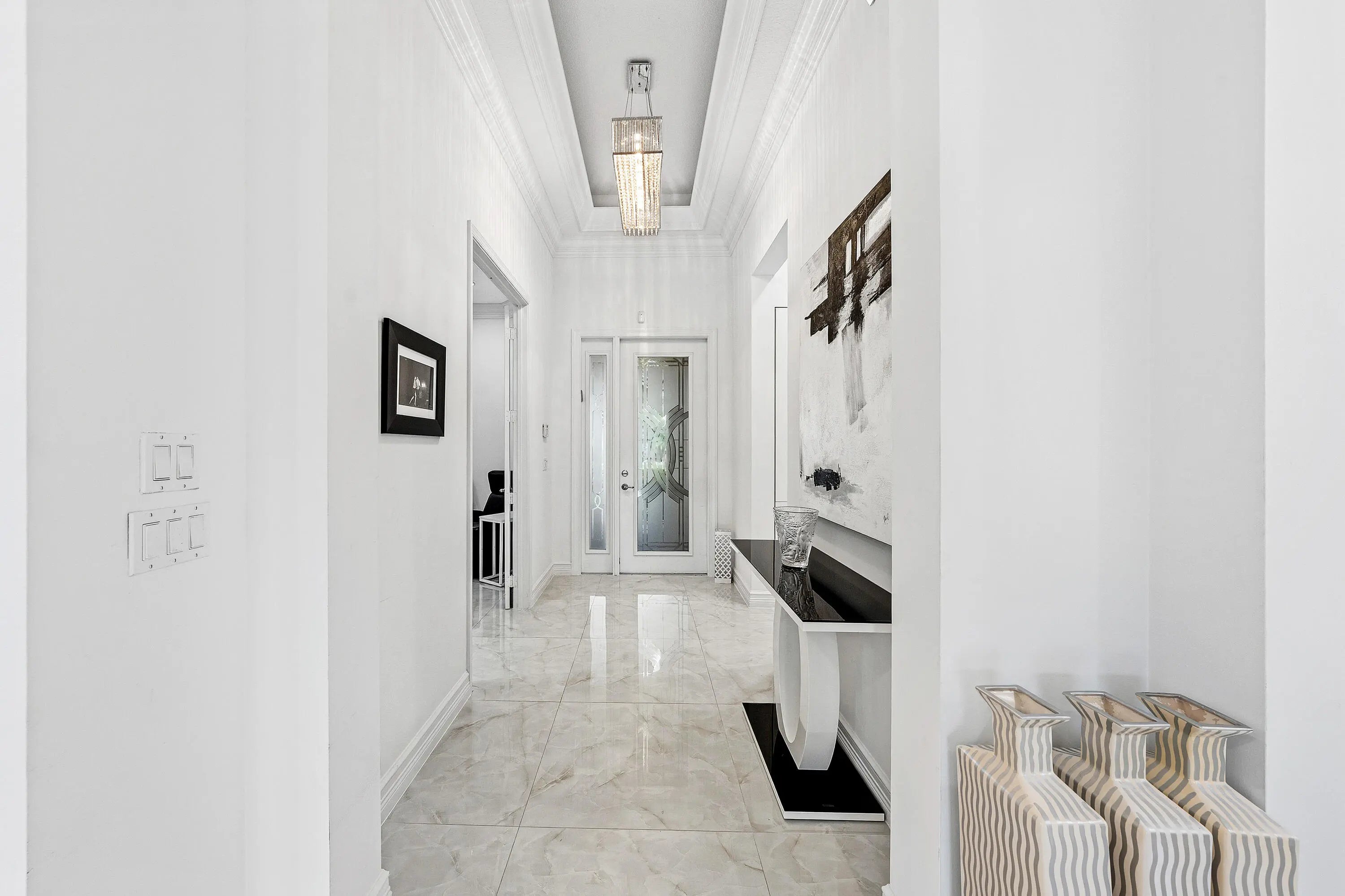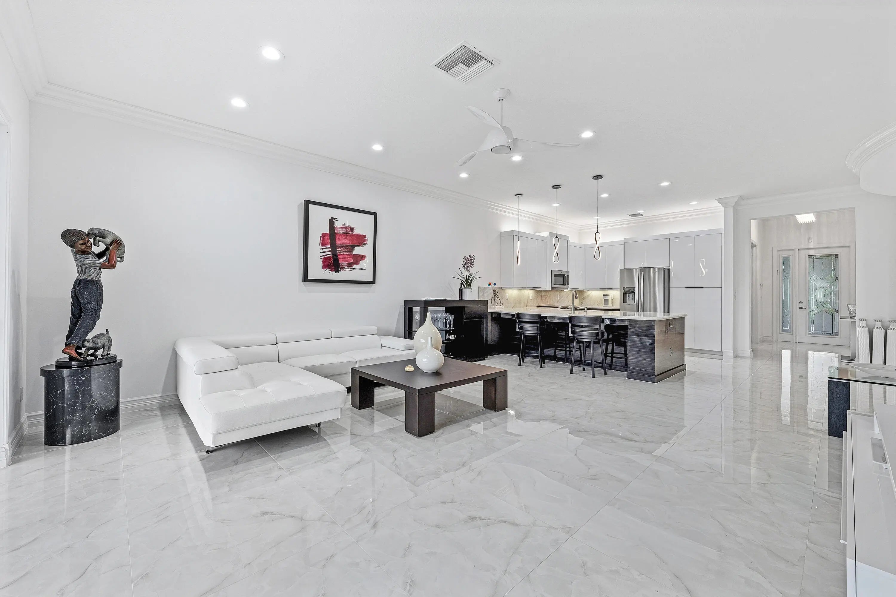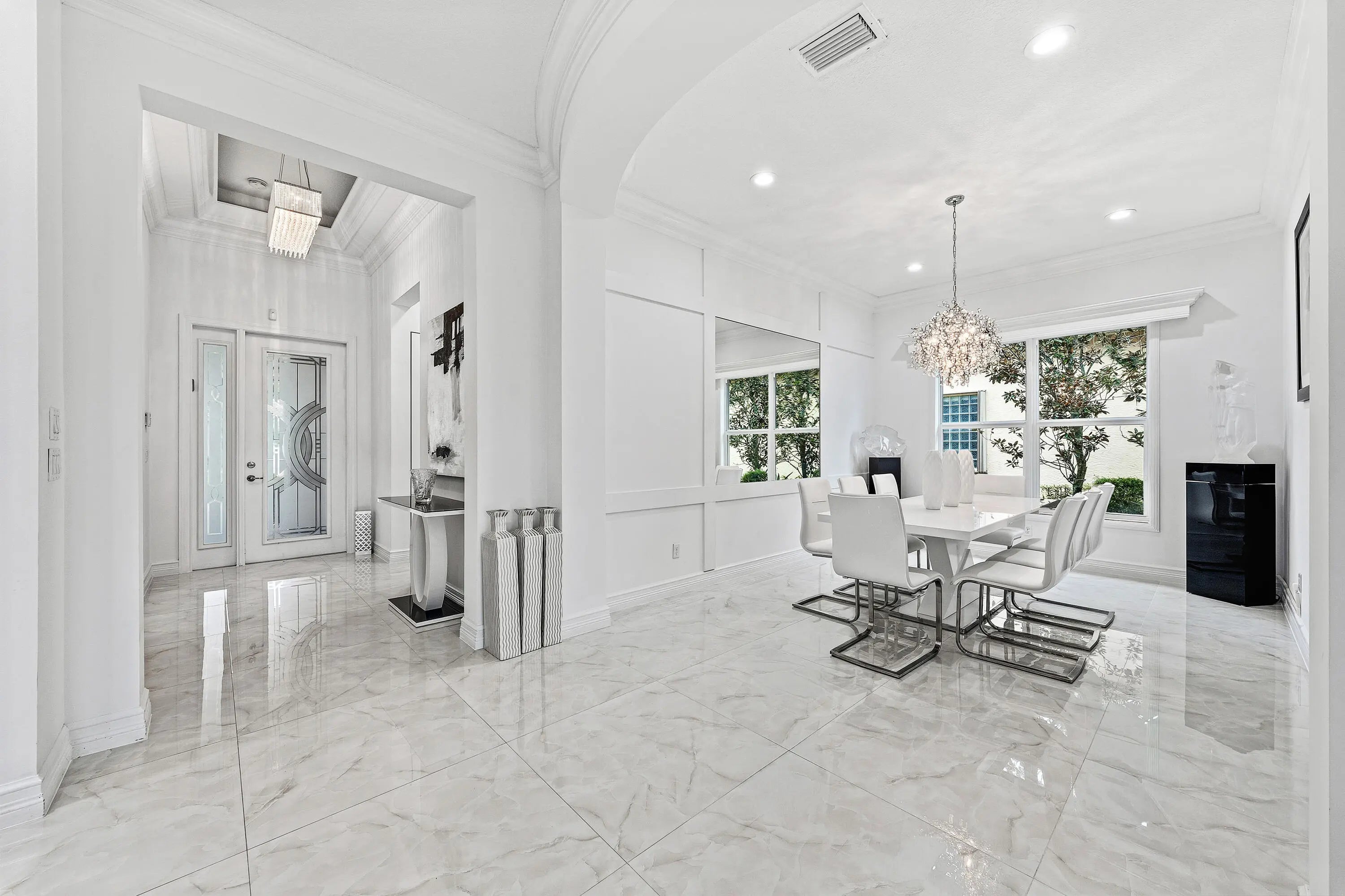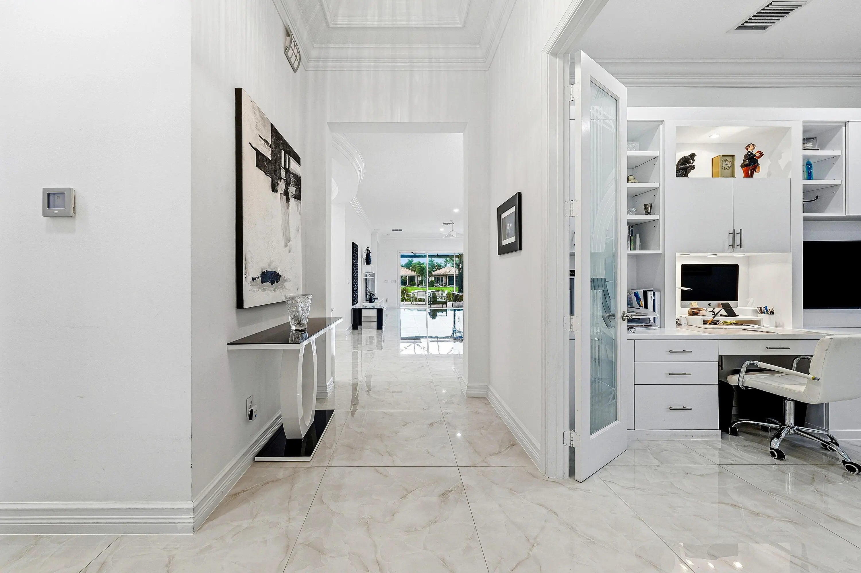 This beautifully appointed home (2/2+den) sits on a lakefront lot. Features include lush landscaping with landscape lighting, impact windows, decorative glass entry door, porcelain floors, wood look tile plank floors in bedrooms, crown moldings, built-in closets, LED hi-hats, designer light fixtures, plantation shutters, fans, upgraded baths and more! The gourmet kitchen features sleek European cabinetry, marble countertops with full height backsplash and all the bells & whistles! There is a large counter height breakfast bar with pendant lights and a formal dining room. Large primary suite with luxurious bath. The den has etched glass double doors and a custom built-in desk unit. You'll love the extended rear patio with covered area, ''birdcage'' with picture frame screen and lake views. Valencia Cove is a premier 55+ lifestyle community featuring a spectacular 39,000 square-foot clubhouse and 10 acre outdoor recreational facility. Endless activities and opportunities for fun abound - there are activities, trips, shows, and clubs of all types. The clubhouse features an expansive foyer and lobby, grand ballroom with raised stage and dance floor, four spacious card rooms, Cafe with indoor/outdoor seating, Arts and crafts room with kiln, Internet/Billiards room, Office, Catering kitchen with separate demonstration cooking studio, Yoga & exercise studio with ping pong, fully equipped fitness center and men's and women's locker rooms with steam rooms, massage room and showers. There are four pools - a beautiful Resort-style pool and Shade Pavilions, Lap pool with Swimmers' Lap Lanes, Resistance walking pool, Grandchildren's wading pool, and an Outdoor whirlpool spa. There are eight har-tru tennis courts with shade pavilions and lighting for night play, tennis pro shop, tennis pro, league play, six pickleball courts, pickleball pro, league play, 2 bocce courts, league play, half-court basketball and walking/jogging/biking paths throughout and just outside the community. Valencia Cove is conveniently located near shopping, restaurants, houses of worship and major highways!
