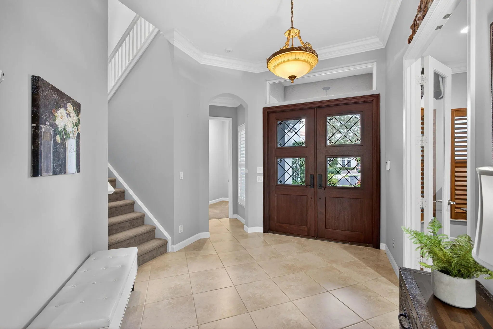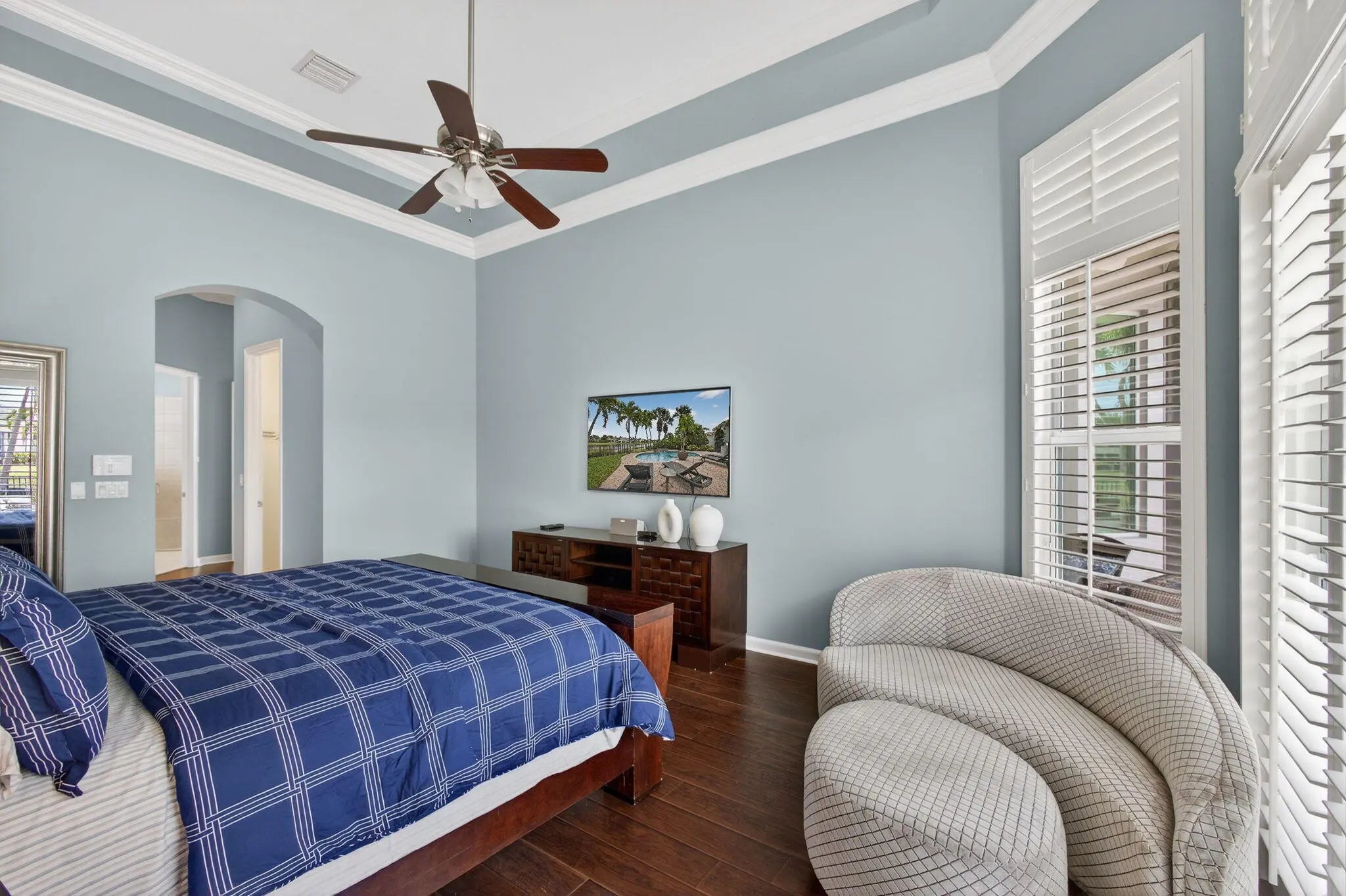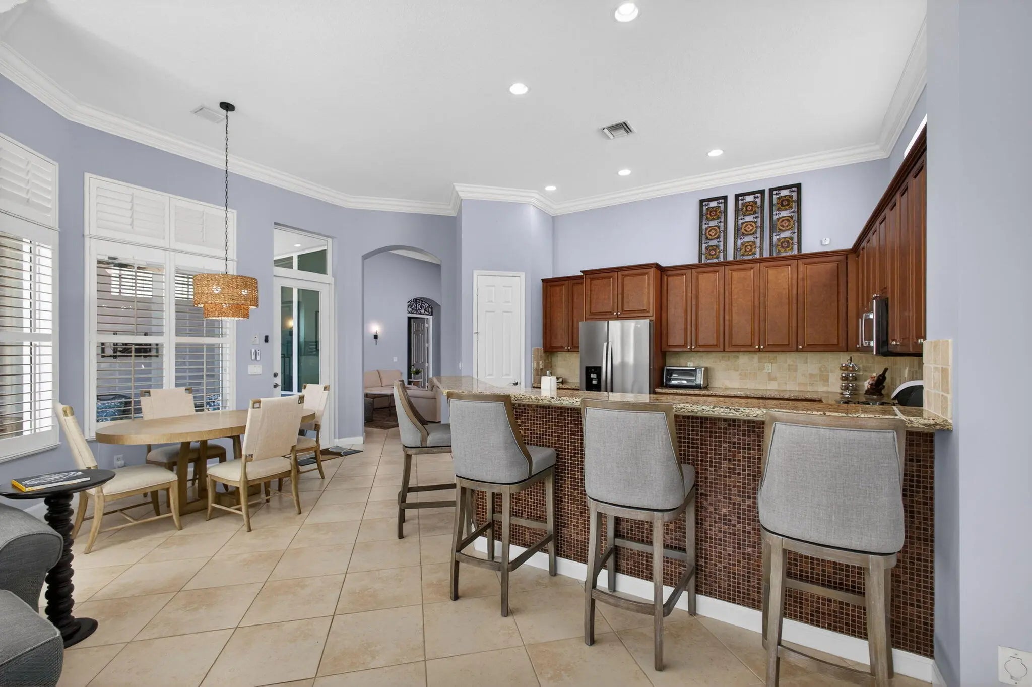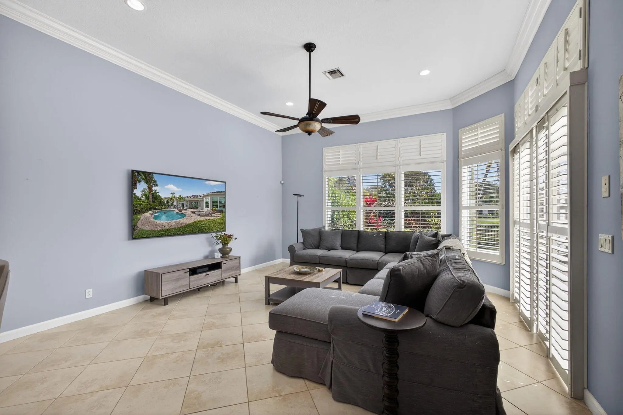 Located in the prestigious Country Club at Mirasol, this exceptional residence offers a coveted golf membership, five spacious bedroom suites plus a dedicated office, and over 4,000 square feet of refined living space. Thoughtfully updated with a new roof, fresh exterior paint, full impact windows, and enhanced by plantation shutters throughout most of the home, this property offers both peace of mind and timeless elegance. Interior details include custom closet built-ins, crown moldings, and central vacuum, adding everyday convenience and polished finishes throughout home. See additional comments Designed for effortless entertaining, the expansive outdoor living area showcases a serene water view and features a large covered patio with a motorized screen enclosure, fire pit seating area, summer kitchen with bar, and a freeform heated pool, ideal for year-round enjoyment. This home seamlessly blends space, comfort, and lifestyle in one of Mirasol's most sought-after settingsan outstanding opportunity to enjoy luxury golf-course living at its finest.