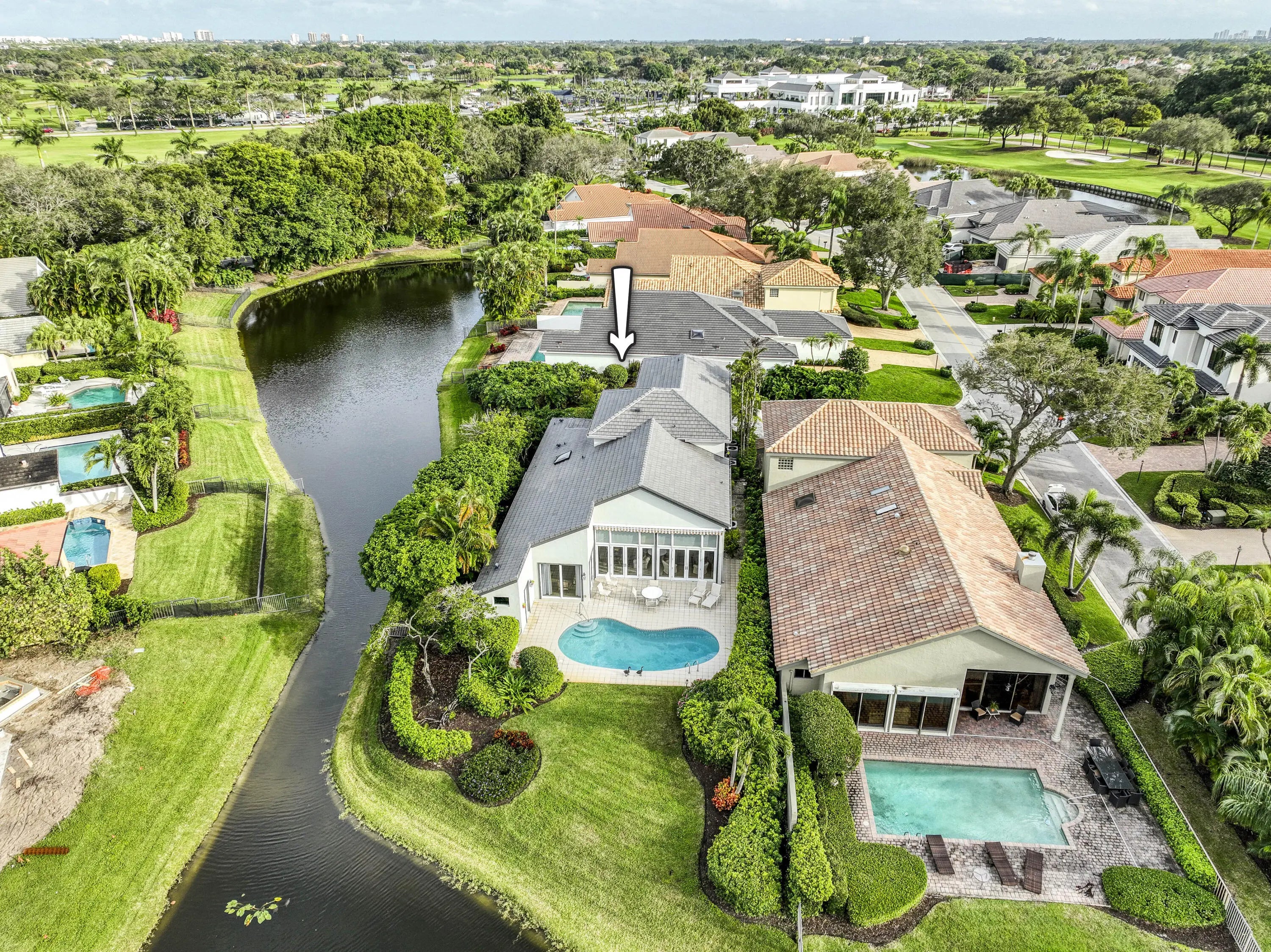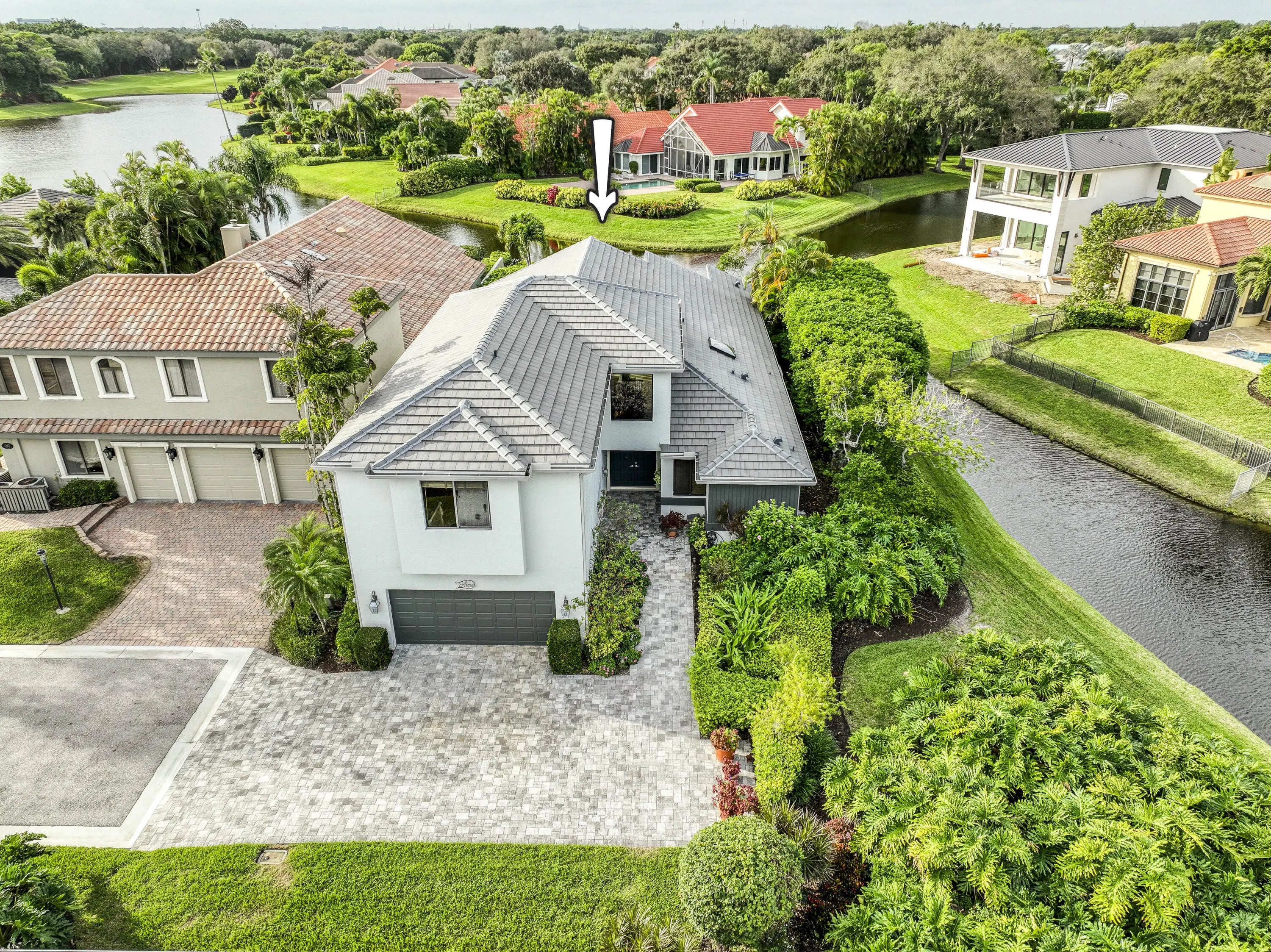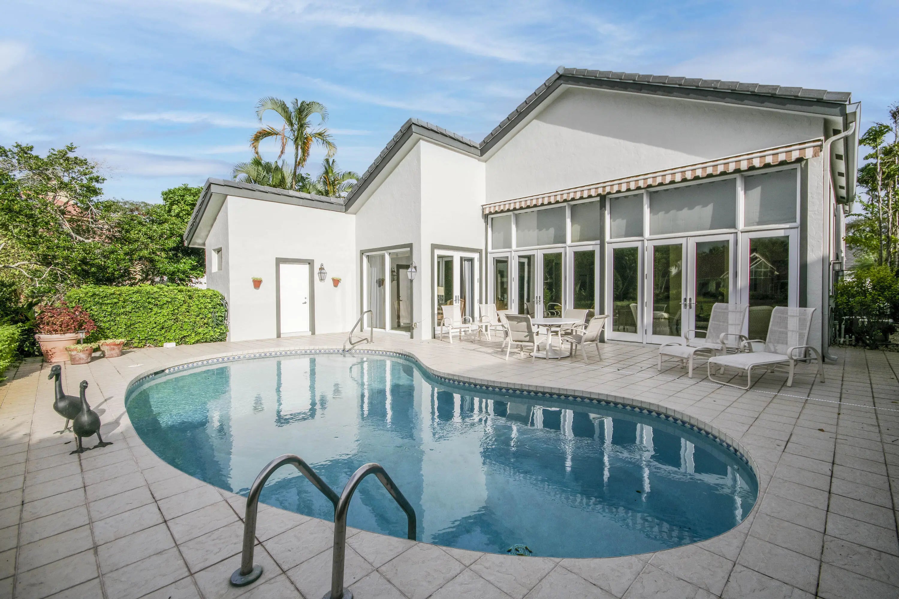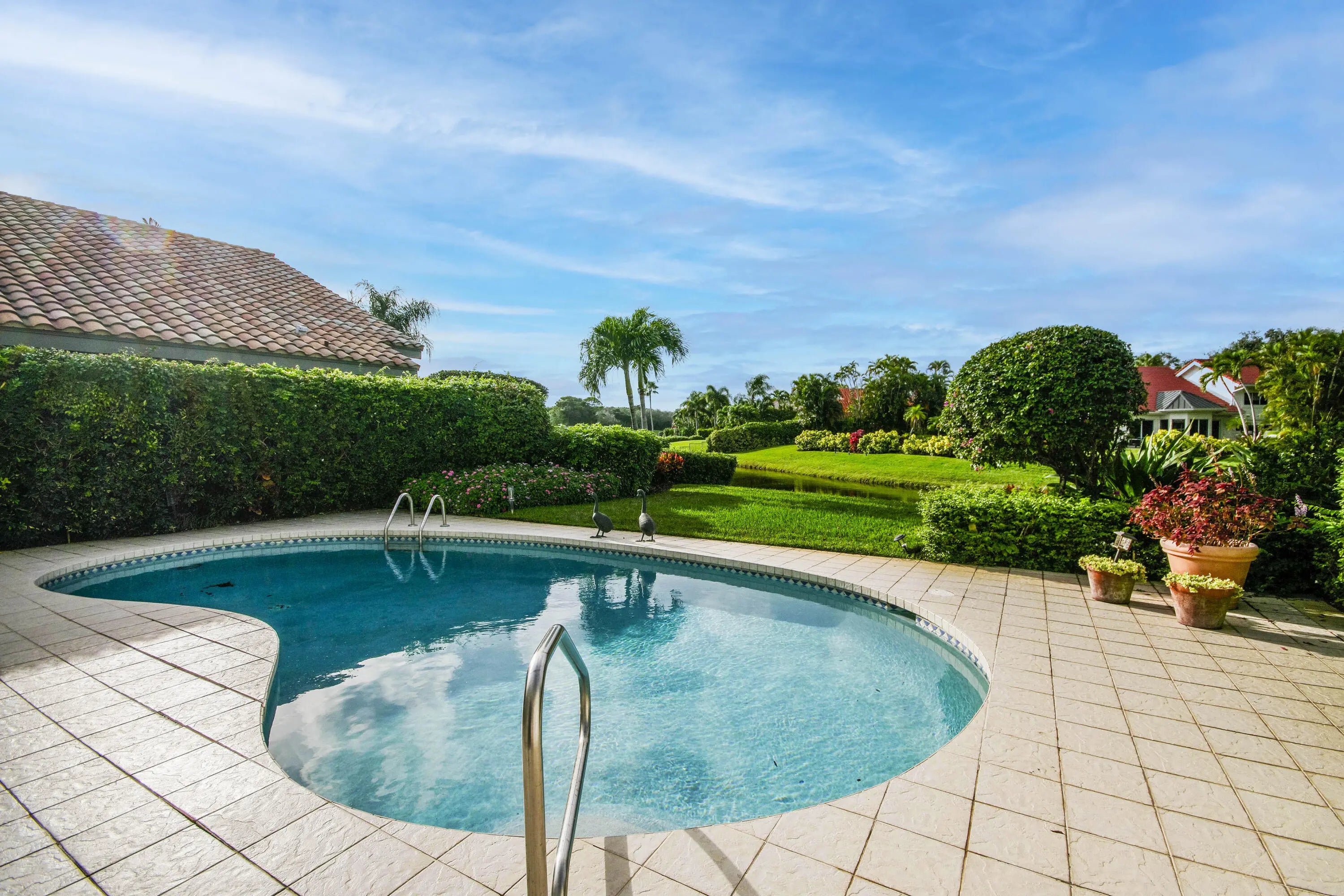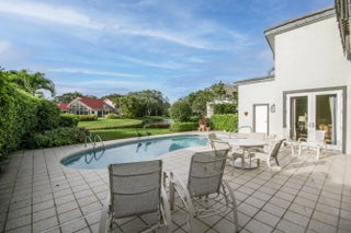 Well-Maintained, Zen-Like Oasis in Prestigious Frenchman's Creek! This 5-bedroom estate offers the perfect blend of privacy, space, and peaceful elegance. Set on a quiet street with a western exposure and water views, this spacious 3,626 sq ft home (4,150 total) features an open floorplan with vaulted ceilings, tile and carpet flooring, and large impact glass doors throughout. The living and dining areas are cozy yet bright, with overhead lighting and ample storage. The traditional kitchen includes wood cabinetry, granite countertops, and electric appliances, while the dining room comfortably seats 12 with views of the backyard and water. The primary suite features dual walk-in closets and two separate en-suite bathrooms, one with a tub and both with oversized showers. Upstairs, two guest bedrooms share a Jack-and-Jill half bath, while the other two are full en-suites. A spacious den/office offers flexibility and natural light. Outside, a super-private backyard provides sunset views, an electric awning, and quiet retreat potential. Recent updates include a 2024 roof, 3-zone A/C (one new in 2023), and all impact glass. This is a rare opportunity for peaceful, spacious living with unmatched access to everything Palm Beach Gardens has to offer.