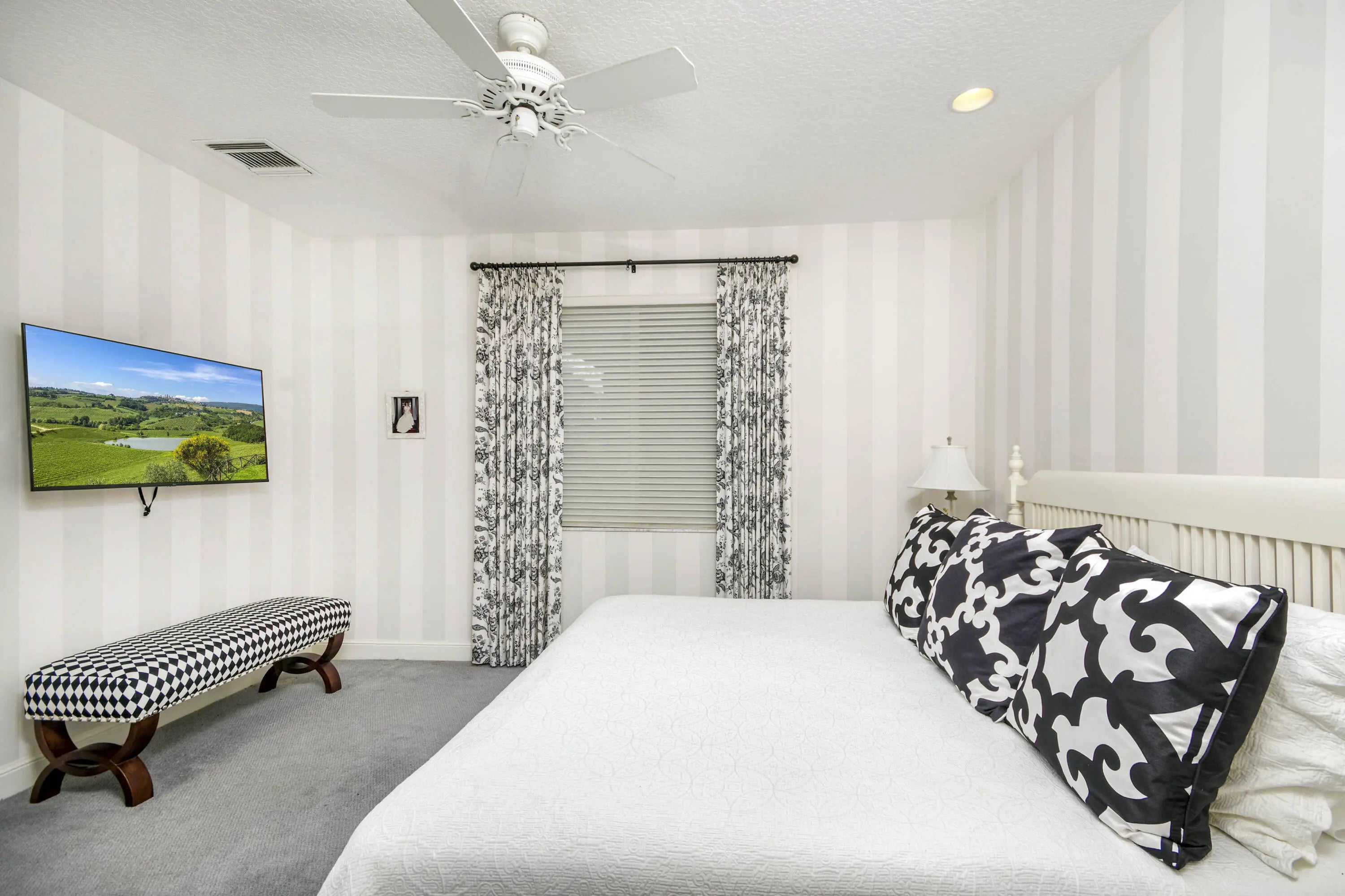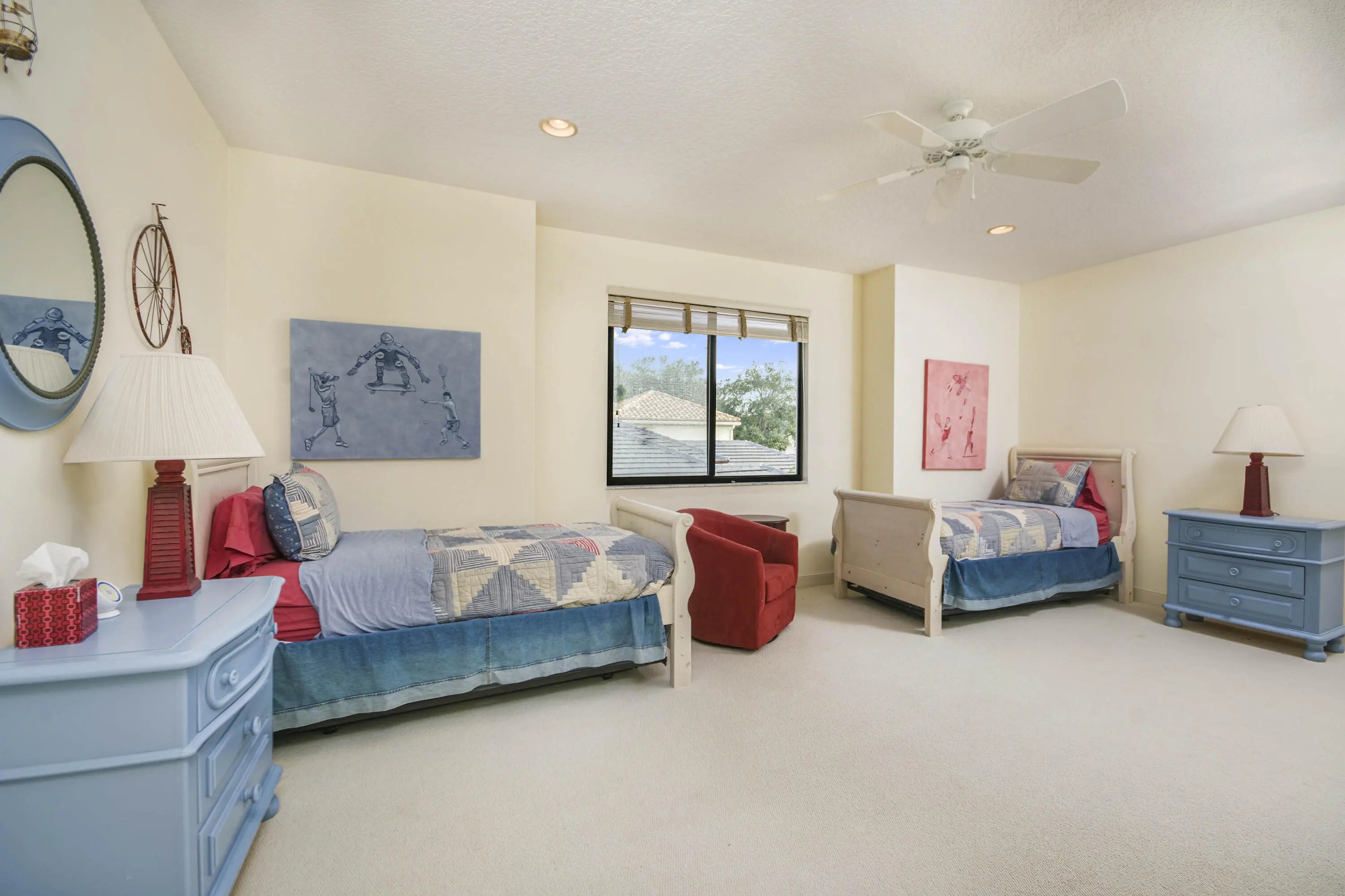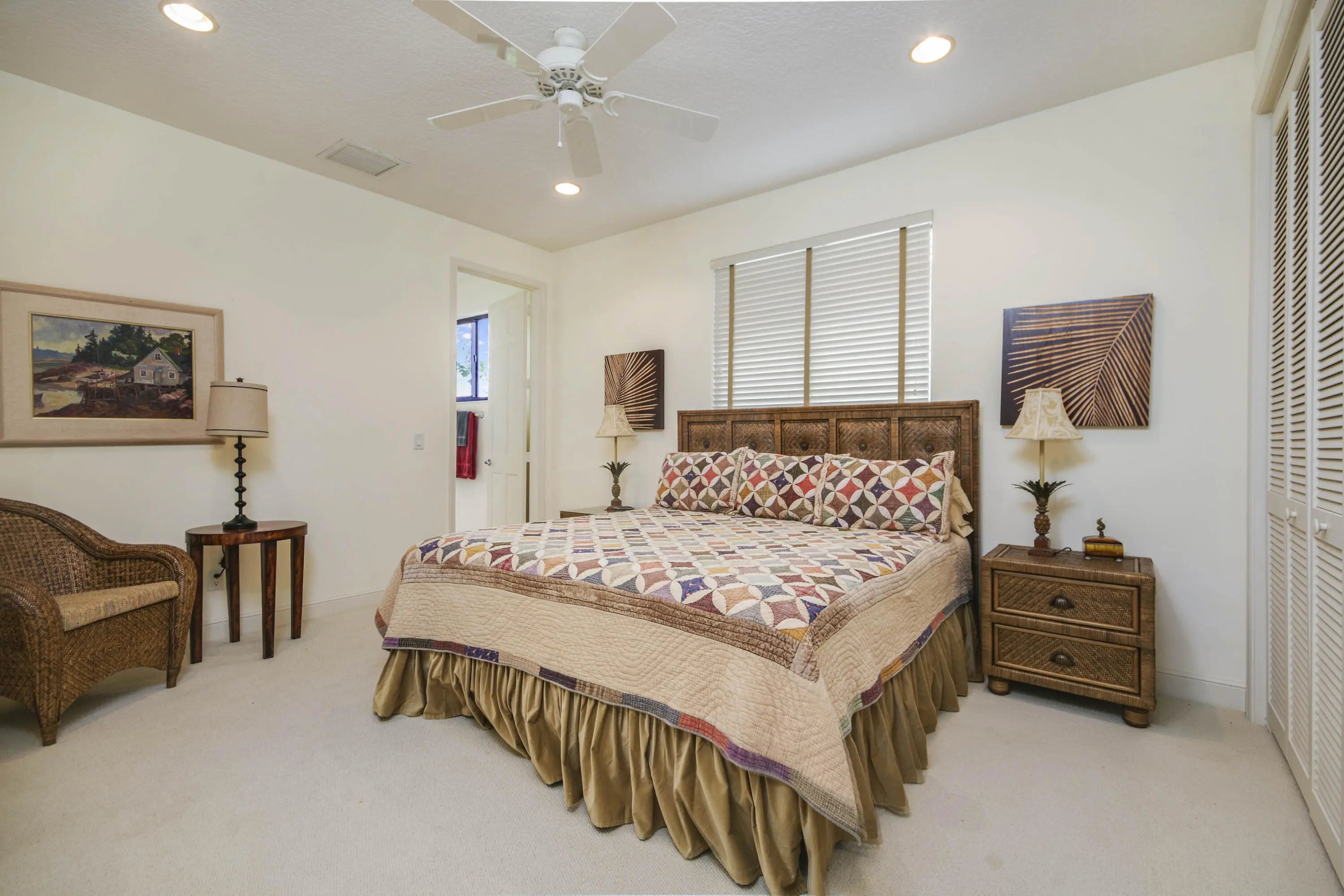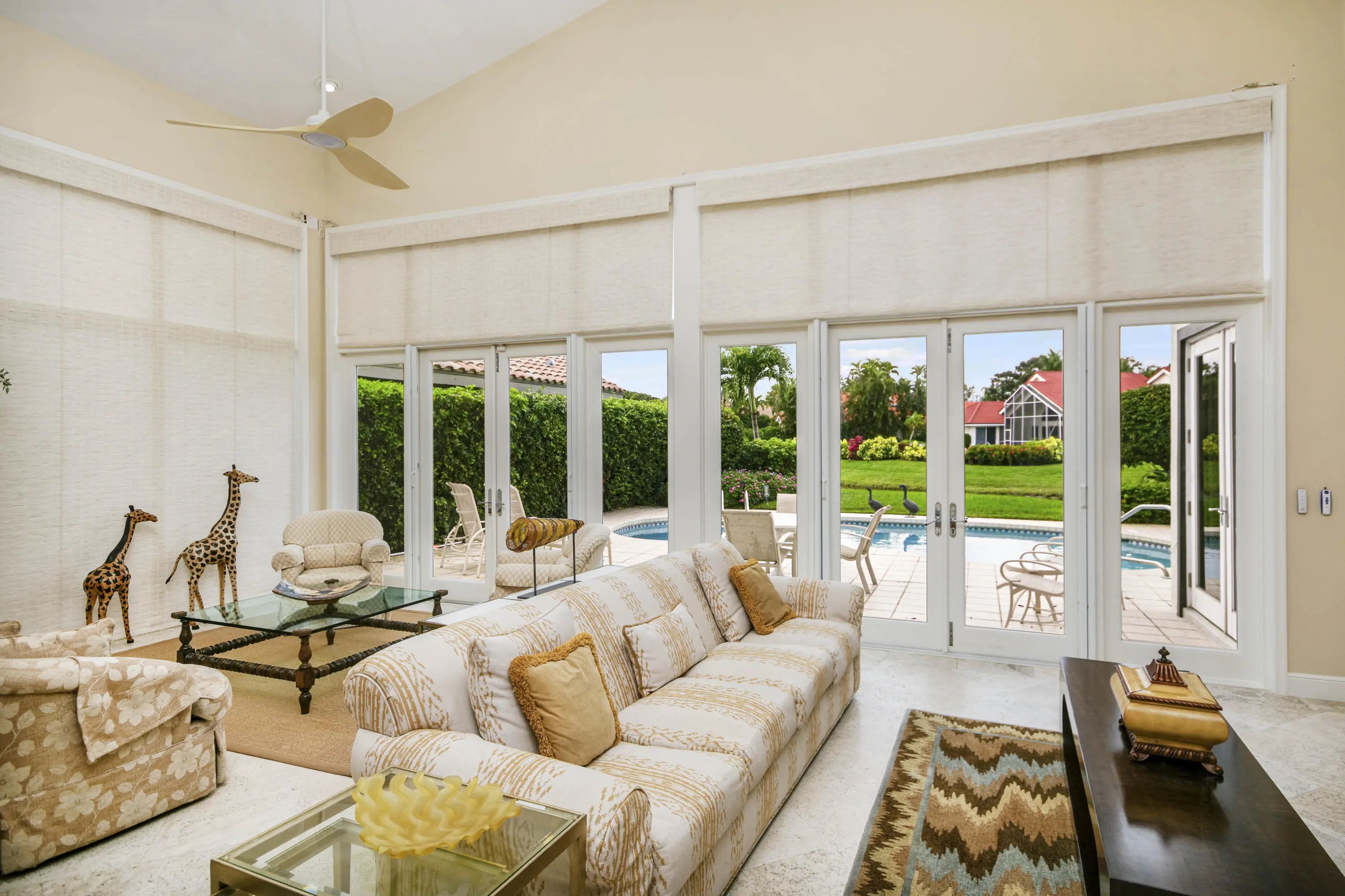 Well-Maintained, Zen-Like Oasis in Prestigious Frenchman's Creek! This 5-bedroom estate offers the perfect blend of privacy, space, and peaceful elegance. Set on a quiet street with a western exposure and water views, this spacious 3,626 sq ft home (4,150 total) features an open floorplan with vaulted ceilings, tile and carpet flooring, and large impact glass doors throughout. The living and dining areas are cozy yet bright, with overhead lighting and ample storage. The traditional kitchen includes wood cabinetry, granite countertops, and electric appliances, while the dining room comfortably seats 12 with views of the backyard and water. The primary suite features dual walk-in closets and two separate en-suite bathrooms, one with a tub and both with oversized showers. Upstairs, two guest bedrooms share a Jack-and-Jill half bath, while the other two are full en-suites. A spacious den/office offers flexibility and natural light. Outside, a super-private backyard provides sunset views, an electric awning, and quiet retreat potential. Recent updates include a 2024 roof, 3-zone A/C (one new in 2023), and all impact glass. This is a rare opportunity for peaceful, spacious living with unmatched access to everything Palm Beach Gardens has to offer.