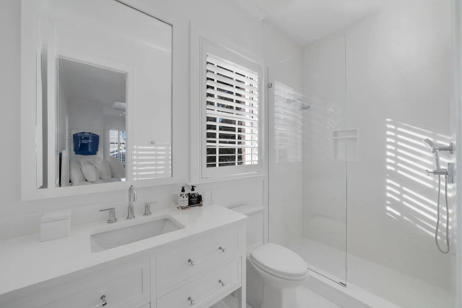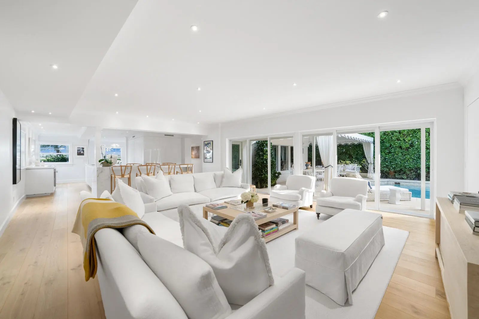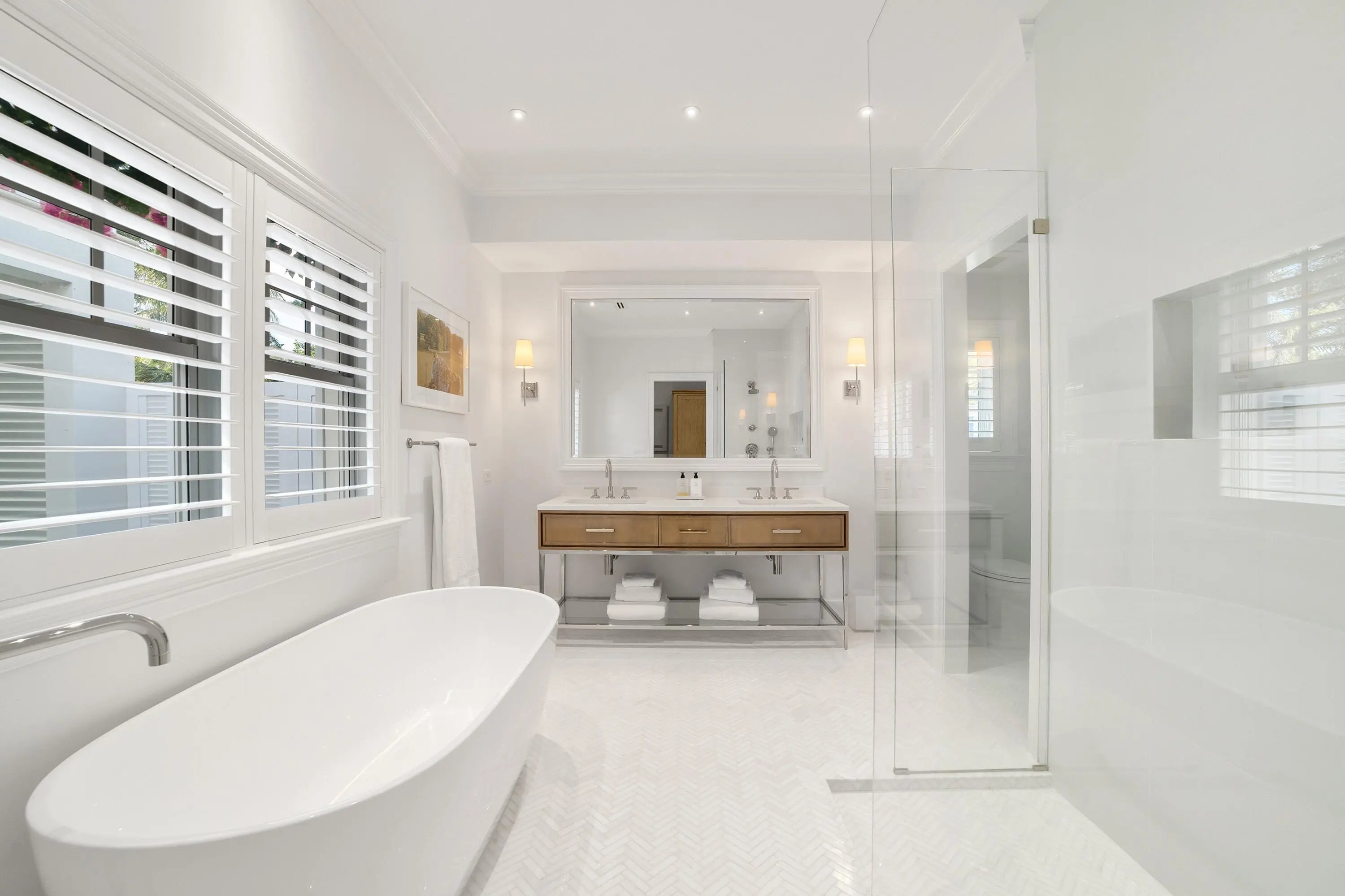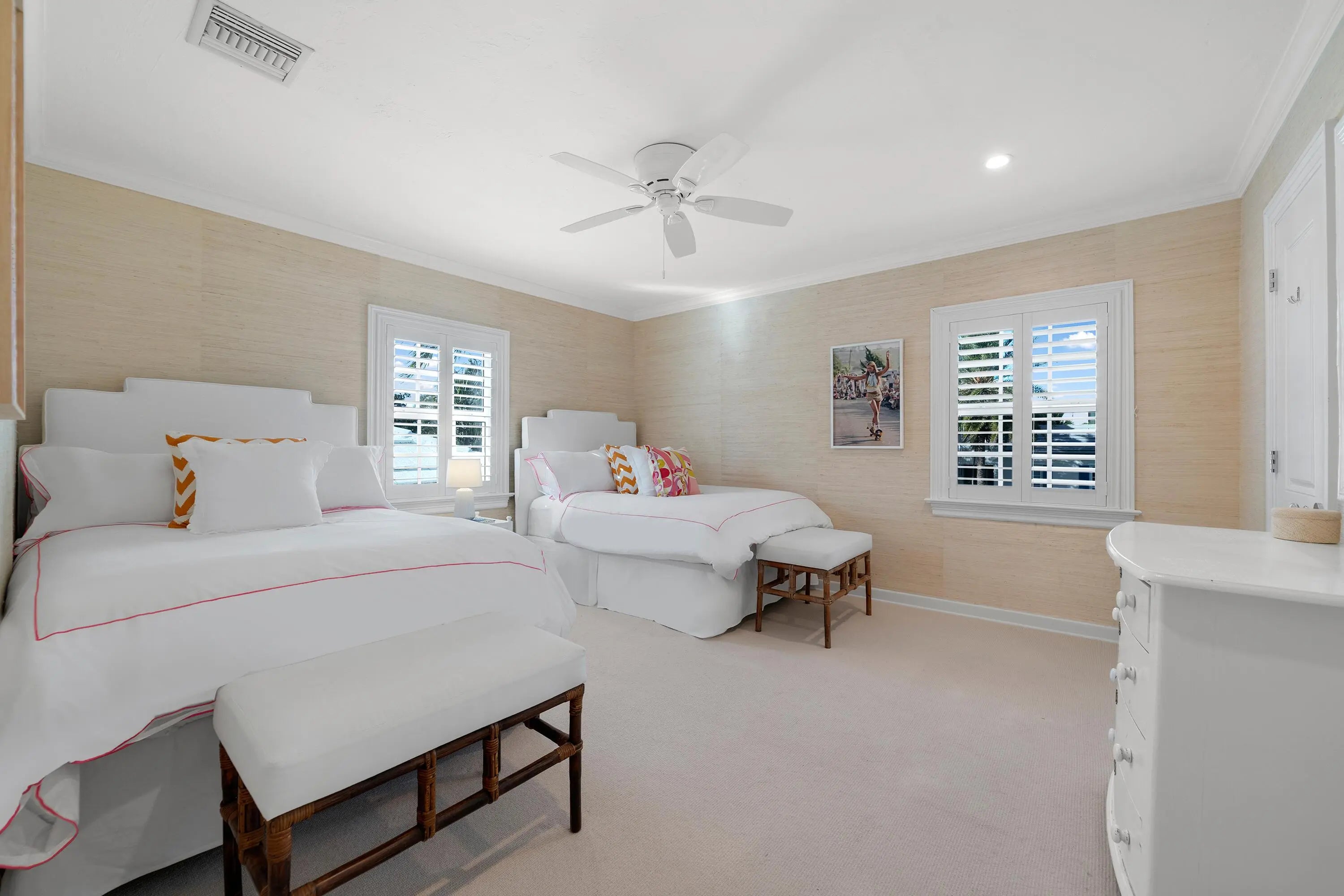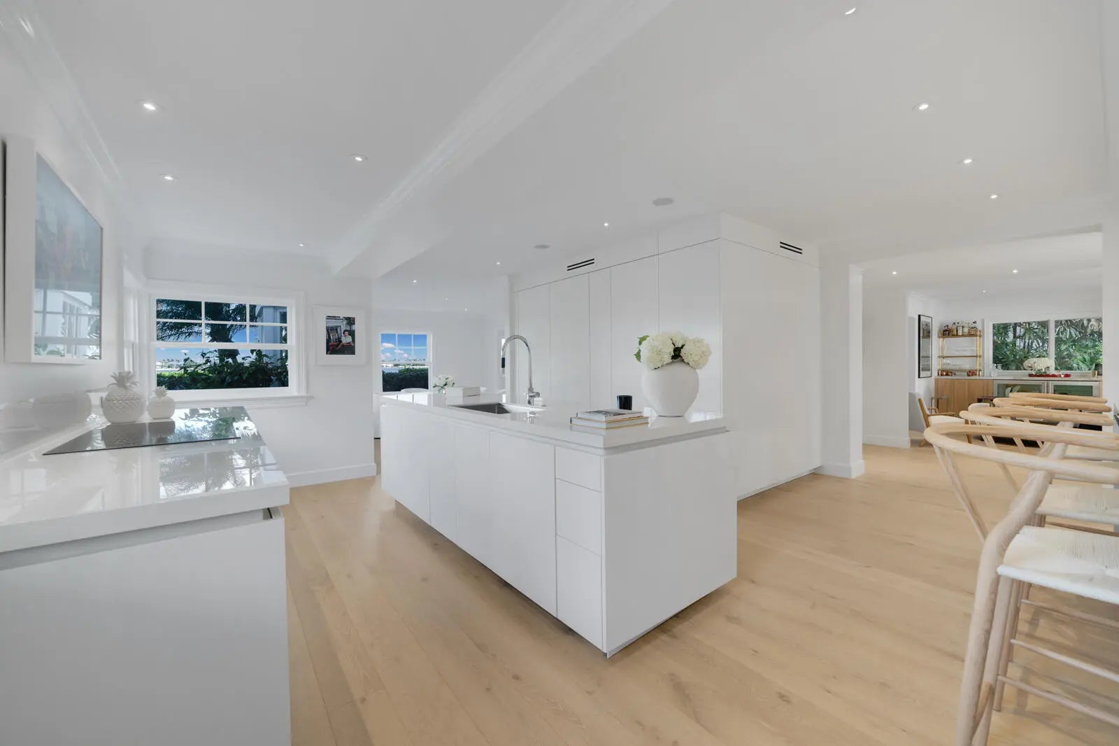 Set on a corner lot along South Flagler Drive, this West Palm Beach residence offers 70 feet of Intracoastal frontage on a 12,197+/- square foot lot with a private dock and pool. A thoughtfully integrated addition and a newly constructed guest house with a two-car garage and apartment above further enhance the property's scale, flexibility, and waterfront lifestyle. The residence encompasses approximately 5,712+/- total square feet with five bedrooms, four full bathrooms, and two half bathrooms. From the moment of entry, the home is defined by natural light and sweeping water views. The living room captures the Intracoastal setting, with windows framing the water, and serves as a central gathering space for everyday living. Just beyond, a sunroom with a built-in bar overlooks the pool and loggia and is outfitted with two under-counter refrigerators and an ice maker, well suited for relaxed gatherings and evening occasions. The dining room, featuring herringbone wood floors and a bay window, is surrounded by water views and opens directly to the kitchen, allowing for a natural flow between spaces. The eat-in kitchen is both refined and highly functional, appointed with custom Poggenpohl cabinetry, an internationally recognized German brand known for its precision engineering, clean lines, and exceptional craftsmanship. Dacor appliances include an induction cooktop, large refrigerator and freezer, and two dishwashers, complemented by extensive integrated storage and a dedicated coffee bar. A substantial island, with additional storage, anchors the space and opens to the family room, creating a comfortable layout for daily living. The family room overlooks the pool and terrace, with sliding glass doors enhancing the connection to the outdoors. Also on this level are a full laundry room and a well-appointed guest suite, which features a walk-in closet and an en suite bath with dual sinks, a separate tub and shower, and a private water closet. The upper level is dedicated to the primary suite and additional guest accommodations. The primary bedroom enjoys commanding water views and includes a spacious walk-in closet and a serene bathroom with a separate tub and shower. Two additional guest bedrooms are also located upstairs, each with its own closet and sharing a thoughtfully designed bathroom with dual sinks and a walk-in shower. The guest house, located above the air-conditioned two-car garage, offers exceptional flexibility for extended stays. The apartment includes a living room with a full kitchen featuring an induction cooktop, oven, refrigerator and freezer, and a Bosch dishwasher. The guest bedroom includes closets, an en suite bath, and a washer and dryer. Outdoor living is a defining element of the property. The pool area is anchored by a covered loggia and coquina terrace, connected by a long covered breezeway. A generous gathering area on the western side of the pool includes a built-in grill, cabana bath, and outdoor shower, creating a private setting suited for both relaxation and hosting. The private dock is equipped with a 24,000 lb boat lift, electric, and water, providing convenient access to the Intracoastal and complementing the home's waterfront lifestyle. A rare opportunity to own a thoughtfully designed Intracoastal residence with dockage, guest accommodations, and refined interiors, ideally positioned along one of West Palm Beach's most desirable waterfront corridors.