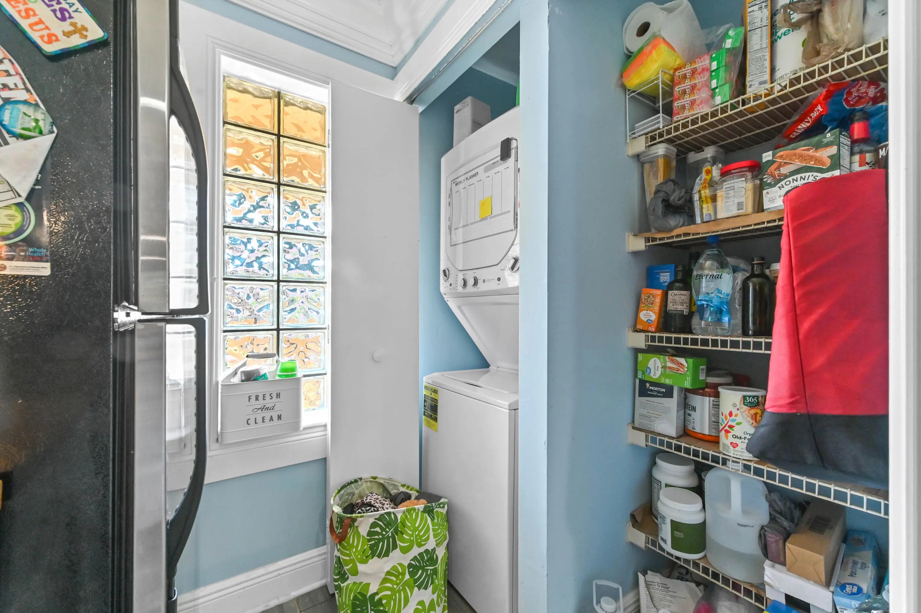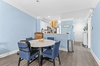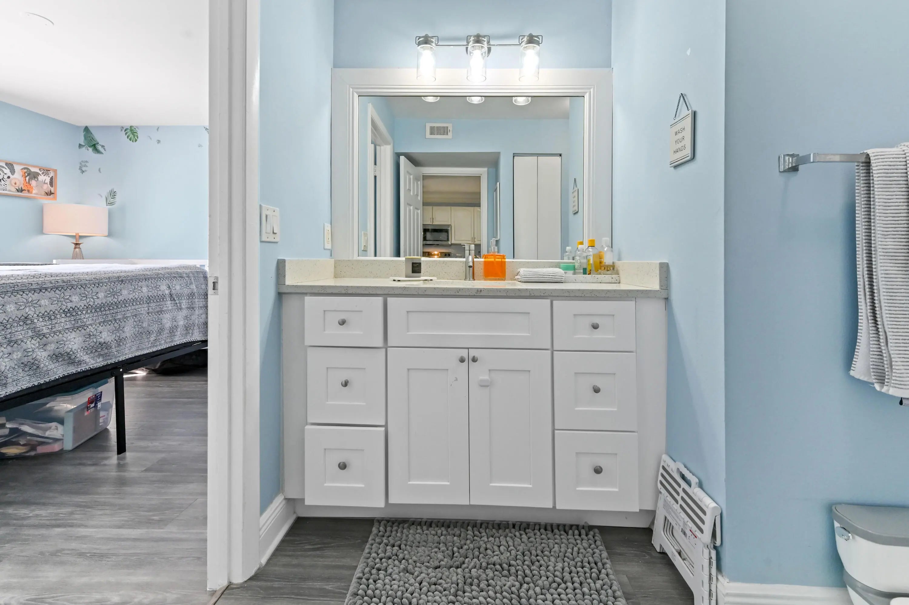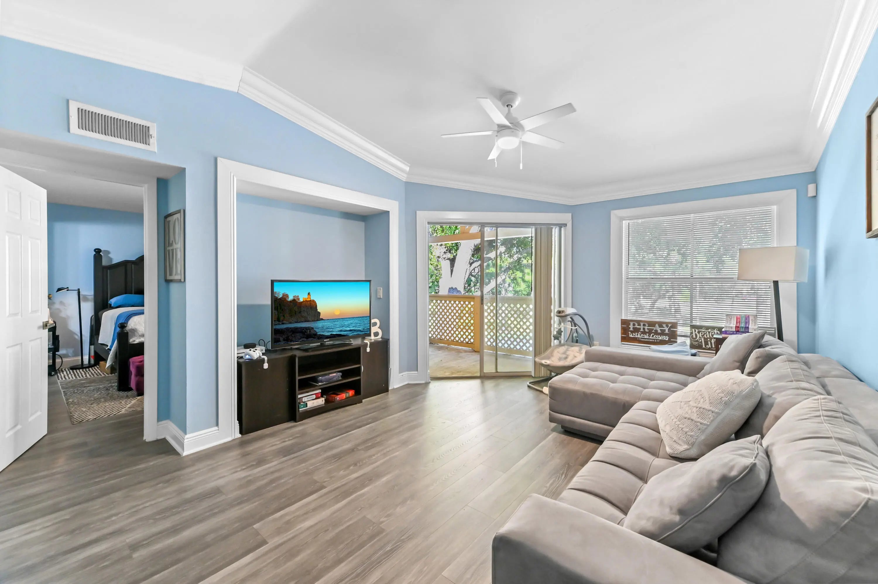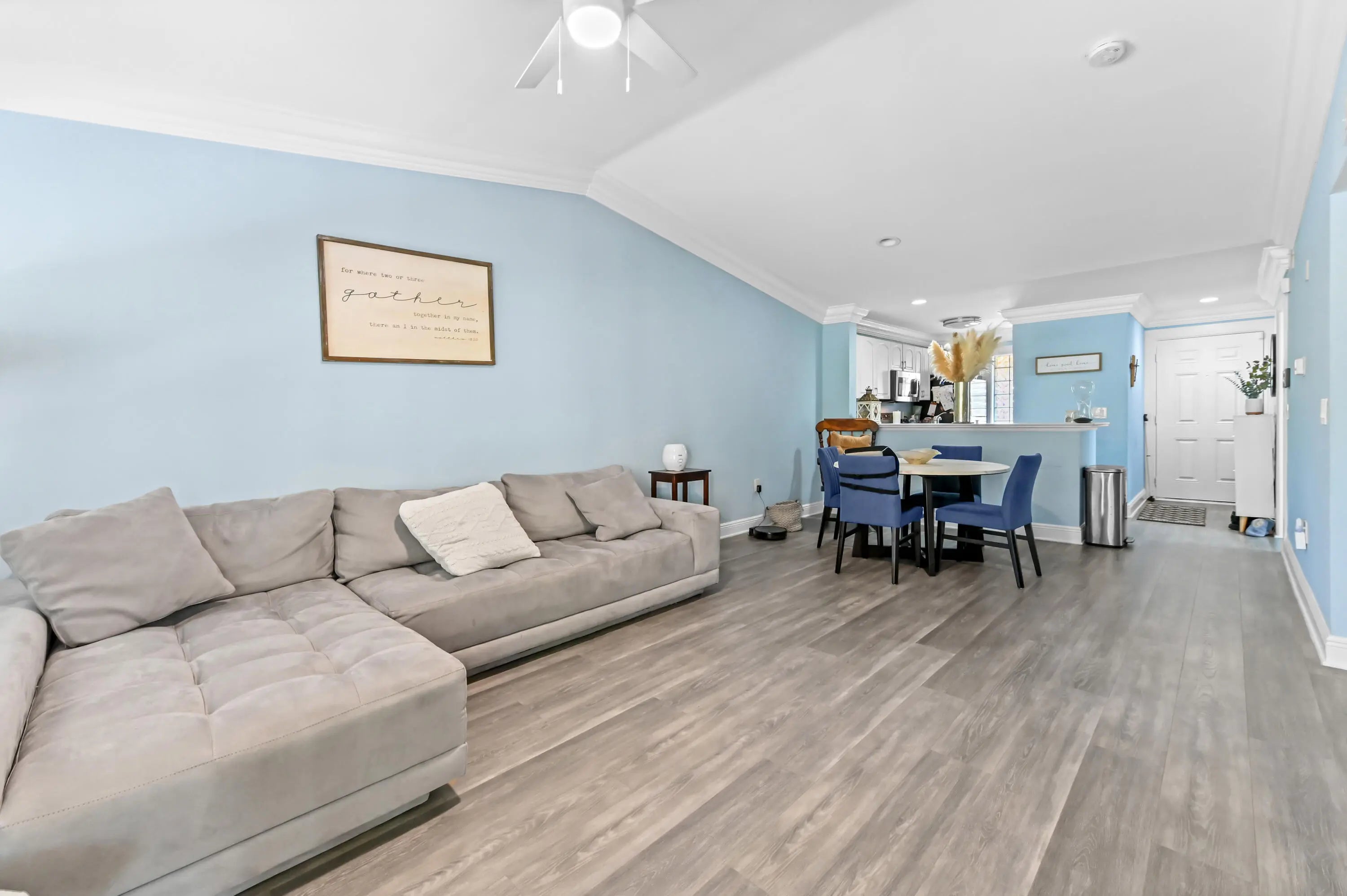 Step into this stunning first-floor corner residence, where modern updates meet architectural elegance. The interior is defined by sleek grey wood-look flooring that flows seamlessly throughout the entire home—ensuring a carpet-free, low-maintenance lifestyle. Your eyes are immediately drawn upward to the tray ceilings detailed with heavy, sophisticated crown molding, adding a touch of grandeur to the open-concept living and dining areas. The heart of the home is the stylish kitchen, featuring crisp white cabinetry that contrasts beautifully with warm butcher block countertops, all illuminated by recessed lighting and equipped with modern appliances. The split-bedroom layout offers privacy and comfort, with spacious rooms bathed in natural light through large windows with access to patio. The bathrooms have contemporary white vanities and updated fixtures, maintaining the home's bright, clean aesthetic. Practicality is maximized with a cleverly designed laundry niche featuring a stackable washer and dryer alongside built-in pantry shelving for extra storage. Unique glass block accents at the entry and kitchen add character and light to this move-in-ready coastal retreat.