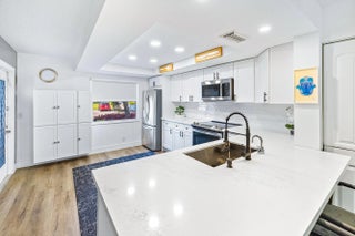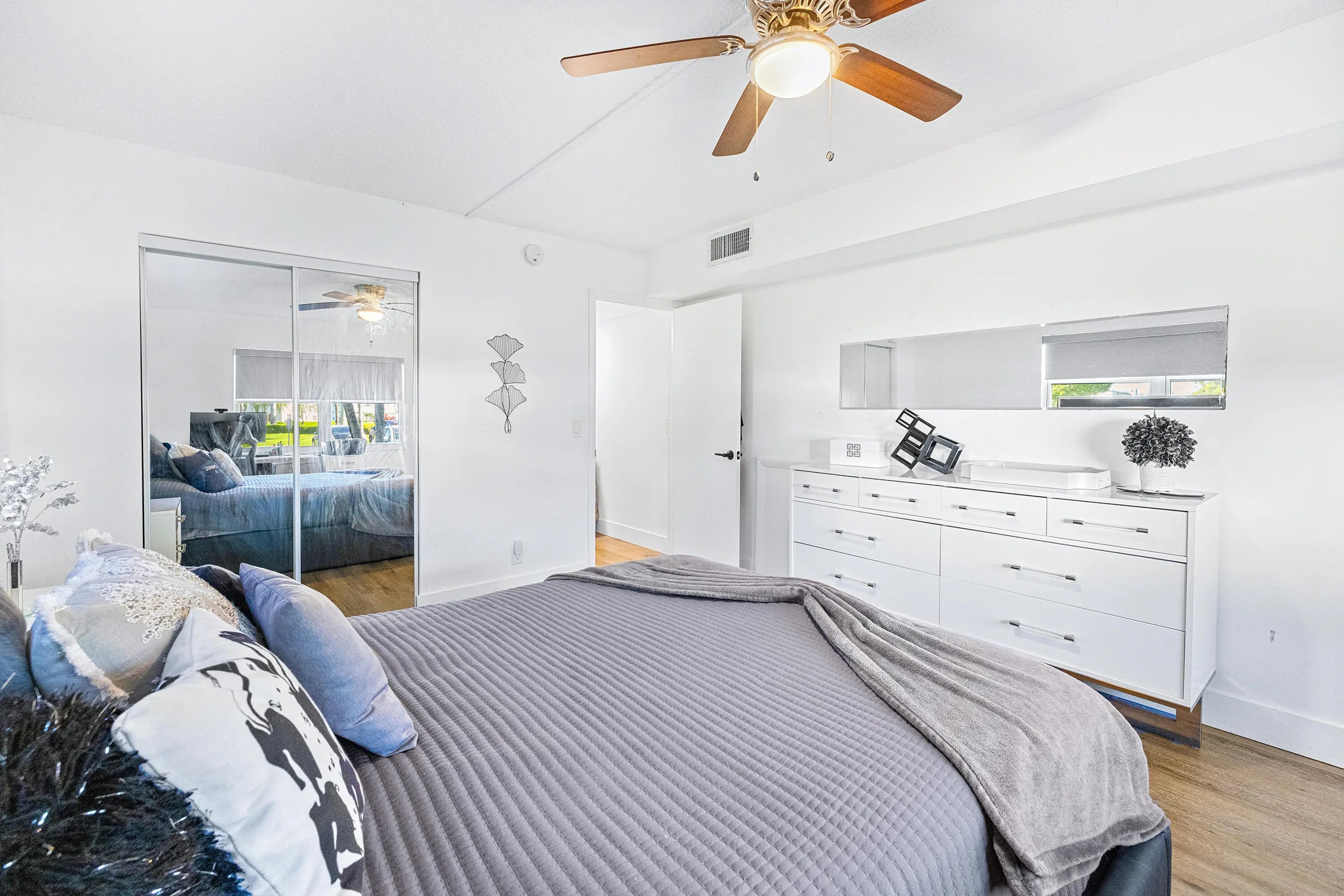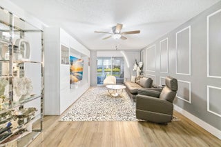 This stunning, recently remodeled 2 bedroom, 2 bathroom GROUND floor CORNER unit features spectacular LAKE VIEW! There is LVP flooring throughout. The open-concept kitchen is equipped with quartz countertops, stainless steel appliances, and plenty of raised shaker cabinets. The spacious primary bedroom offers a walk-in closet. Both bathrooms are equipped with a shower with a seamless glass enclosure. Living areas are finished with stylish picture frame moldings. Century Village is an amazing, active 55+ community that offers a swimming pool, fitness center, tennis and pickleball courts, clubhouse, card room, a movie theater, numerous clubs, classes and endless activities. The community is conveniently located to many shops and restaurants. All measurements are approximate.