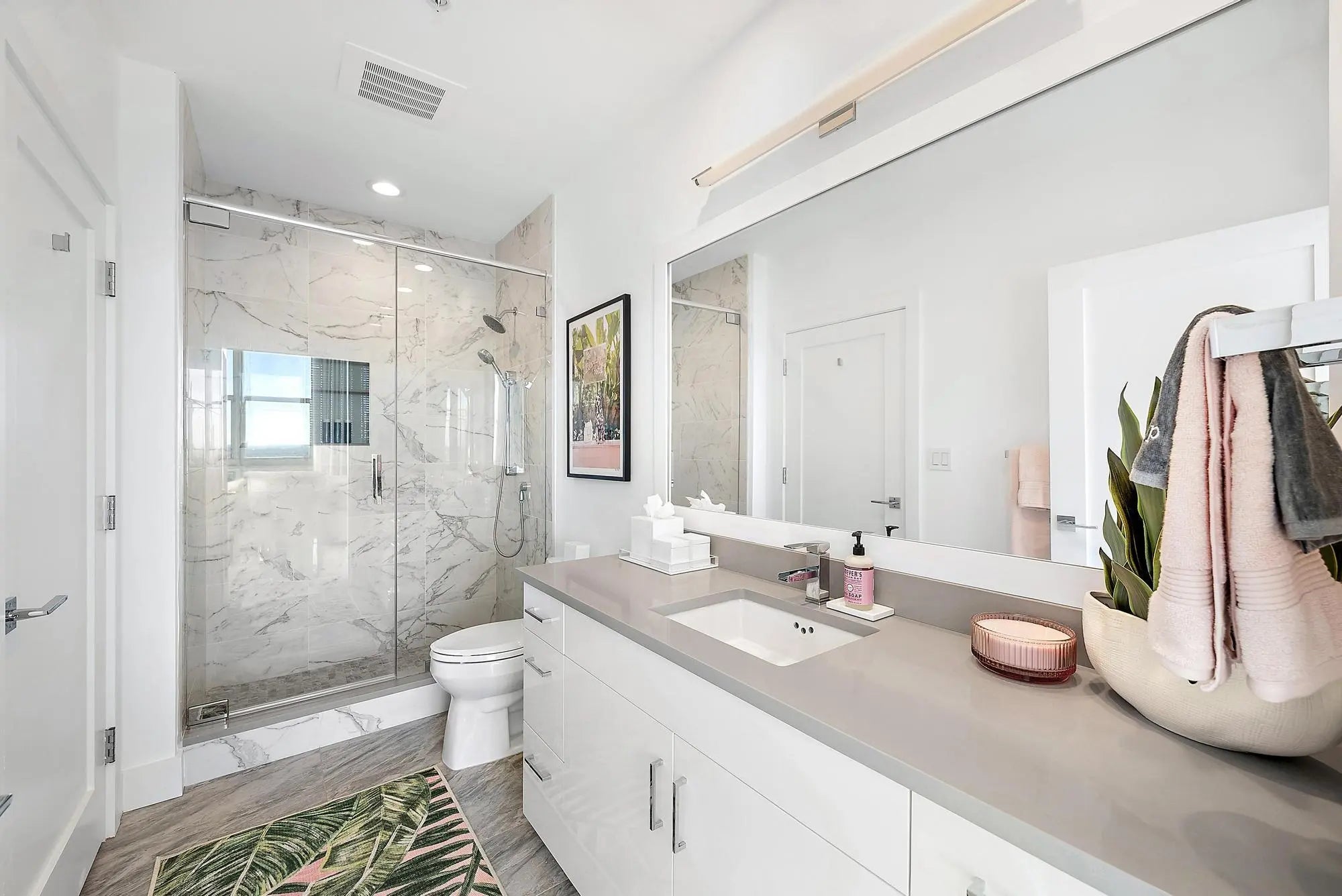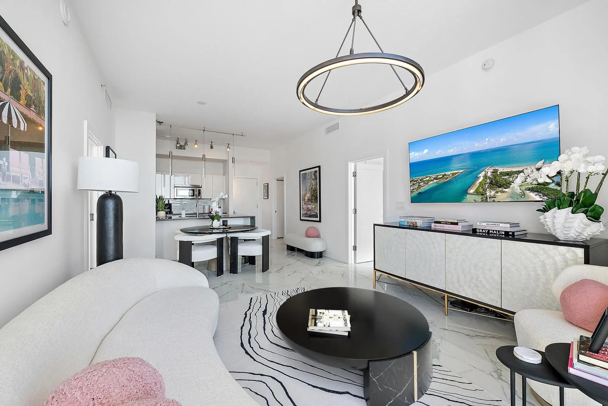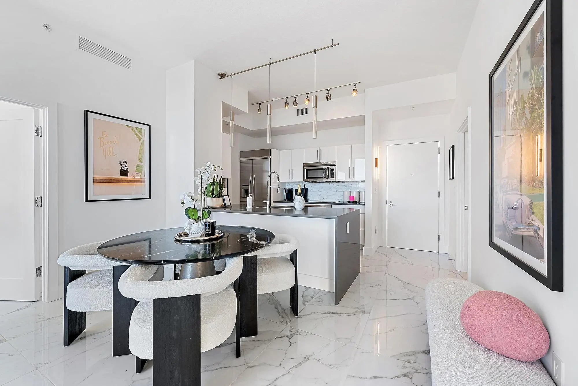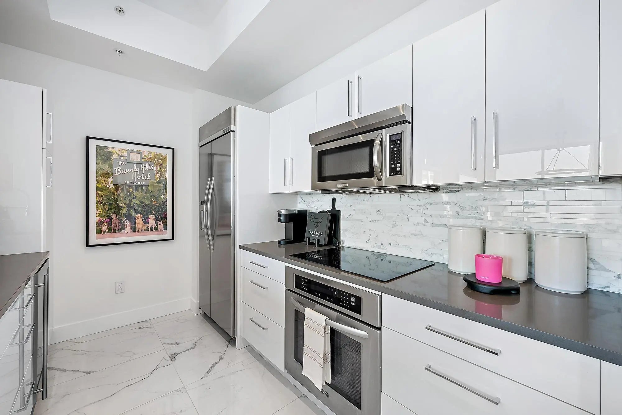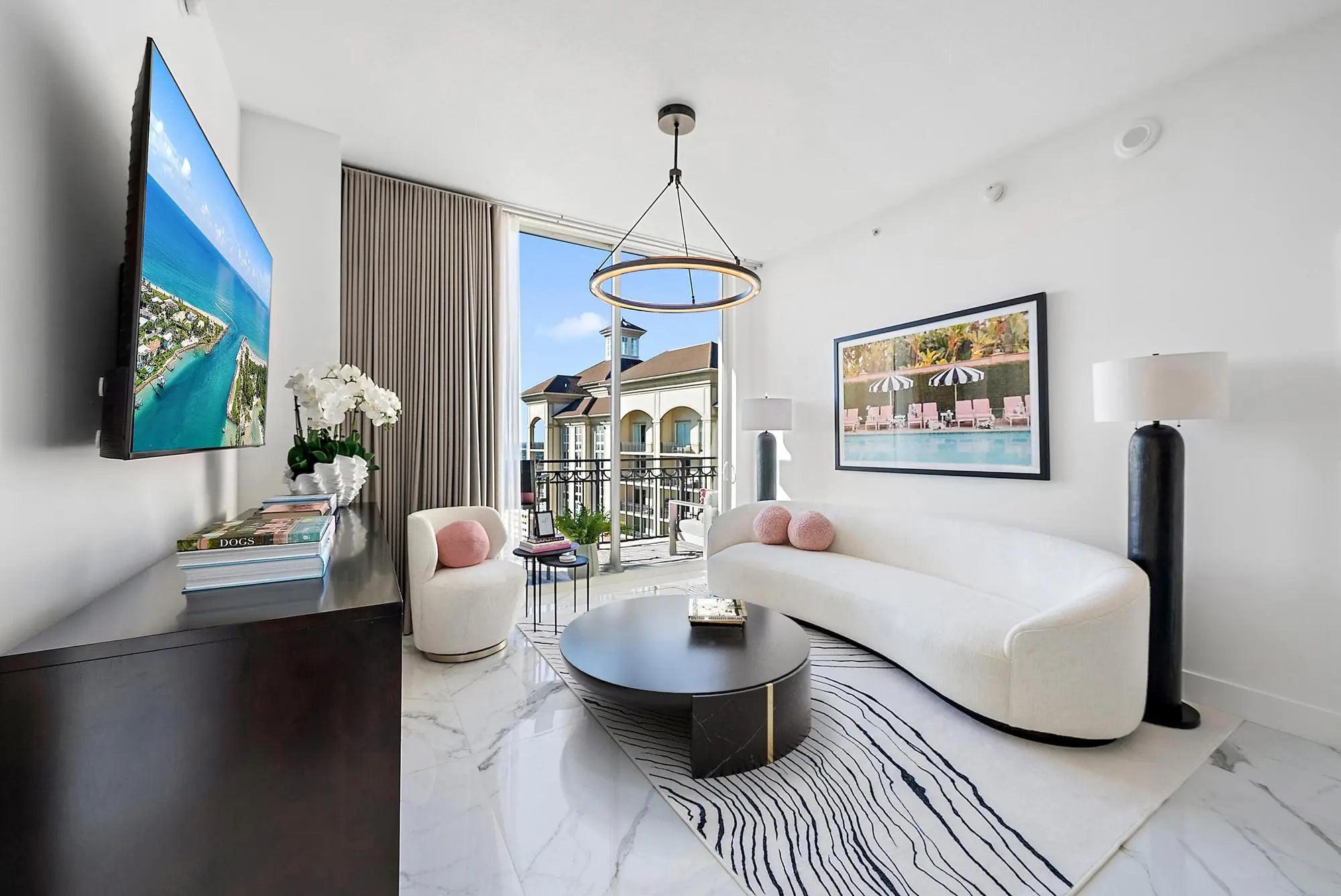 Welcome to ''The Beverly'' — a fully furnished, turnkey penthouse residence inspired by the timeless elegance of the Beverly Hills Hotel, now available in the heart of downtown West Palm Beach. This impeccably renovated 2-bedroom, 2-bathroom penthouse features 10-foot ceilings and a coveted south exposure, offering sweeping views of the city skyline, Intracoastal Waterway, and the Atlantic Ocean. Every detail has been thoughtfully curated, blending modern luxury with classic California glamour. The residence has been completely renovated throughout and showcases tile flooring, stainless steel appliances, and a spa-like primary bathroom with dual shower heads. Each room is adorned with Gray Malin artwork, creating a refined yet relaxed coastal aesthetic. Cable and high-speed WiFi are included, making this home truly move-in ready. Step outside and enjoy unparalleled walkability to CityPlace, Equinox, Eataly, Harry's, Adrienne's Pizza, premier professional offices, and more, placing world-class dining, fitness, and entertainment just moments from your door. Residents enjoy full-service, resort-style amenities including valet parking, front desk concierge service, a large community pool, hot tub, outdoor grilling areas, fitness center, sauna, and a newly renovated club room. Annual rentals are offered at $8,000 per month. Seasonal rates are $12,500 per month from January through May, $5,000 per month from May through November, and $8,000 per month for November and December. Experience penthouse living with effortless luxury, designer style, and unbeatable downtown convenience. Welcome home to The Beverly!