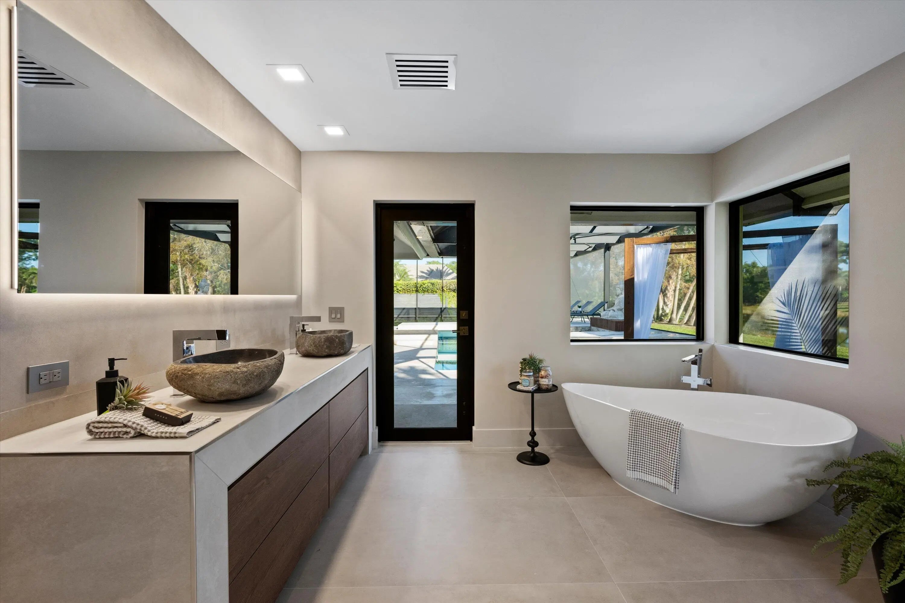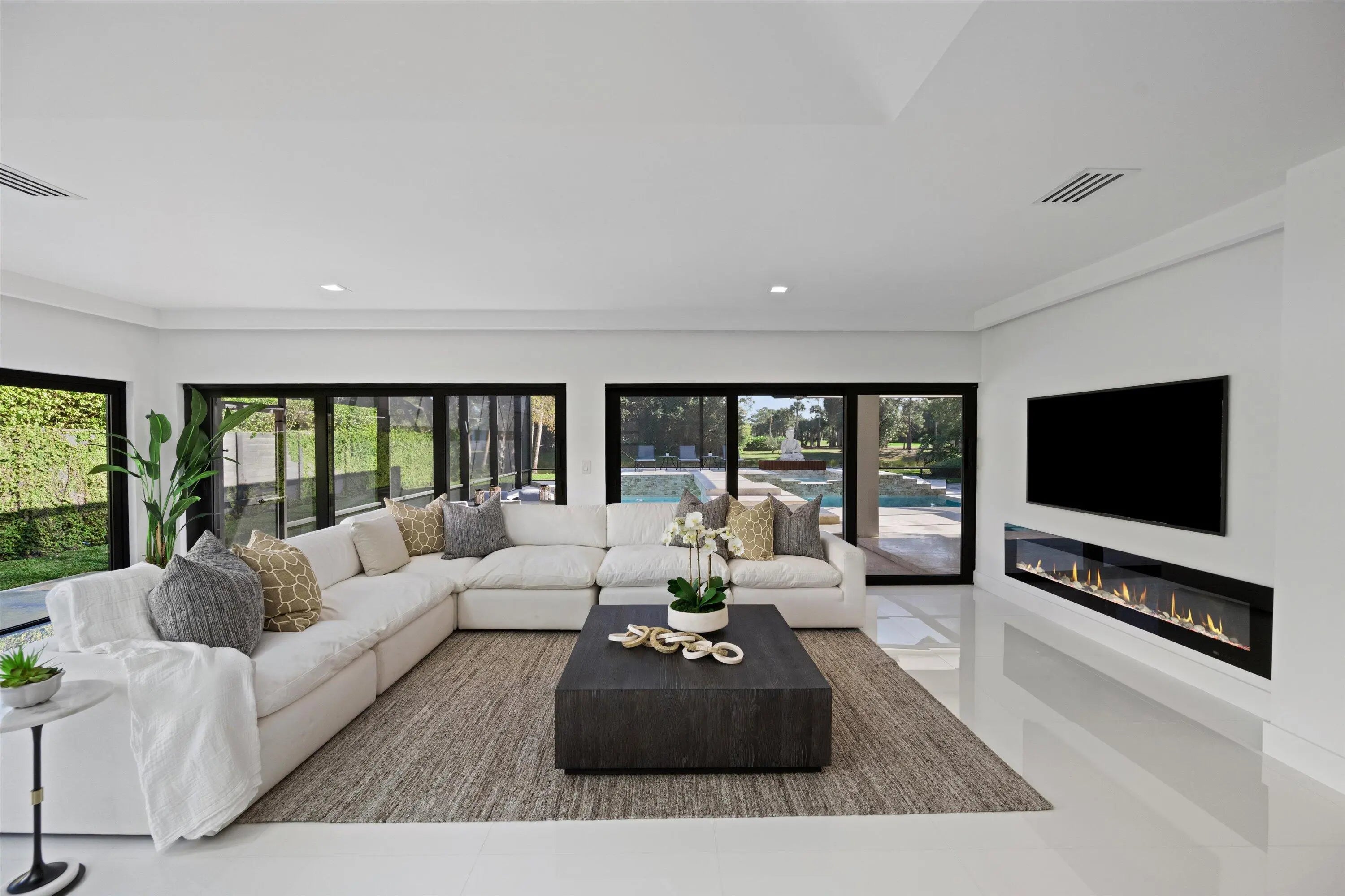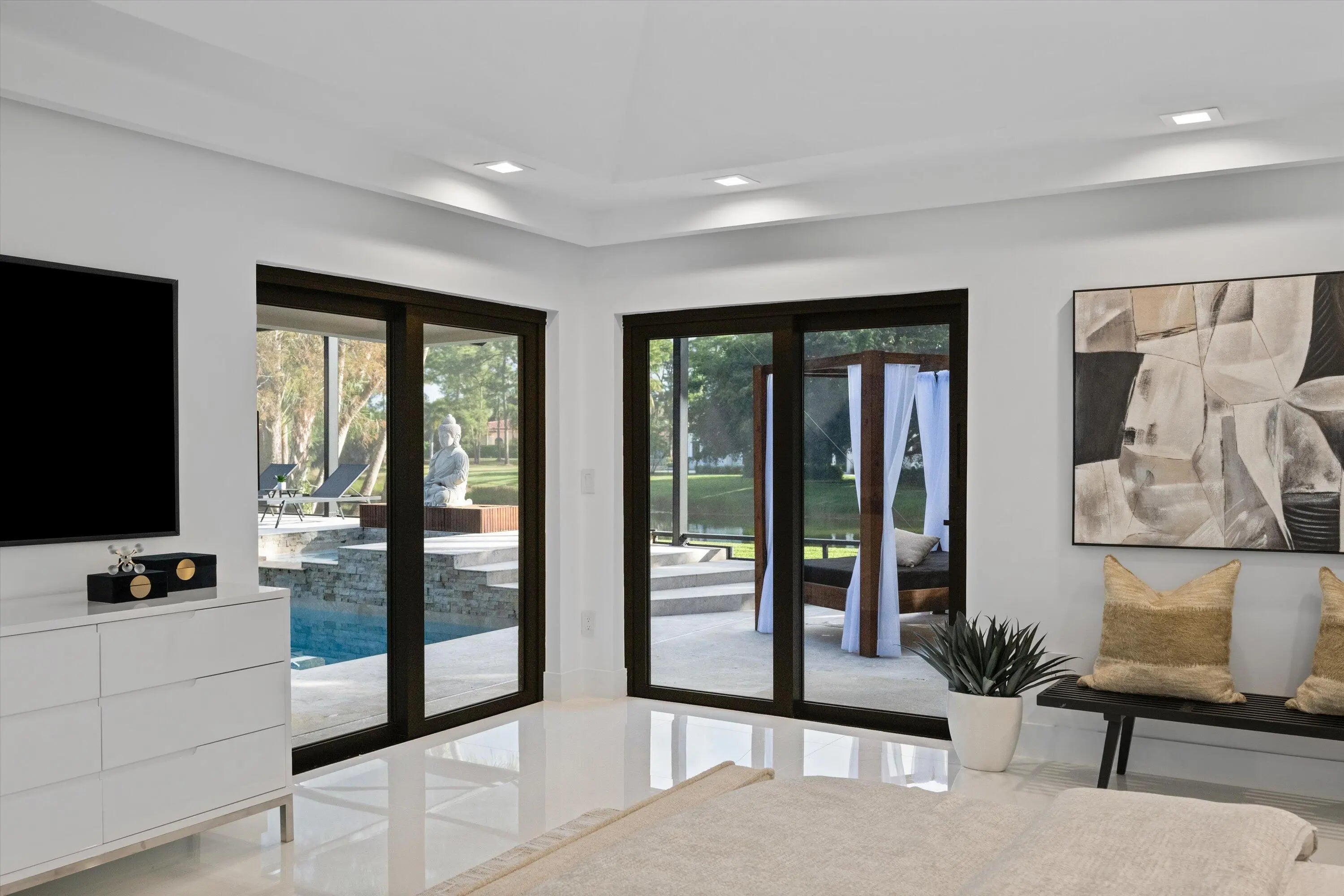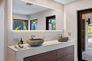 This one of a kind custom estate home in Breakers West Country Club in West Palm Beach is perfect blend of clean architectural lines, premium finishes and exceptional craftsmanship. This immaculate home boasts 4 Bedrooms + separate Office, 4 Full Baths and 2-Car + Golf Cart garage. Situated 0.55 acre lot, the design takes in the scenic lake and golf course views beyond. Thoughtfully renovated over the past 5 years this sophisticated, warm modern home features custom European cabinetry and Italian tile flooring throughout. The outdoor entertaining space reflects the same clean aesthetic with new Clear View screen enclosure, modern travertine patio deck, raised spa with waterfall overflowing into the pool and the tasteful Buddha sculpture as the focal point in your modern Florida retreat. Additional important features include: Commercial grade hurricane impact windows and doors (2021); New clay tile roof and new commercial grade flat roof, both with transferable warranty (2019); Pool/patio/screen remodel (2019-2021); Smart Home doorbell, smoke detectors and thermostats (2022); Water Heater (2023). And so much more!! Breakers West is a unique country club community where club memberships are NOT mandatory. Residents have the choice of Golf or Sport/Social memberships at Breakers West which includes golf at the Breakers West Rees Jones Course, tennis, pickleball, pool, gym, Kid's Club with playground as well as use of The Breakers Beach Club and Rees Jones Ocean Course in Palm Beach in the summer months. Also located within the community is Mayacoo Lakes Country Club with its renowned golf course, tennis facilities, pool and clubhouse dining with memberships available for separate purchase. Breakers West offers an unparalleled lifestyle within its 670 acres of wooded landscapes, manicured lawns, and two manned guard gates. Is conveniently located to PBI Airport, downtown West Palm Beach's new "financial district" and over the bridge to Palm Beach with its fabulous dining options and Worth Avenue shopping. Also convenient to Wellington's world-class equestrian amenities. Great private schools in West Palm Beach are nearby such as Oxbridge Academy, The King's Academy, and Rosarian Academy.