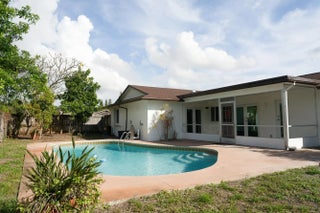 Corner-lot pool home with a fenced yard, huge living room, and a huge garage for storage and utility. Recent upgrades include a new roof (2024), new A/C system (2026), and a new pool pump. Impact windows and doors are paired with accordion shutters for added protection. Washer and dryer are inside the home. Enjoy the screened patio for shaded lounging, with a bathroom that connects directly to the patio in a convenient wet-bath style setup—ideal for pool days and easy entertaining.