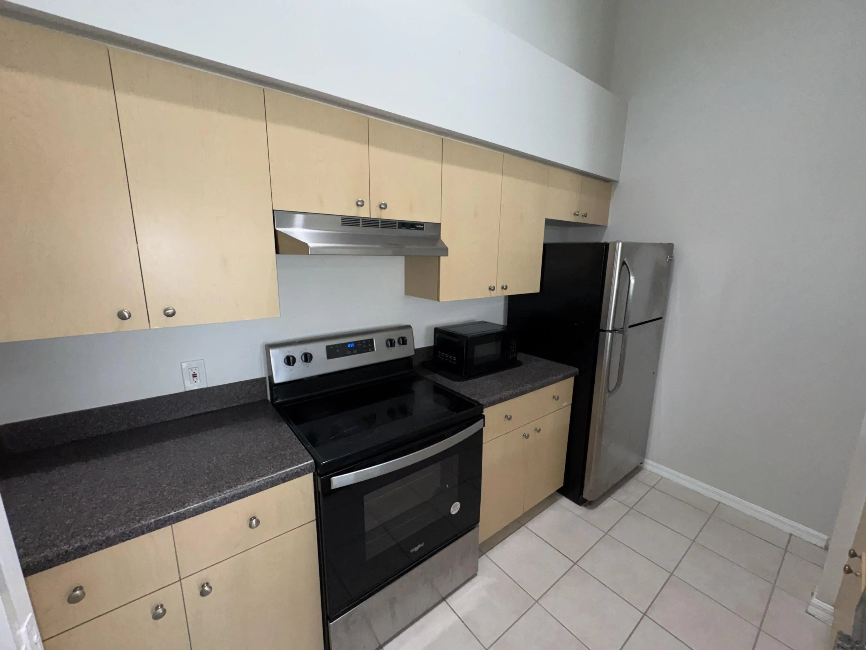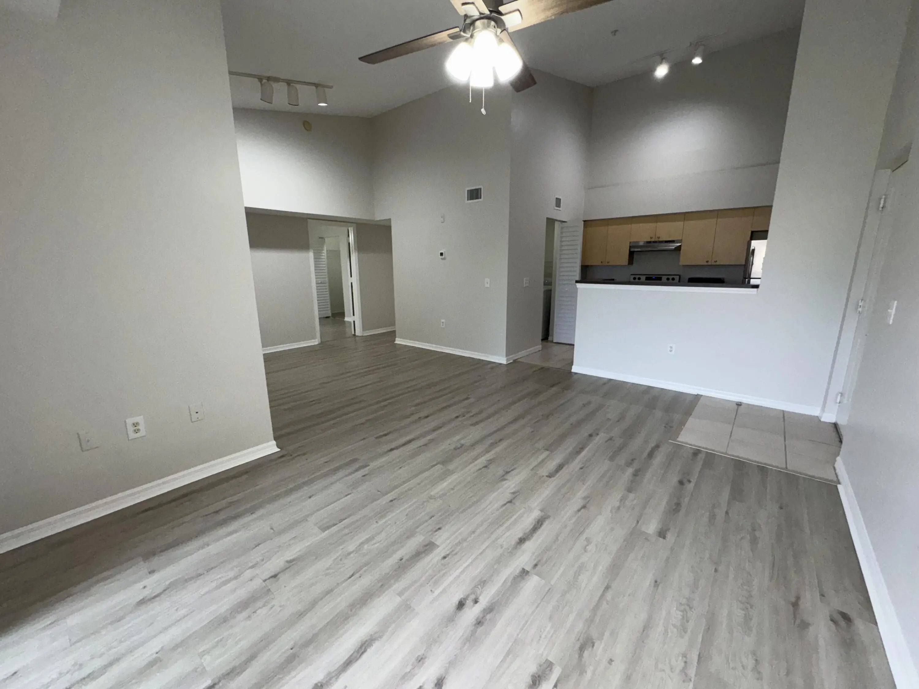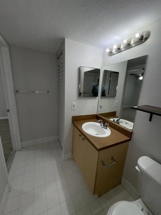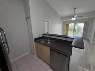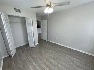 Move-in ready third-floor 2-bedroom, 1-bathroom condominium located in the desirable, fully gated Emerald Isle community. The main living area and bedrooms feature modern gray plank flooring. The primary bedroom offers a spacious walk-in closet with a pass-through door to the shared bathroom. The open kitchen, highlighted by vaulted ceilings, flows seamlessly into the living area and includes a full-size washer and dryer for added convenience. Emerald Isle offers resort-style amenities including a clubhouse, fitness center, swimming pool with sun deck, hot tub, tennis and other ball courts, and a playground. Rent includes Wi-Fi, basic cable TV, water, trash, HOA fees, and full access to all community amenities. Centrally located in the West Palm Beach area. Small pets welcome.