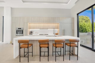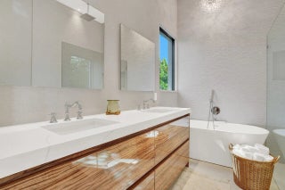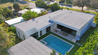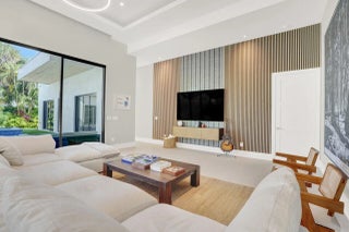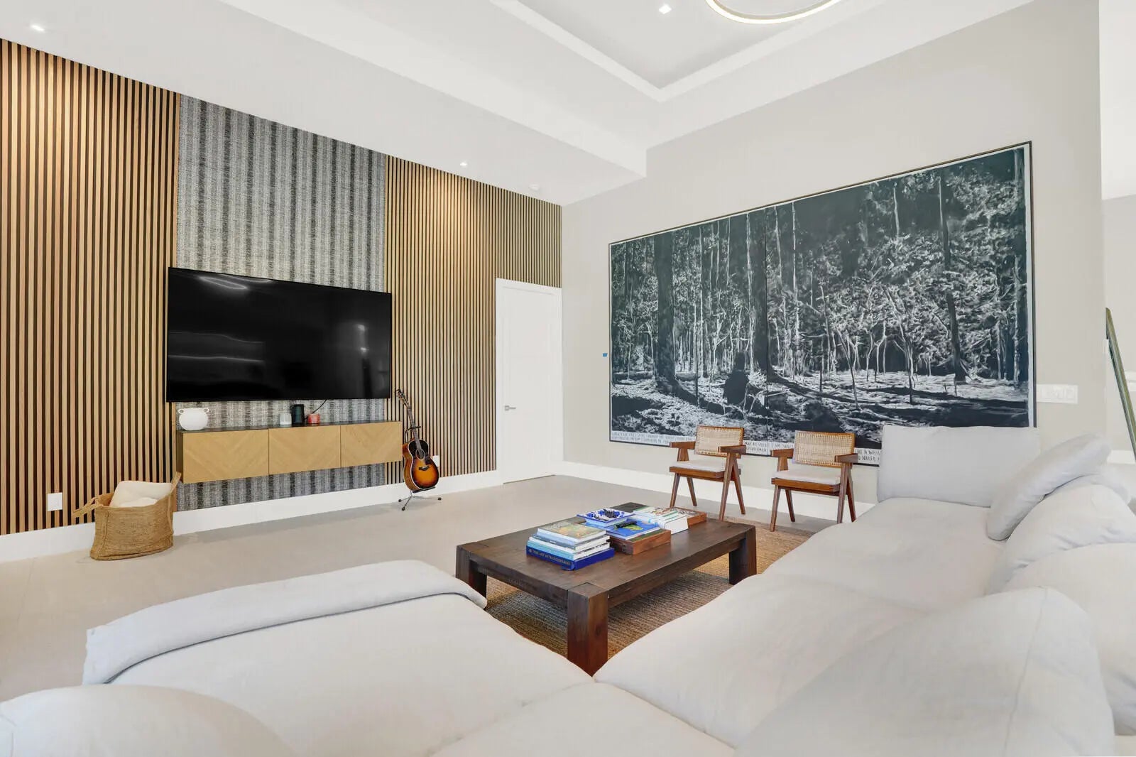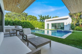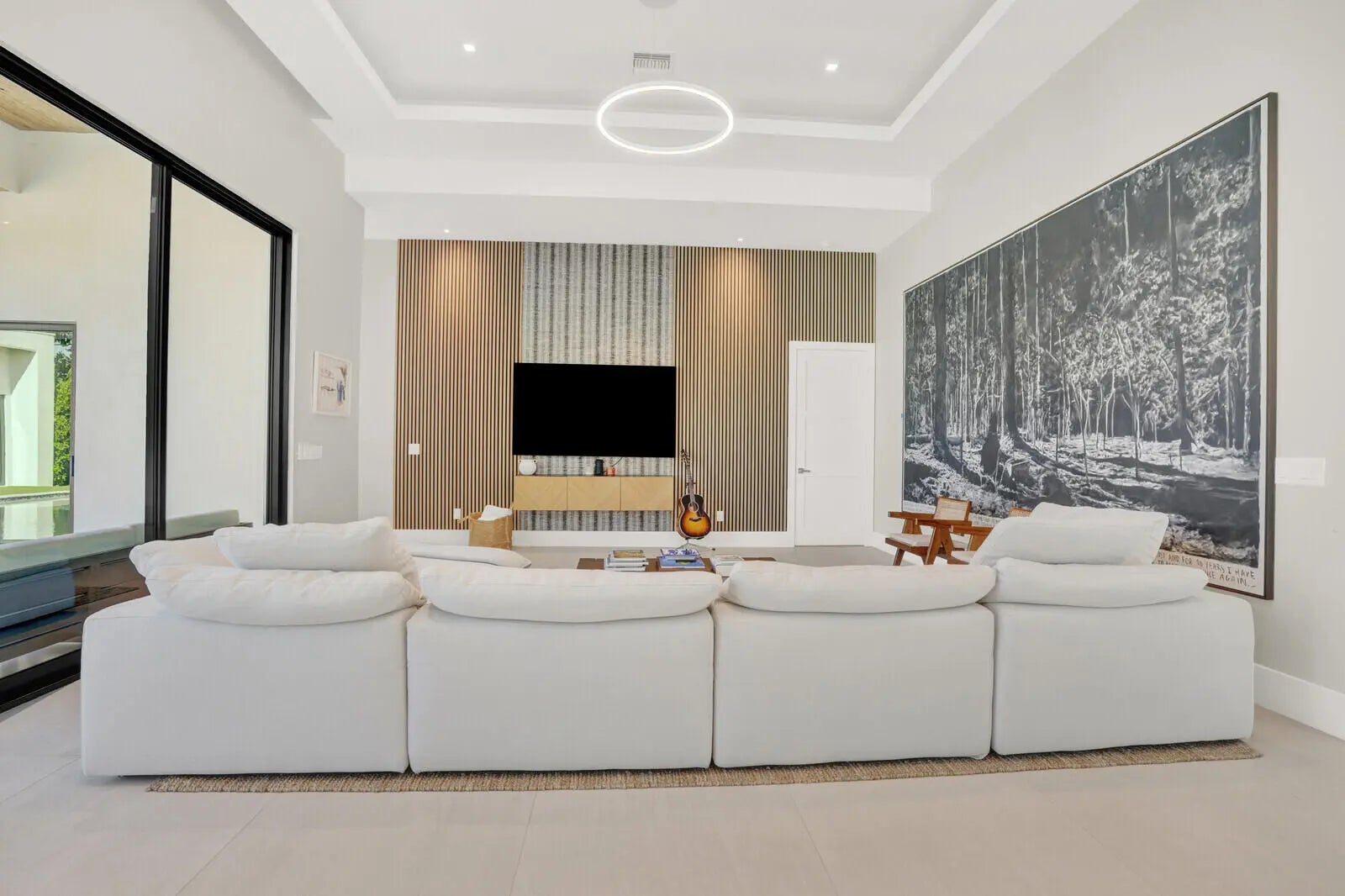 Welcome to East Boca, where refined architecture and resort-style living converge in this exceptional, newly built contemporary estate. Completed in 2023, this custom-designed residence offers approximately 3,200 square feet under air and over 4,200 square feet in total, thoughtfully curated to deliver both elevated design and everyday comfort. From the moment you arrive, the home makes a striking impression with its landscaped frontage, circular travertine driveway, and dramatic 10-foot Eurotech impact glass entry door. Solid construction, energy-efficient low-E impact windows and sliders, spray-foam insulation, and a pitched flat roof with gutters reflect a commitment to quality, durability, and modern performance. Inside, soaring ceilings—14 feet in the main living in the bedrooms - create a grand yet inviting atmosphere. Oversized sliders spanning nearly 30 feet, frame views of the resort-style pool and spa, fill the home with natural light and seamlessly blend indoor and outdoor living. Neutral large-format porcelain tile flows throughout, complemented by custom design elements including a natural oak feature wall, grass-cloth accents, quartz window sills, and designer LED lighting. The gourmet kitchen is both functional and striking, anchored by an oversized waterfall quartz island with seating and abundant storage. Bosch appliances, a natural gas range, an oversized sink with premium fixtures, illuminated cabinetry, and dual pull-out pantries make this space ideal for both daily living and entertaining. Each of the five bedrooms offers the privacy of its own en-suite bath, while the primary suite serves as a tranquil retreat with pool views, a custom walk-in closet with built-ins and lighting, and a spa-inspired bath featuring a freestanding soaking tub, expansive walk-in rain shower, floor-to-ceiling designer tile, and dual quartz vanity. A beautifully appointed powder room with a floating marble vanity adds an additional layer of sophistication. Designed for modern living, the home includes a high-efficiency multi-zone air-conditioning system, two gas tankless water heaters, integrated ceiling speakers, smart-home features, solid core interior doors with stainless hardware, and a well-equipped laundry room with gas appliances, custom cabinetry, sink, and glass backsplash. You'll step outside to your own, private oasis. The covered patio with natural wood ceiling opens to an oversized heated saltwater pool and spa with sun shelf, LED color lighting, marble coping. Artificial turf surrounds all, for effortless maintenance. A fully equipped summer kitchen with natural gas grill creates the perfect setting for entertaining, while the fenced yard with lush clusia hedges offers privacy and serenity. Adding exceptional flexibility, a detached casita overlooks the pool through expansive sliders and features a kitchenette, full bath with oversized shower, porcelain flooring, 12-foot ceilings, and its own full-size washer and dryer. This guest house is ideal for visitors, can be used as a home office, or as a state-of-the-art fitness studio. Completing the property is an impressive two-car garage with epoxy floors, 12.5-foot ceilings suitable for a car lift, Wi-Fi-enabled opener with battery backup, and ample storage. Enhanced whole-house security offers peace of mind. This is a rare opportunity to own a meticulously crafted, high-end contemporary home in one of East Boca's most desirable settings, where design, comfort, and lifestyle come together seamlessly. Private showings available by appointment.
