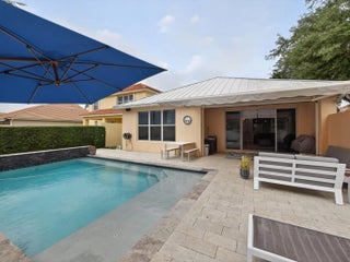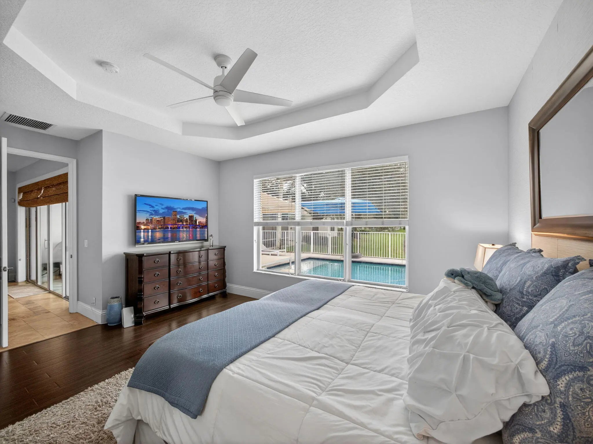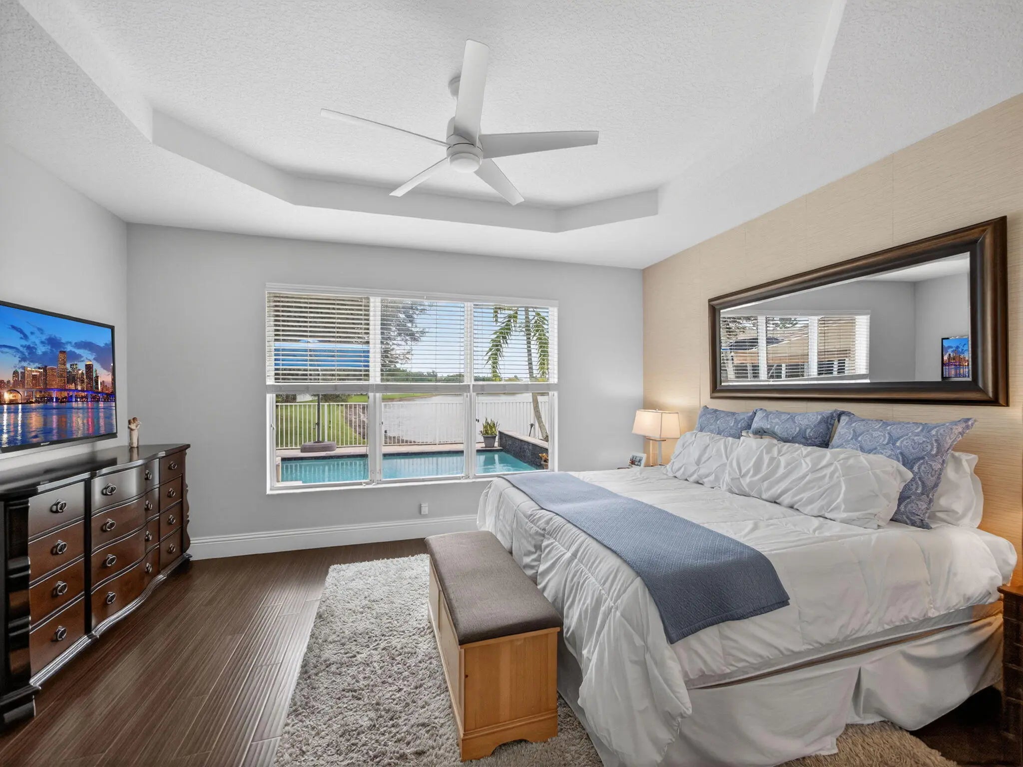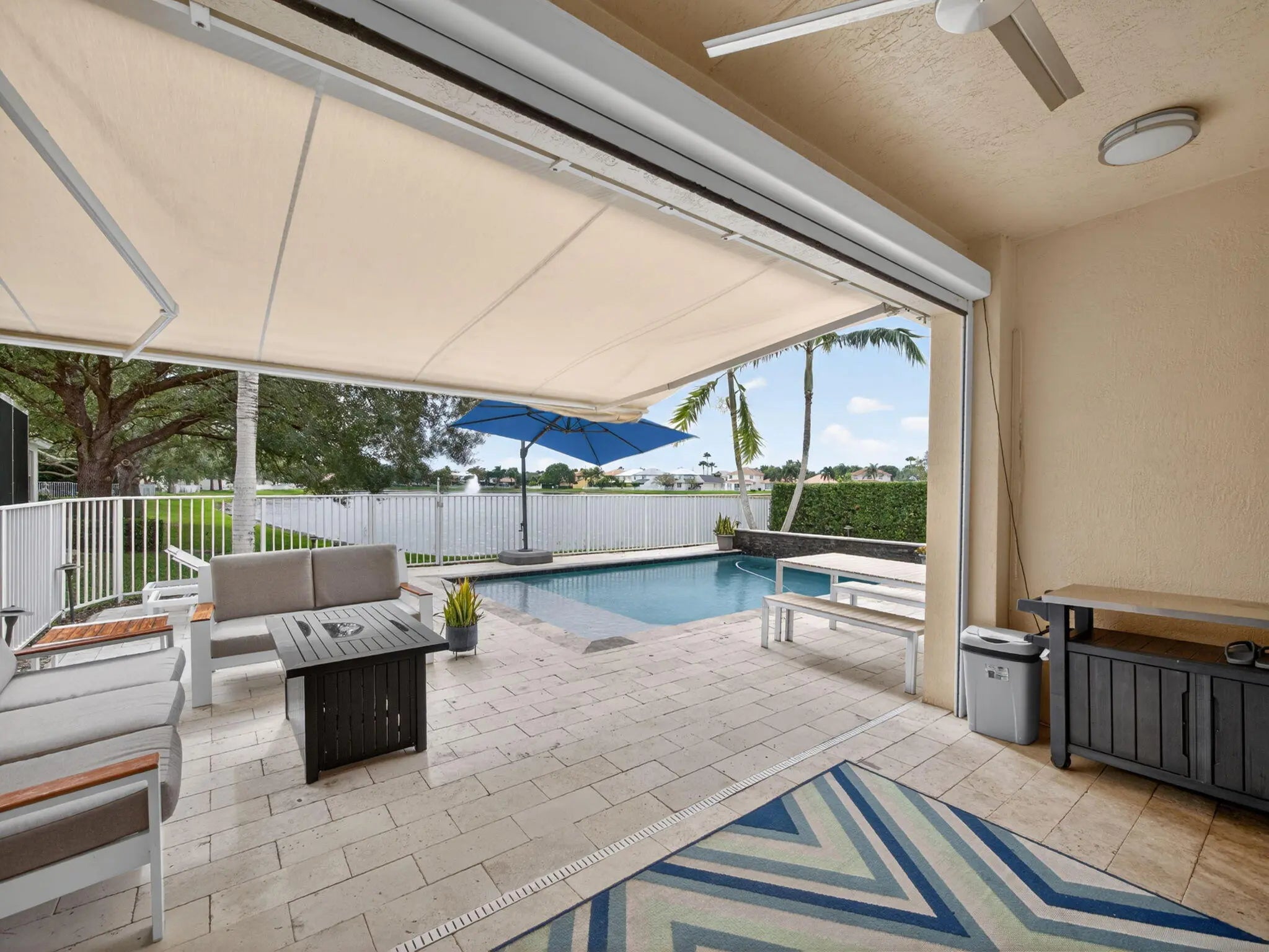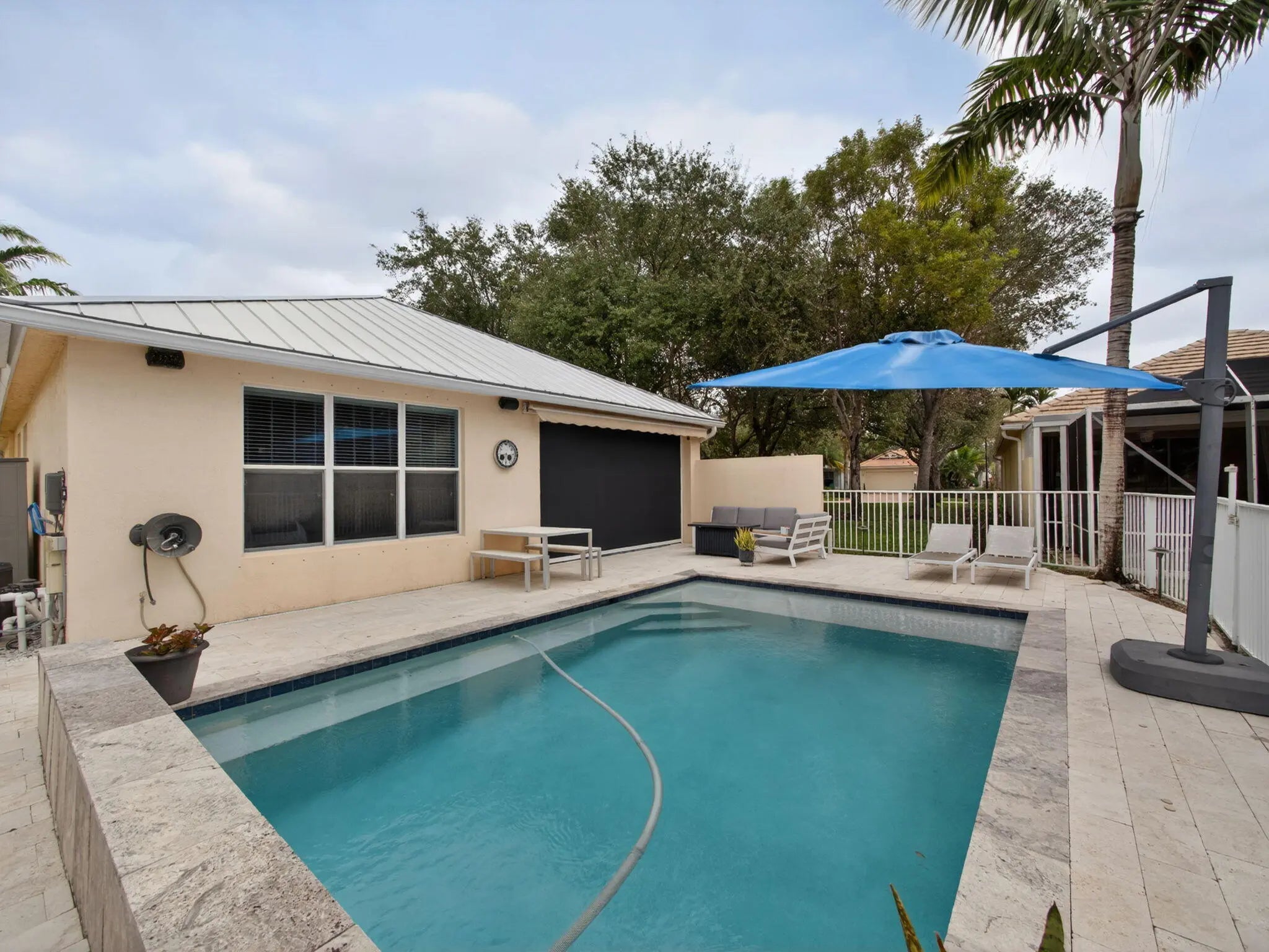Discover resort-style living in this beautifully upgraded 3-bedroom, 2 bath, 2-car garage lakefront home, complete with a private tropical pool and 2019 new metal roof. Set in the gated community of Palm Beach Plantation, this home blends elegant design with everyday comfort. Step inside to a formal living and dining room that leads into a spacious, remodeled kitchen featuring shimmering quartz countertops, stainless steel appliances, an oversized island with seating, and an effortless flow into the open great room. The great room is anchored by custom built-in entertainment cabinetry and offers panoramic views of the sparkling pool and tranquil lake. The large main suite is a serene retreat with a coffered ceiling, two walk-in closets, and a sweeping view of the pool and water. The spa-style main bath includes dual sinks, a generous walk-in shower, and a relaxing soaking tub. Step outside to your backyard oasis, where a covered lanai provides shaded comfort, enhanced by a Sun Seeker electric awning for extra coverage and an electric remote-controlled hurricane screen for year-round protection. Beyond the lanai, a heated tropical pool with a sun shelf, bubbler, and cascading waterfalls sits on a gorgeous travertine deck overlooking the lake. The yard is fenced and features artificial pet-friendly turf with French drains for easy maintenance. Palm Beach Plantation offers resort-style amenities including a grand clubhouse, fitness center, tropical community pool, tennis, playground, kitchen facilities, and more. The location is unbeatable close to shopping, dining, top schools, and major highways for easy commuting. This home is the perfect blend of luxury, comfort, and the ultimate Florida lifestyle.