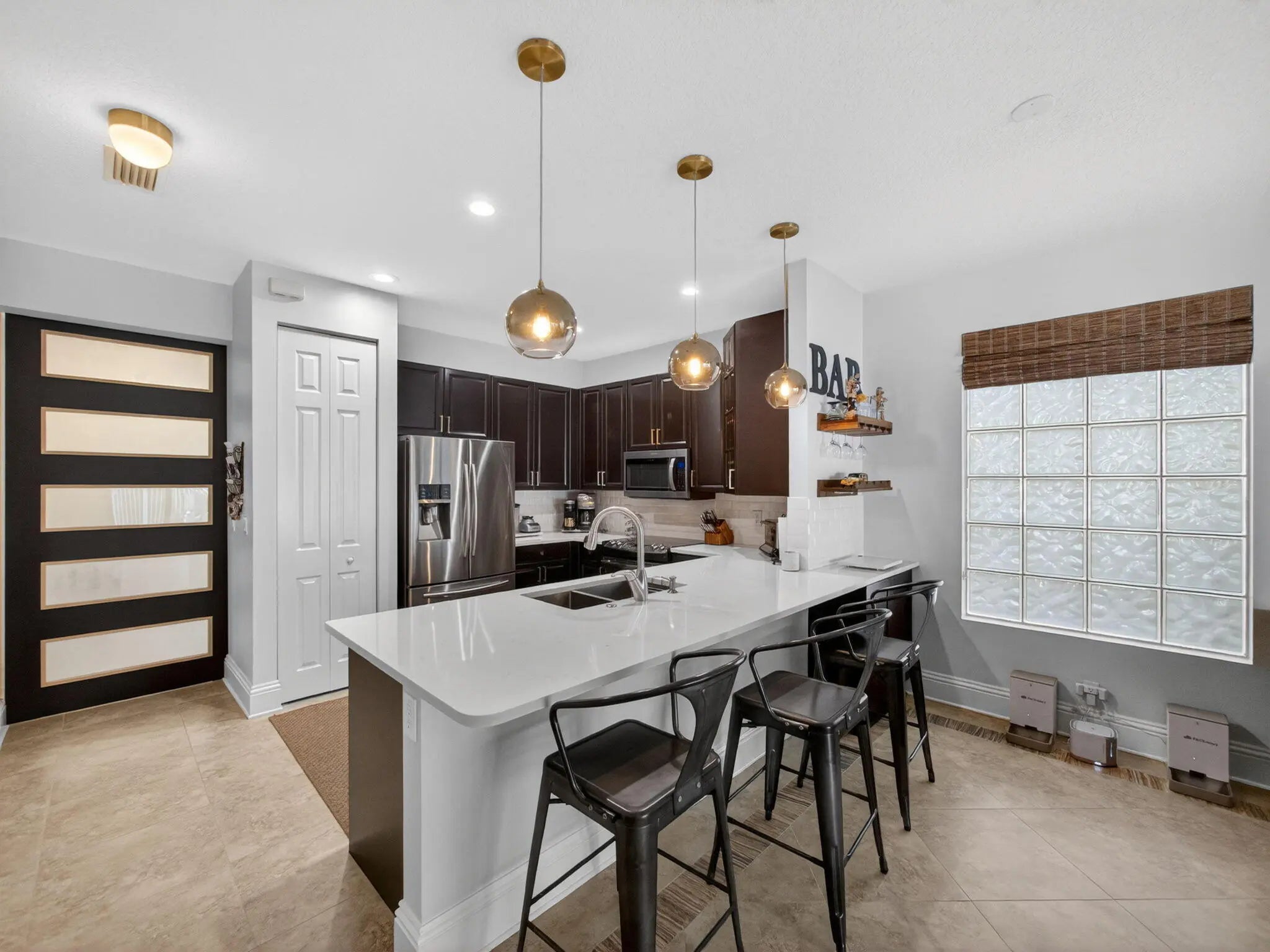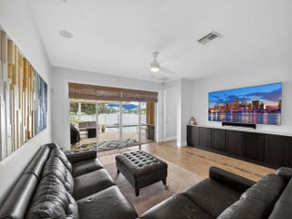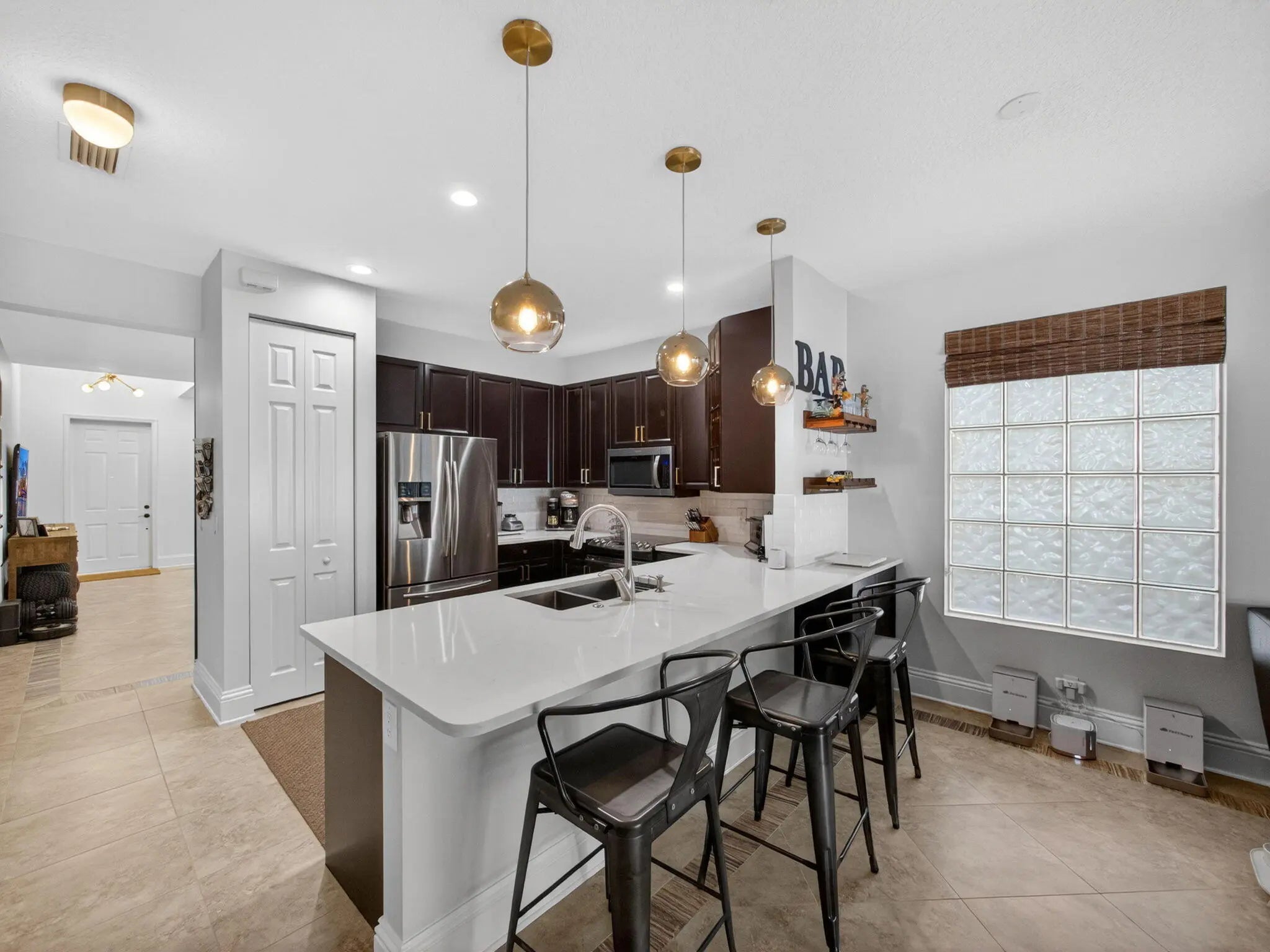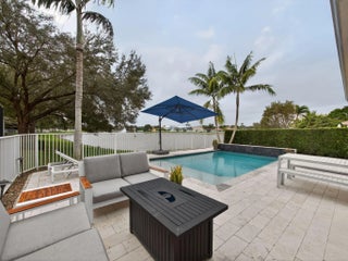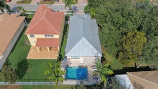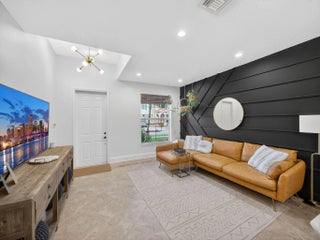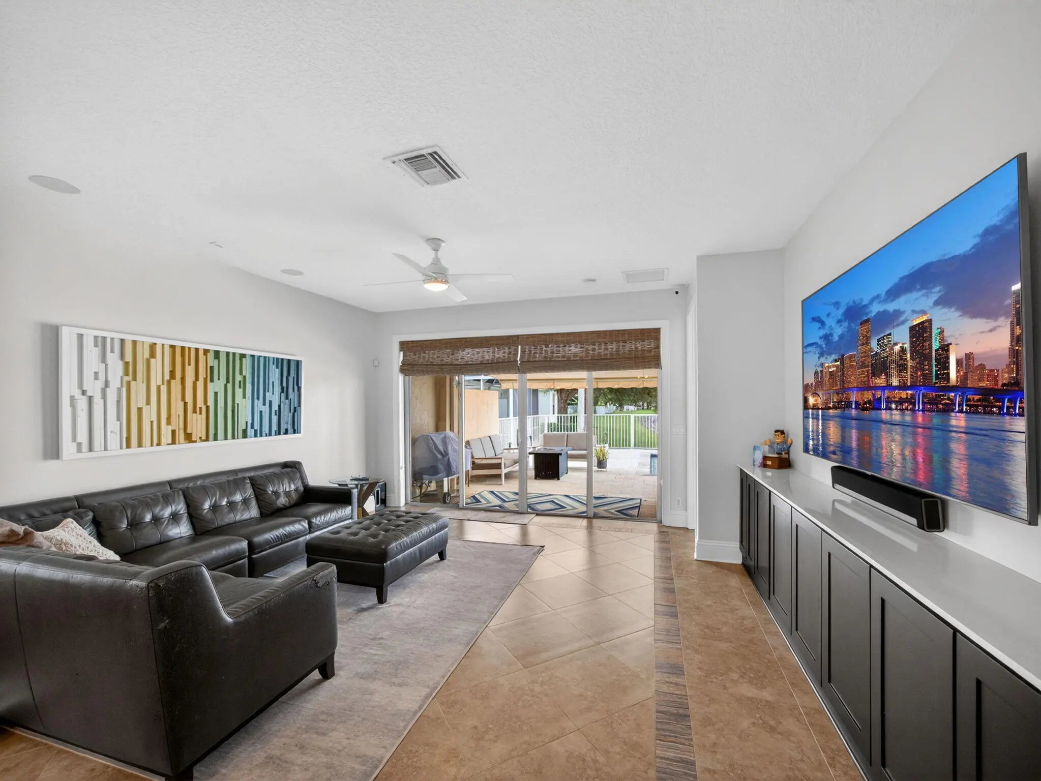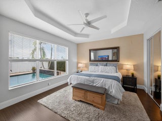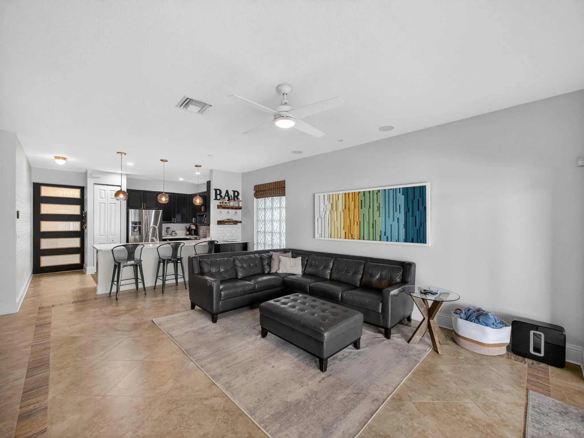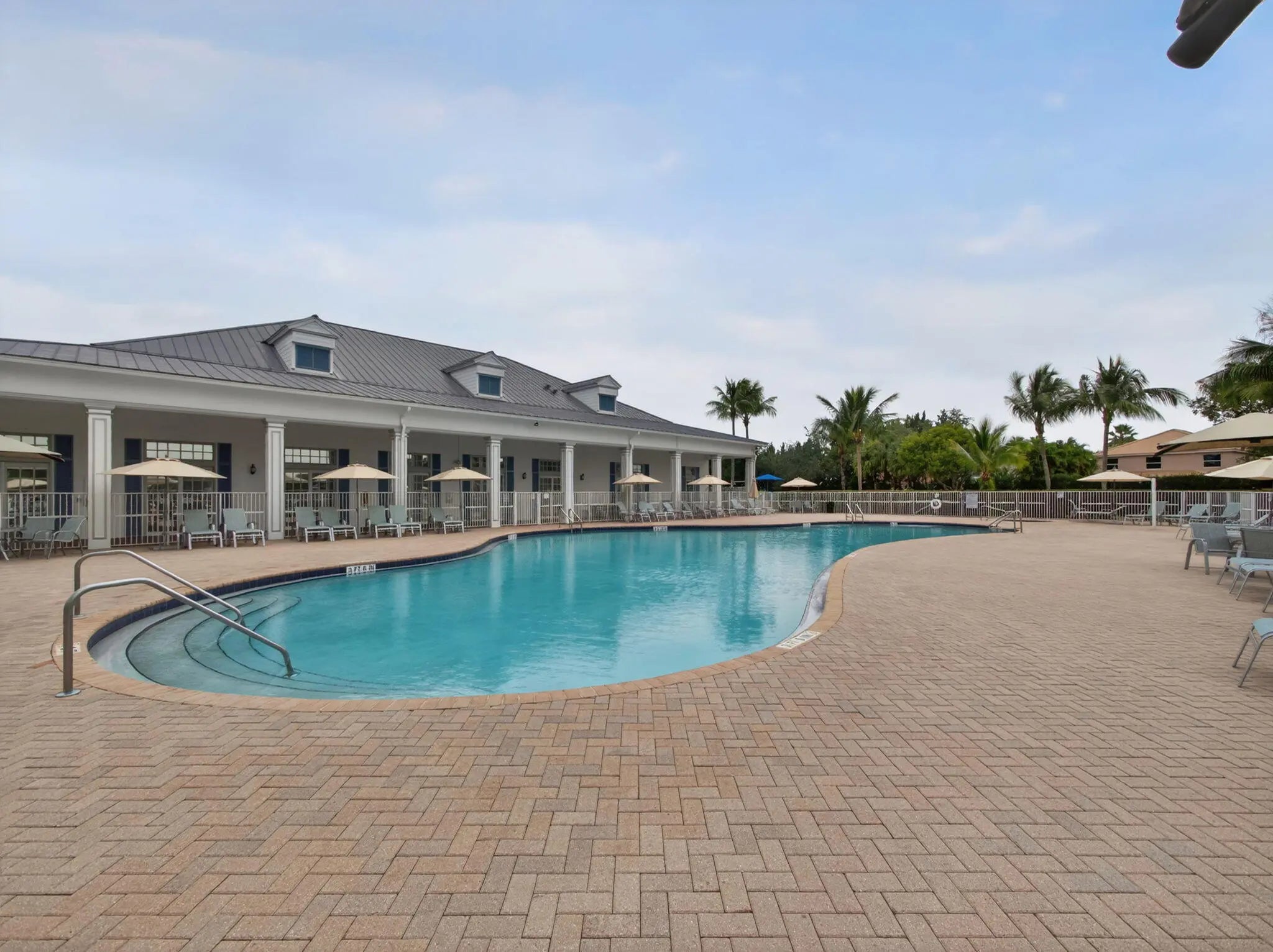 Discover resort-style living in this beautifully upgraded 3-bedroom, 2 bath, 2-car garage lakefront home, complete with a private tropical pool and 2019 new metal roof. Set in the gated community of Palm Beach Plantation, this home blends elegant design with everyday comfort. Step inside to a formal living and dining room that leads into a spacious, remodeled kitchen featuring shimmering quartz countertops, stainless steel appliances, an oversized island with seating, and an effortless flow into the open great room. The great room is anchored by custom built-in entertainment cabinetry and offers panoramic views of the sparkling pool and tranquil lake. The large main suite is a serene retreat with a coffered ceiling, two walk-in closets, and a sweeping view of the pool and water. The spa-style main bath includes dual sinks, a generous walk-in shower, and a relaxing soaking tub. Step outside to your backyard oasis, where a covered lanai provides shaded comfort, enhanced by a Sun Seeker electric awning for extra coverage and an electric remote-controlled hurricane screen for year-round protection. Beyond the lanai, a heated tropical pool with a sun shelf, bubbler, and cascading waterfalls sits on a gorgeous travertine deck overlooking the lake. The yard is fenced and features artificial pet-friendly turf with French drains for easy maintenance. Palm Beach Plantation offers resort-style amenities including a grand clubhouse, fitness center, tropical community pool, tennis, playground, kitchen facilities, and more. The location is unbeatable close to shopping, dining, top schools, and major highways for easy commuting. This home is the perfect blend of luxury, comfort, and the ultimate Florida lifestyle.