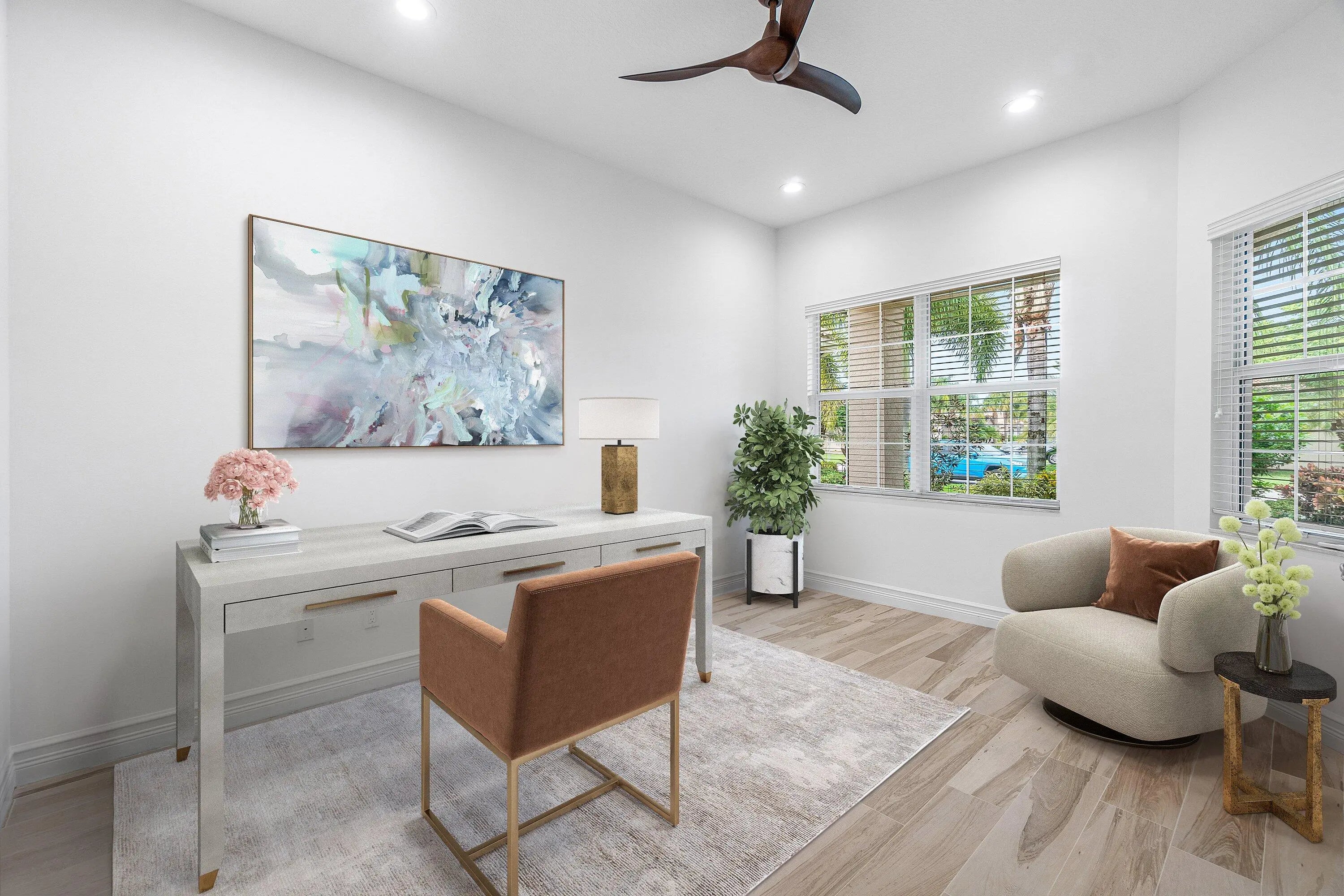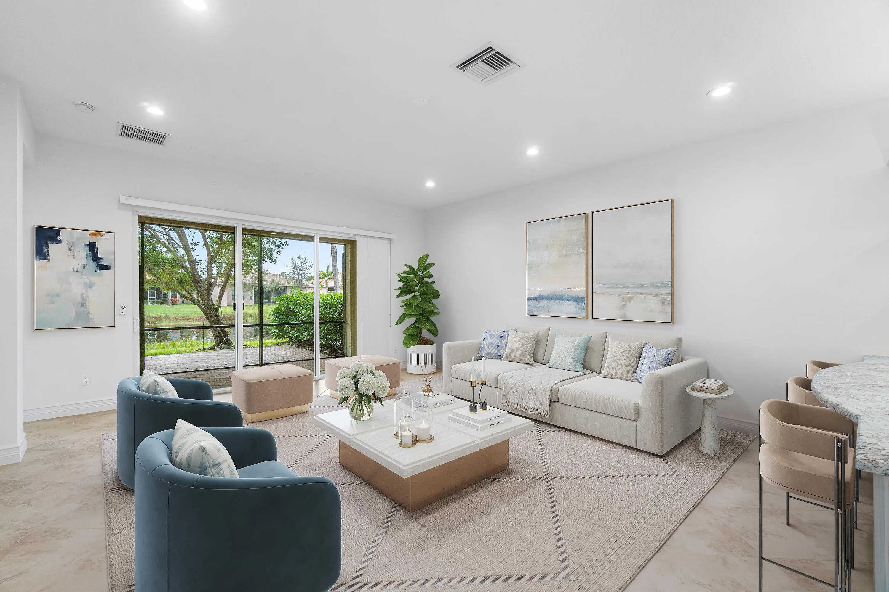 Lowest priced home in community!!Beautiful upgraded Rebecca model with lakeview. Features include lush landscaping, hurricane impact windows, custom fitted closets and more. 3 bedrooms, 2 baths. Third bedroom set up as office. Freshly painted. High ceilings and neutral porcelain tile flooring throughout. Gorgeous upgraded kitchen with large counter height breakfast bar. Covered screened in patio w/add'l extended patio overlooking beautiful serene lakeview. Valencia Cove is a premier 55+ lifestyle community with a spectacular 39,000 sq ft clubhouse and 10 acre recreational facility. There are many activities, trips, shows and all types of clubs. The clubhouse features an expansive foyer, lobby,grand ballroom with raised stage and dance floor, 4 card rooms, cafe with indoor/outdoor seating Arts & Crafts room with kiln, internet/billiards room, office,catering kitchen w/cooking studio, yoga & exercise studio, fitness center and men's and women's locker rooms w/steam rooms, massage room and showers. There are 4 pools,8 tennis courts and 6 pickleball courts. Welcome Home!