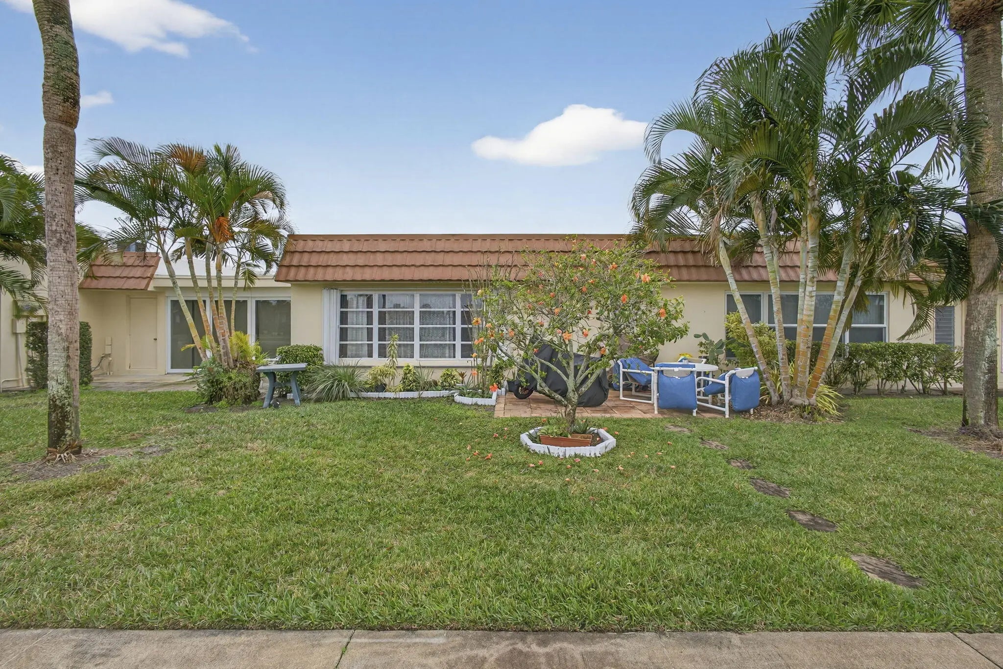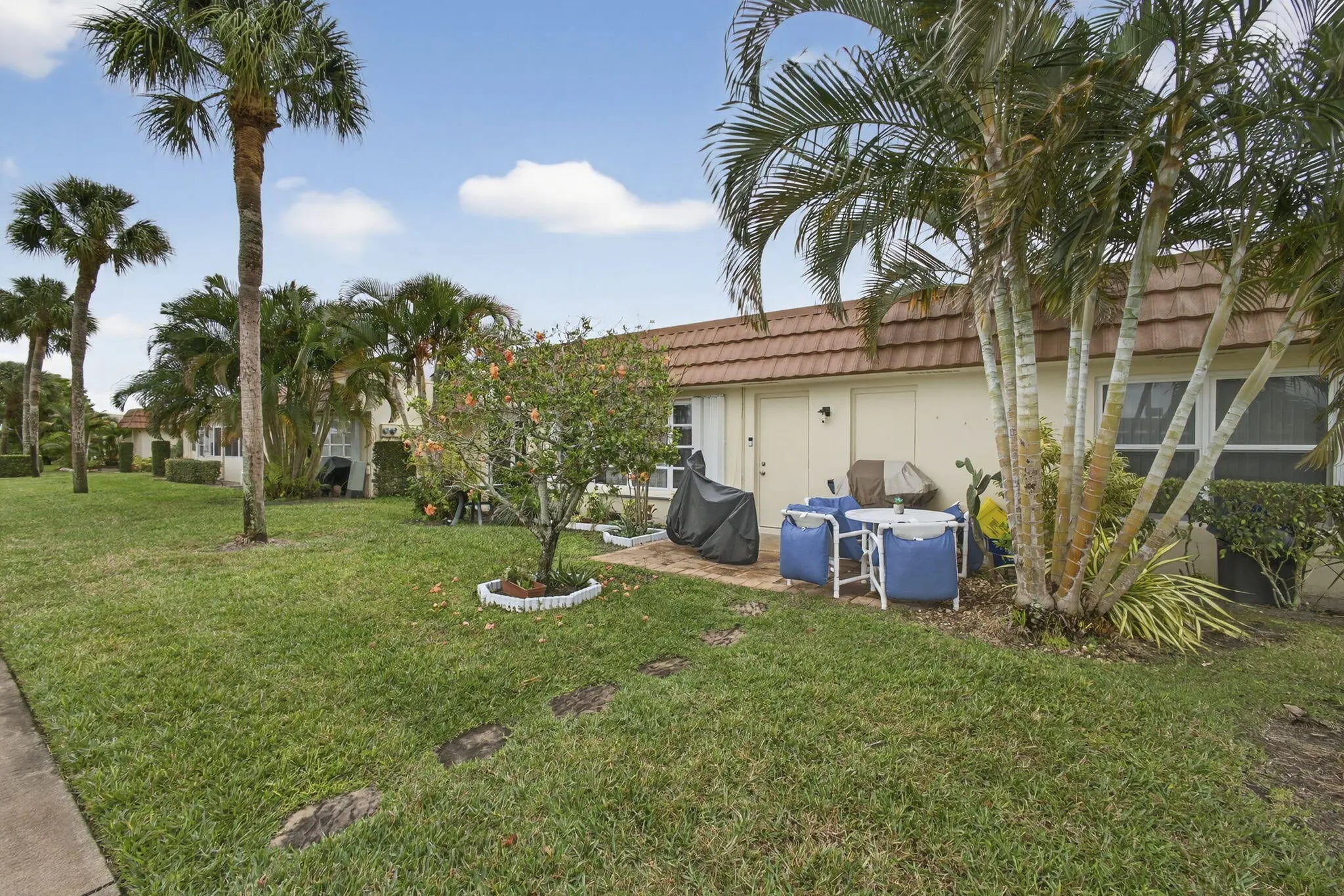 Beautiful hidden gem! This charming 2-bedroom, 2-bath villa offers comfort, style, and convenience. The kitchen features solid wood cabinetry, stainless steel appliances, a tiled backsplash and a refrigerator less than one year old. Tile flooring throughout the entire villa, complemented by updated bathrooms. The spacious primary suite includes a large walk-in closet. Oversized laundry and storage room includes utility sink and full-size stacked washer and dryer (less than 5 years old). Step outside to a private patio ideal for afternoon relaxation or grilling. Additional highlights include hurricane accordion shutters, 2 assigned parking spaces directly in front of the villa, and ample guest parking. The clubhouse, heated pool, and tennis courts are just steps away. HOA fees include water, building insurance, cable and internet.