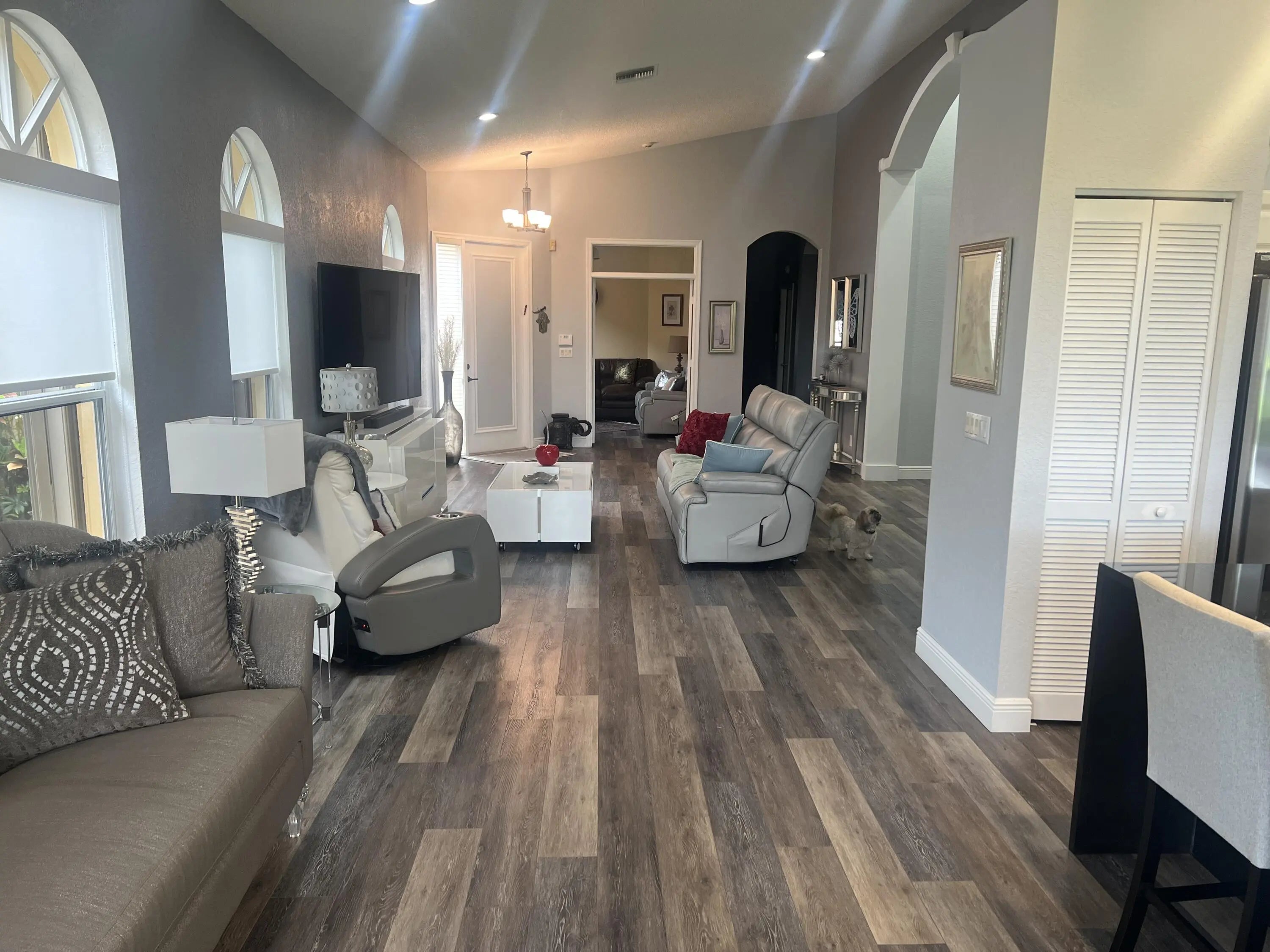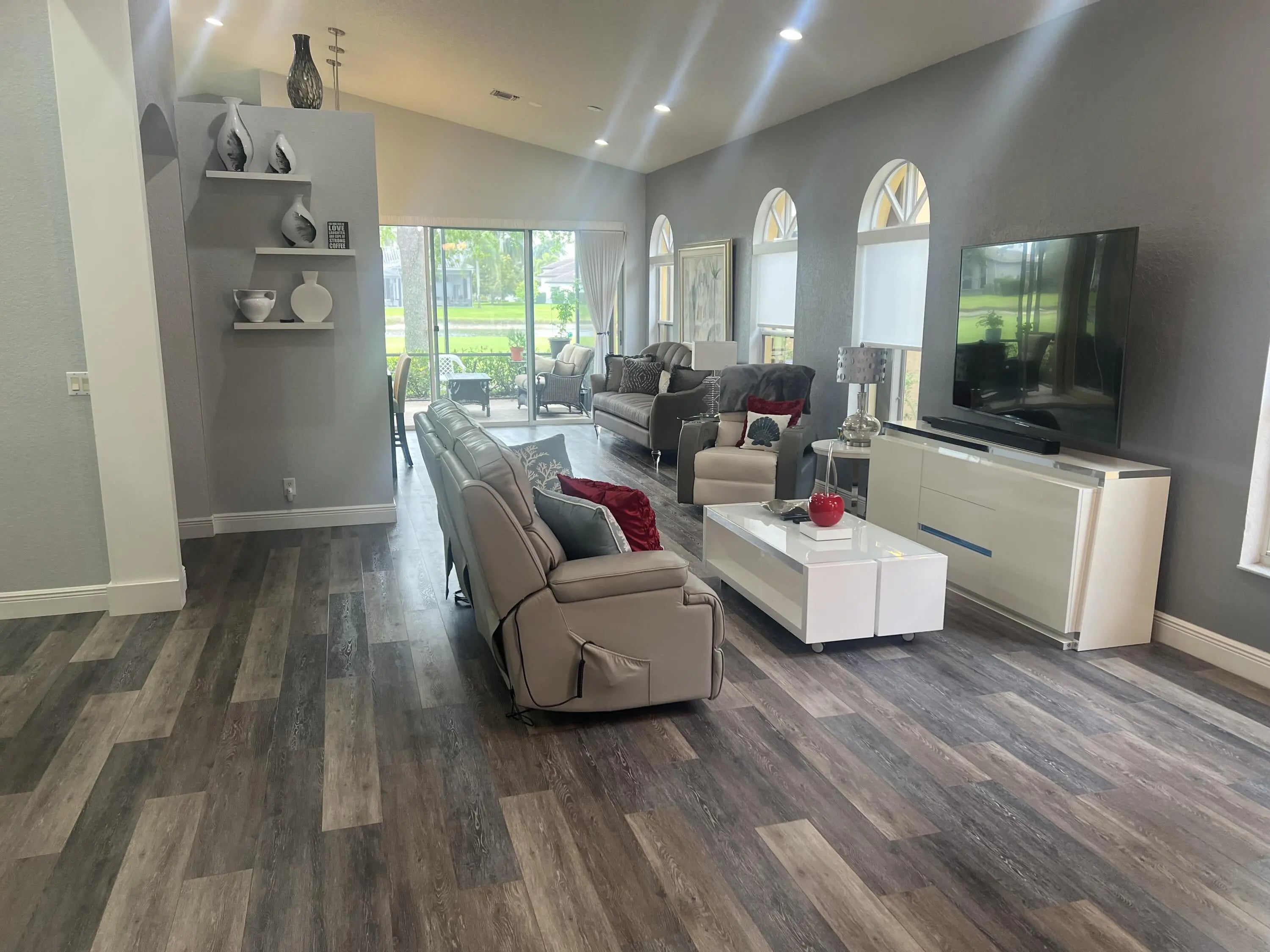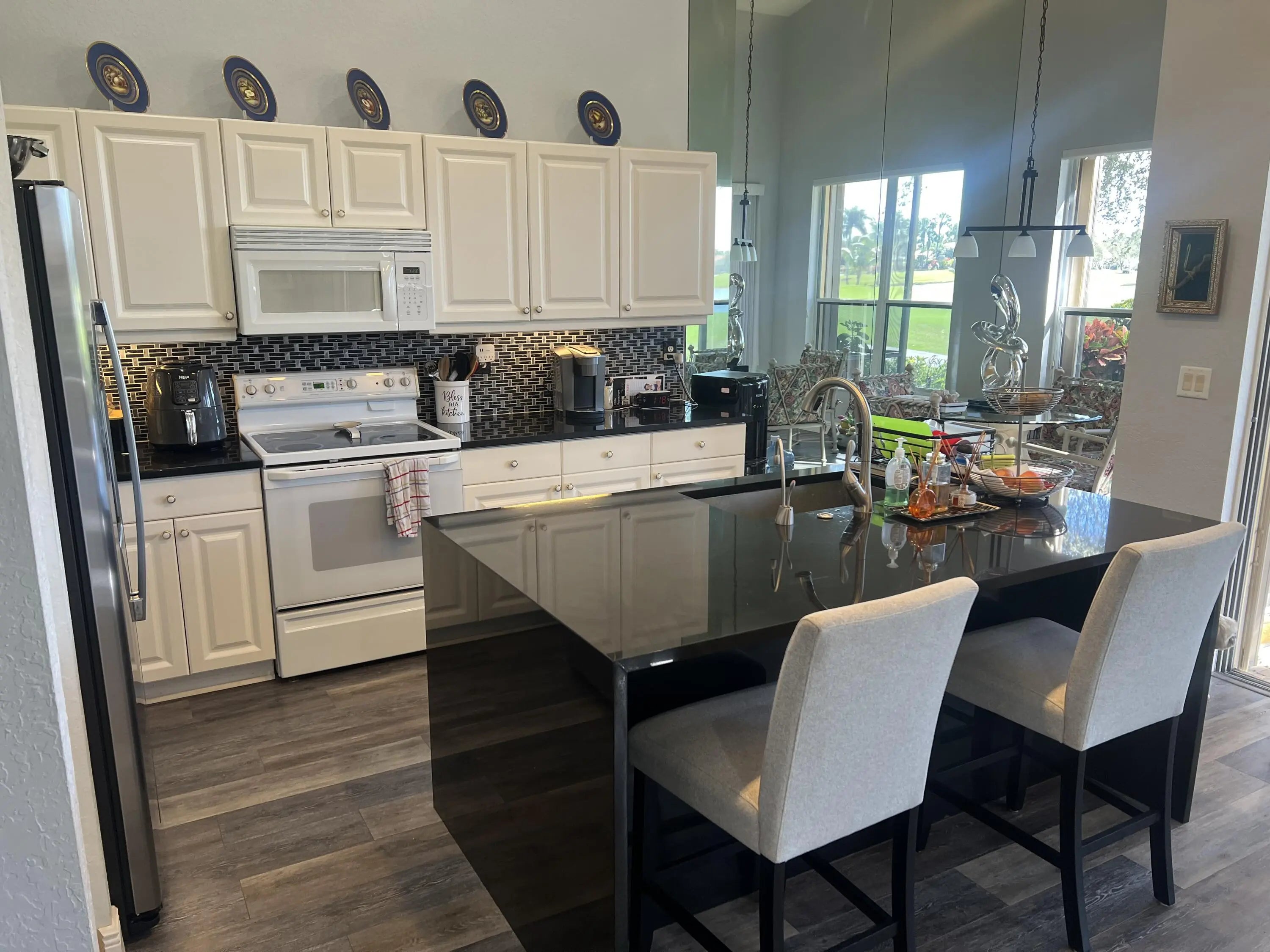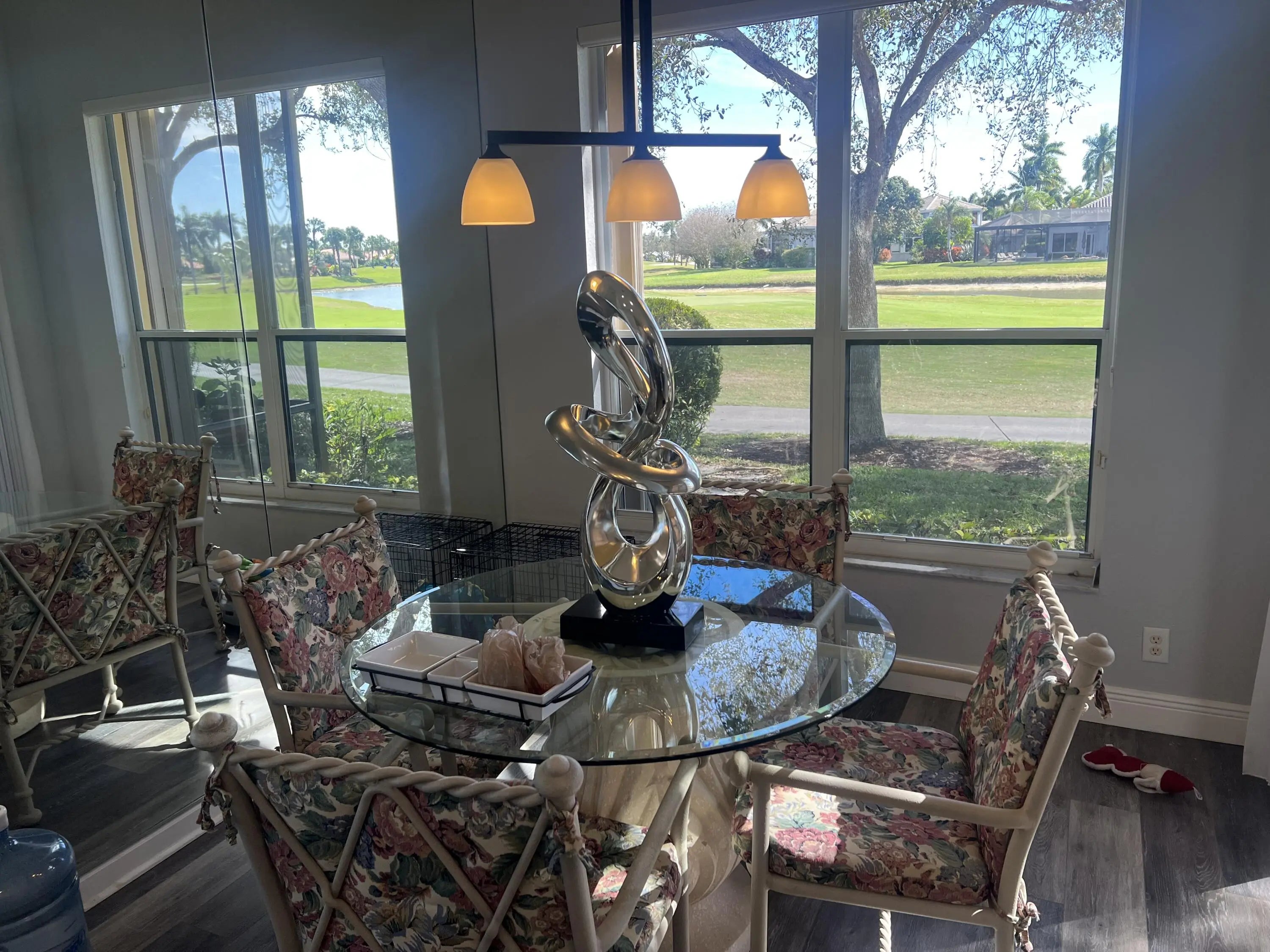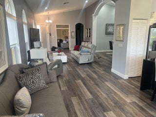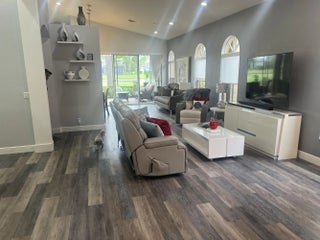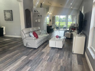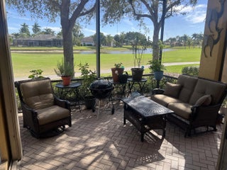 This home sits on property that has a rare and beautiful view of water and golf course. This exquisite house is 2,120 square feet, with 3 bedrooms and 2 1/2 bathrooms. All square feet of the rooms are approximated and should be checked if desired. This fall, 2026, the exterior of the house will be painted at the owner's choice of a several colors that the HOA picked out and the cost of the painting is paid by the HOA. The hot water heater is tankless.